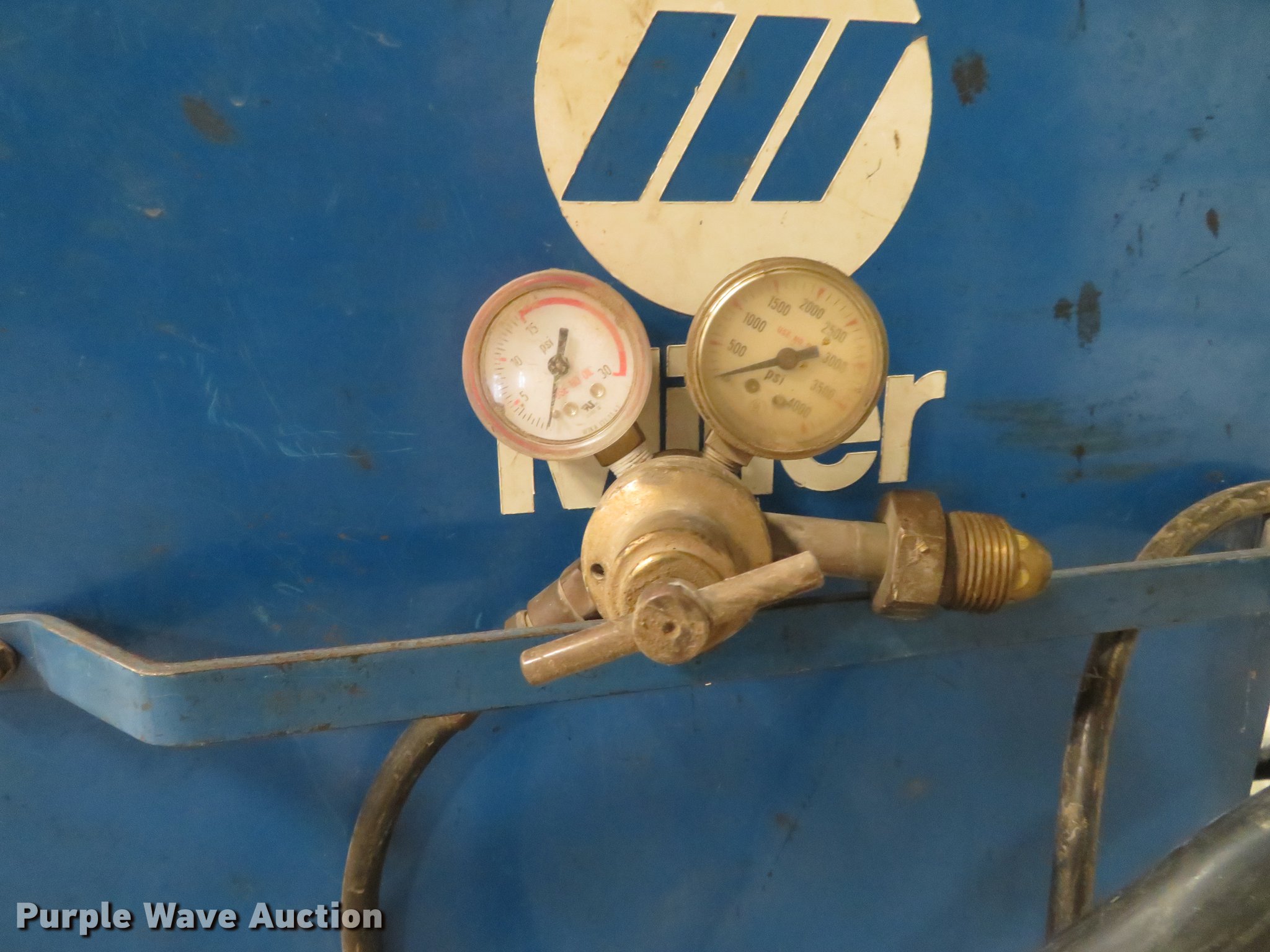 Miller Spoolmate 200 welder. 200/230V, DC arc welding power source, Gauges, Miller Spoolmate 1 gun, Cart with tank holder, Serial JJ361278. Emerald View Turf Farms. O'Fallon, MO 63366