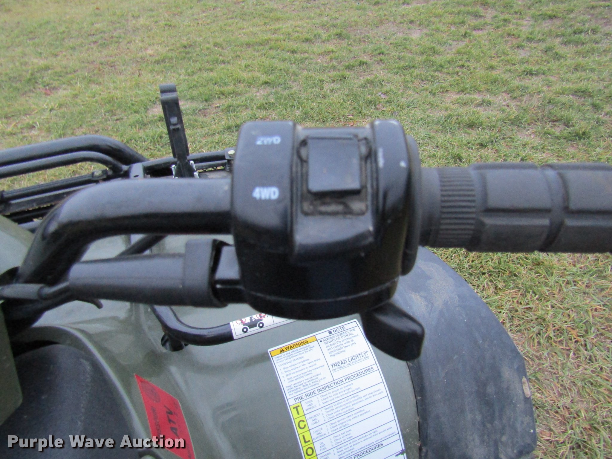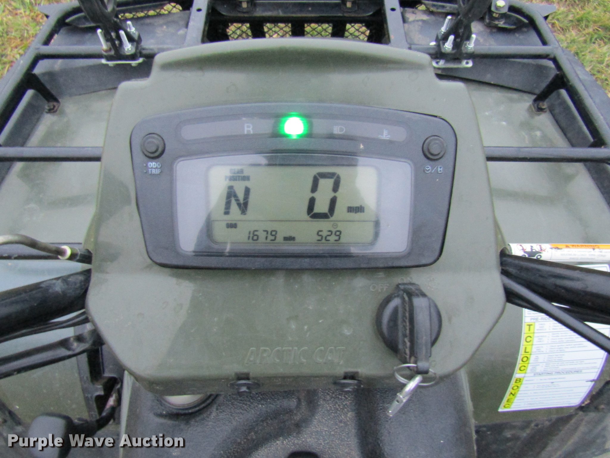 Purple Wave is selling a used ATV in Missouri. This item is a Arctic Cat 500 ATV with the following: 1,679 miles on odometer, 414 hours on meter, One cylinder gas engine, Automatic transmission, Four wheel drive, Electric start, Grill guard, Receiver hitch, AT205/80R12 front tires, AT270/60R12 rear tires