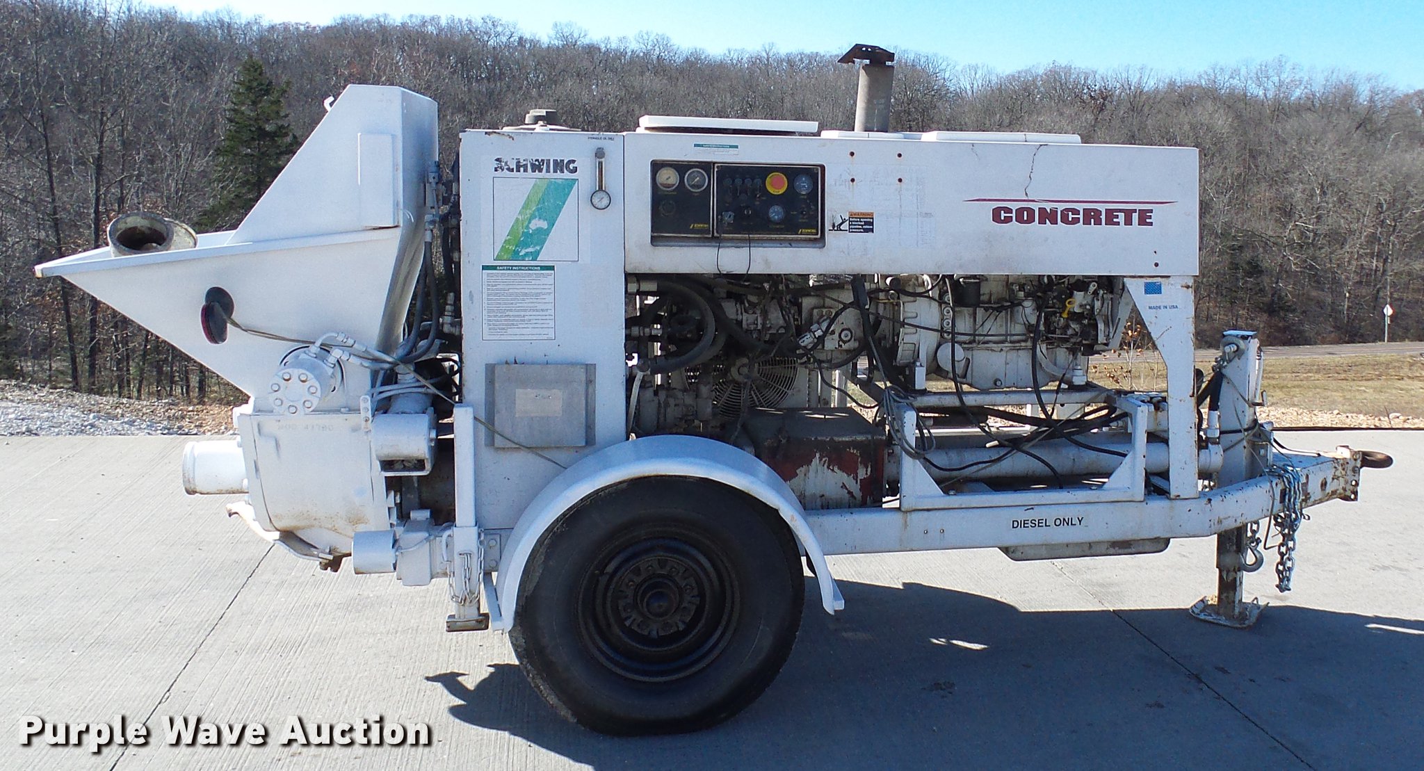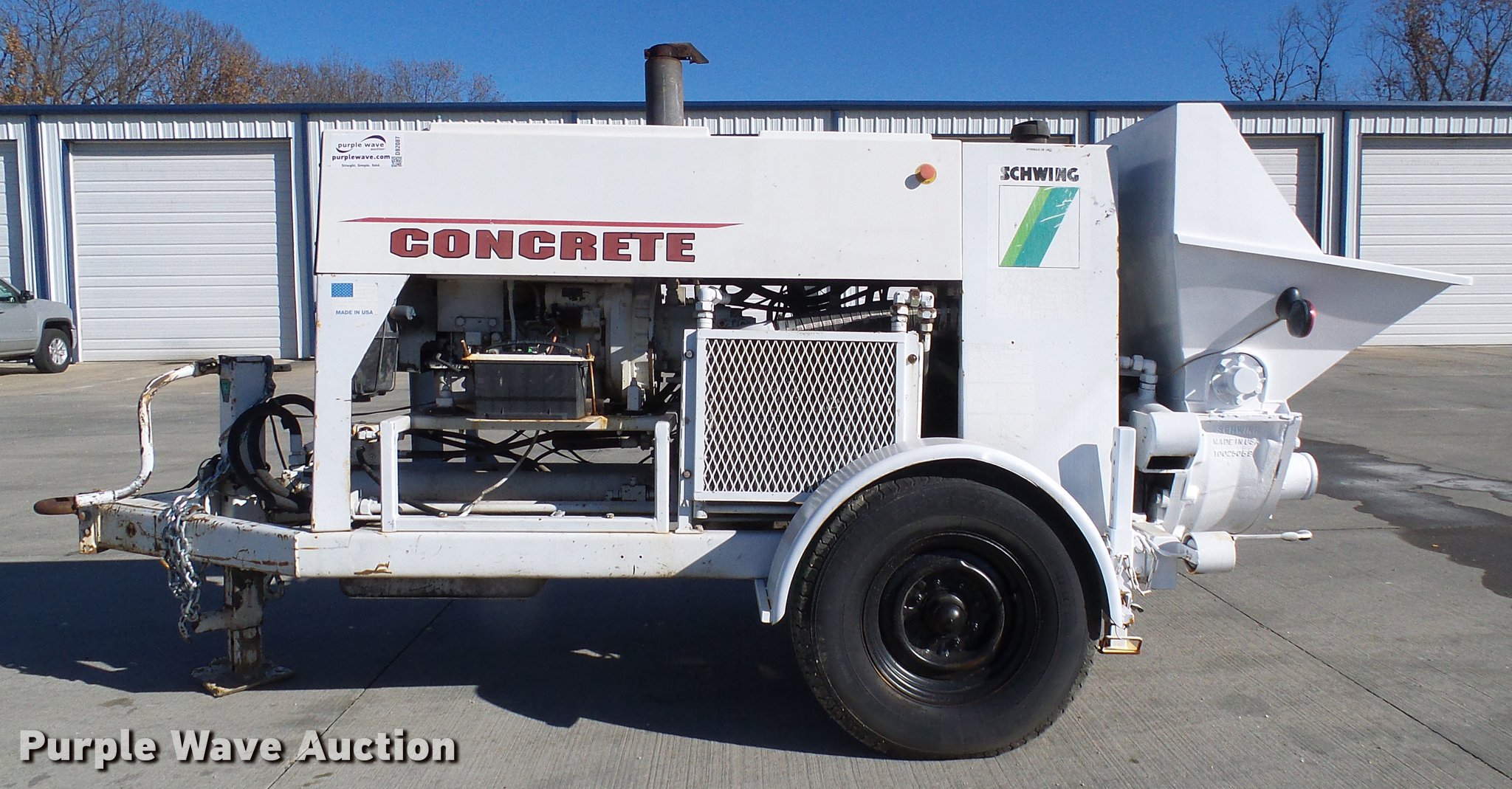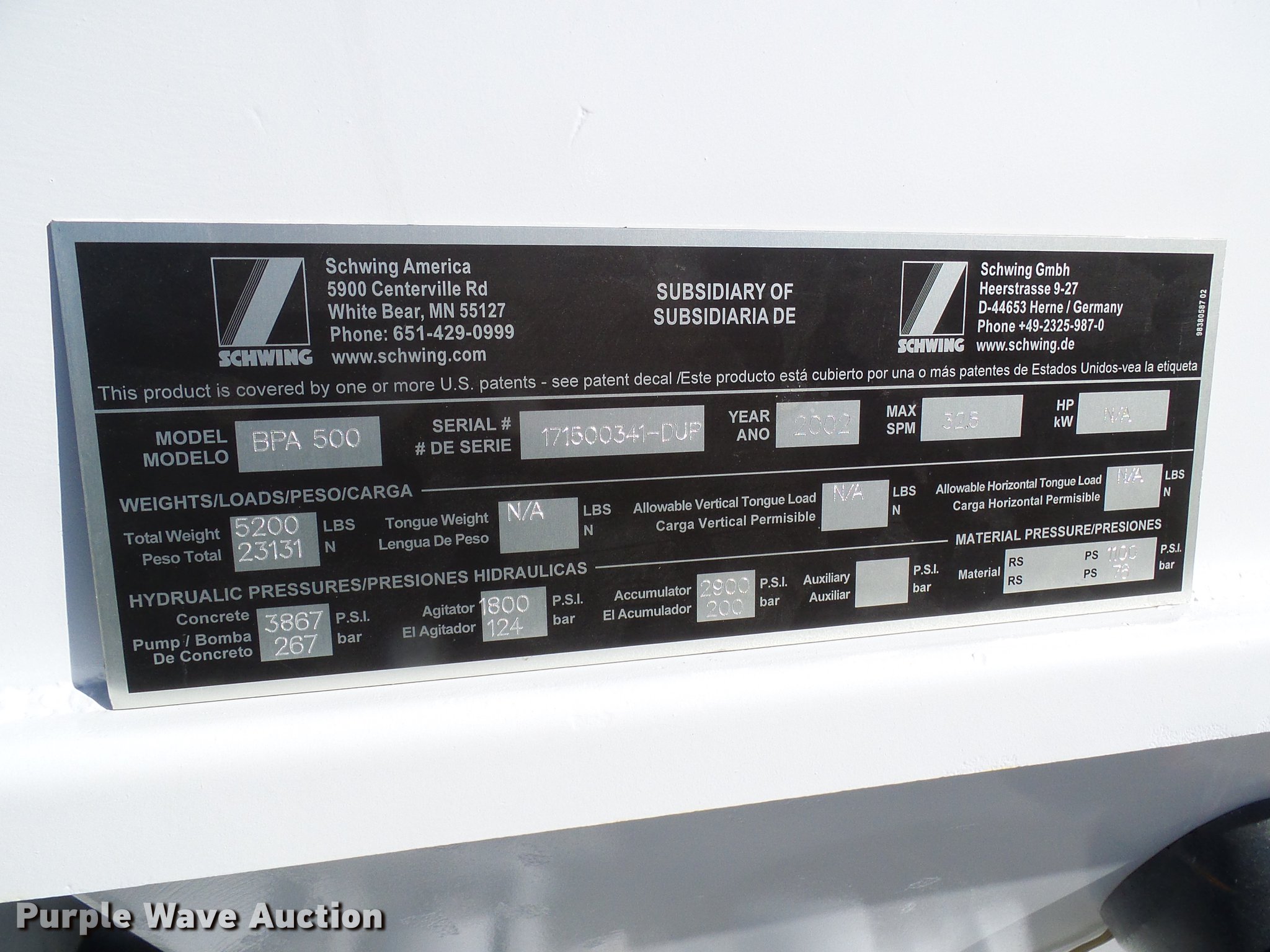 Purple Wave is selling a used Concrete Pump in Missouri. This item is a 2002 Schwing BPA500 concrete pump with the following: 1,017 hours on meter, Deutz four cylinder diesel engine, 2,900 psi accumulator, 1,800 psi agitator, 235/85R16 tires, Serial 171500341-DUP
