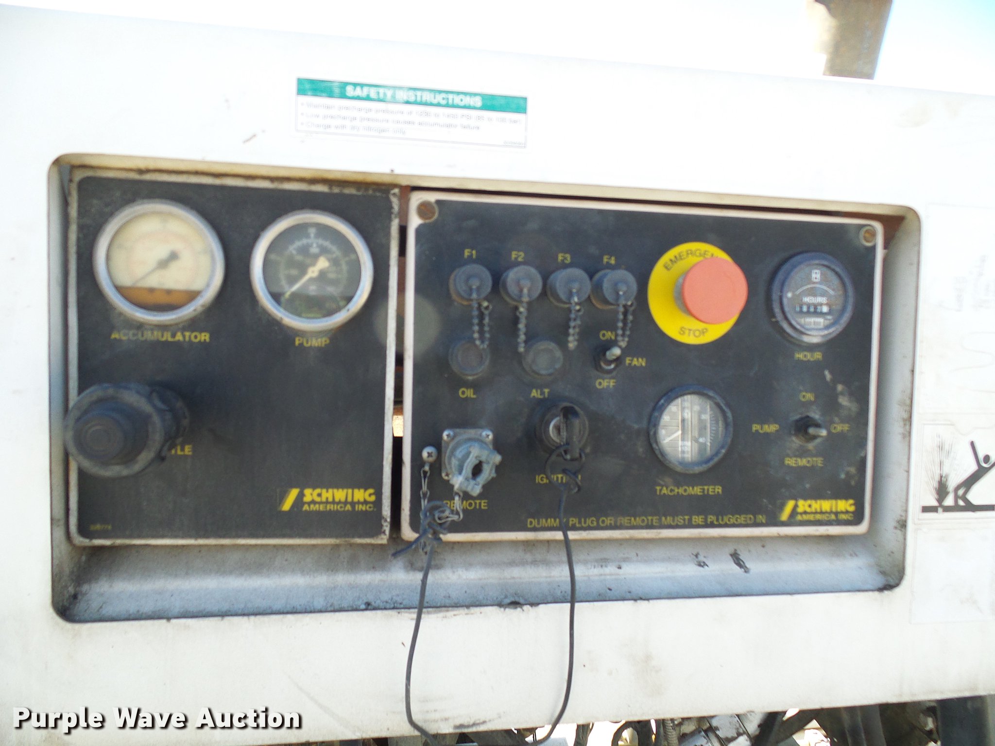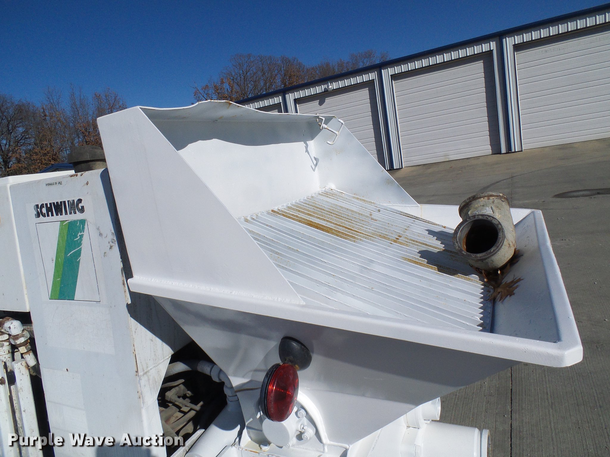 2002 Schwing BPA500 concrete pump. 1,017 hours on meter, Deutz four cylinder diesel engine, 2,900 psi accumulator, 1,800 psi agitator, 235/85R16 tires, Serial 171500341-DUP. Transfer of ownership documentation will be a bill of sale. 171500341-DUP. Nate's Concrete Pumping. 107 Central Hill Rd. Eldon, MO 65026