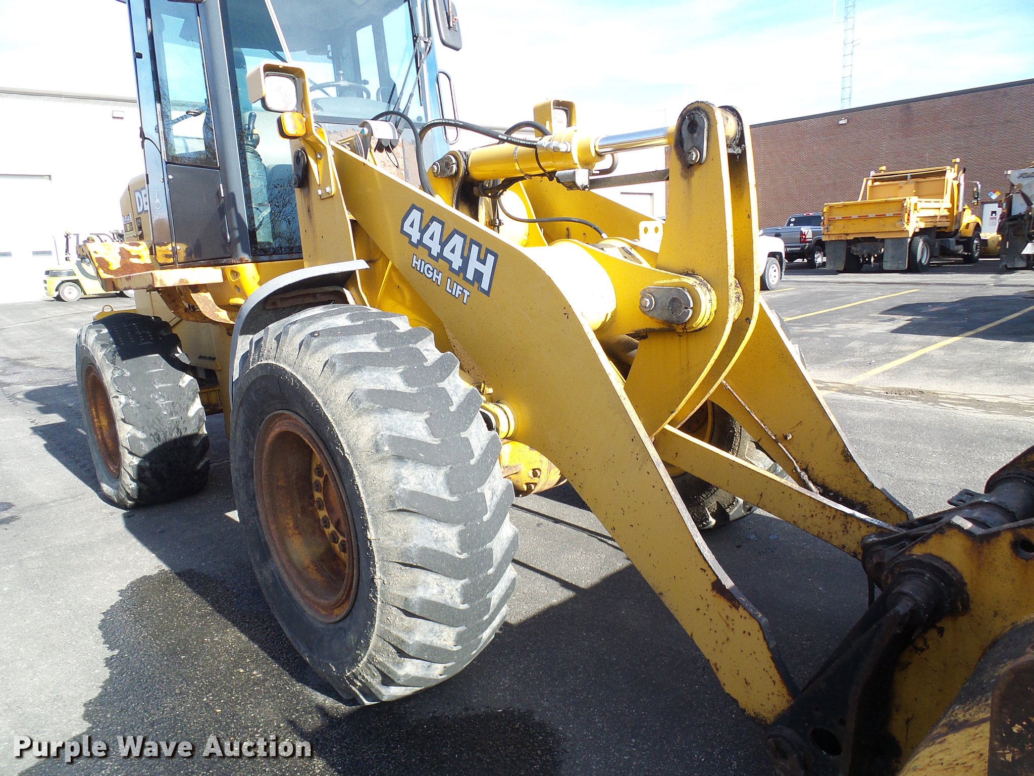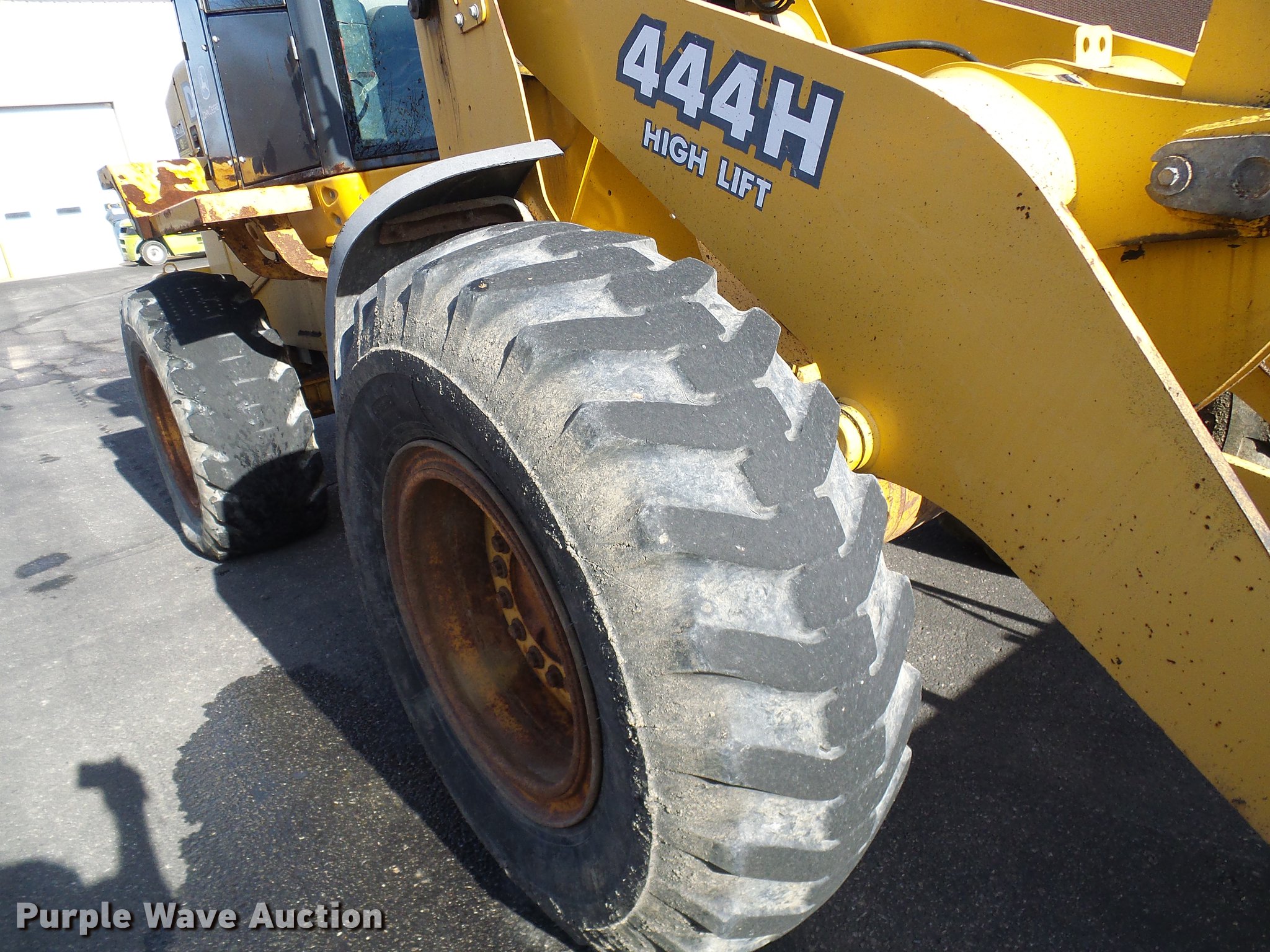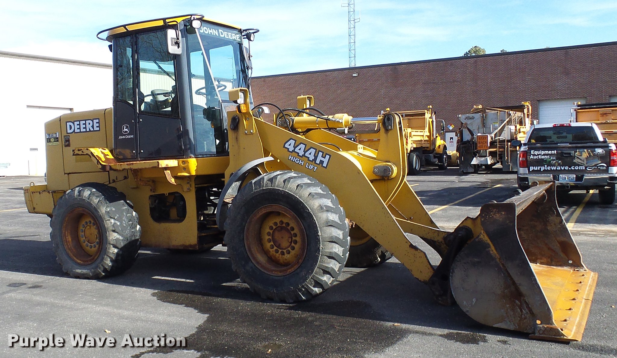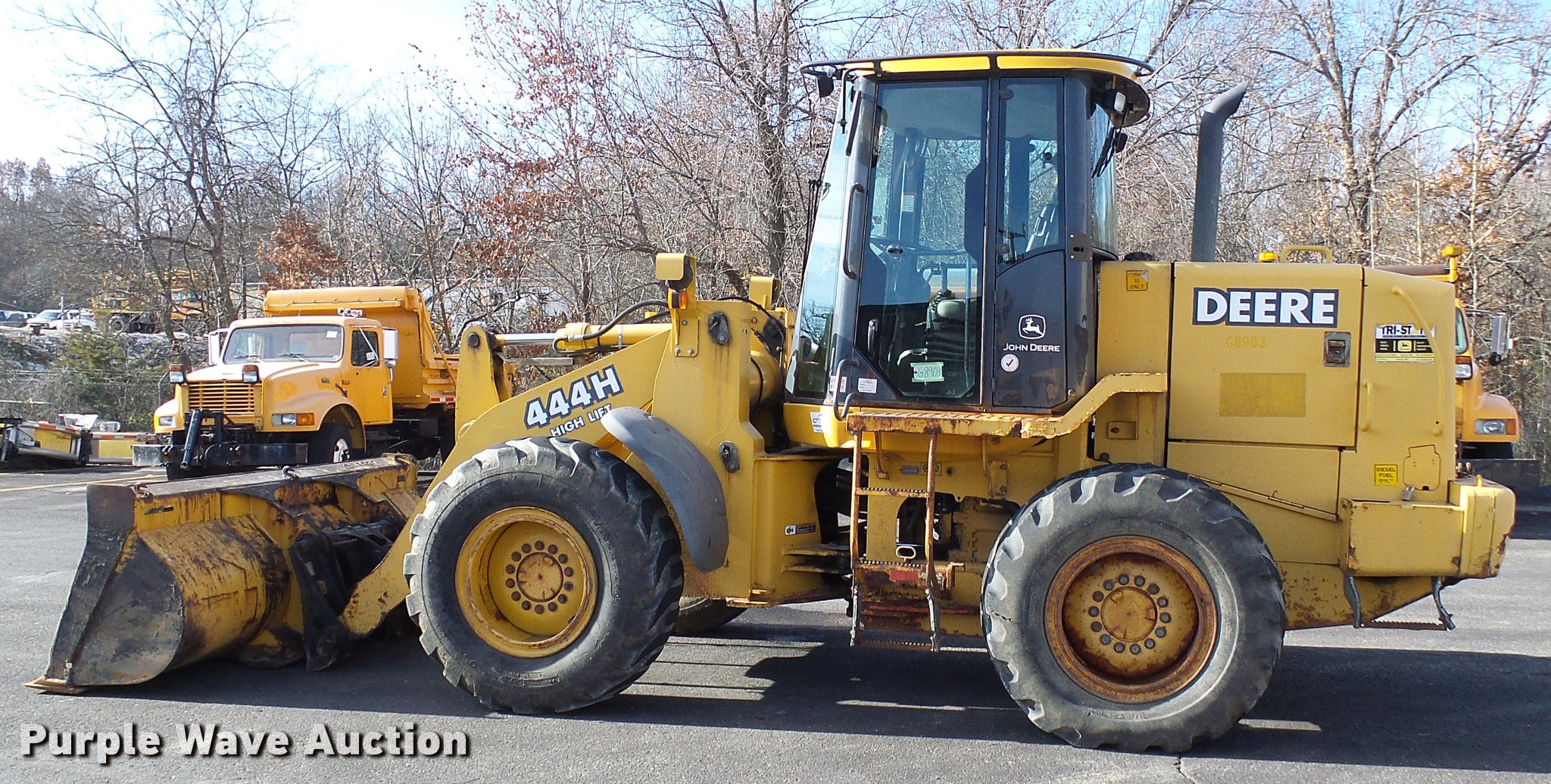 Purple Wave is selling a used Wheel Loader in Missouri. This item is a 2003 John Deere 444H wheel loader with the following: 4,736 hours on meter, John Deere four cylinder turbo diesel engine, Powershift transmission, 4F-4R gears, Front and rear differential lock, Enclosed cab, AC and heat, Tilt steering wheel, Suspension seat, Joystick bucket controls, Front and rear work lights, Wipers, 101"W general purpose bucket, Bolt-on cutting edge, Hydraulic quick coupler, Counterweights, 17.5-25 tires, Serial DW444HX586922, MODOT ID G8903