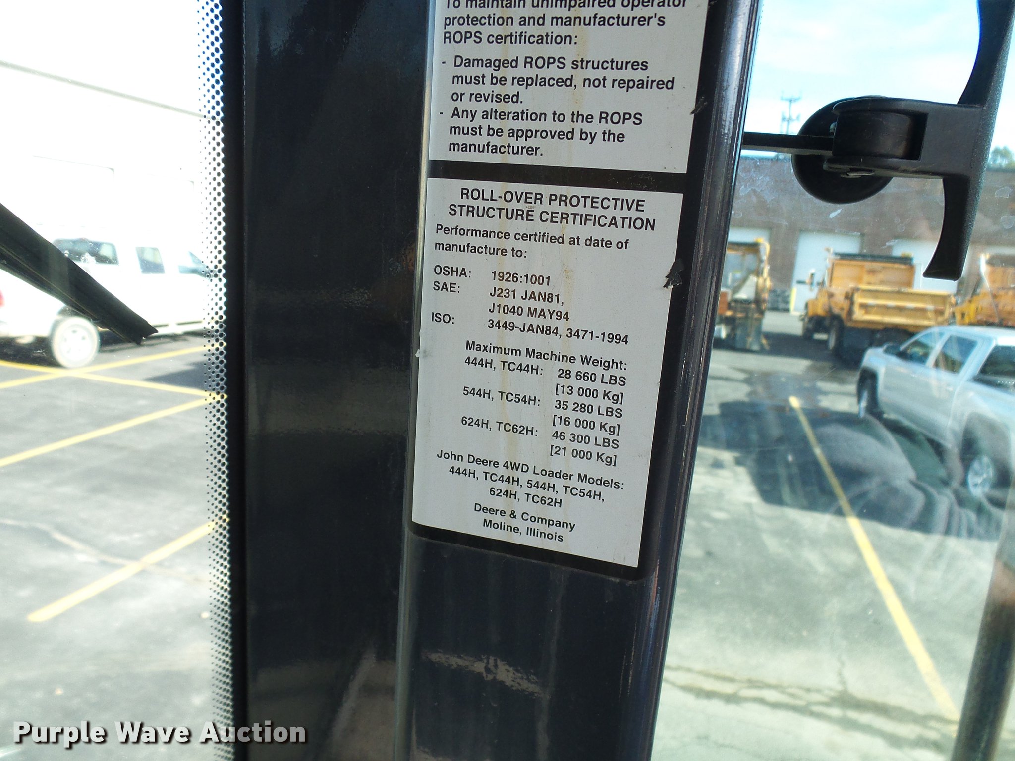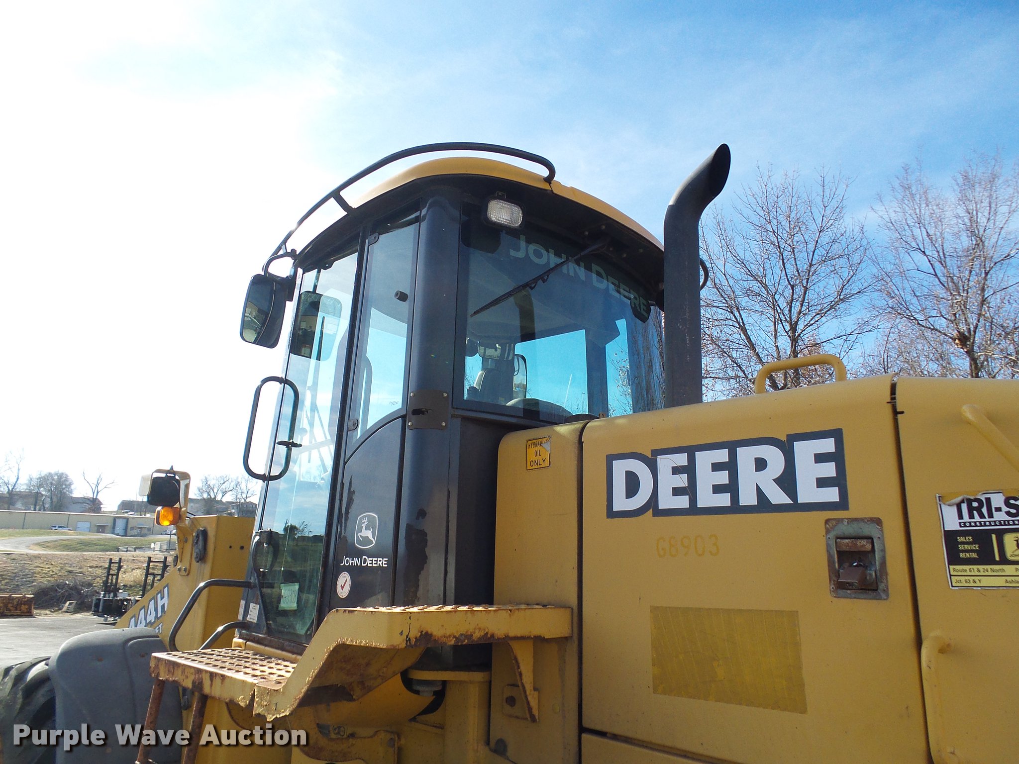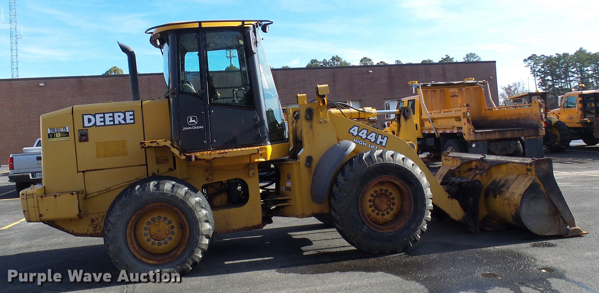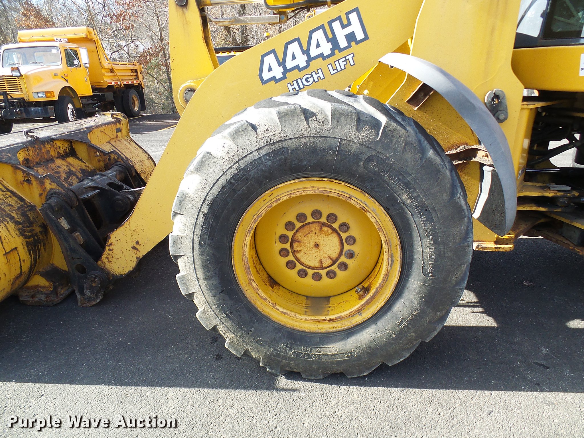 Purple Wave is selling a used Wheel Loader in Missouri. This item is a 2003 John Deere 444H wheel loader with the following: 4,736 hours on meter, John Deere four cylinder turbo diesel engine, Powershift transmission, 4F-4R gears, Front and rear differential lock, Enclosed cab, AC and heat, Tilt steering wheel, Suspension seat, Joystick bucket controls, Front and rear work lights, Wipers, 101"W general purpose bucket, Bolt-on cutting edge, Hydraulic quick coupler, Counterweights, 17.5-25 tires, Serial DW444HX586922, MODOT ID G8903