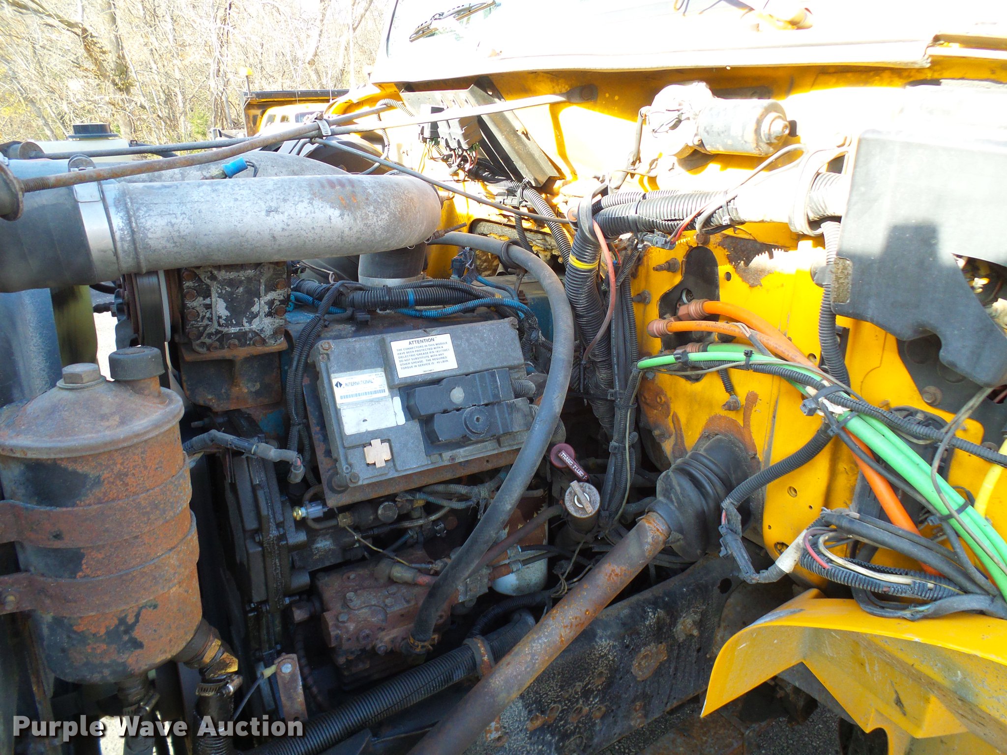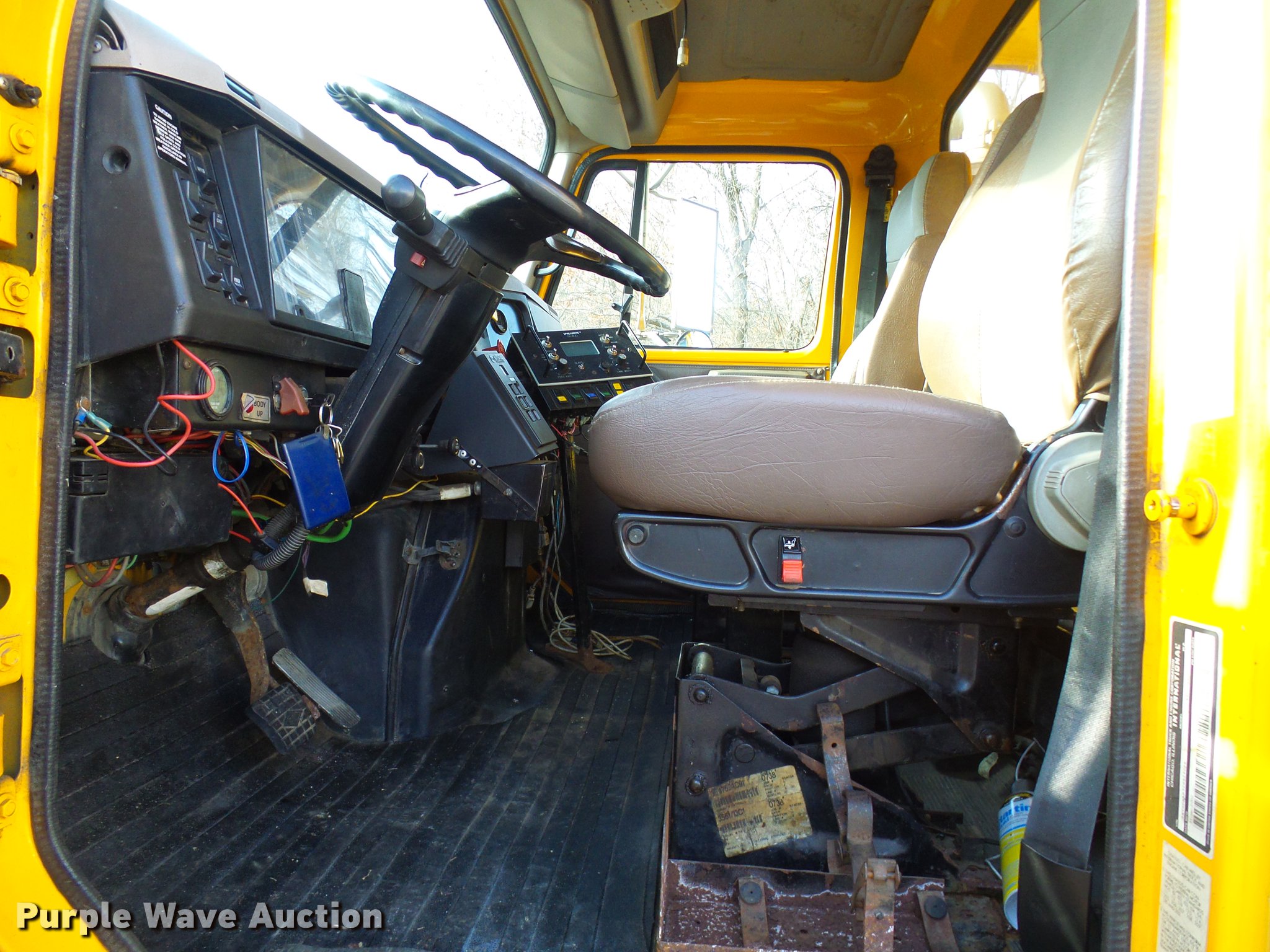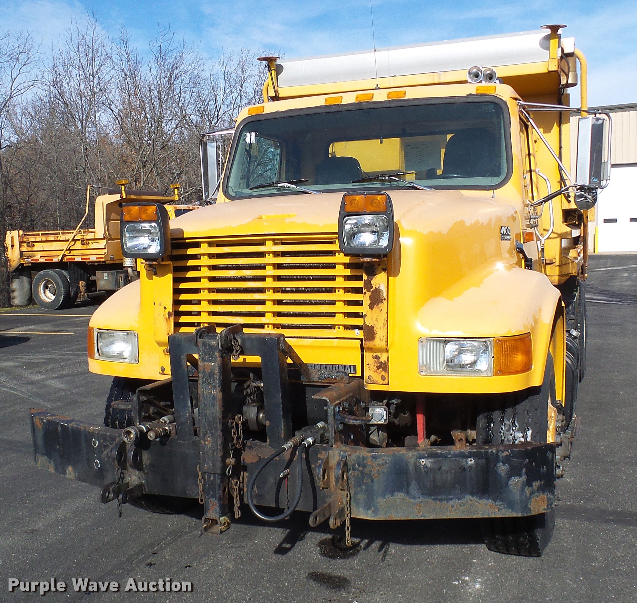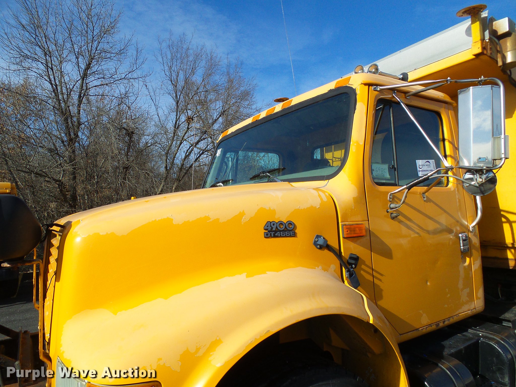Purple Wave is selling a used Construction Dump Truck in Missouri. This item is a 2002 International 4900 dump truck with the following: 129,585 miles on odometer, 8,416 hours on meter, International DT466 7.6L L6 turbo diesel engine, Automatic transmission, Single axle, AC and heat, Cruise, Weatherband radio, Heated mirrors, Air suspension seat, PTO, Galion steel dump bed, 10'L x 8'W, 28" side height, Single ram hoist, Air operated end gate, Roll tarp, Toolboxes, Single fuel tank, Pintle hitch, Trailer wiring, Spring suspension, Air brakes, 315/80R22.5 front tires, 11R22.5 rear tires, MODOT ID 6985