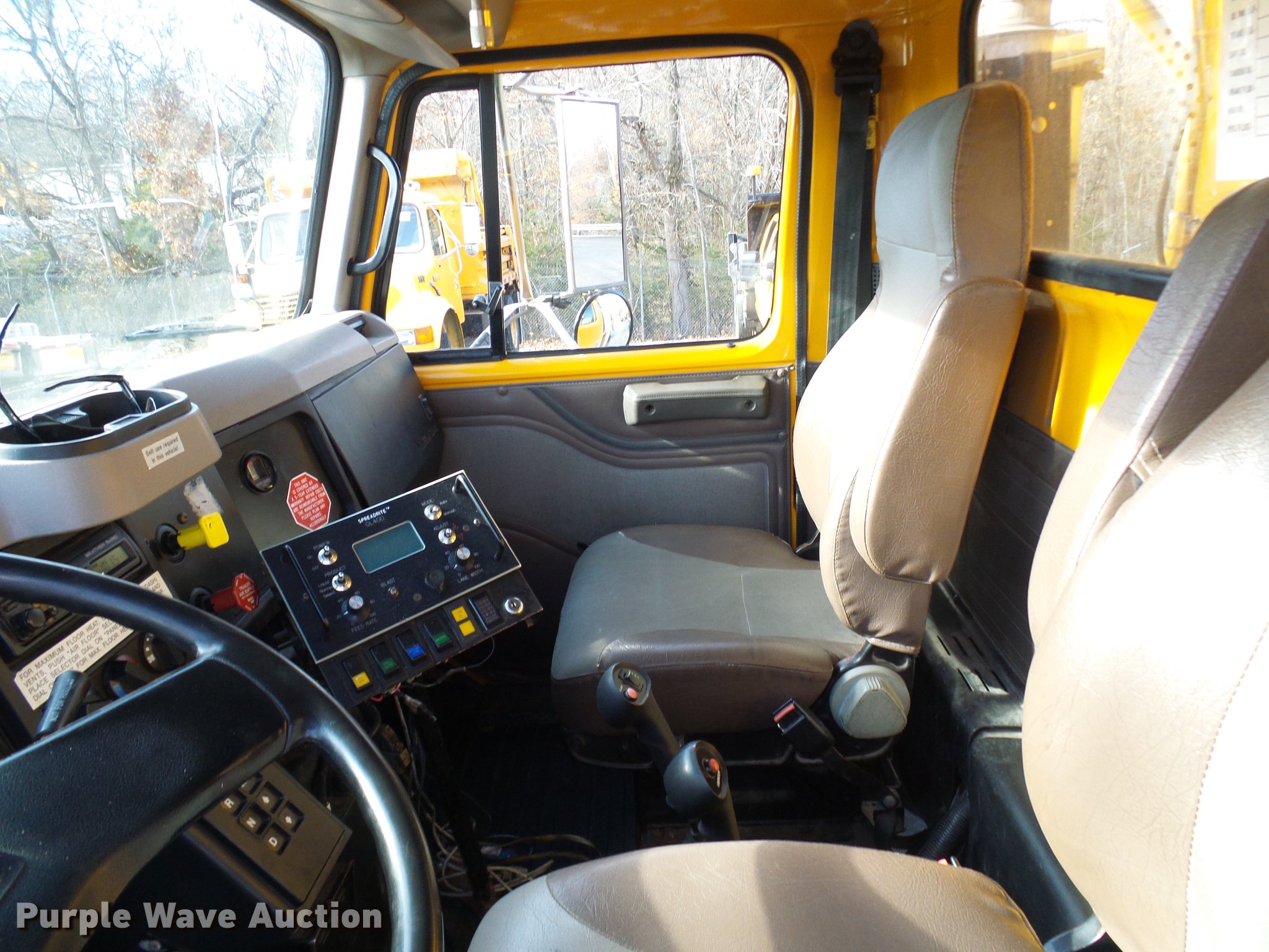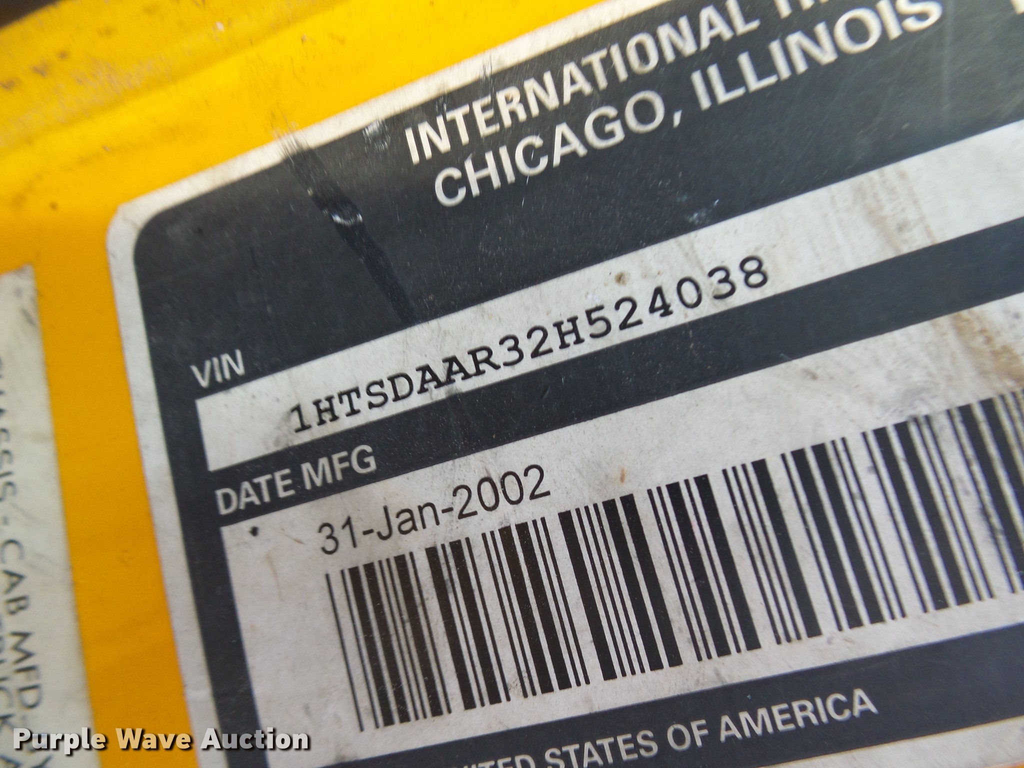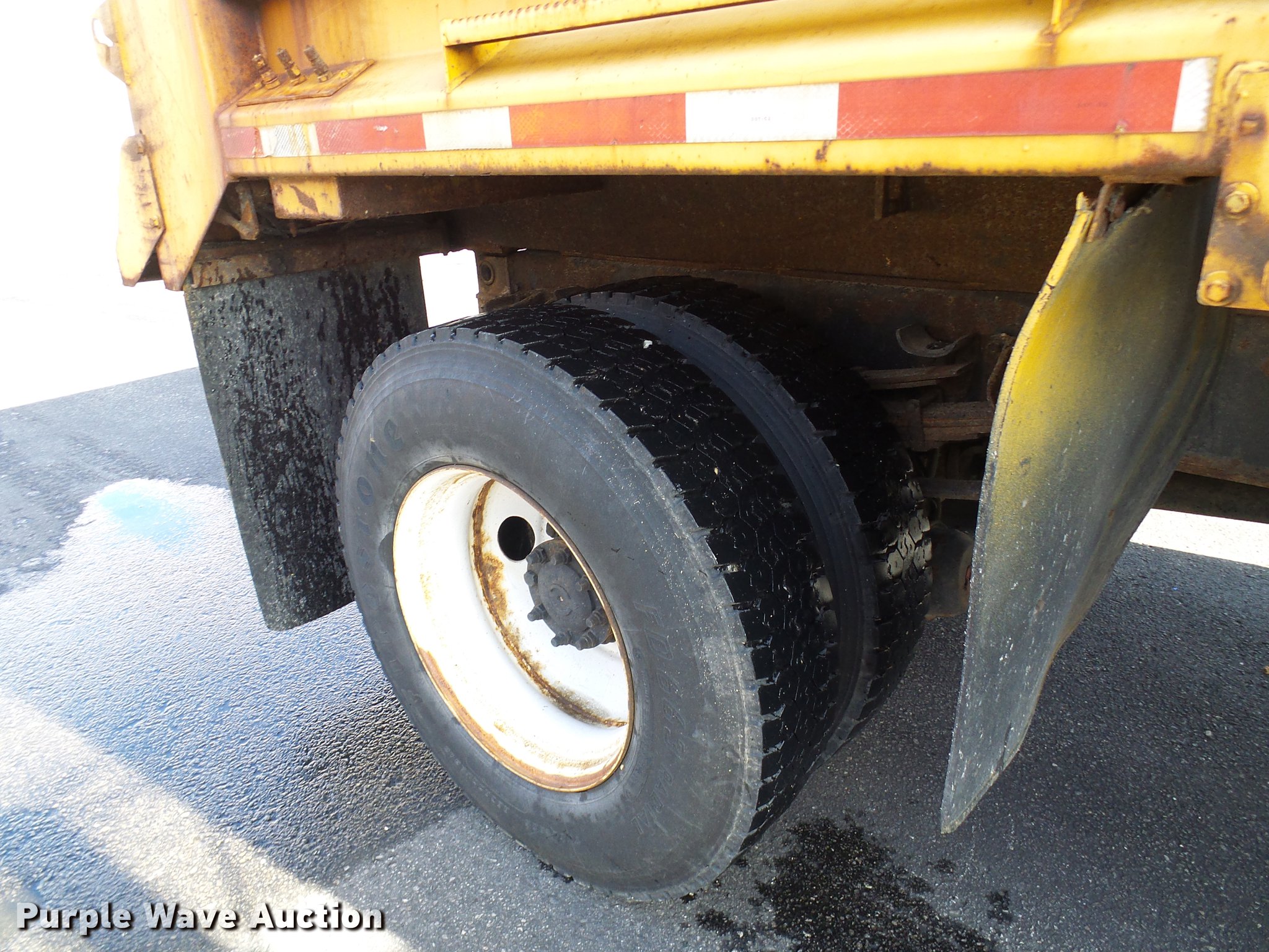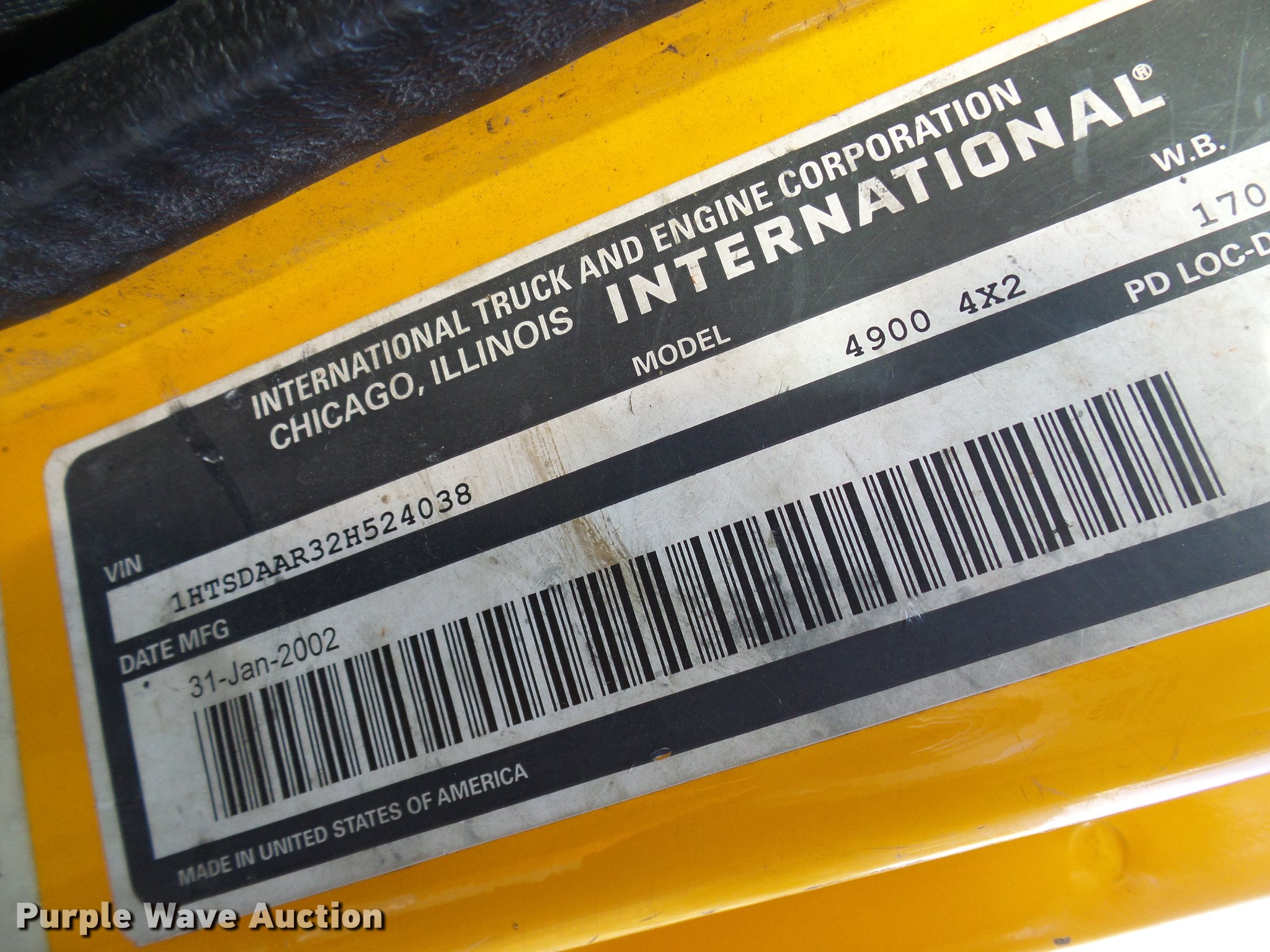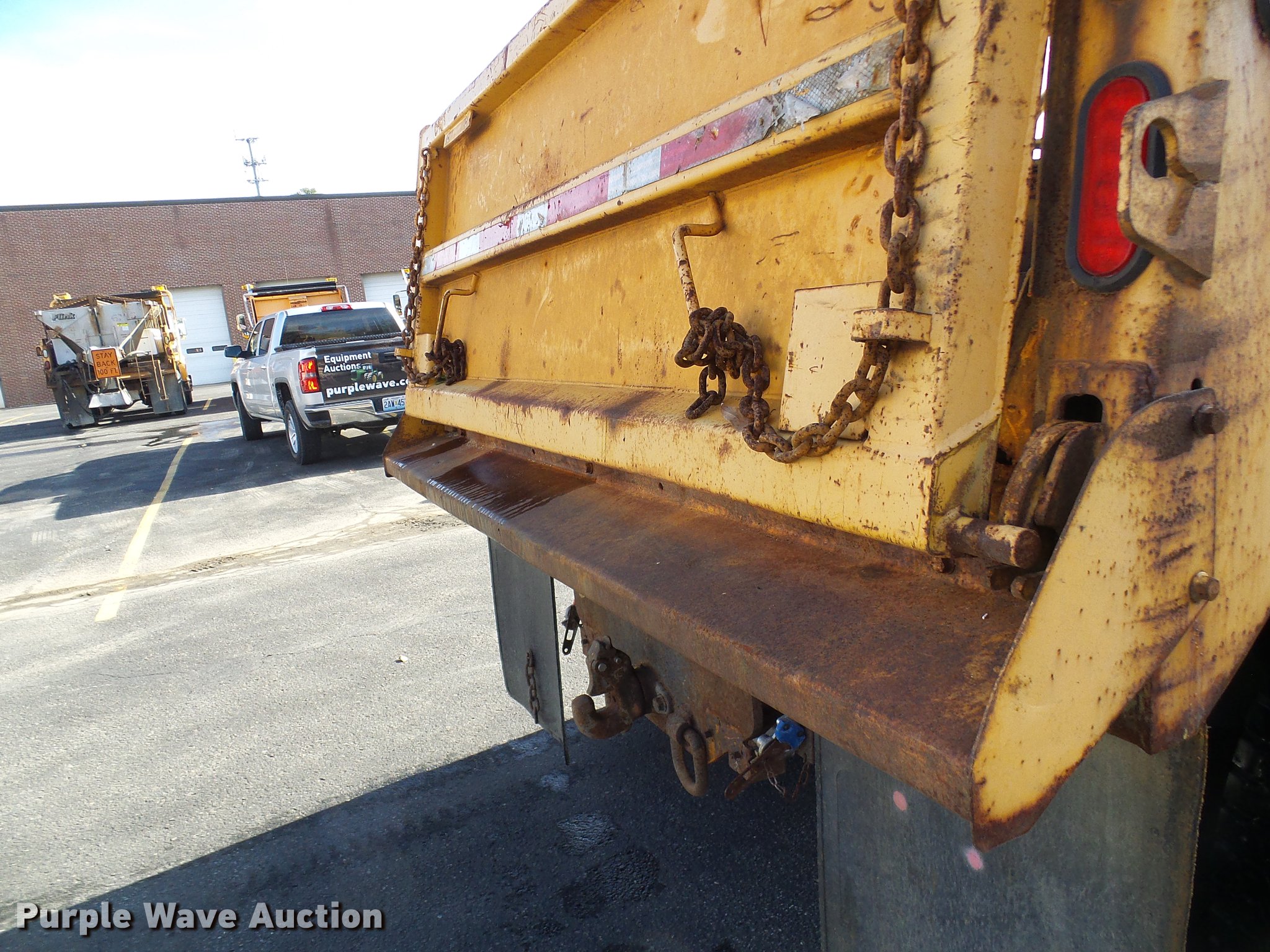Purple Wave is selling a used Construction Dump Truck in Missouri. This item is a 2002 International 4900 dump truck with the following: 129,585 miles on odometer, 8,416 hours on meter, International DT466 7.6L L6 turbo diesel engine, Automatic transmission, Single axle, AC and heat, Cruise, Weatherband radio, Heated mirrors, Air suspension seat, PTO, Galion steel dump bed, 10'L x 8'W, 28" side height, Single ram hoist, Air operated end gate, Roll tarp, Toolboxes, Single fuel tank, Pintle hitch, Trailer wiring, Spring suspension, Air brakes, 315/80R22.5 front tires, 11R22.5 rear tires, MODOT ID 6985