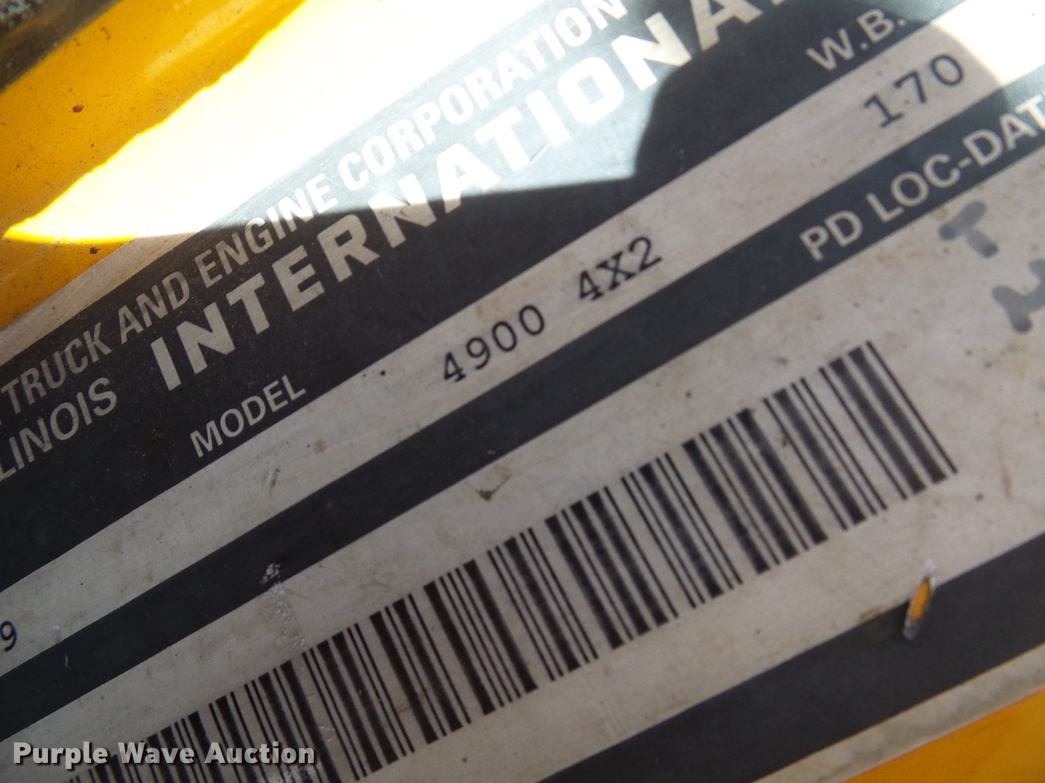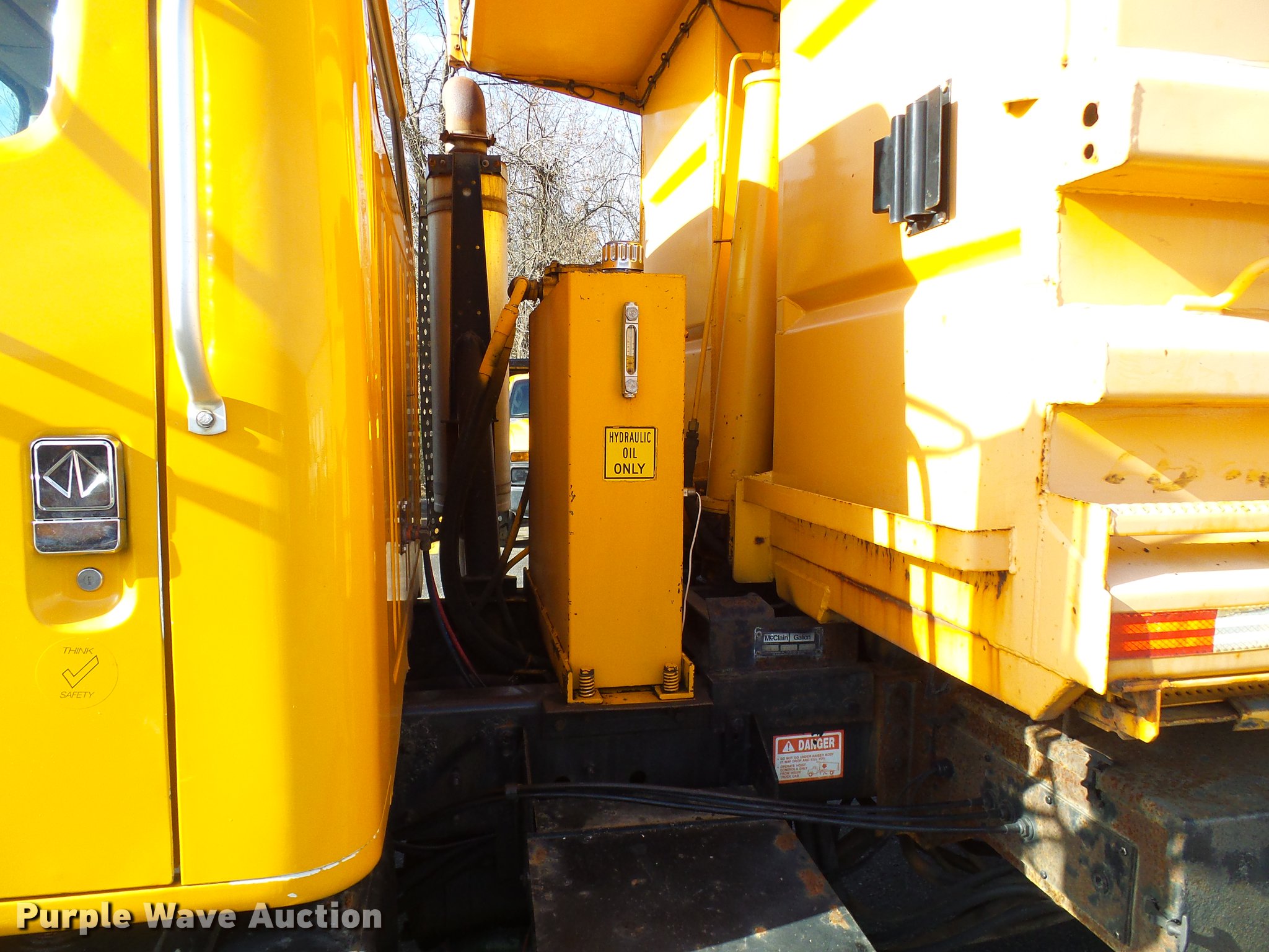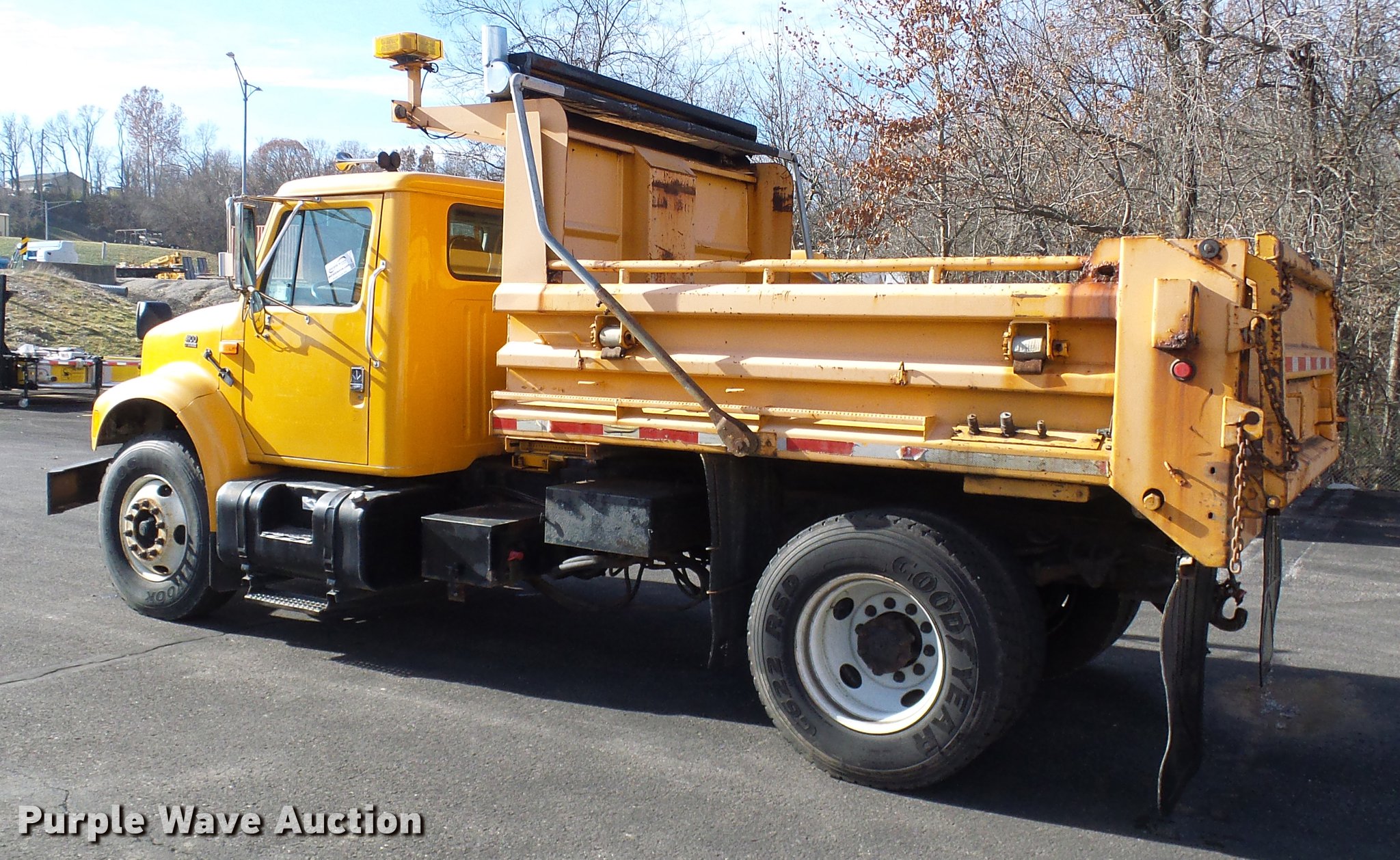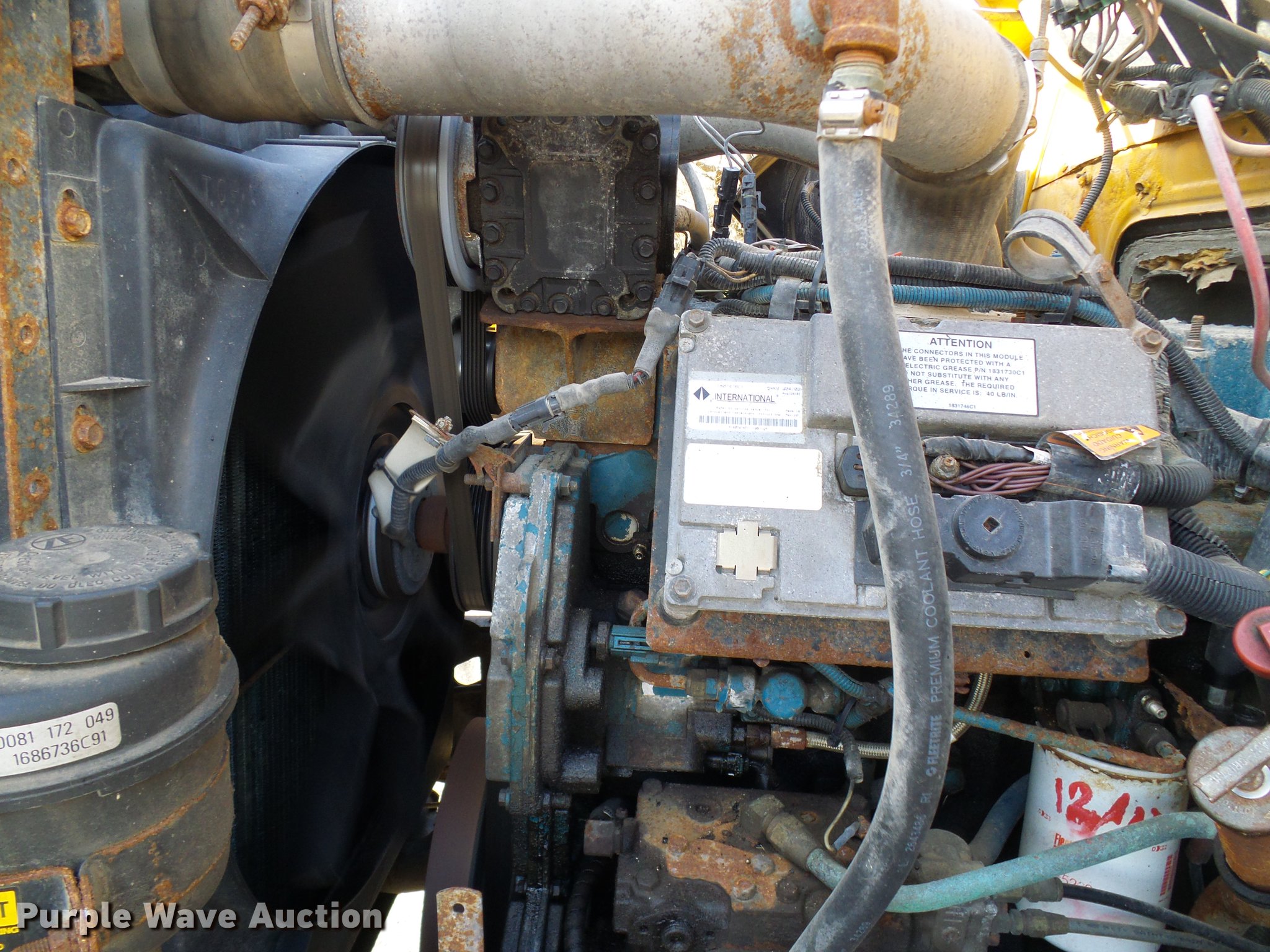Purple Wave is selling a used Construction Dump Truck in Missouri. This item is a 2002 International 4900 dump truck with the following: 203,439 miles on odometer, 10,753 hours on meter, International DT466 7.6L L6 turbo diesel engine, Automatic transmission, Single axle, AC and heat, Weatherband radio, Power and heated mirrors, Air suspension seat, PTO, Galion steel dump bed, 10'L x 8'W, 28" side height, Single ram hoist, Air operated end gate, Roll tarp, Toolboxes, Single fuel tank, Pintle hitch, Trailer wiring, 315/80R22.5 front tires, 11R22.5 rear tires, MODOT ID 6625