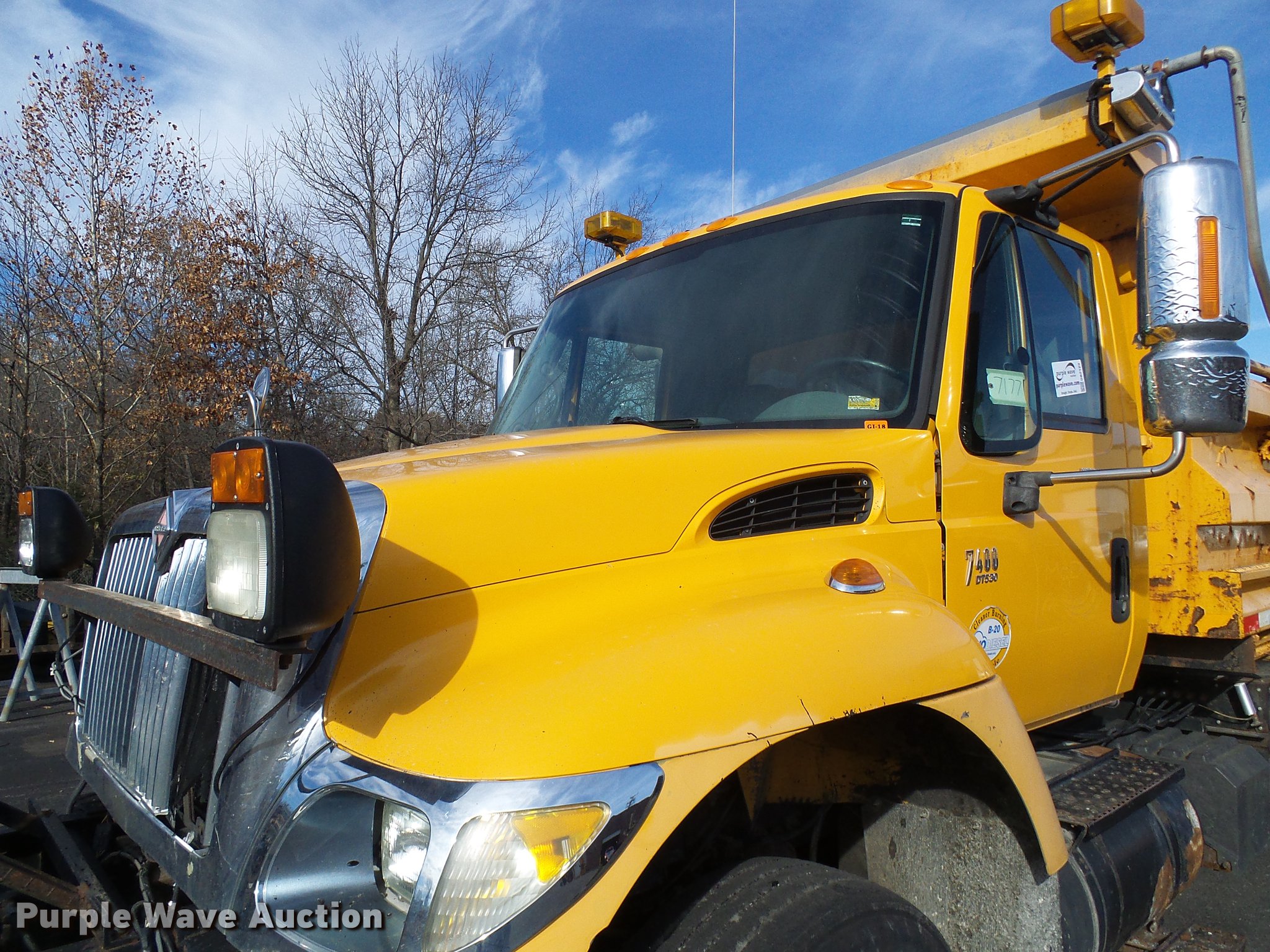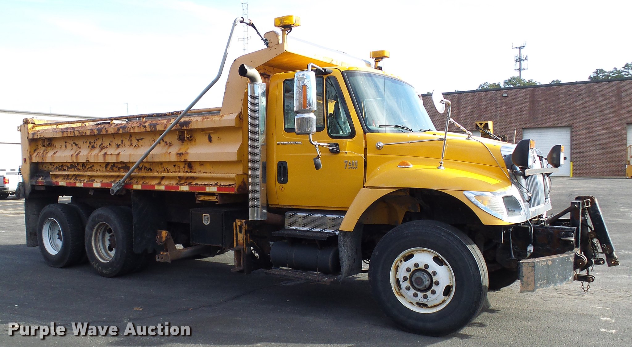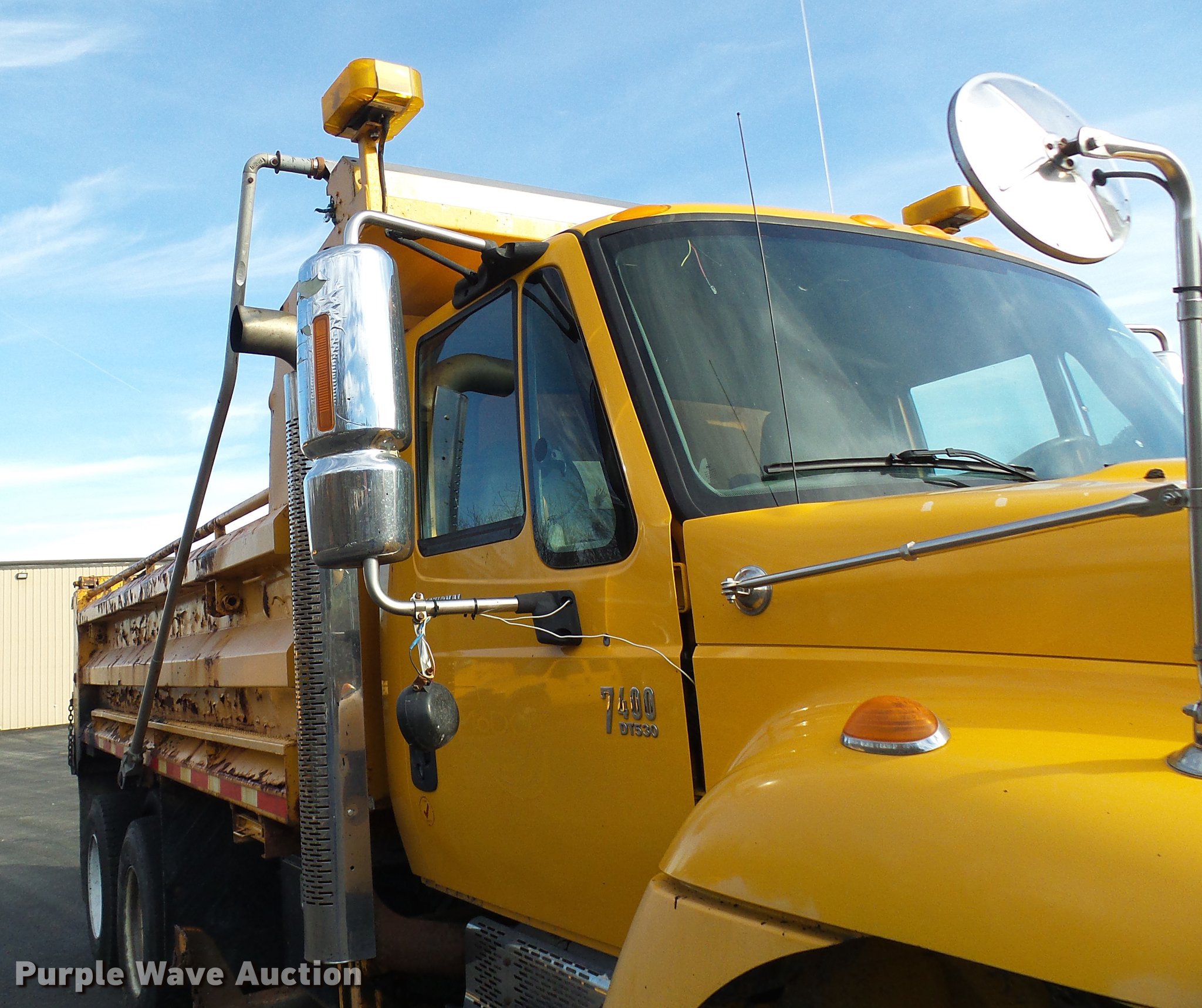 Purple Wave is selling a used Construction Dump Truck in Missouri. This item is a 2004 International 7400 dump truck with the following: 191,292 miles on odometer, 11,727 hours on meter, International DT530 8.7L L6 turbo diesel engine, Automatic transmission, Tandem axle, AC and heat, Cruise, AM/FM, Power windows and mirrors, Heated mirrors, Air suspension seat, PTO, Galion steel dump bed, 16'L x 8'W, 36" side height, Single ram hoist, Air operated end gate, Roll tarp, Toolboxes, Plow in bed, Single fuel tank, Pintle hitch, Trailer wiring, Spring suspension, Air brakes, 11R22.5 tires, MODOT ID 7177