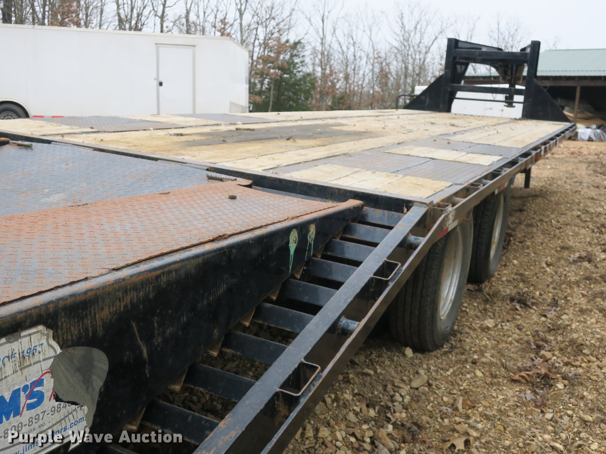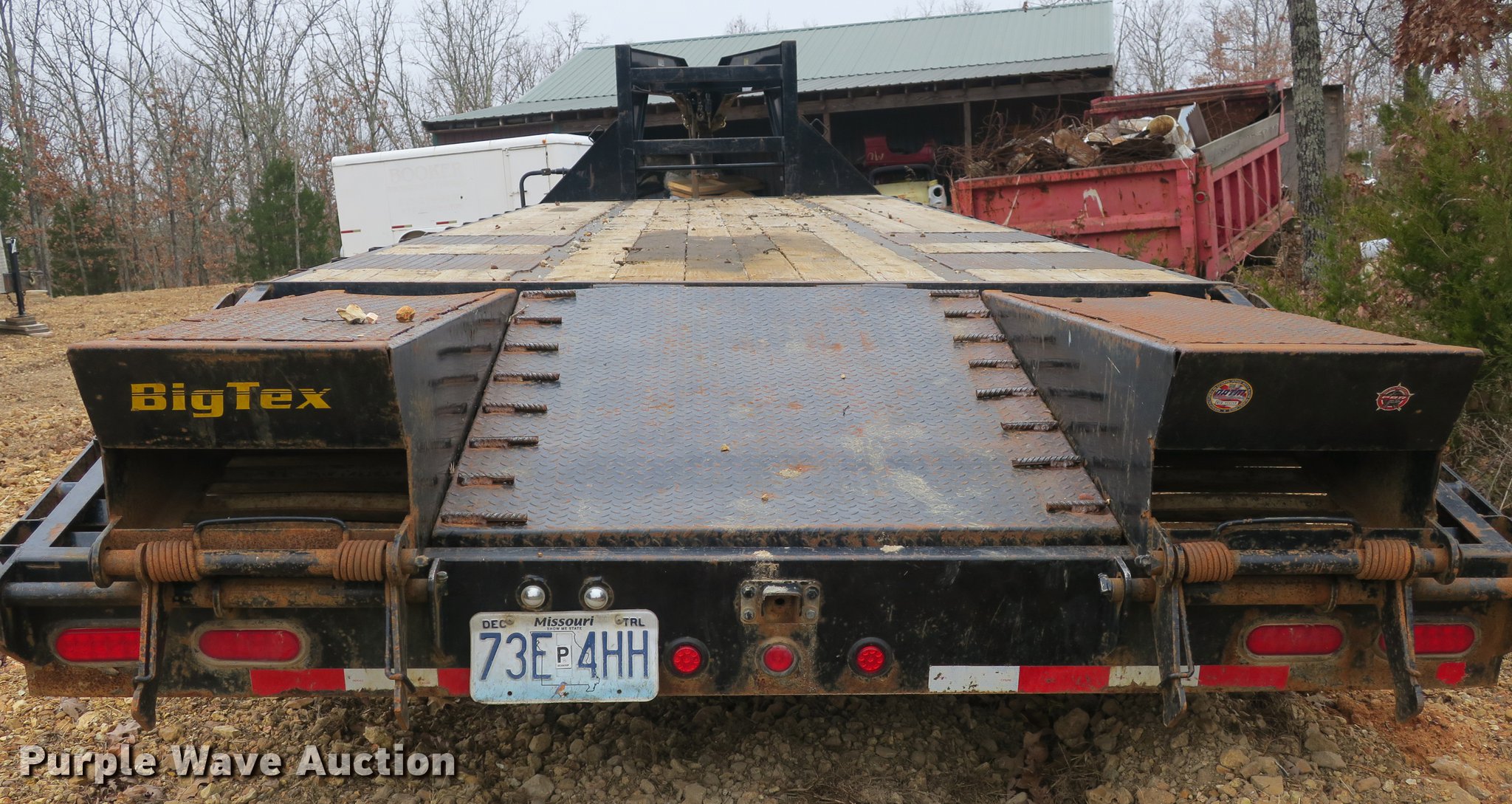 Purple Wave is selling a used Equip. Trailer in Missouri. This item is a 2014 Big Tex 22GN equipment trailer with the following: 36' overall length, 25'L x 101"W wood deck, 5'L dovetail, 5'L ramps, Stake side pockets, Toolbox, Gooseneck hitch, Dual leg landing gear, Spring suspension, Electric brakes, 48" tandem spread axle, Steel wheels, ST235/80R16 tires, GAWR 10,000 lbs