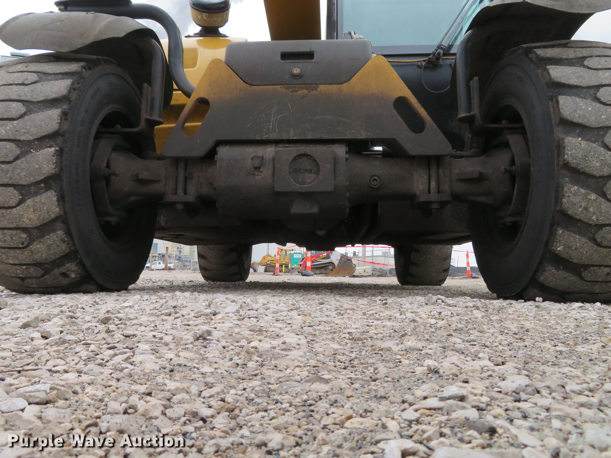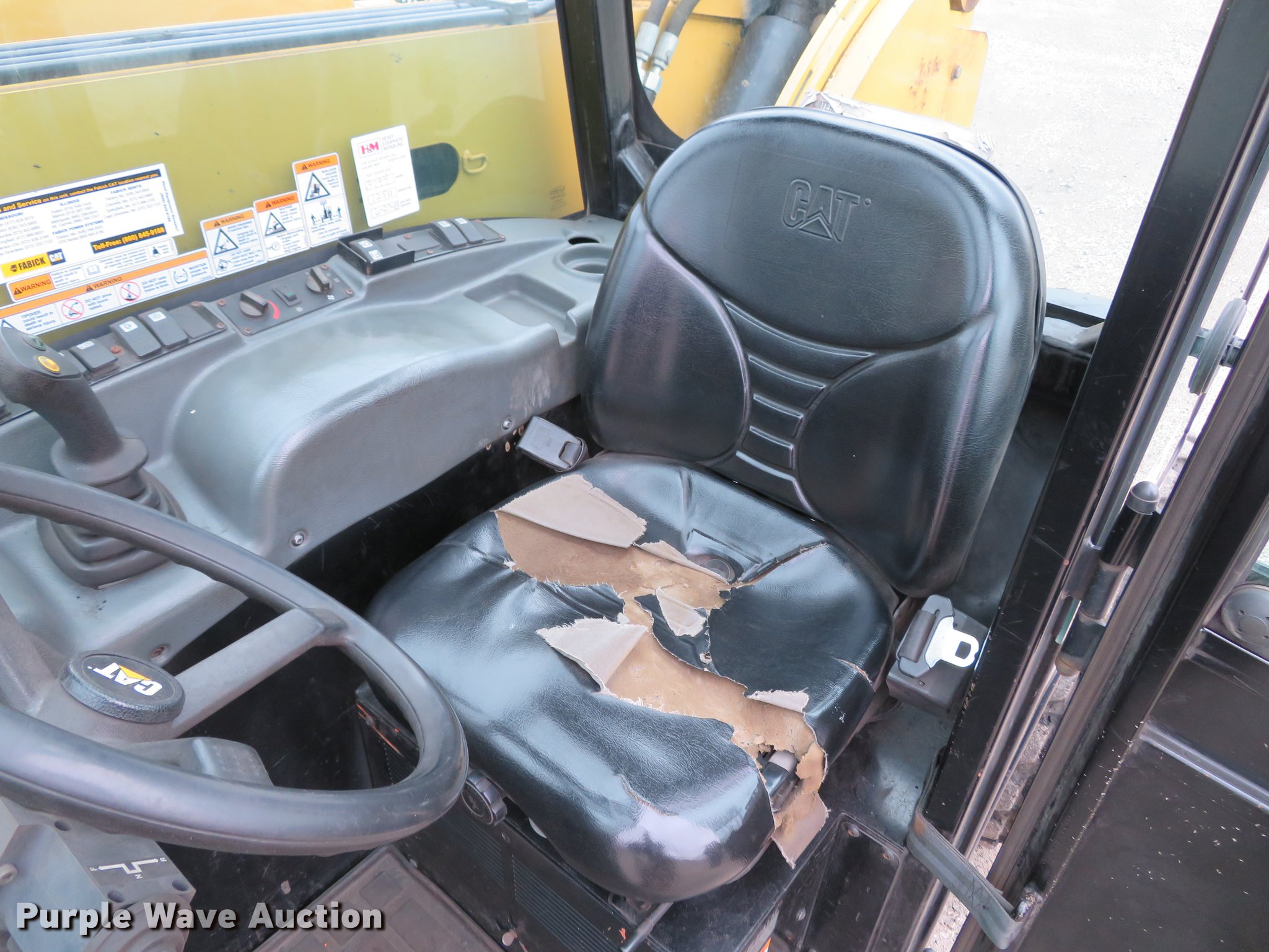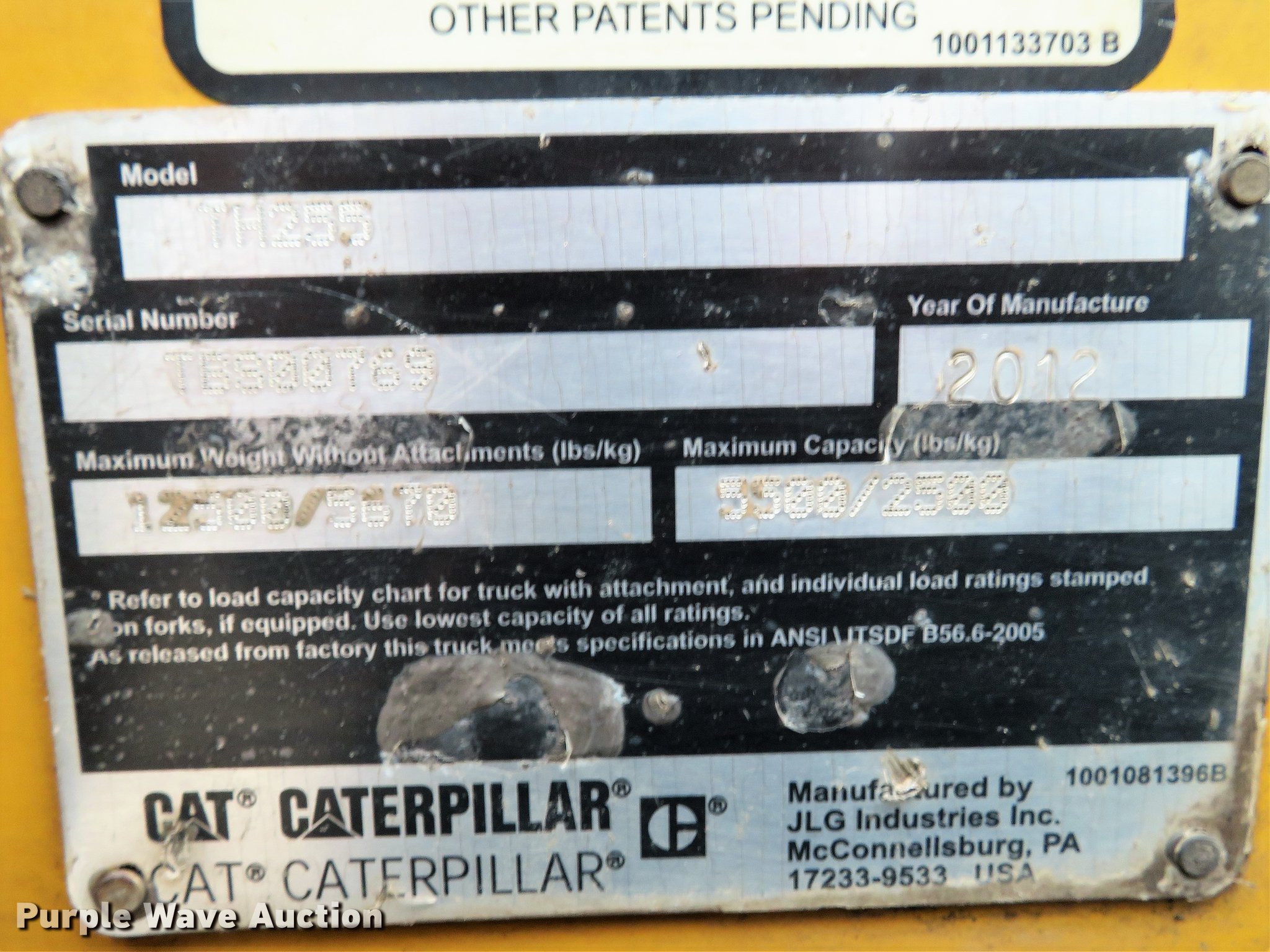 Purple Wave is selling a used Telehandler in Missouri. This item is a 2012 Caterpillar TH255 telehandler with the following: 3,148 hours on meter, Caterpillar C4.4 four cylinder diesel engine, 74 HP, Hydrostatic transmission, Crab steer, Four wheel steer, EROPS, AC and heat, Tilt, Backup alarm, Work lights, Wiper, 5,500 lbs maximum lift capacity, 18'4" maximum lift height, 10'11" maximum reach, Single stage boom, 78"W bucket, Bolt-on cutting edge, .62 cu.yd. capacity, Manual quick coupler, 12-16.5 foam filled tires, Serial TBS00769