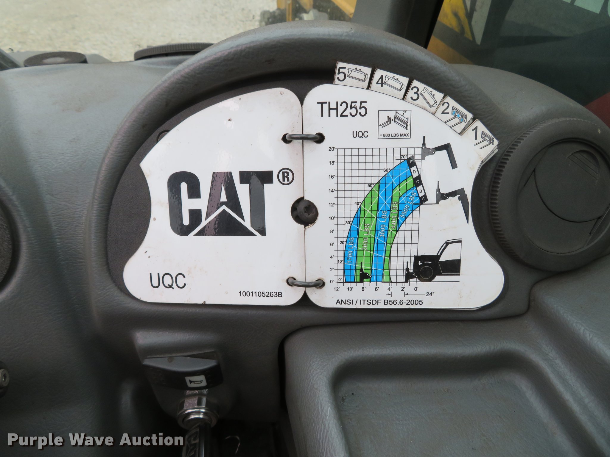2012 Caterpillar TH255 telehandler. 3,148 hours on meter, Caterpillar C4.4 four cylinder diesel engine 74 HP, Hydrostatic transmission, Crab steer , Four wheel steer, EROPS, AC and heat, Tilt, Backup alarm, Work lights, Wiper, 5,500 lbs maximum lift capacity, 18'4" maximum lift height, 10'11" maximum reach, Single stage boom, 78"W bucket Bolt-on cutting edge,.62 cu.yd. capacity, Manual quick coupler, 12-16.5 foam filled tires, Serial TBS00769. Tinuum Services LLC. West Alton, MO 63386