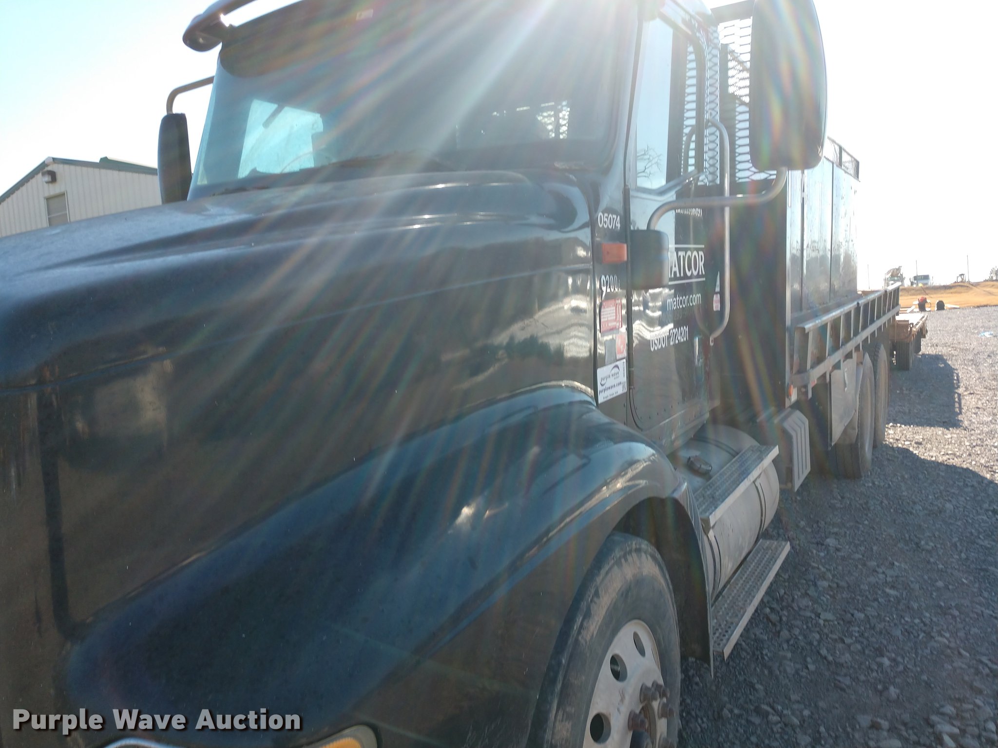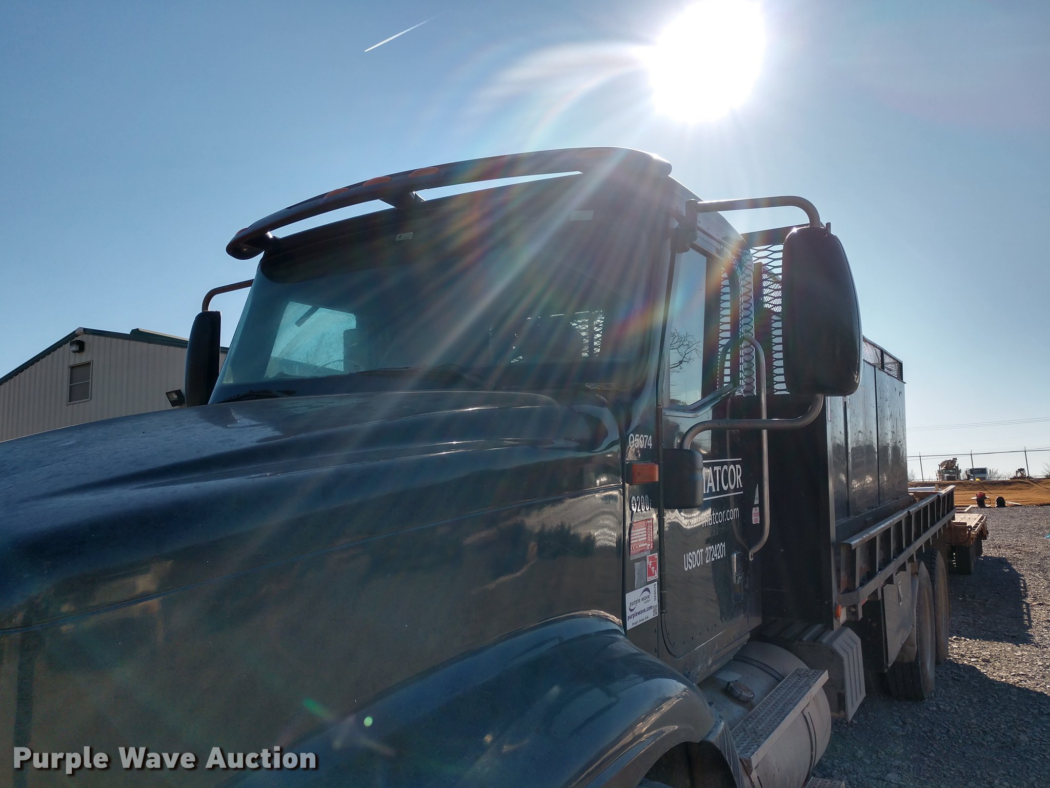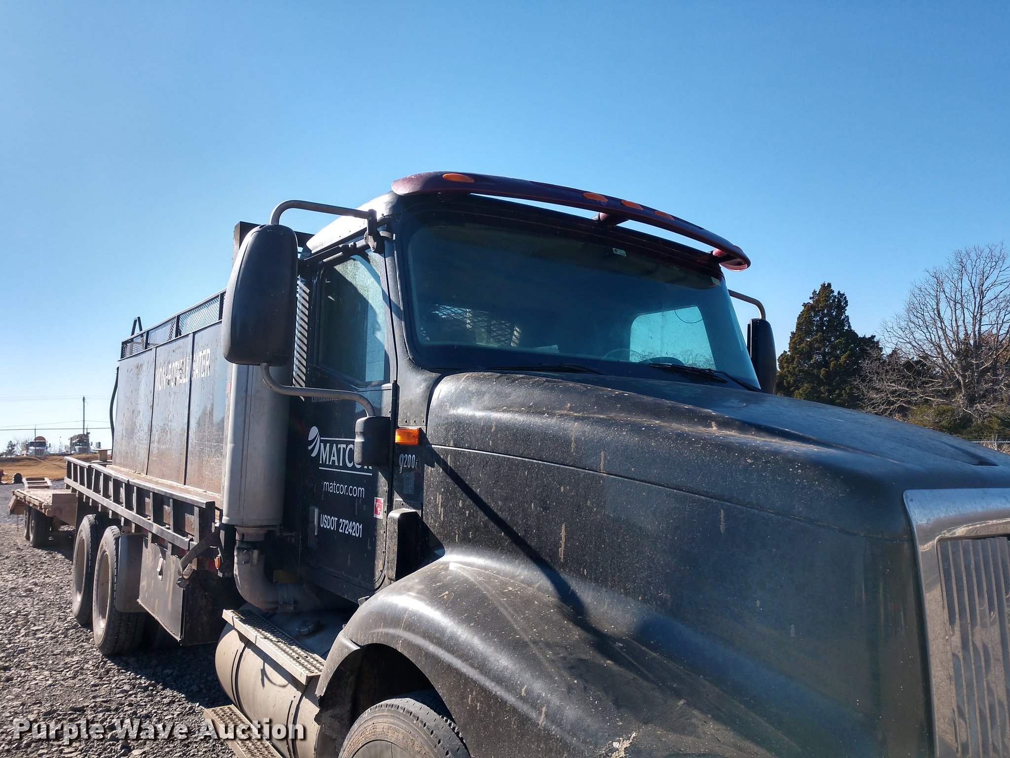 Purple Wave is selling a used Flat Bed Truck in Oklahoma. This item is a 2005 International 9200i flatbed truck with the following: 456,693 miles on odometer, Cummins ISX 14.9L L6 turbo diesel engine, 10 speed manual transmission, Inter-axle differential lock, AC and heat, Cruise, AM/FM, Air suspension seat, Exterior visor, 20'L x 8'W flatbed, 19'L x 67" x 45" tank, Air suspension, Air brakes, 295/75R22.5 tires, Non-operational AC, Unit# 4018