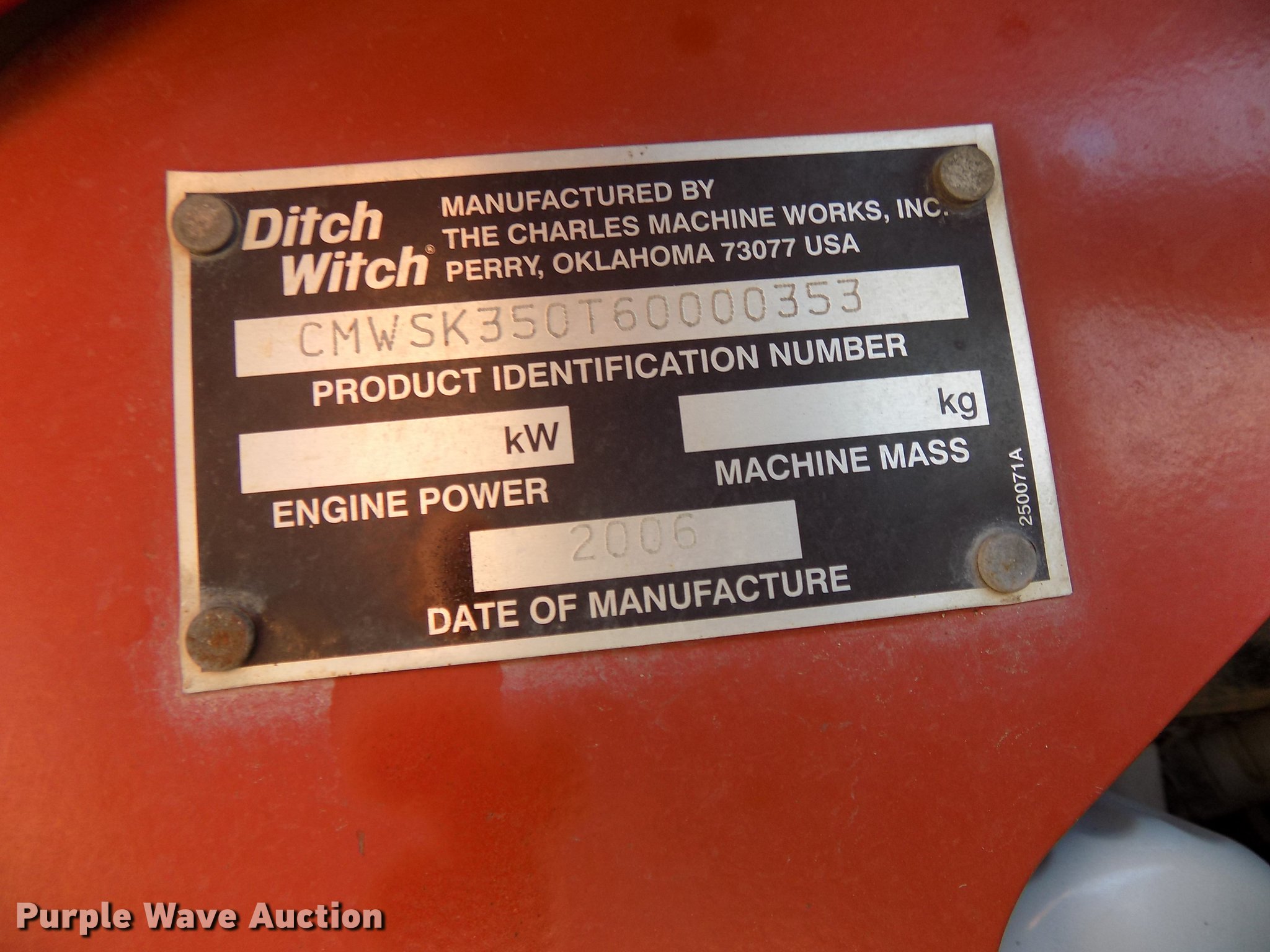 Purple Wave is selling a used Compact Utility Loader in Nebraska. This item is a 2006 Ditch Witch SK350 compact utility loader with the following: Kohler Command Pro 20 CH20S 624cc V-twin gas engine, 20 HP, Hydrostatic transmission, Hand controls, Auxiliary hydraulics, 34"W bucket, Bolt-on tooth bar, Taeryuk 7"W tracks, Serial CMWSK350T60000353, Unit# 454798
