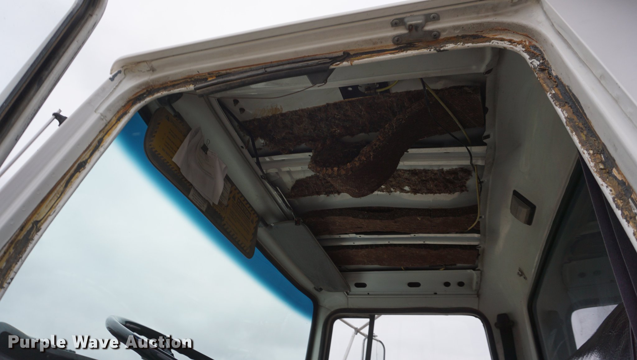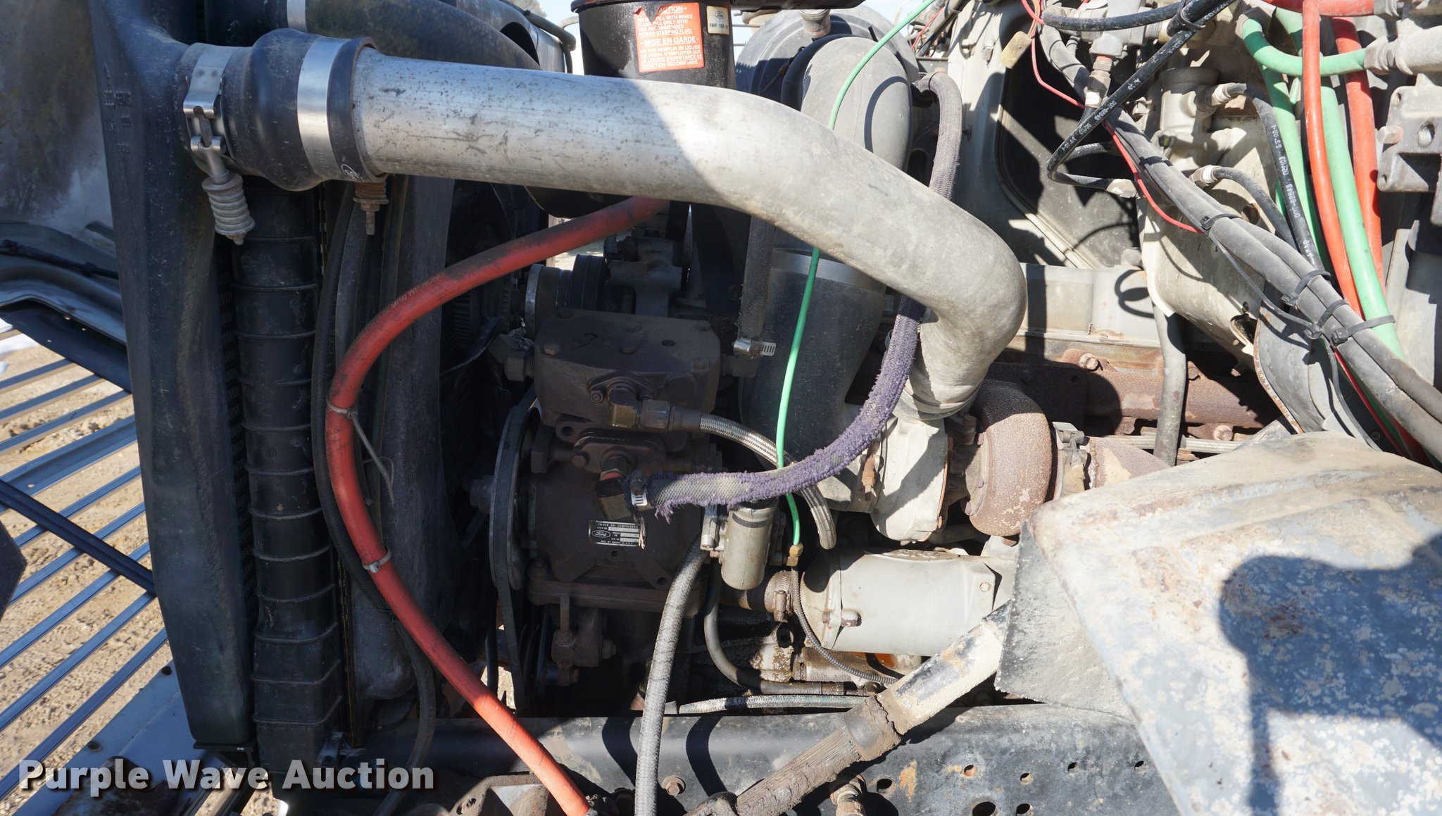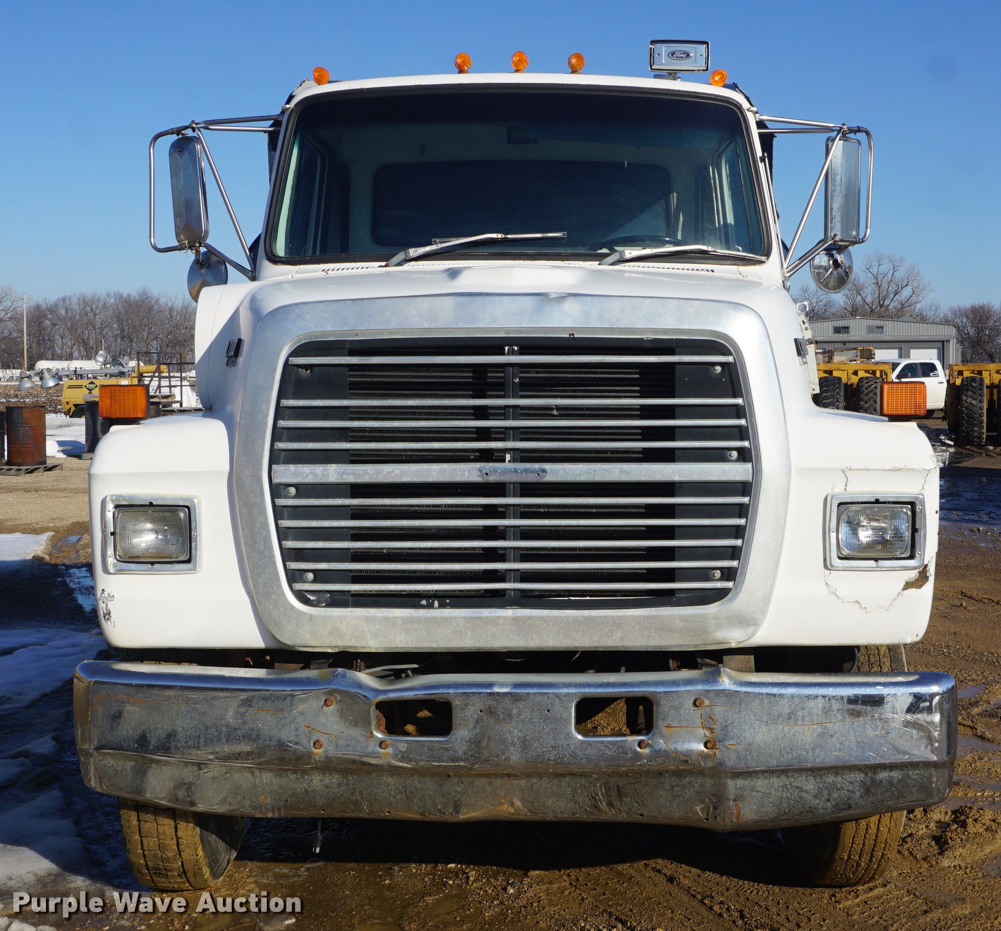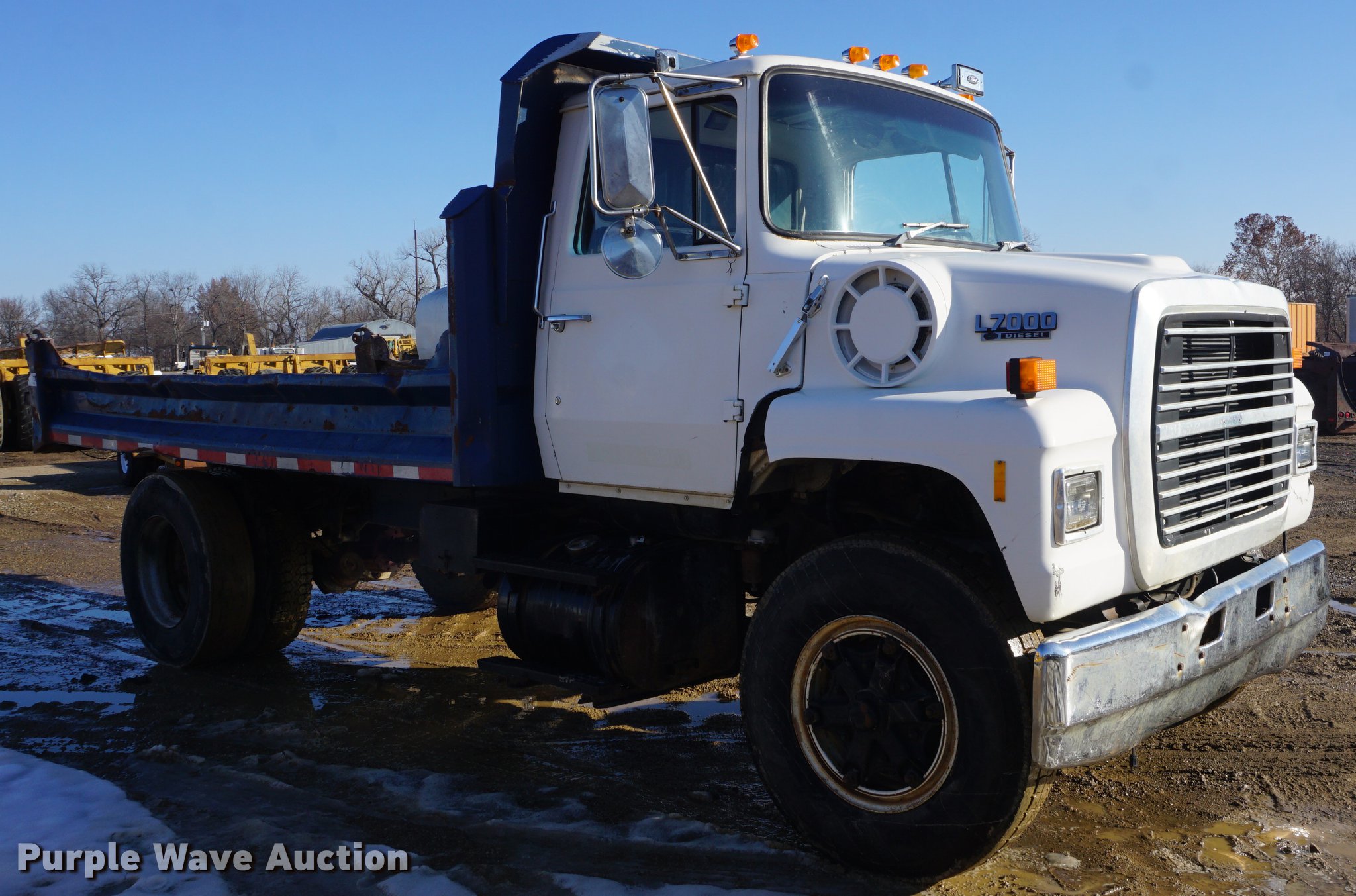 Purple Wave is selling a used Flat Bed Truck in Kansas. This item is a 1990 Ford L7000 dump flatbed truck with the following: 264,146 miles on odometer, 6.6L six cylinder diesel engine, 185 HP, Five speed manual transmission, Single axle, Heat, PTO, Crysteel steel flatbed, 14'L x 94"W, 12" side height, Single ram hoist, Single fuel tank, Pintle hitch, Spring suspension, Air brakes, 11R22.5 tires