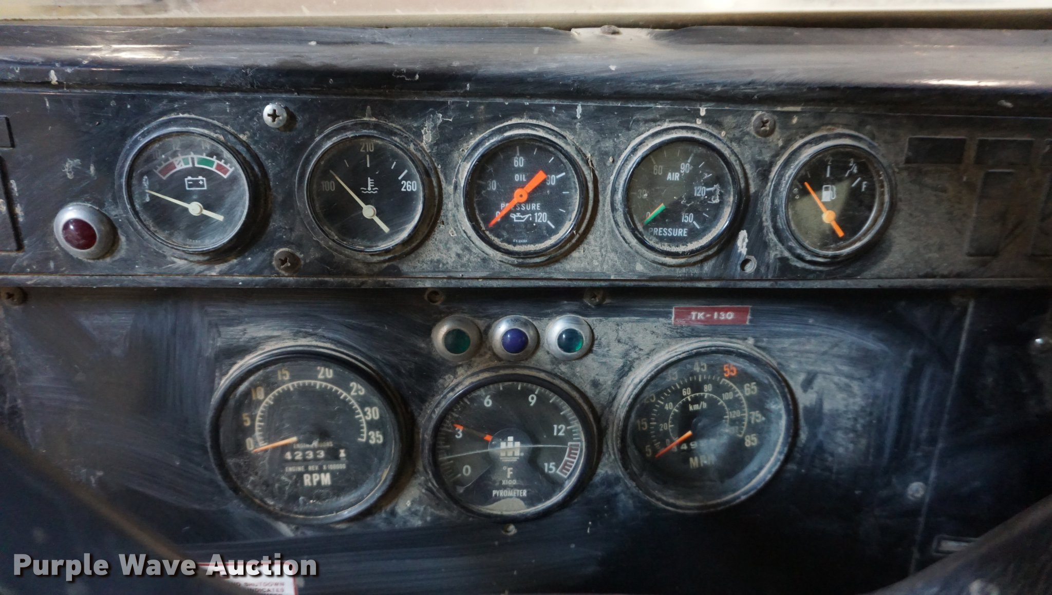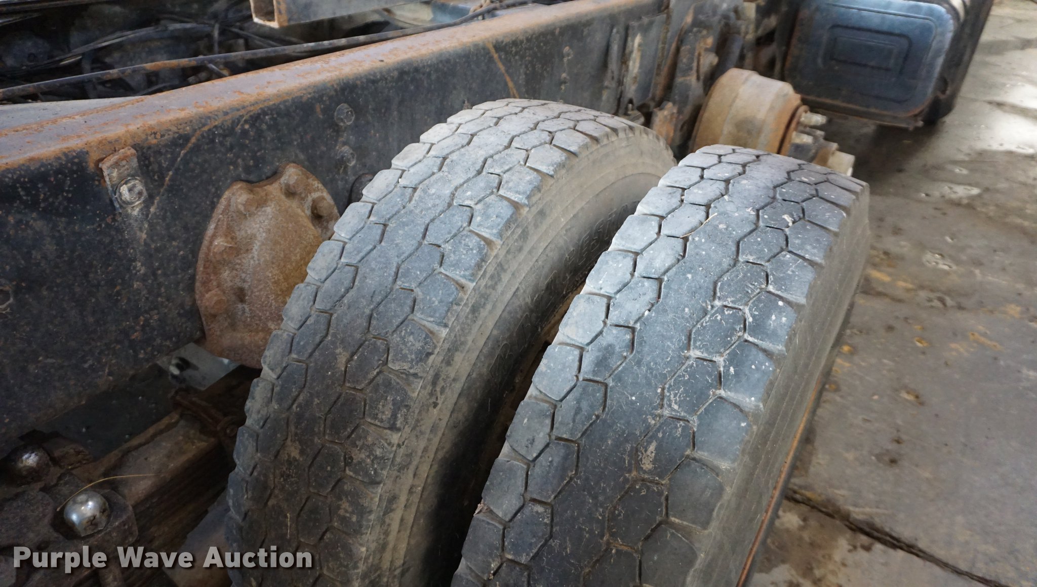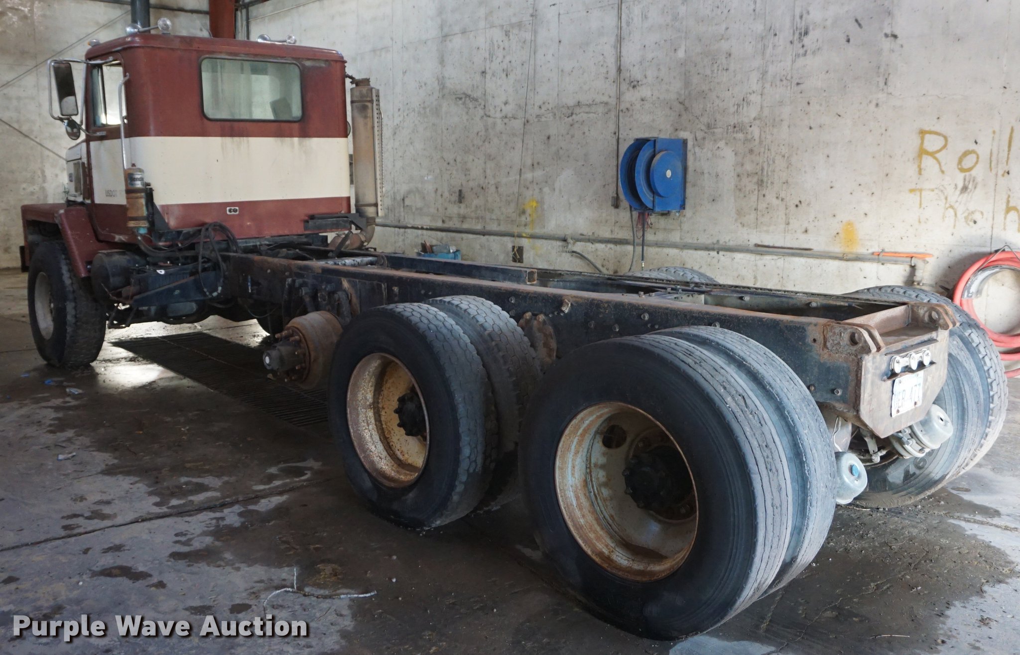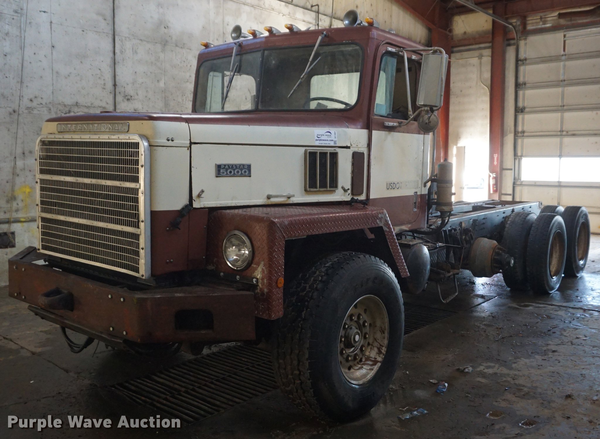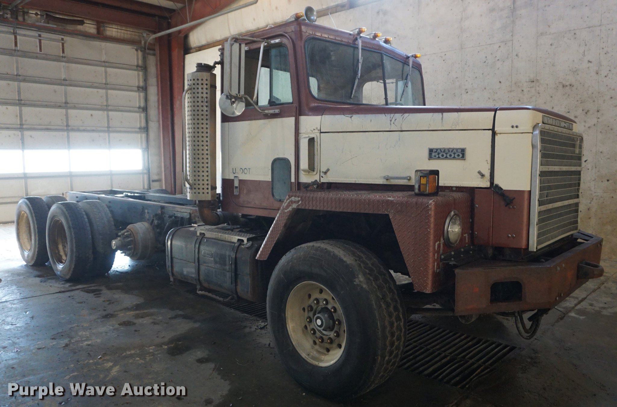 Purple Wave is selling a used Truck Chassis in Kansas. This item is a 1985 International Paystar 5000 truck cab and chassis with the following: 449,252 miles on odometer, 4,233 hours on meter, Cummins 855 six cylinder turbo diesel engine, Automatic transmission, Triple axle, Inter-axle differential lock, Heat, 186" from rear of cab to rear of frame, Single exhaust stack, Single fuel tank, Spring suspension, Air brakes, Air up/down pusher axle, 425/65R22.5 front tires, 11R24.5 rear tires, Non-operational transmission, No tires on third axle