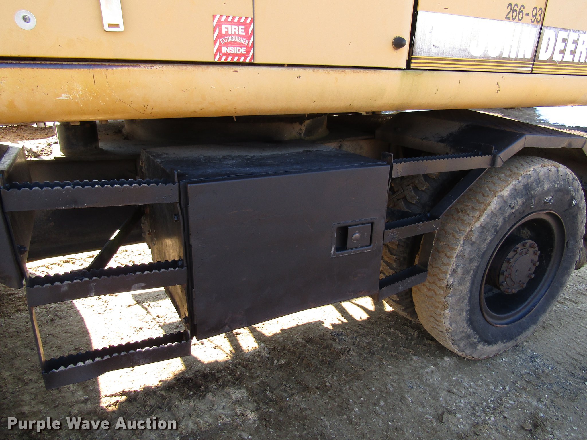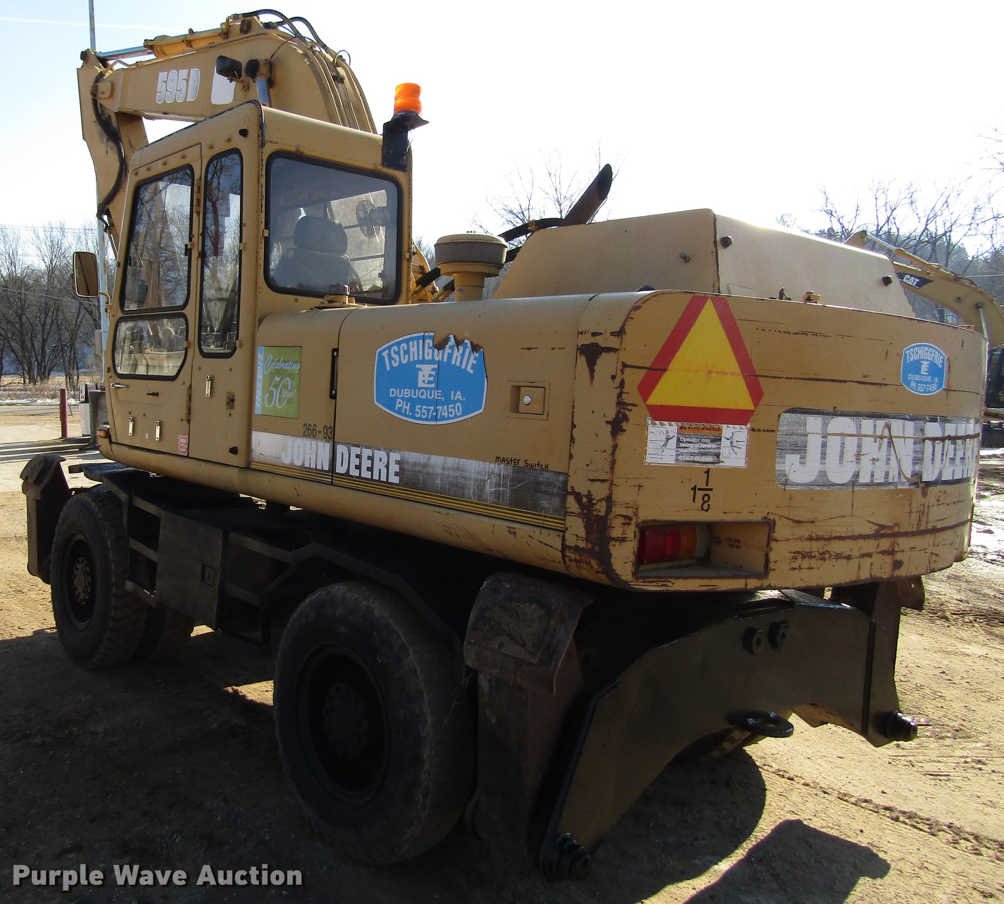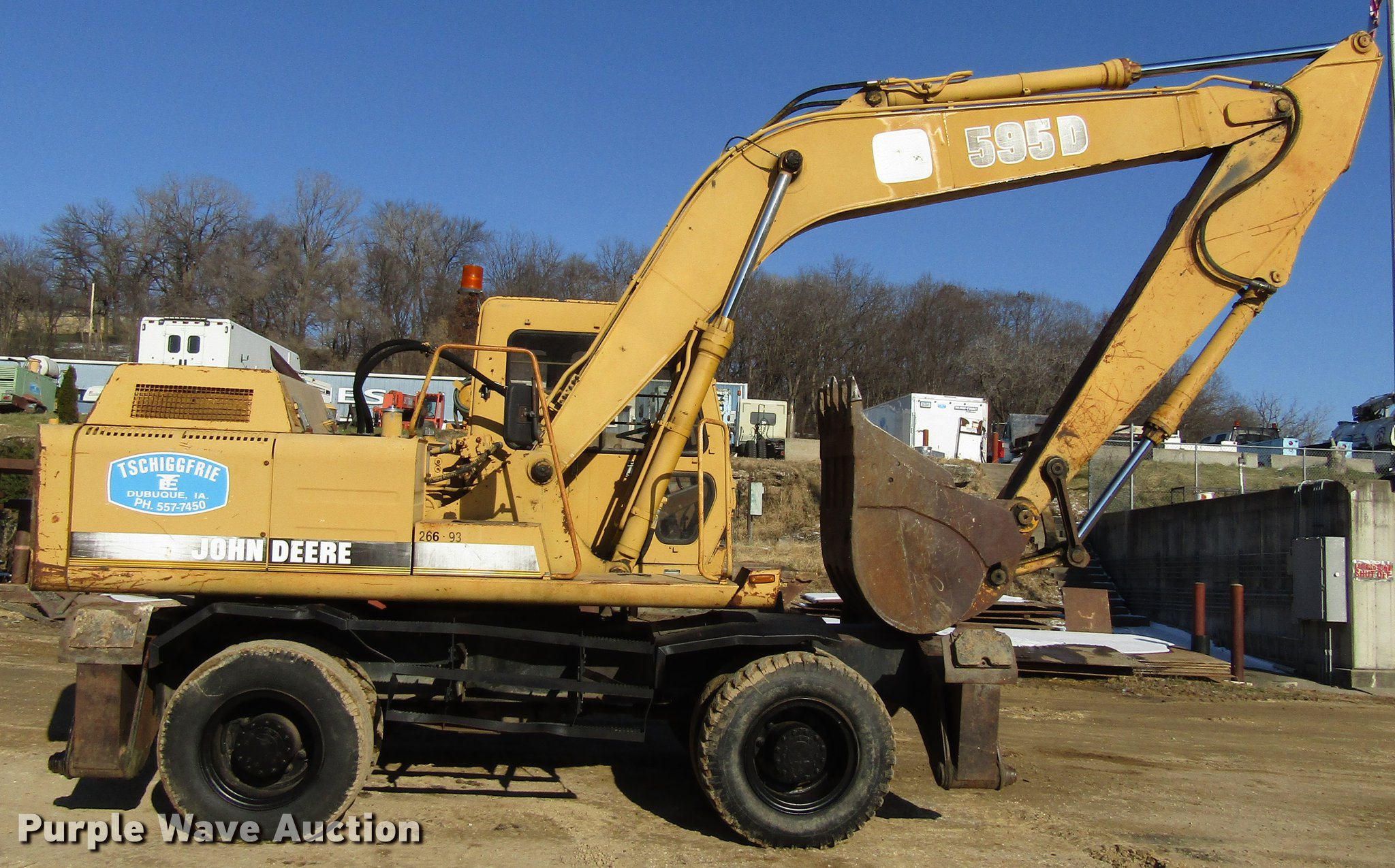 Purple Wave is selling a used Rubber Tired Excavator in Iowa. This item is a 1993 John Deere 595D rubber tire excavator with the following: 366 hours on meter, John Deere four diesel engine, EROPS, Suspension seat, Wipers, Front work lights, Standard boom, 35"W bucket, Bolt-on cutting edge, (5) teeth, 10-20 tires, Service Records available upon request, Serial FF595DS0013616