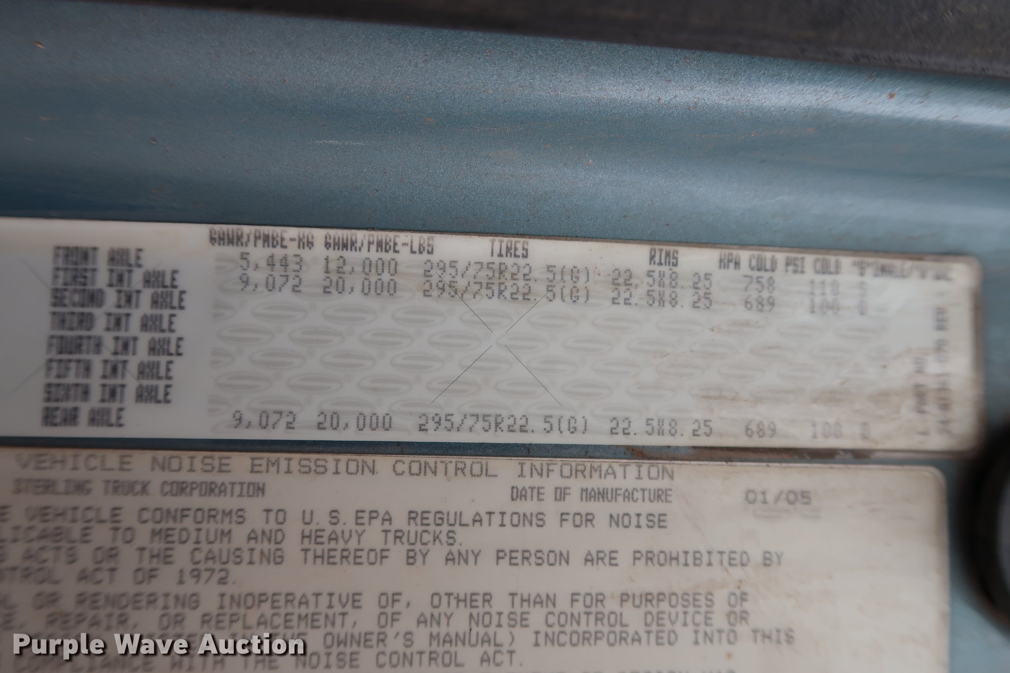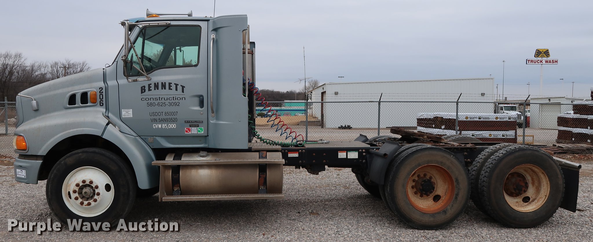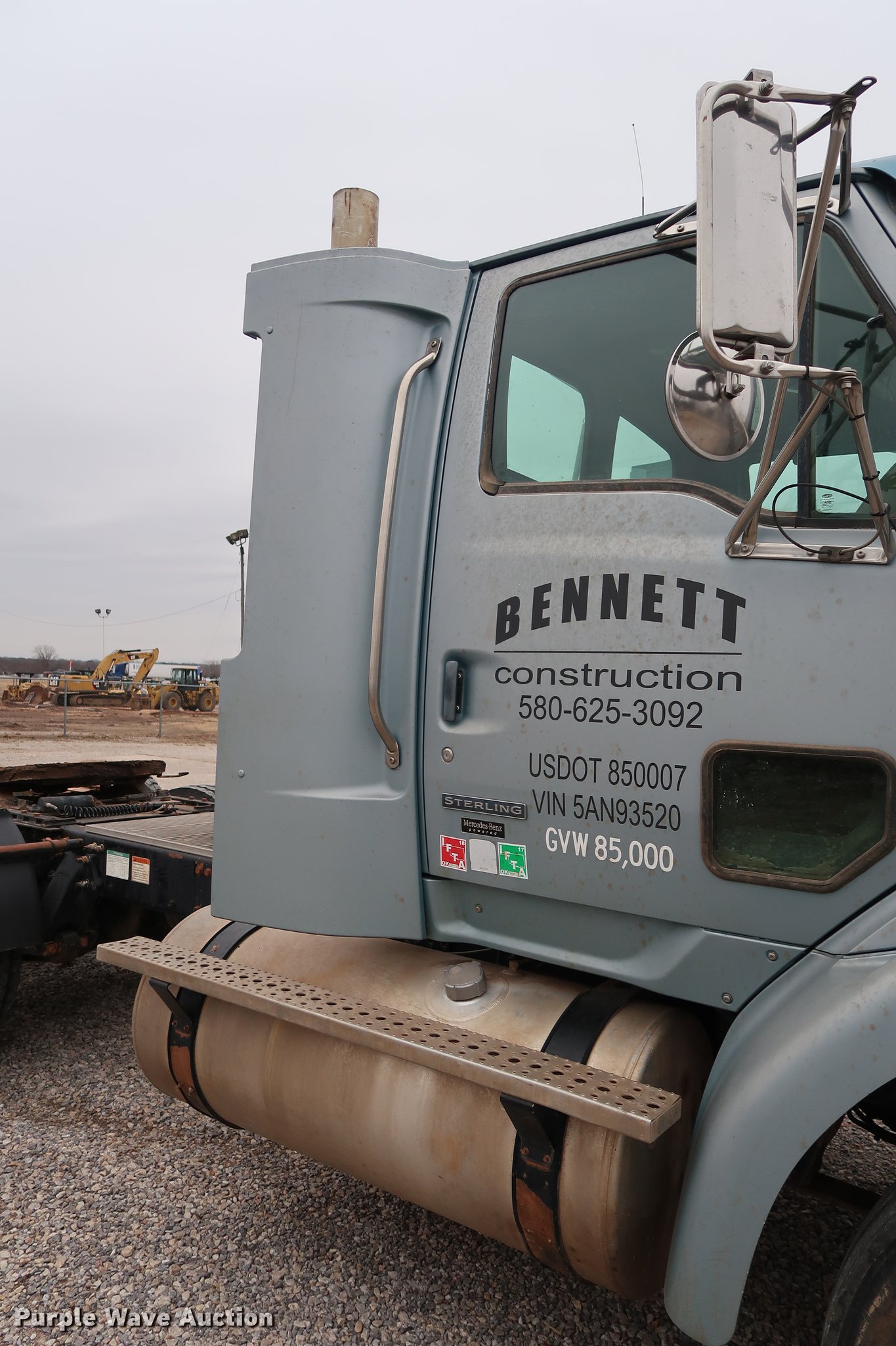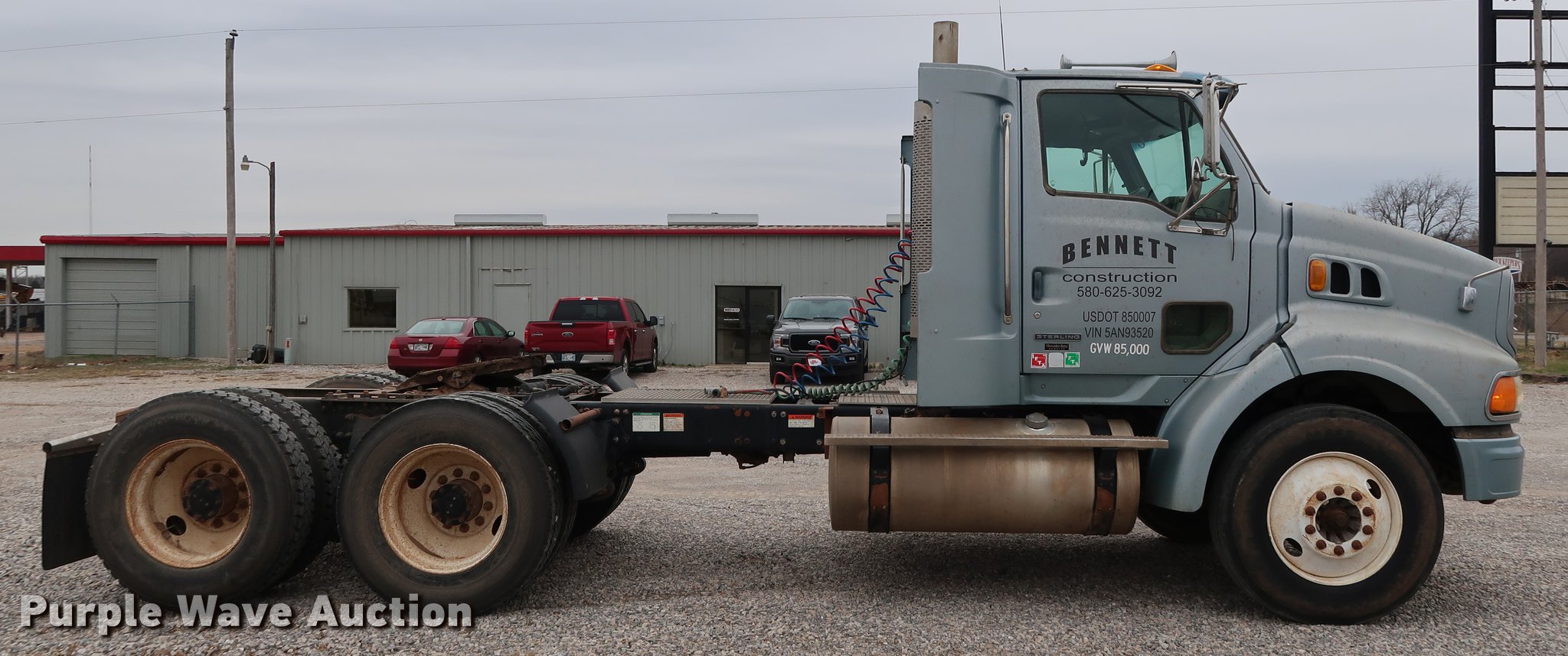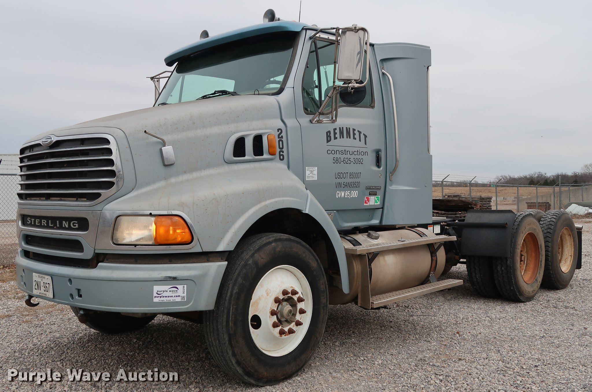 Purple Wave is selling a used Truck Tractor in Oklahoma. This item is a 2005 Sterling A-Line semi truck with the following: 523,475 miles on odometer, Mercedes Benz MBE4000 12.0L L6 turbo diesel engine, 450 HP, Serial 0460799852, Eaton Fuller Road Ranger 10 speed manual transmission, Tandem axle, Inter-axle differential lock, AC and heat, Cruise, AM/FM/CD, Heated mirrors, Air suspension seat, Air ride cab, Block heater, Front tow hooks, Exterior visor, Single rear exhaust stack, Aluminum deck plate, Air operated sliding fifth wheel plate, Dual fuel tanks, Quarter fenders, Mud flaps, 202" wheelbase, Air suspension, Air brakes, Engine brake, 11R24.5 tires, GVWR 52,000 lbs, FAWR 12,000 lbs, IAWR 20,000 lbs, RAWR 20,000 lbs, Check engine light illuminated