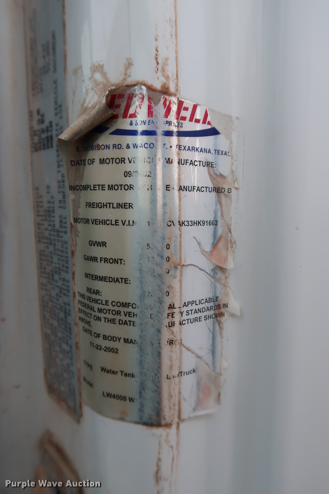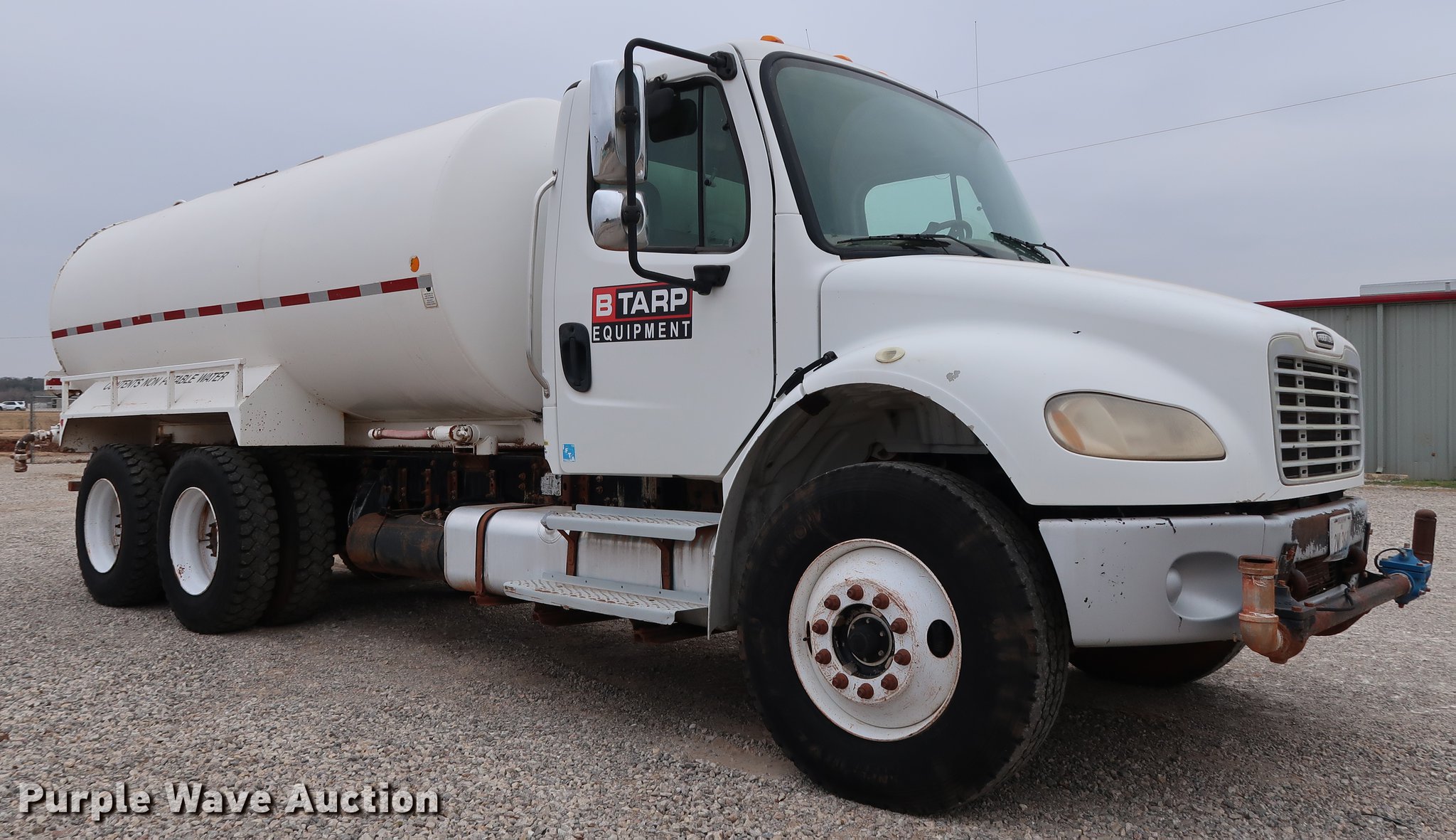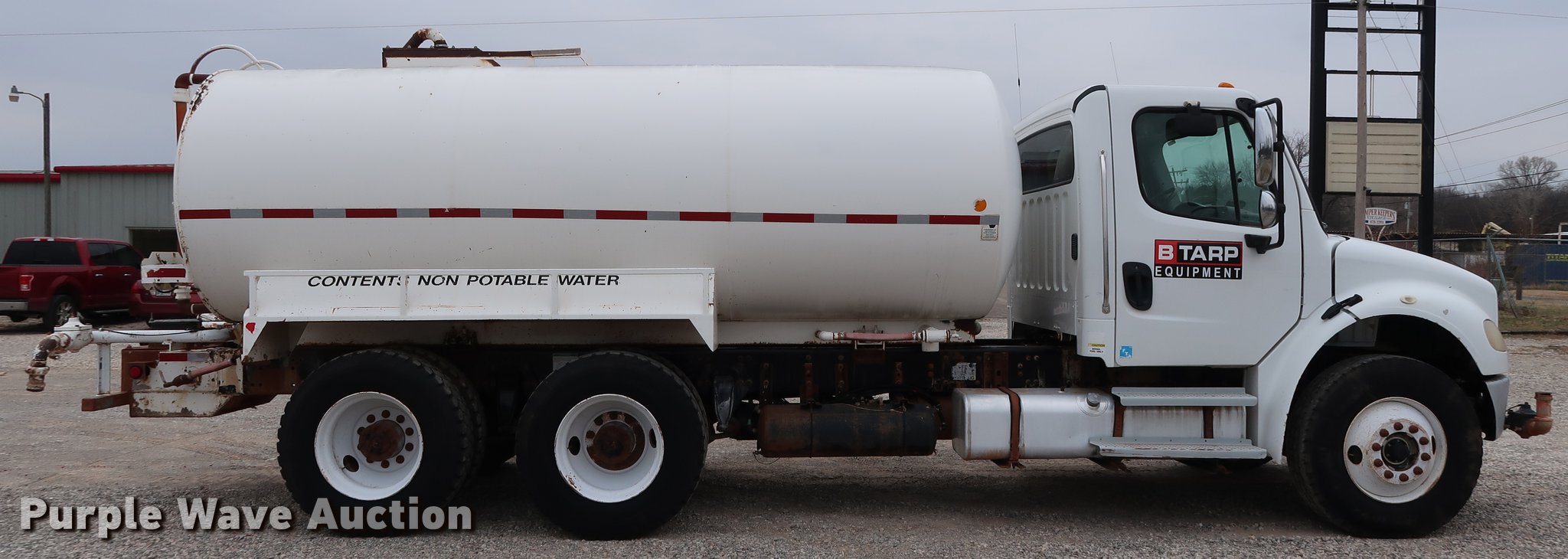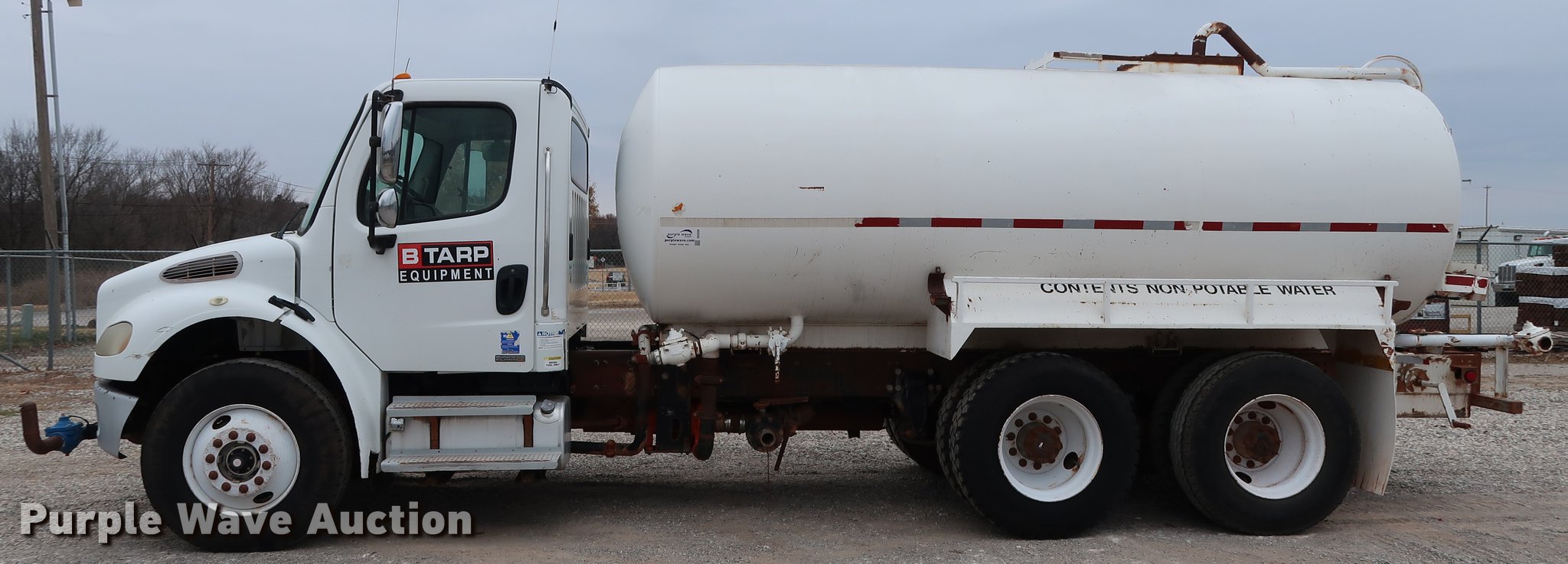 Purple Wave is selling a used Tank Truck or Water Truck in Oklahoma. This item is a 2003 Freightliner Business Class M2 water truck with the following: 56,371 miles on odometer, Caterpillar 3126 7.2L L6 turbo diesel engine, 330 HP, Serial HEP04.35, Eaton fuller RT-8709B nine speed manual transmission, Tandem axle, Differential lock, AC and heat, Cruise, Power windows, Heated mirrors, Air suspension seat, Block heater, PTO, Front tow hooks, 2003 Ledwell LW4000WT tank bed, 16'L, 4,000 gallon capacity, Front and rear spray bars, Side and rear discharge, 2.5" plumbing, Top fill, Sight tube, Ladder, Serial 110208716-2, Dual fuel tanks, Air suspension, Air brakes, 196" wheelbase, 11R22.5 tires, GVWR 53,880 lbs