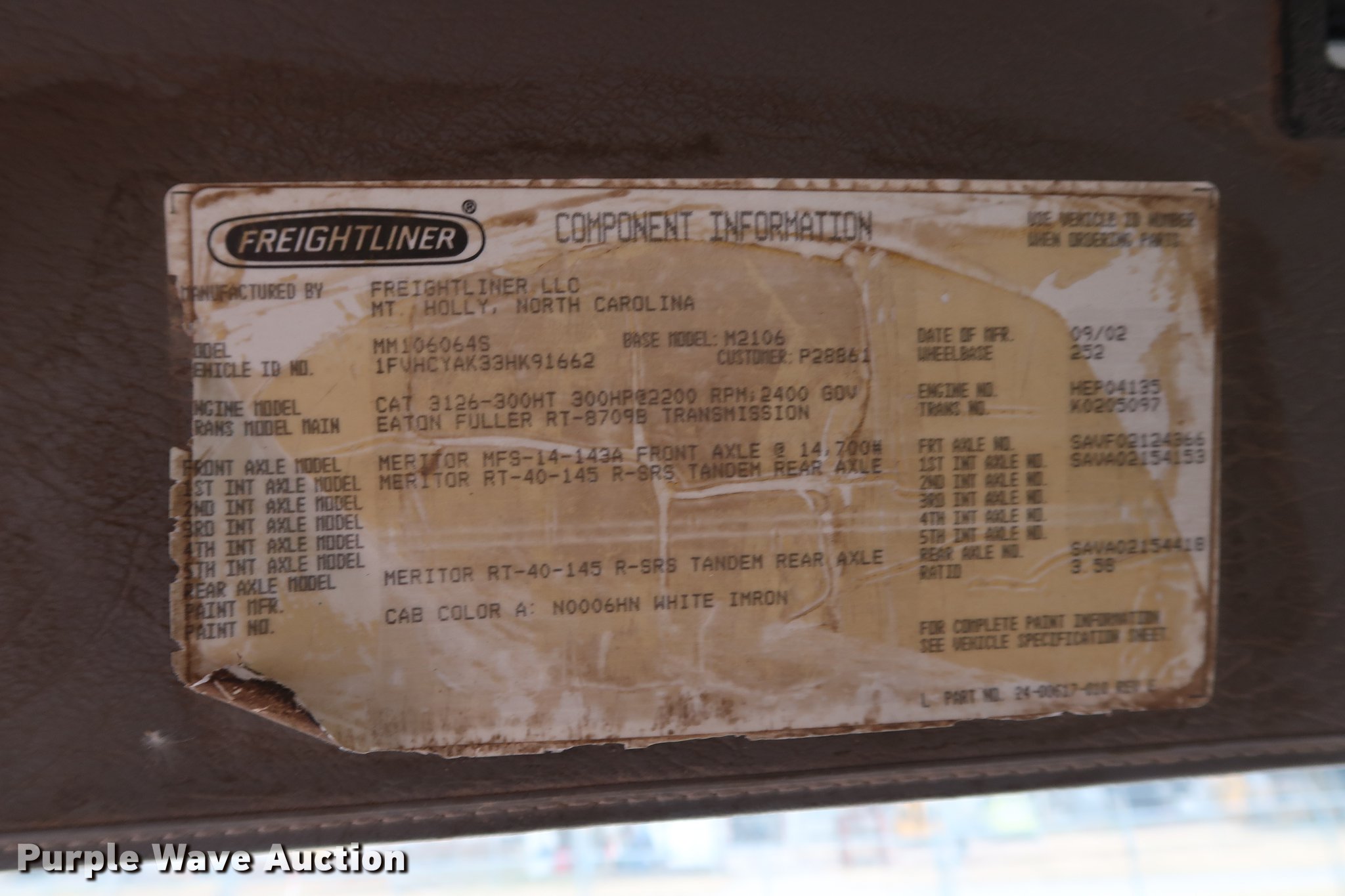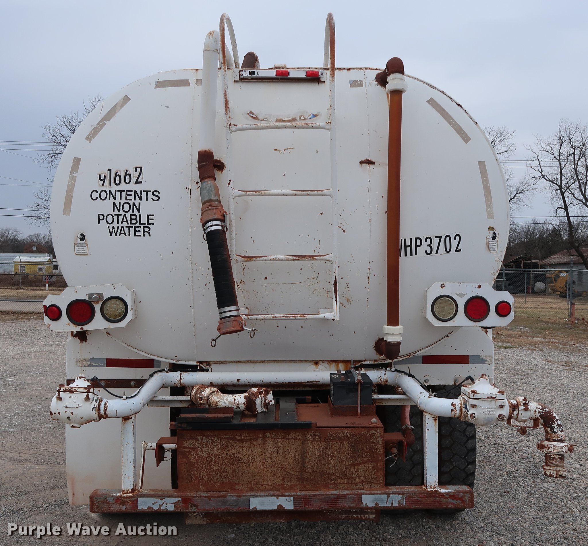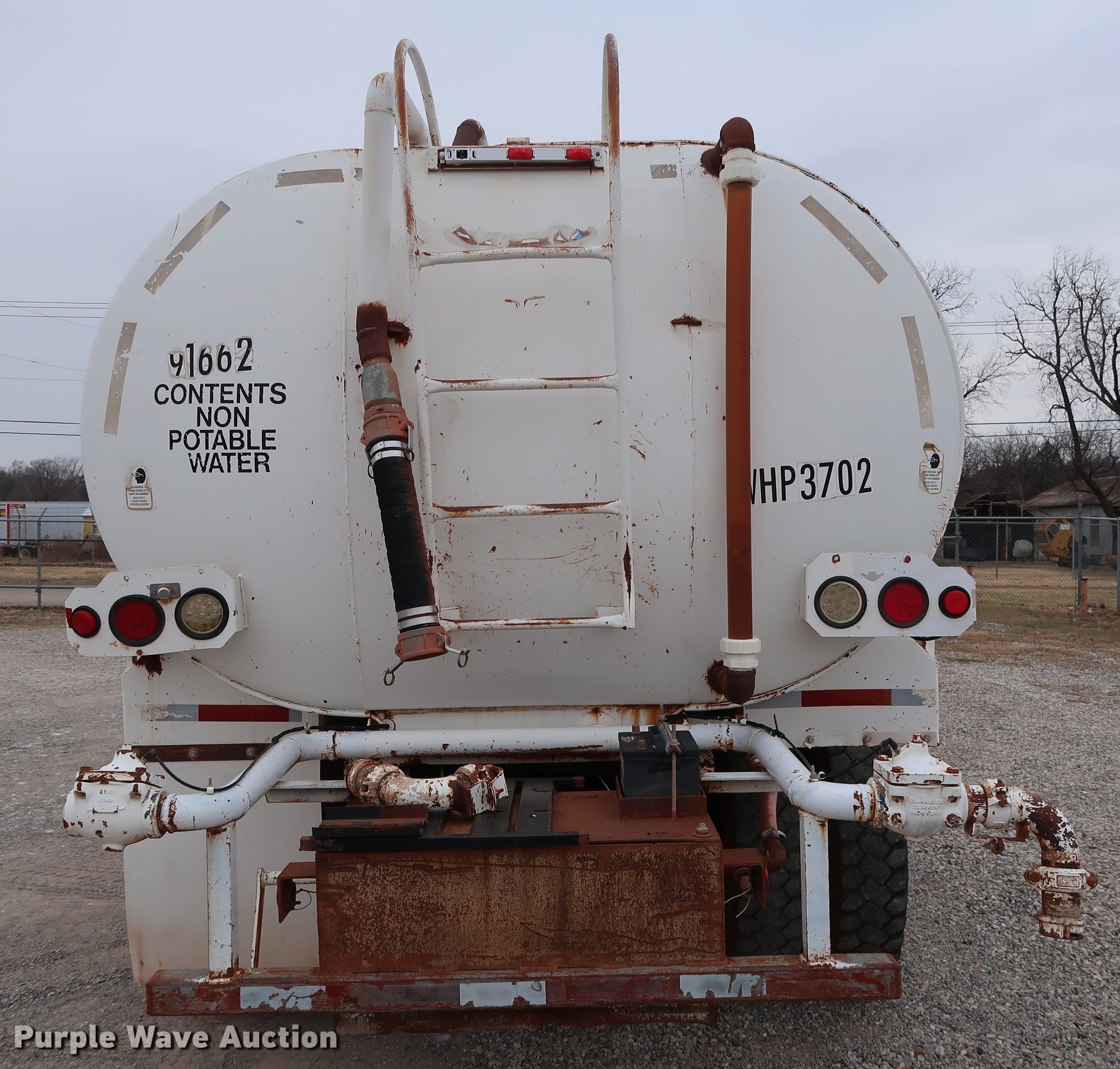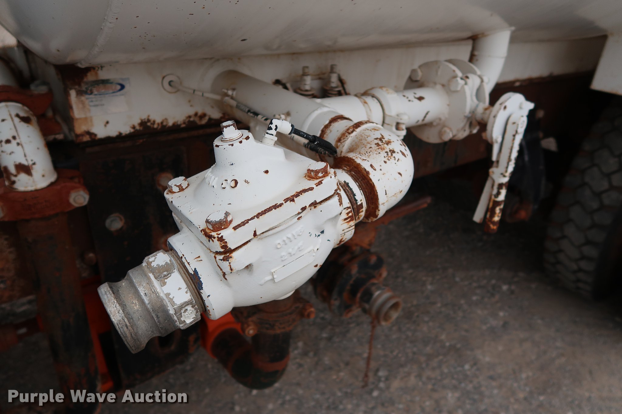 Purple Wave is selling a used Tank Truck or Water Truck in Oklahoma. This item is a 2003 Freightliner Business Class M2 water truck with the following: 56,371 miles on odometer, Caterpillar 3126 7.2L L6 turbo diesel engine, 330 HP, Serial HEP04.35, Eaton fuller RT-8709B nine speed manual transmission, Tandem axle, Differential lock, AC and heat, Cruise, Power windows, Heated mirrors, Air suspension seat, Block heater, PTO, Front tow hooks, 2003 Ledwell LW4000WT tank bed, 16'L, 4,000 gallon capacity, Front and rear spray bars, Side and rear discharge, 2.5" plumbing, Top fill, Sight tube, Ladder, Serial 110208716-2, Dual fuel tanks, Air suspension, Air brakes, 196" wheelbase, 11R22.5 tires, GVWR 53,880 lbs