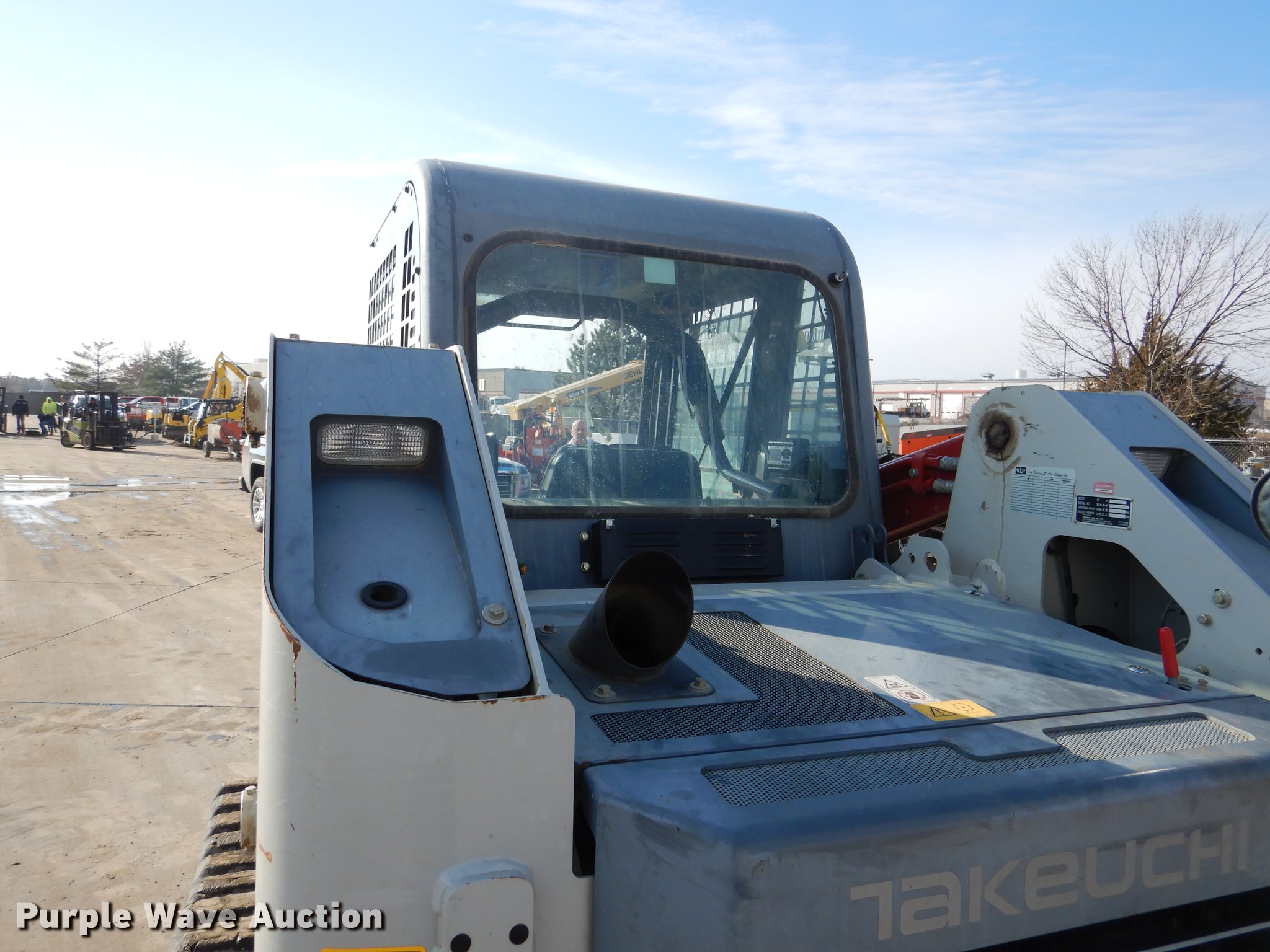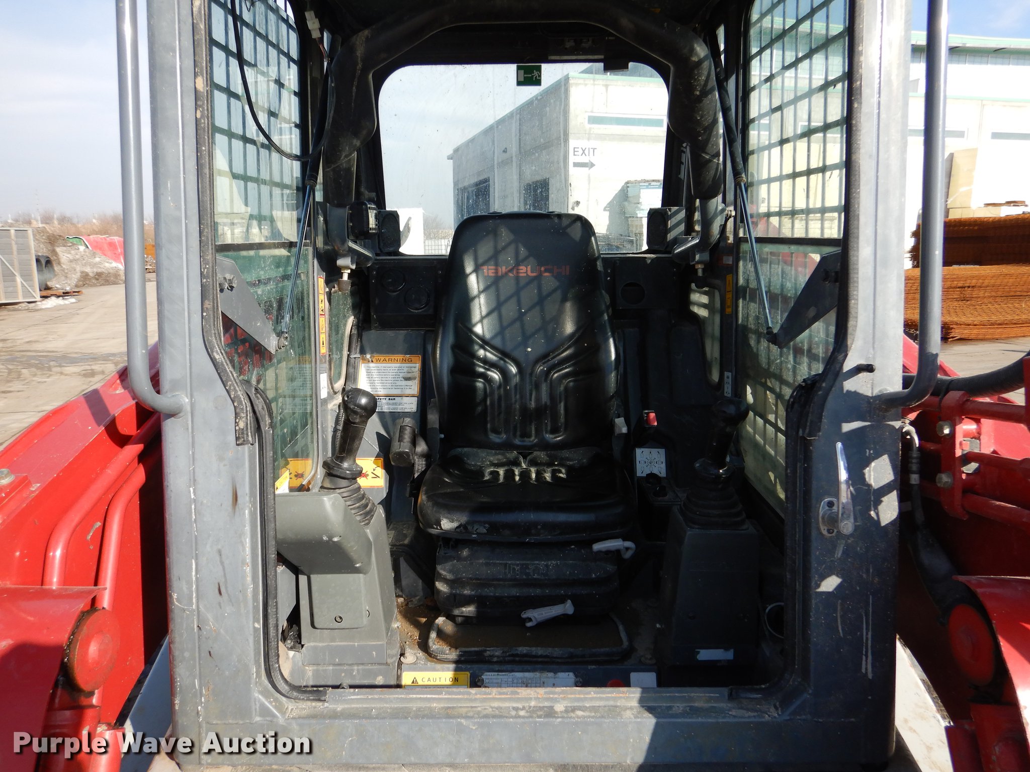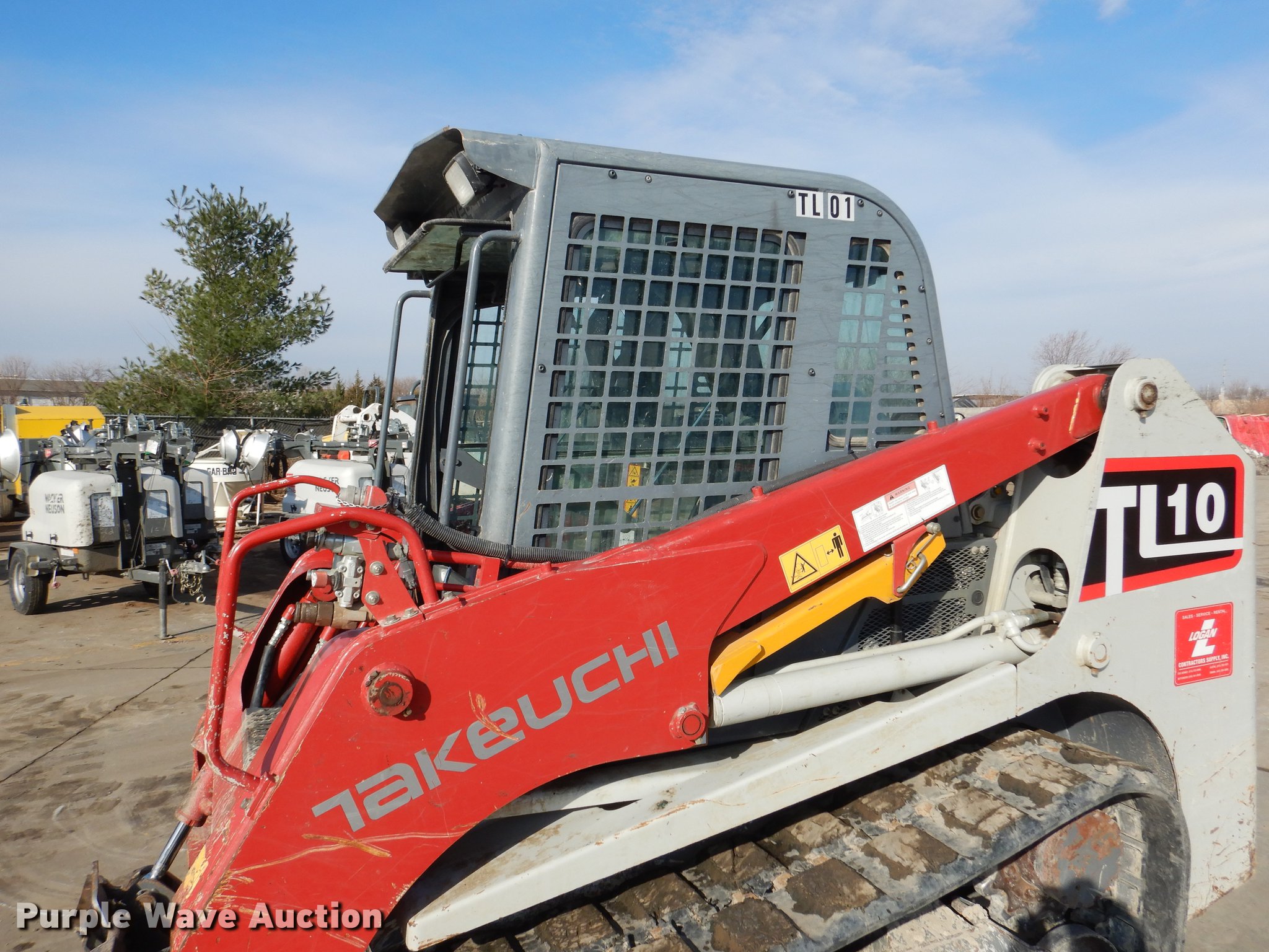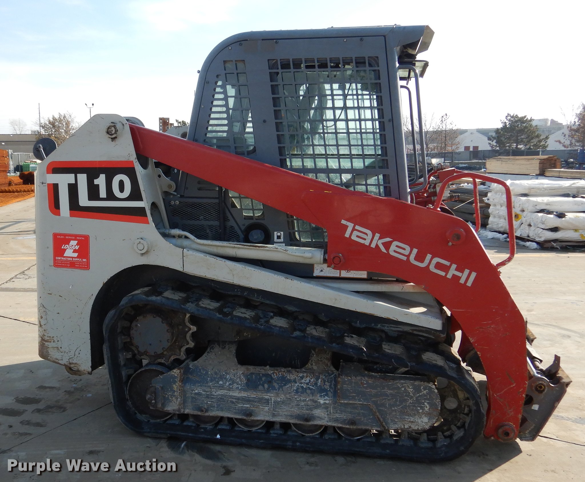 Purple Wave is selling a used Skid Steer Loader in Kansas. This item is a 2015 Takeuchi TL10 skid steer with the following: 2,894 hours on meter, Kubota V3800-T four cylinder turbo diesel engine, 92 HP, Serial 2EW1841, Two speed hydrostatic transmission, Enclosed cab, AC and heat, AM/FM, Joystick controls, EMS panel, Spring suspension seat, Wipers, Front and rear work lights, Backup alarm, Hydraulic quick coupler, Auxiliary hydraulics, Auxiliary electrical outlet, 18 tracks, Serial 201001726