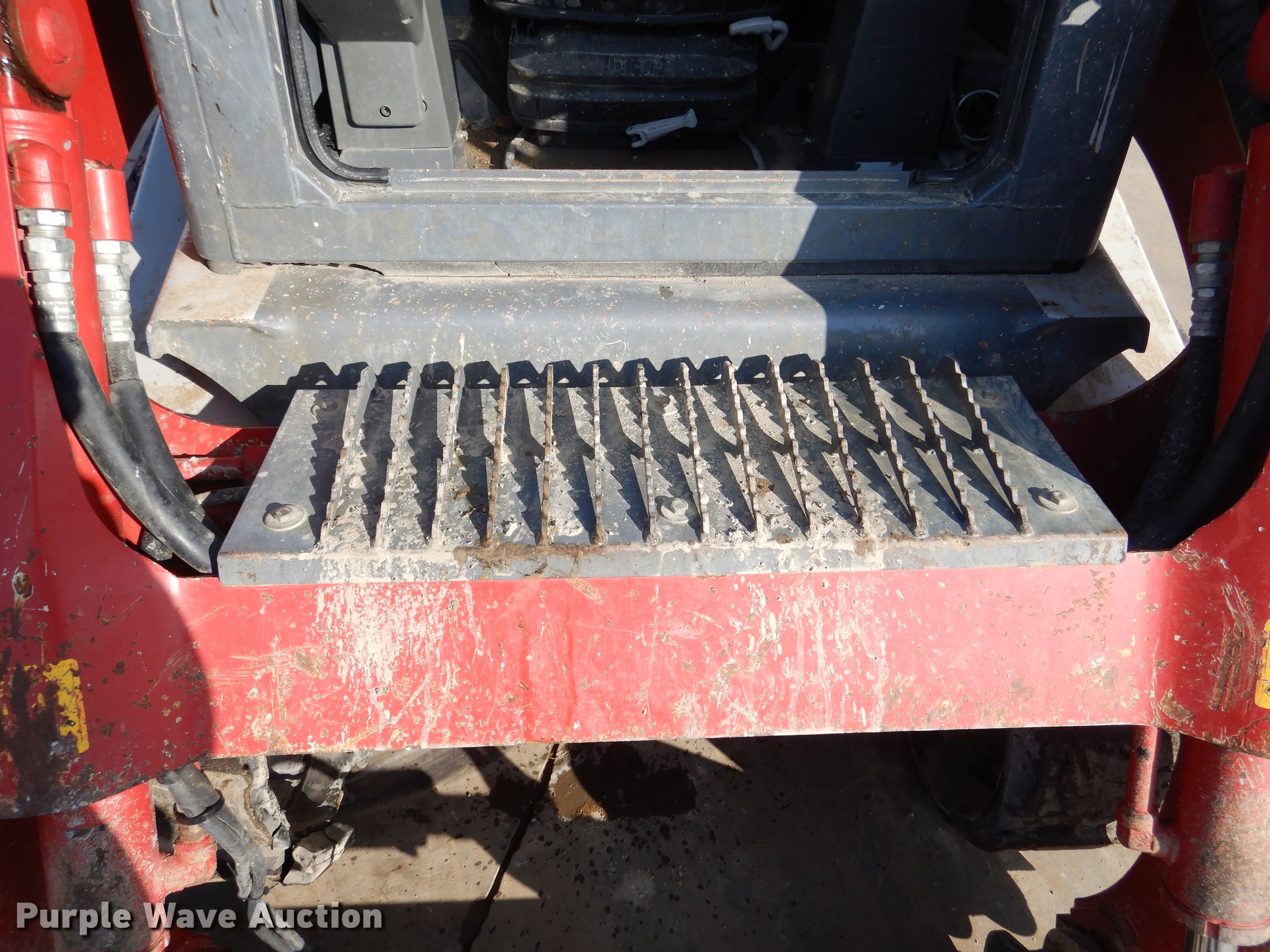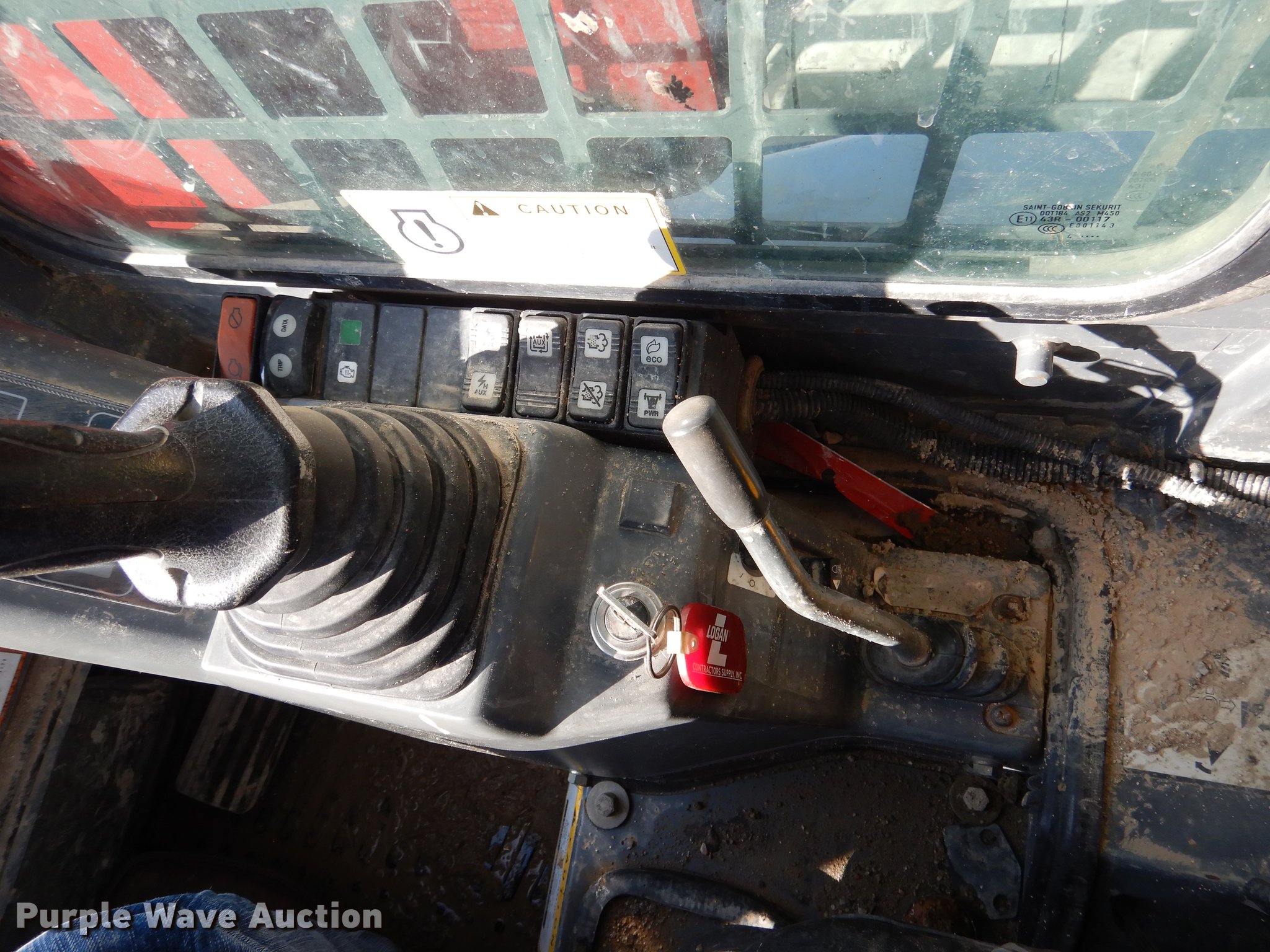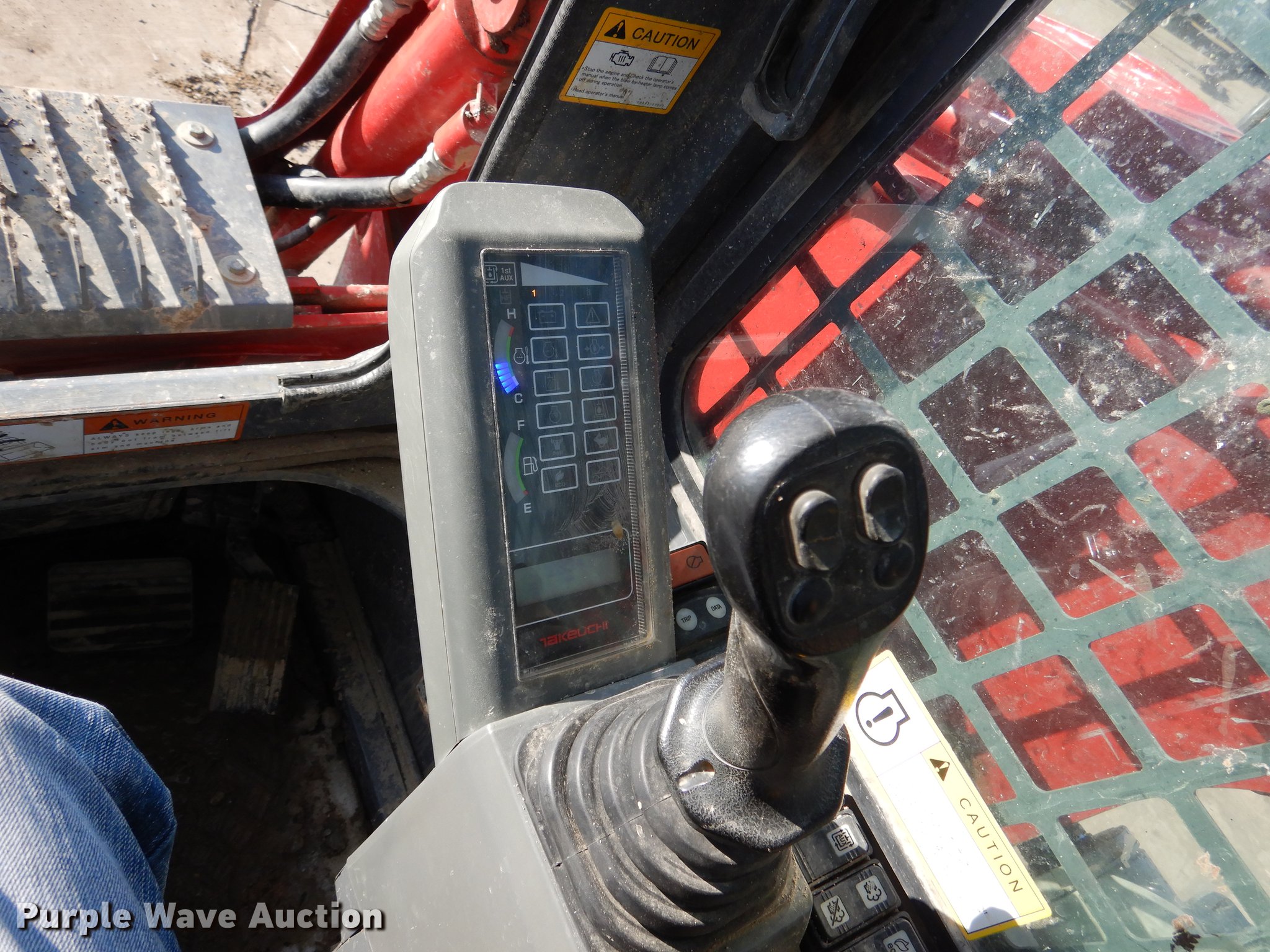 Purple Wave is selling a used Skid Steer Loader in Kansas. This item is a 2015 Takeuchi TL10 skid steer with the following: 2,894 hours on meter, Kubota V3800-T four cylinder turbo diesel engine, 92 HP, Serial 2EW1841, Two speed hydrostatic transmission, Enclosed cab, AC and heat, AM/FM, Joystick controls, EMS panel, Spring suspension seat, Wipers, Front and rear work lights, Backup alarm, Hydraulic quick coupler, Auxiliary hydraulics, Auxiliary electrical outlet, 18 tracks, Serial 201001726