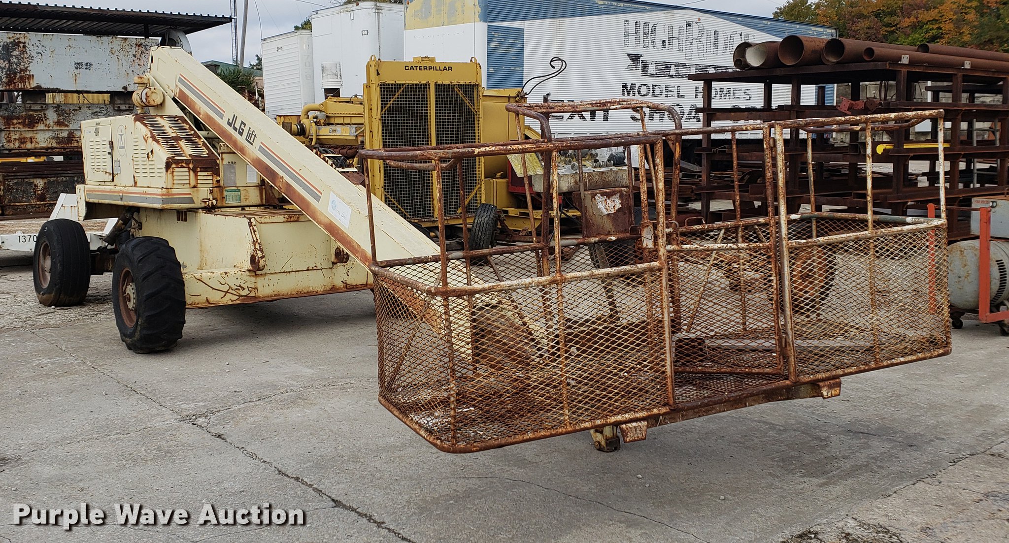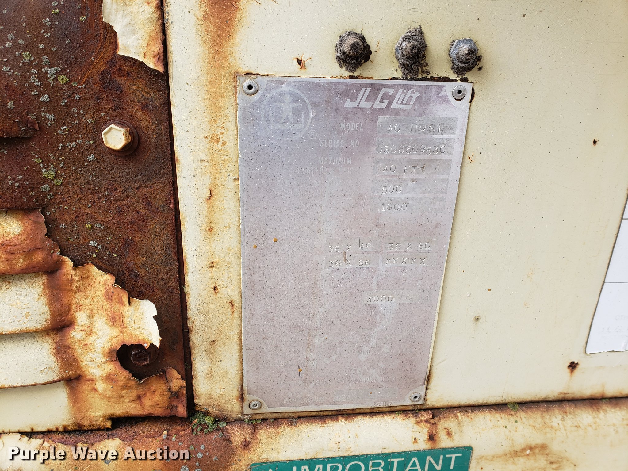 Purple Wave is selling a used Boom Lift in Missouri. This item is a JLG 40H boom lift with the following: Four cylinder propane engine, Hydrostatic transmission, 40' max lift height, 500 lbs max lift capacity, 36" x 8' platform, 42"H hand rails, 12.5-15 tires, Flat tires, Serial 0308509530
