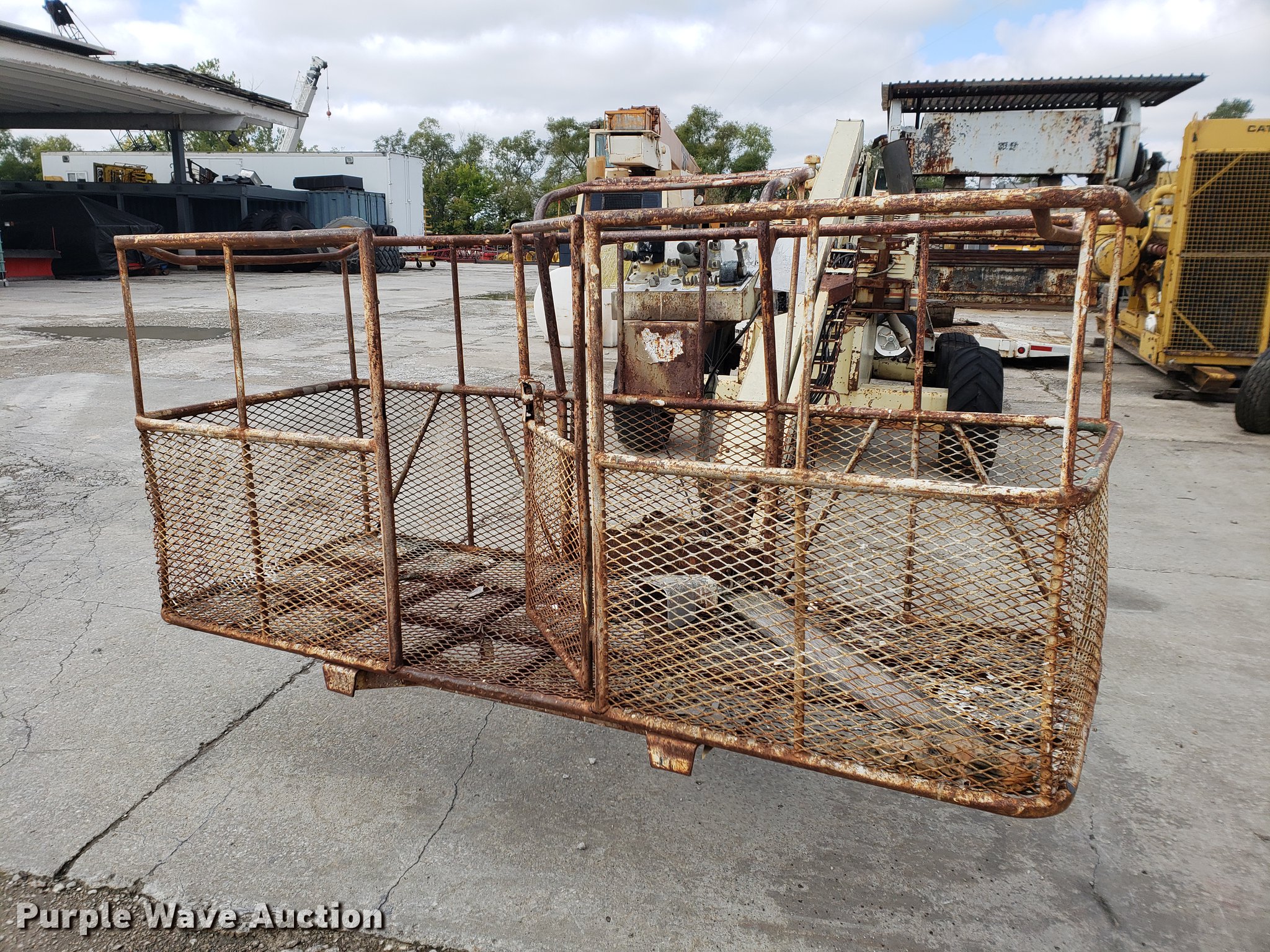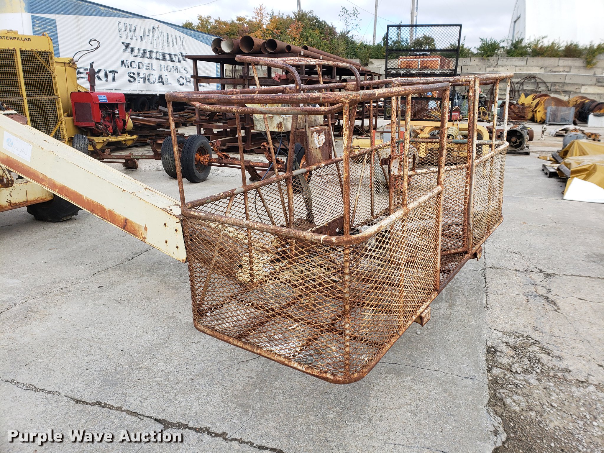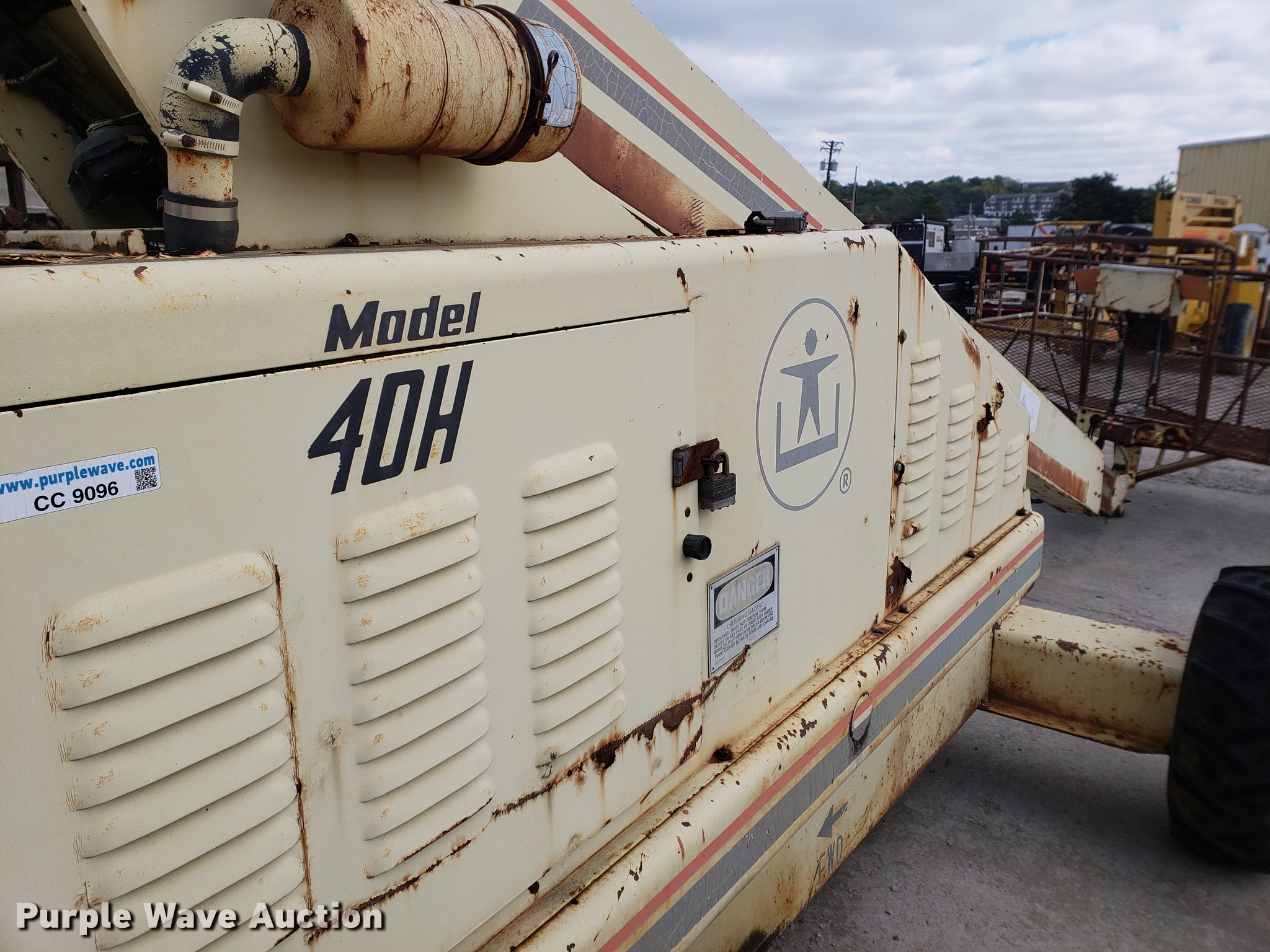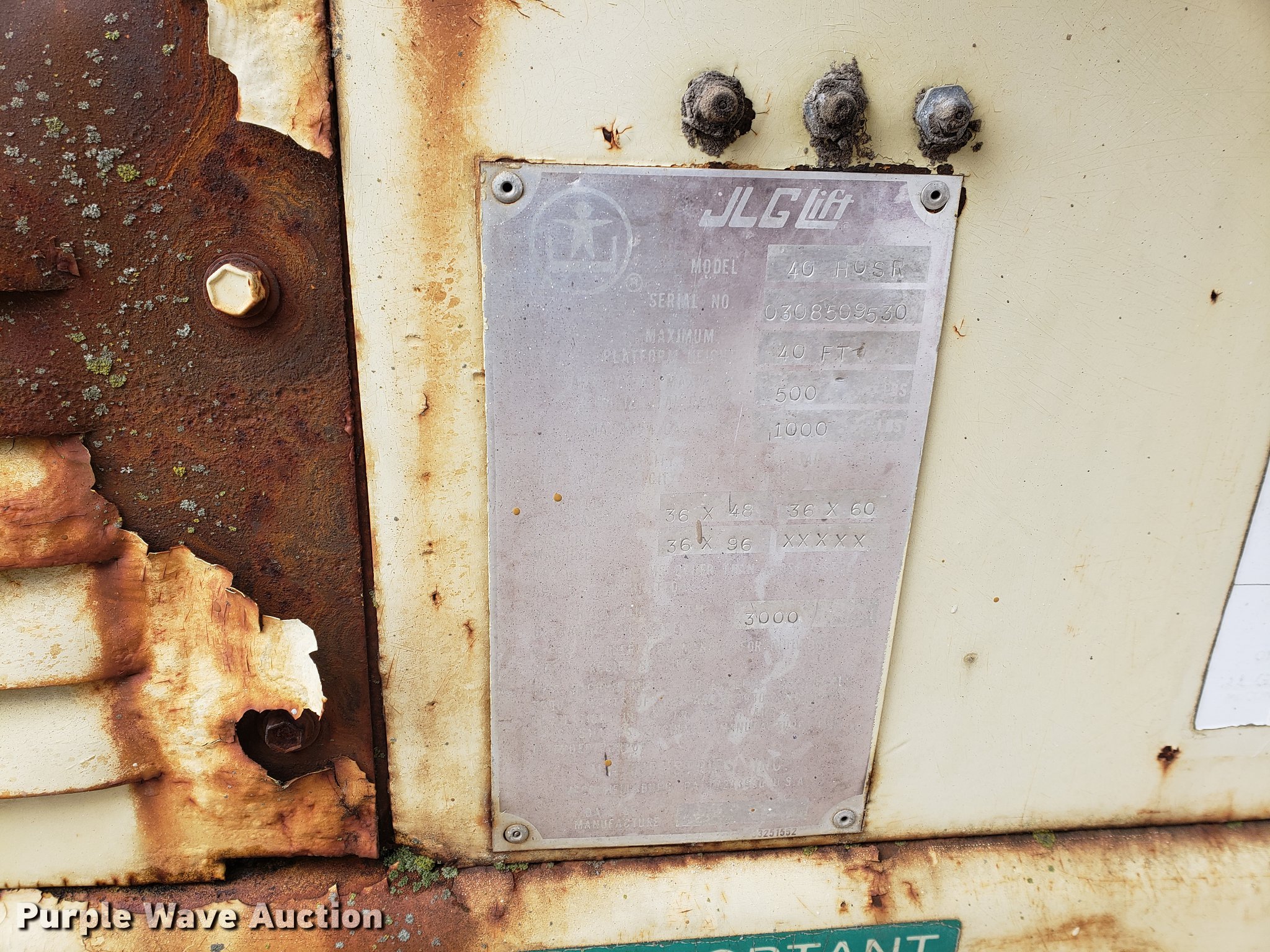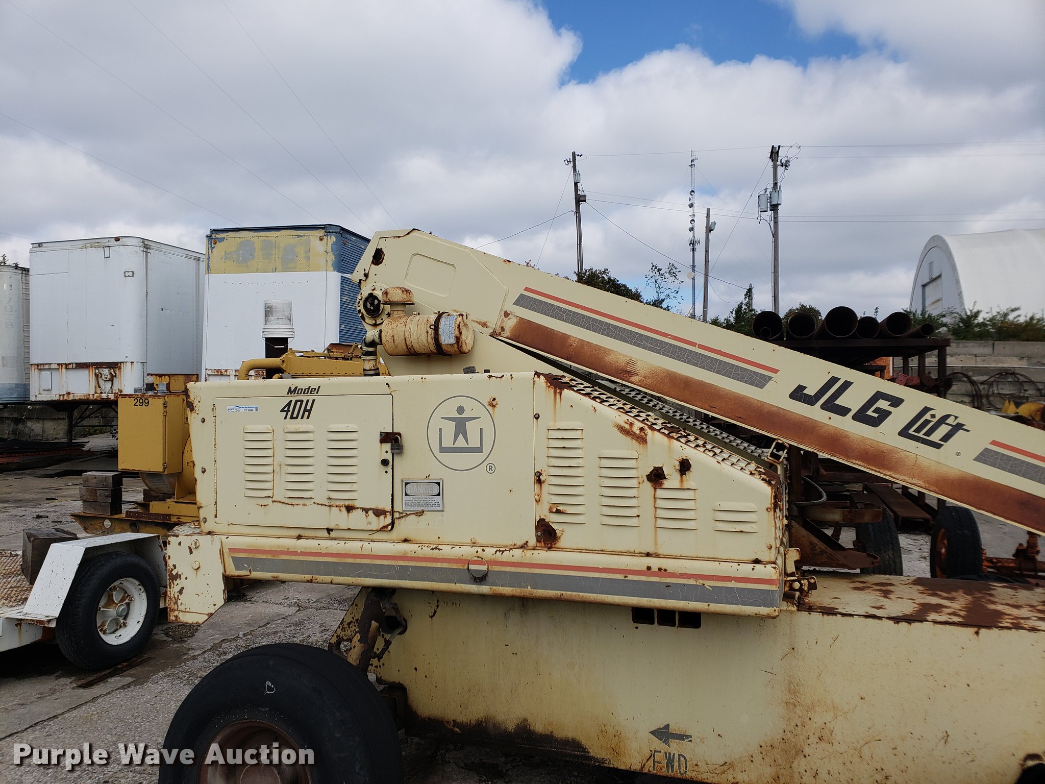 JLG 40H boom lift. Four cylinder propane engine, Hydrostatic transmission, 40' max lift height, 500 lbs max lift capacity, 36" x 8' platform 42"H hand rails, 12.5-15 tires, Flat tires, Serial 0308509530. Damon Pursell Construction Company. 300 N Church Rd. Liberty, MO 64068