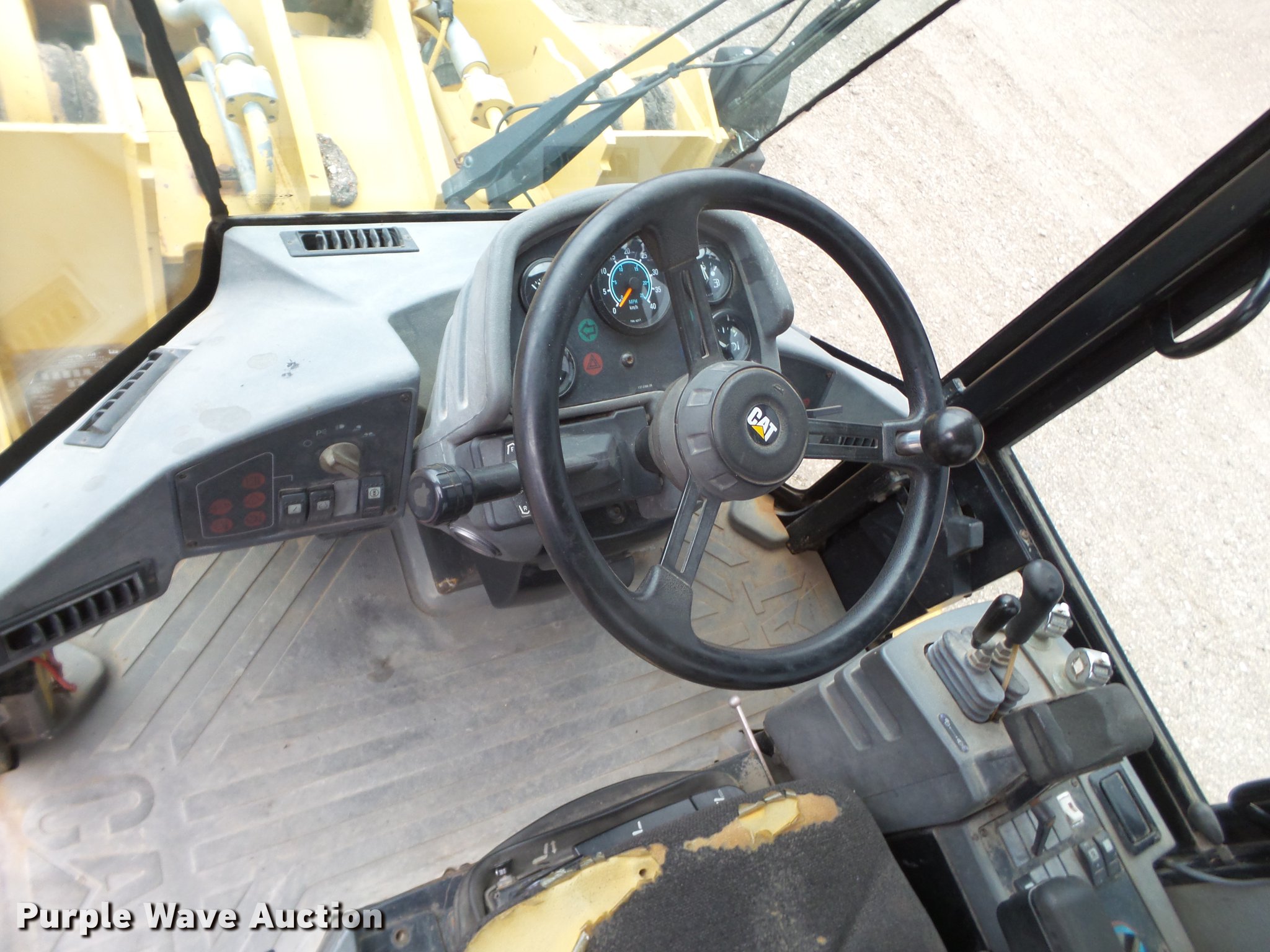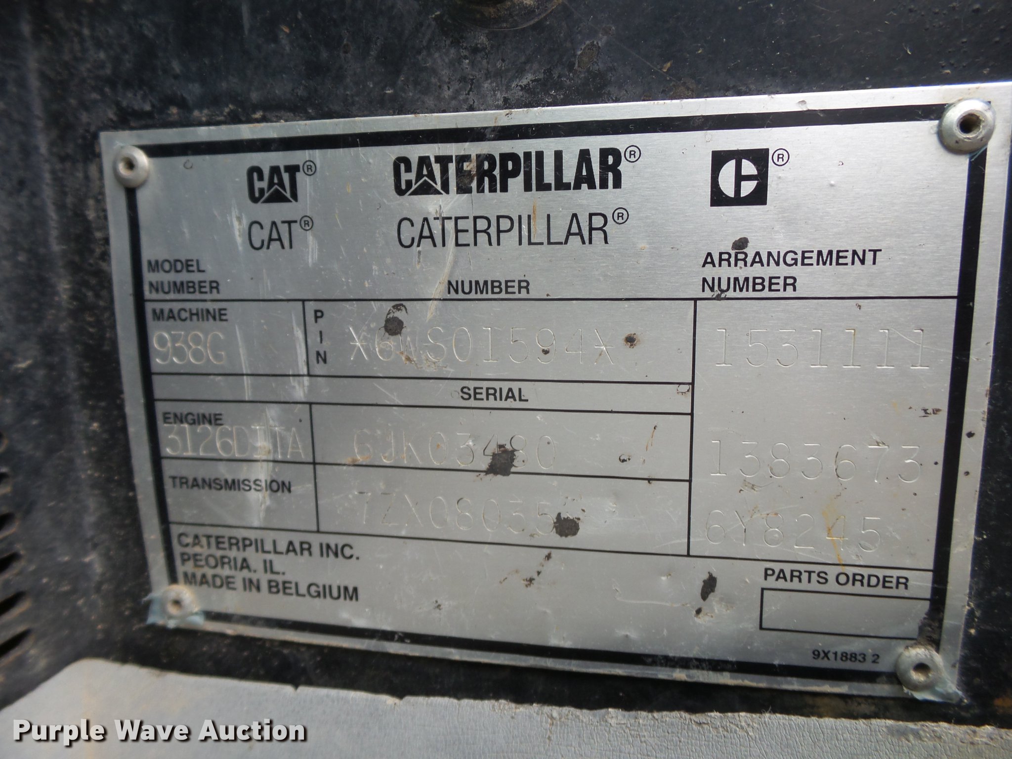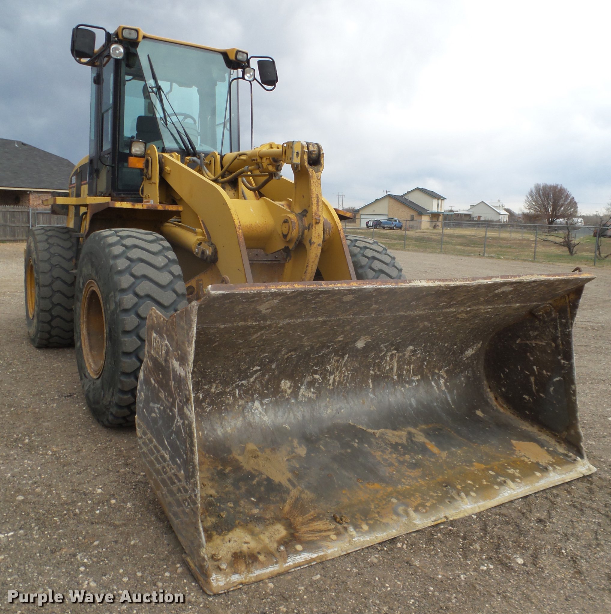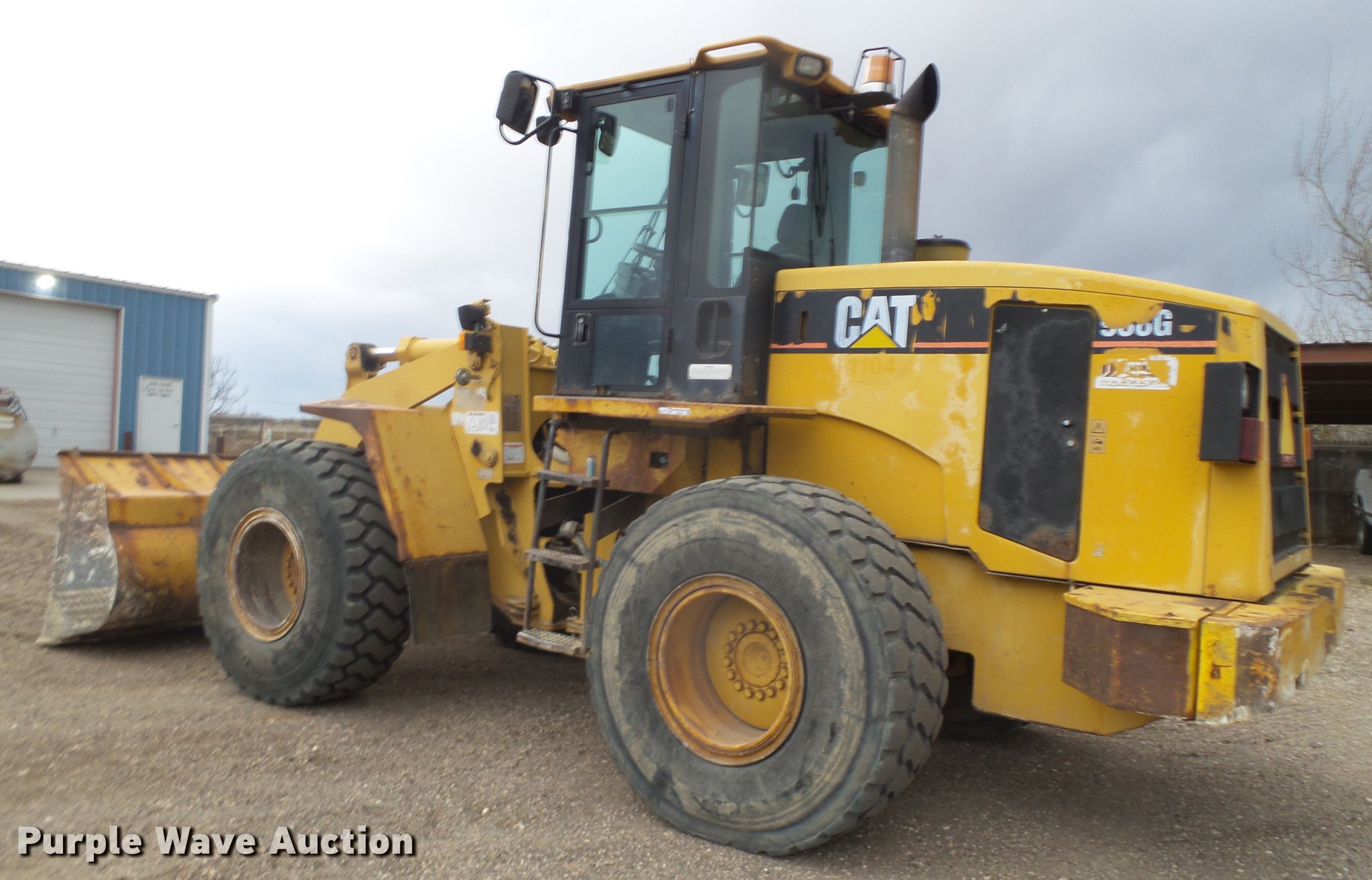 Purple Wave is selling a used Wheel Loader in Texas. This item is a 1999 Caterpillar 938G wheel loader with the following: 12,971 hours on meter, Caterpillar 3126DITA turbo diesel engine, Serial 6JK3480, Powershift transmission, 4F-3R gears, Enclosed cab, AC and heat, Air suspension seat, Two-lever bucket controls, Wipers, Caterpillar 107"W general purpose bucket, Bolt-on cutting edge, 20.5R25 tires, Serial 6WS01594