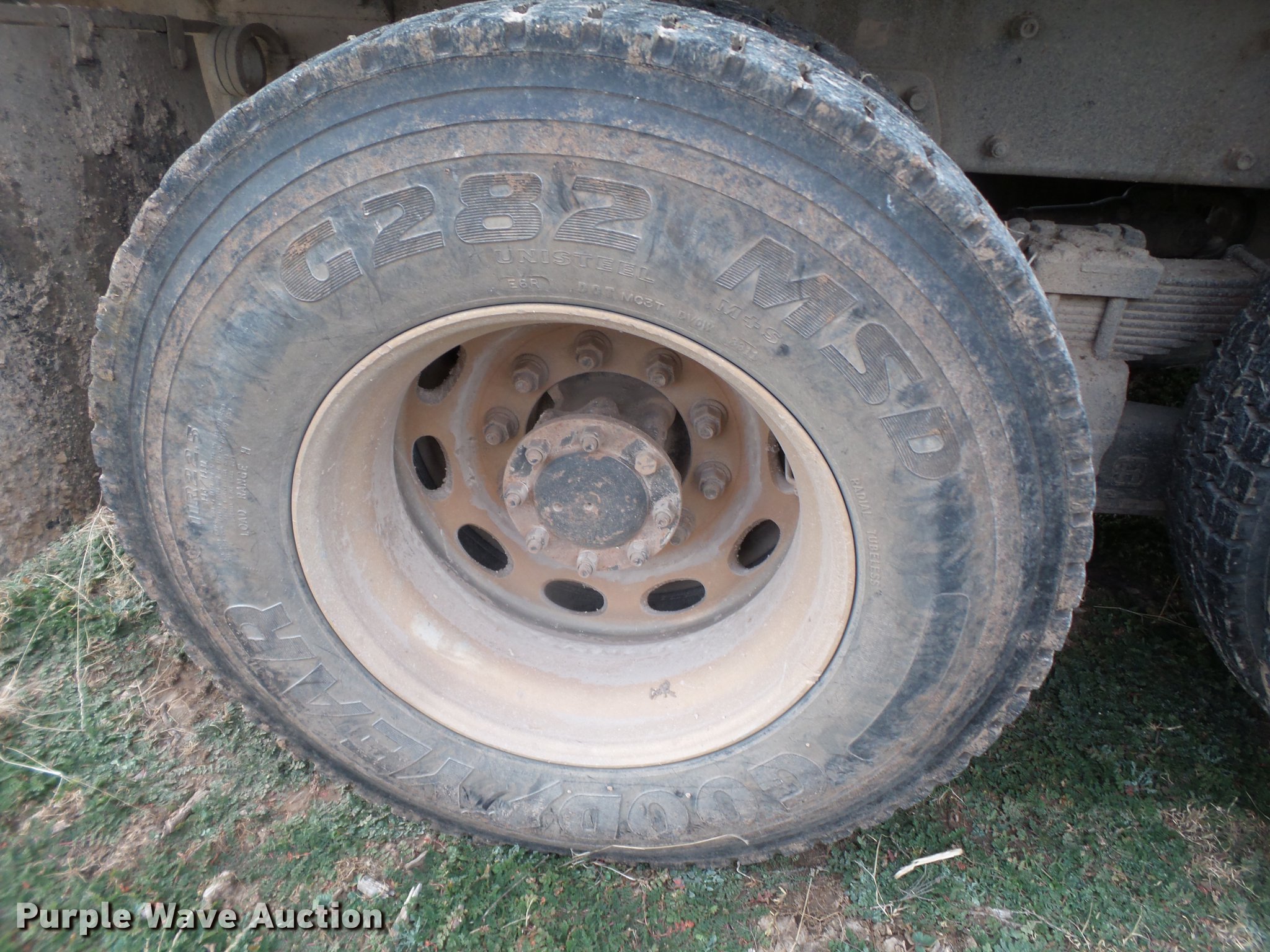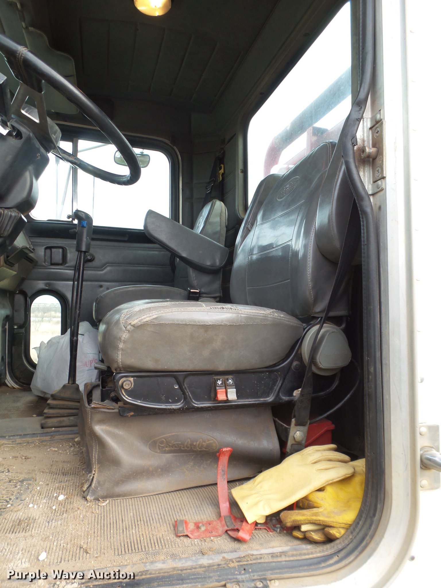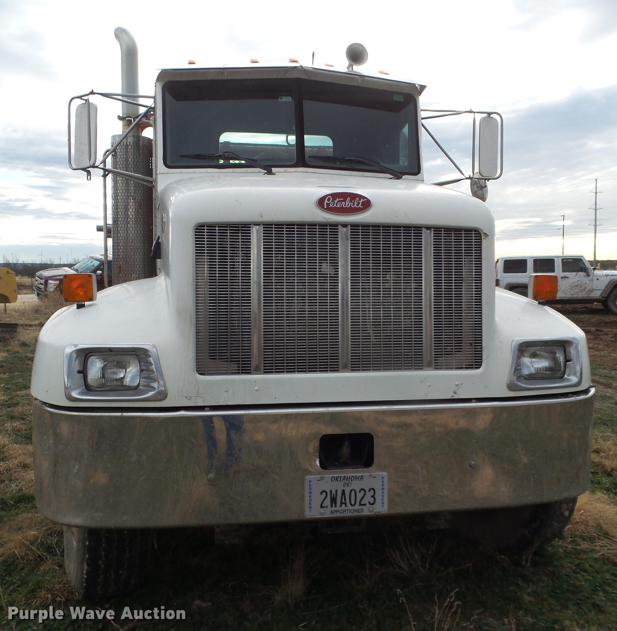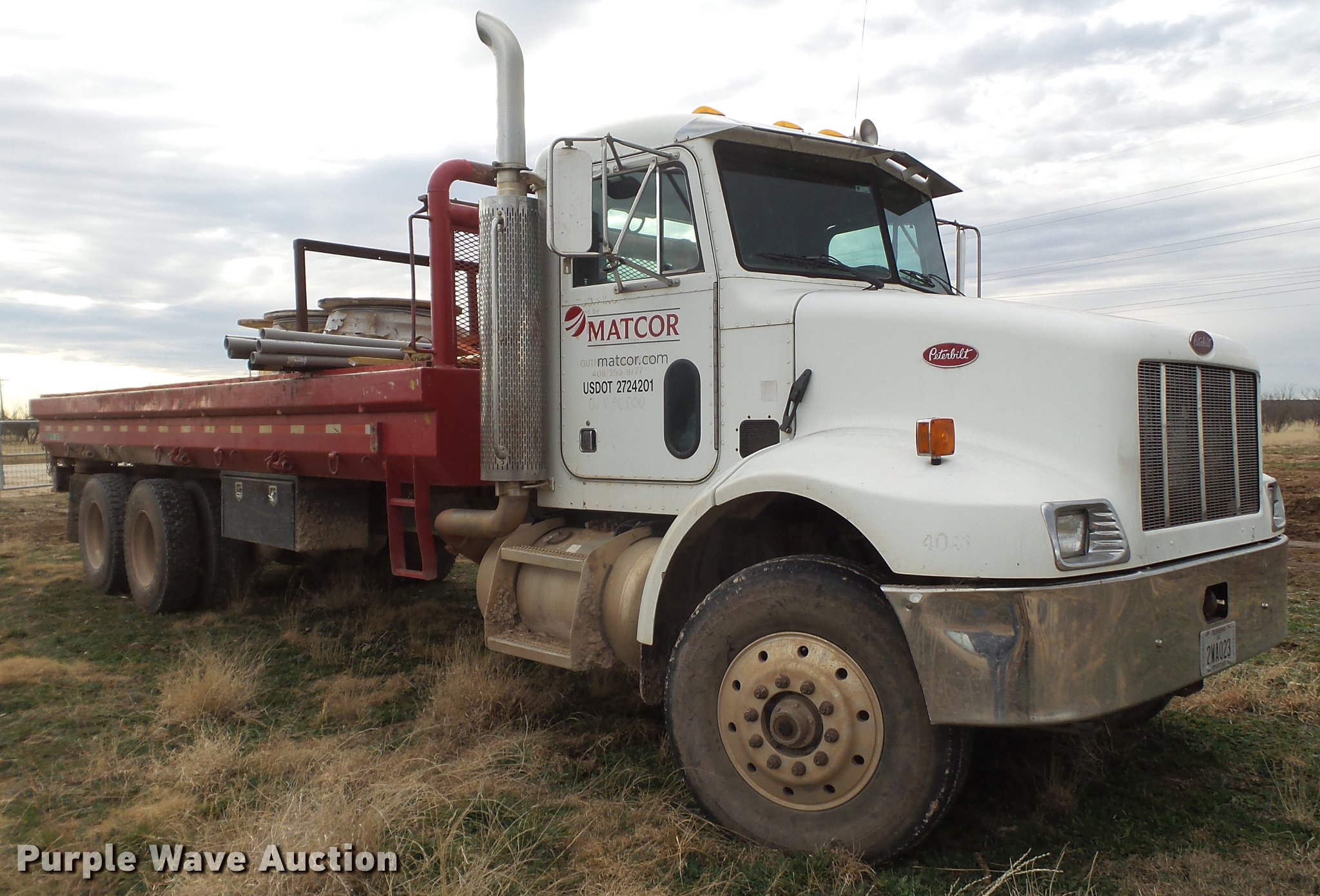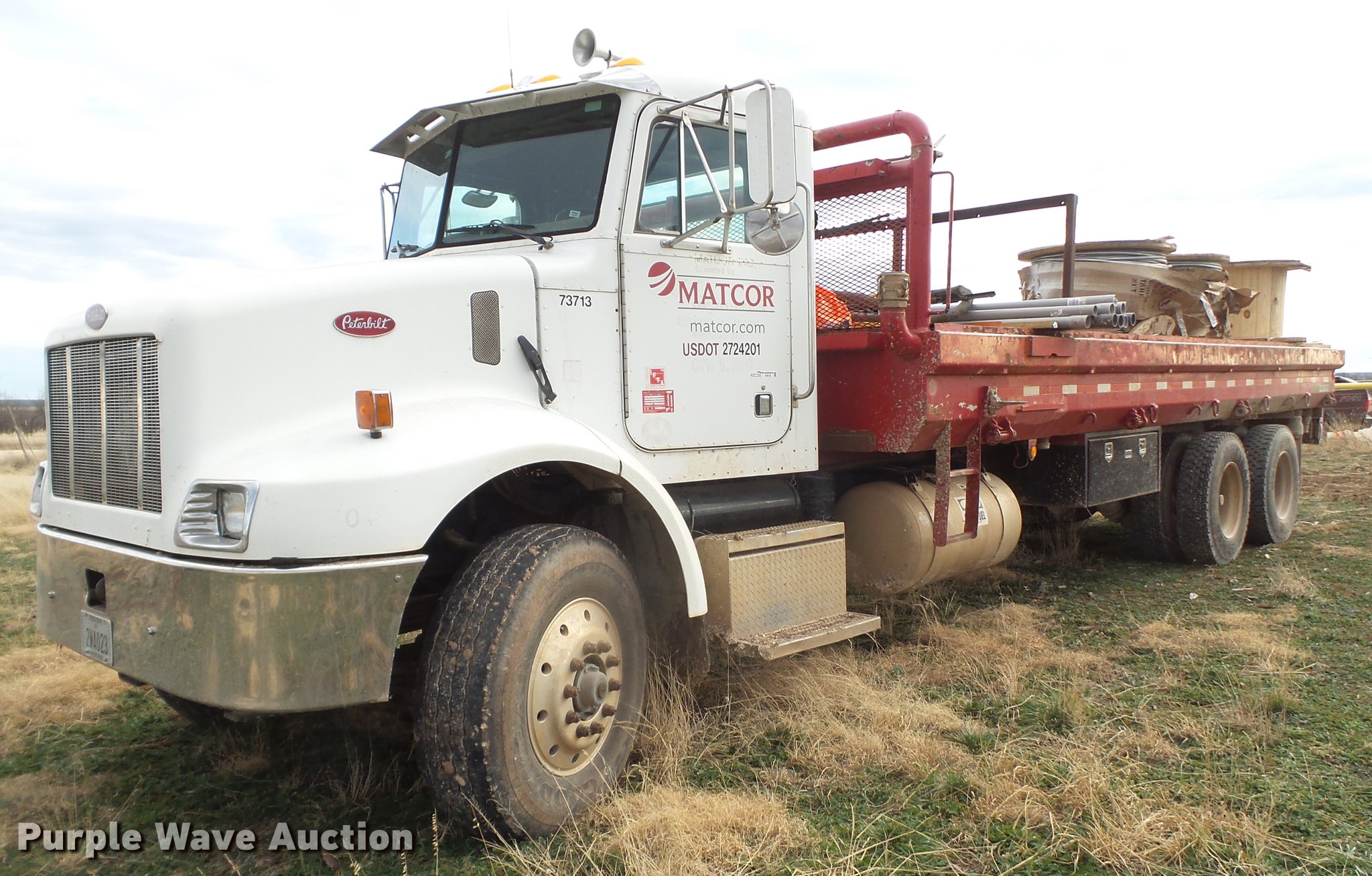 Purple Wave is selling a used Flat Bed Truck in Oklahoma. This item is a 2002 Peterbilt 330 flatbed water truck with the following: 109,824 miles on odometer, 6,747 hours on meter, Caterpillar 3126 7.2L L6 turbo diesel engine, 300 HP, Serial CKM16121, Eaton Fuller eight speed manual transmission, Tandem axle, AC and heat, AM/FM/cassette, Air suspension seat, Trailer brake controller, Front tow hooks, 24'L x 102"W steel flatbed, Water tank, Side ratchets, Storage boxes, Dual fuel tanks, Single exhaust stack, Pintle hitch, Trailer wiring, Spring suspension, Air brakes, 315/80R22.5 front tires, 11R22.5 rear tires