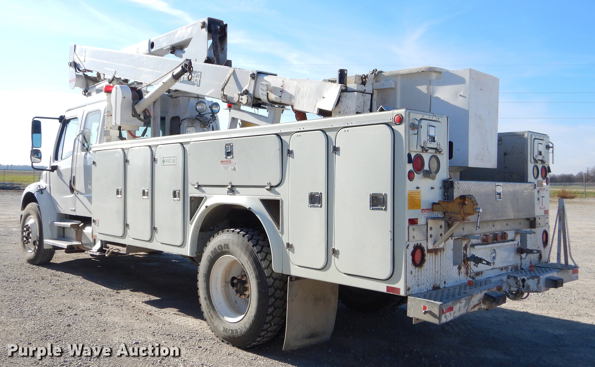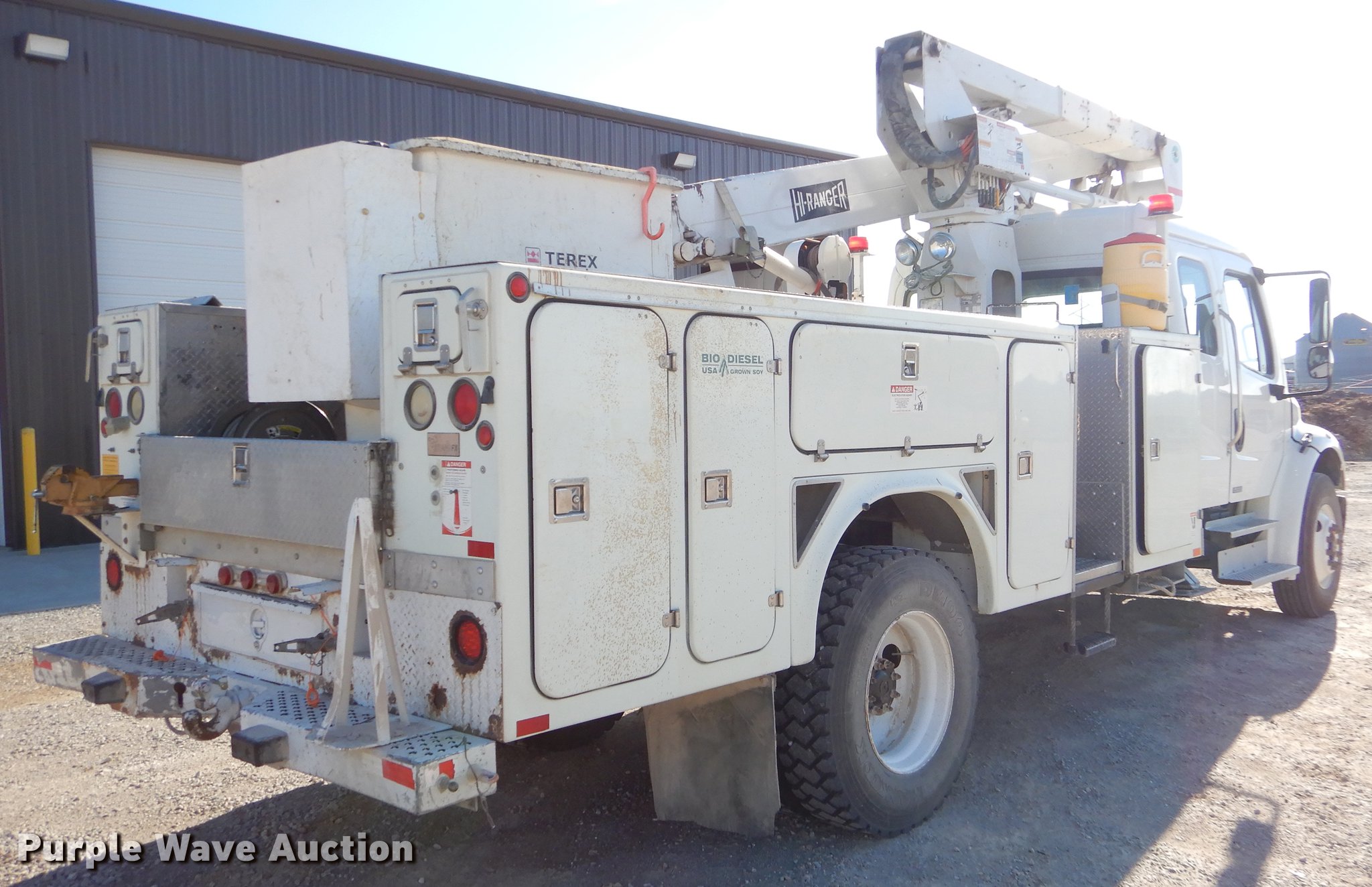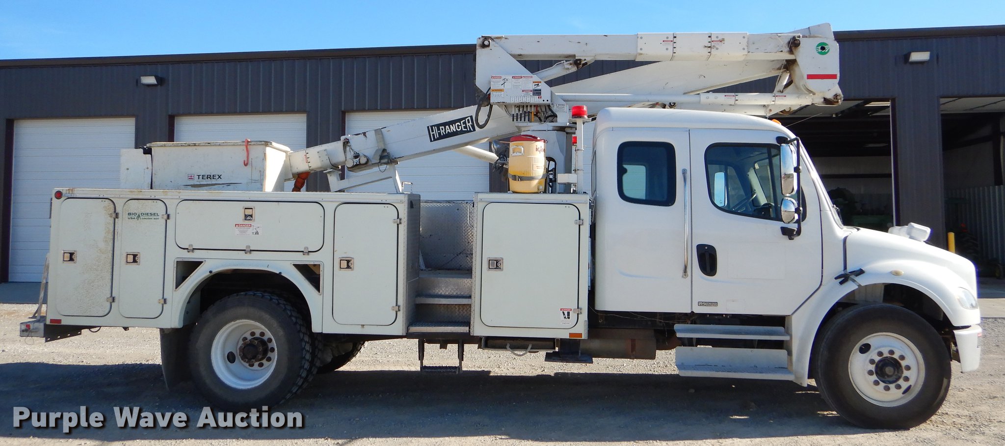 Purple Wave is selling a used Bucket Truck in Missouri. This item is a 2005 Freightliner Business Class M2 bucket truck with the following: 149,816 miles on odometer, 12,138 hours on meter, Caterpillar C7 7.2L L6 turbo diesel engine, Automatic transmission, Inter-axle differential lock, Single axle, AC and heat, Cruise, AM/FM/cassette, Heated mirrors, Air suspension seat, Beacon light, Front tow hooks, Terex 17'L utlity bed, Shelving, Slide-out drawers, Compartment lights, Utility rack, Catwalk, Work lights, 2005 Hi Ranger TL50M boom, 350 lbs maximum lift capacity, 50' maximum lift height, Man basket, Ground and platform control, Boom rotation, Articulating, insulated, telescopic boom, Rope material handler, (2) outriggers, Serial 2050627902, Single fuel tank, Pintle hitch, 214" wheelbase, Spring suspension, Air brakes, 11R22.5 tires, GVWR 33,000 lbs, Steering wheel will not lock in place