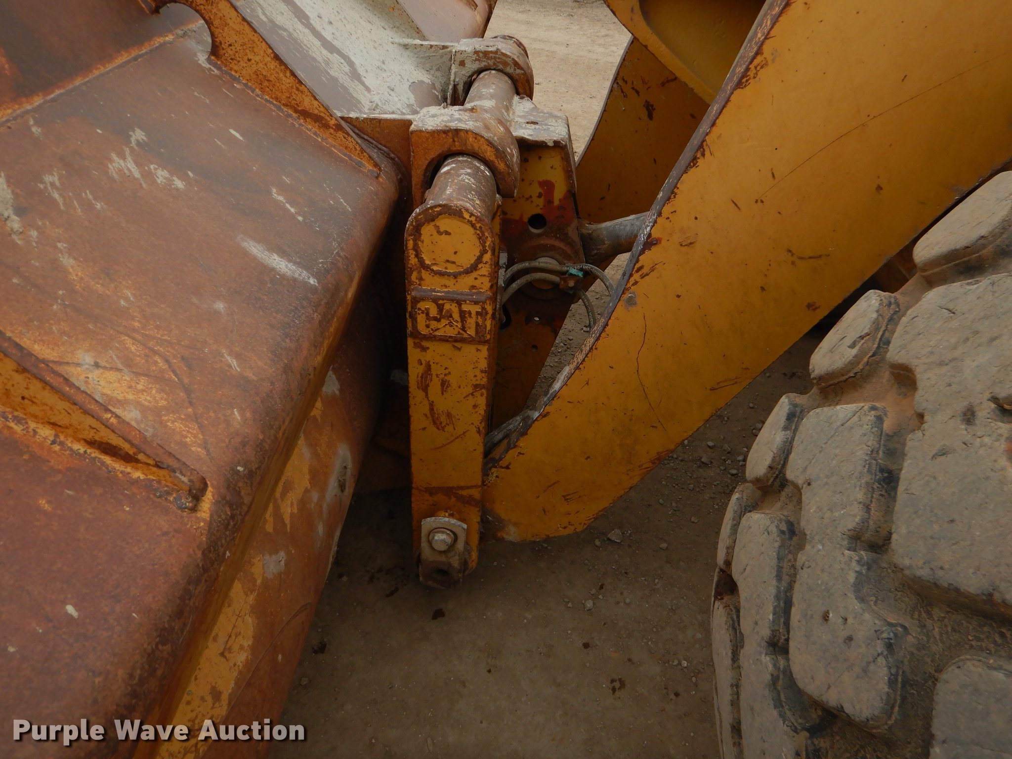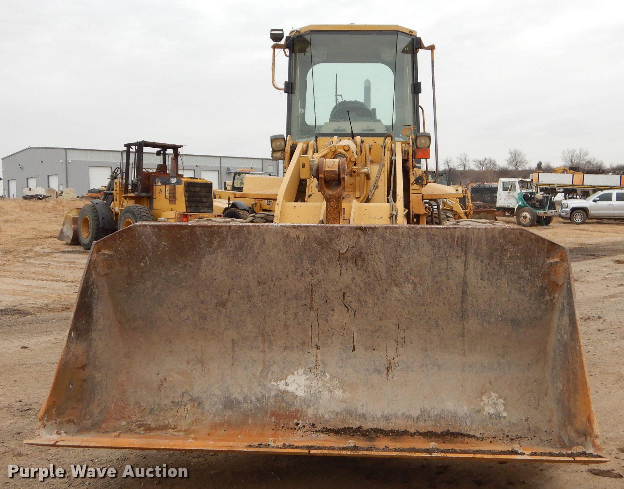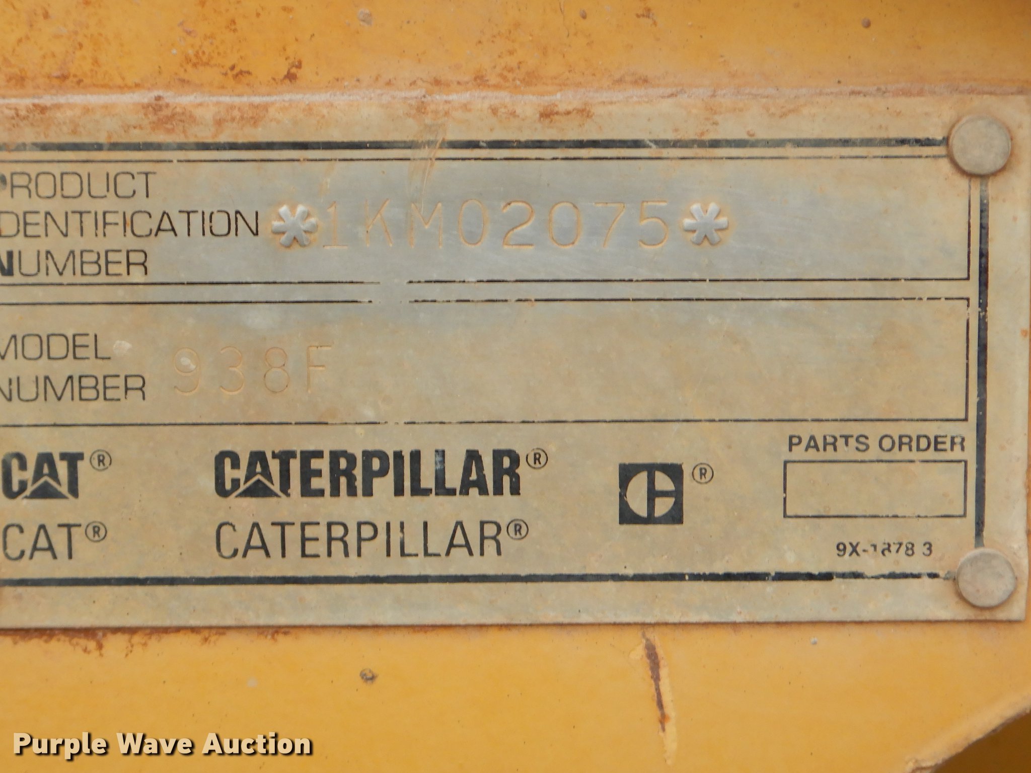 Purple Wave is selling a used Wheel Loader in Oklahoma. This item is a 1996 Caterpillar 938F wheel loader with the following: 2,504 hours on meter, Caterpillar six cylinder turbo diesel engine, Powershift transmission, 4F-4R gears, Enclosed cab, AC and heat, Air suspension seat, Joystick bucket controls, Front and rear work lights, 106"W general purpose bucket, Bolt-on cutting edge, 60"L pallet forks, Hydraulic quick coupler, 20.5-25 tires, Windshield cracked, Ladder broken, Serial 1KM02075, Unit# 378