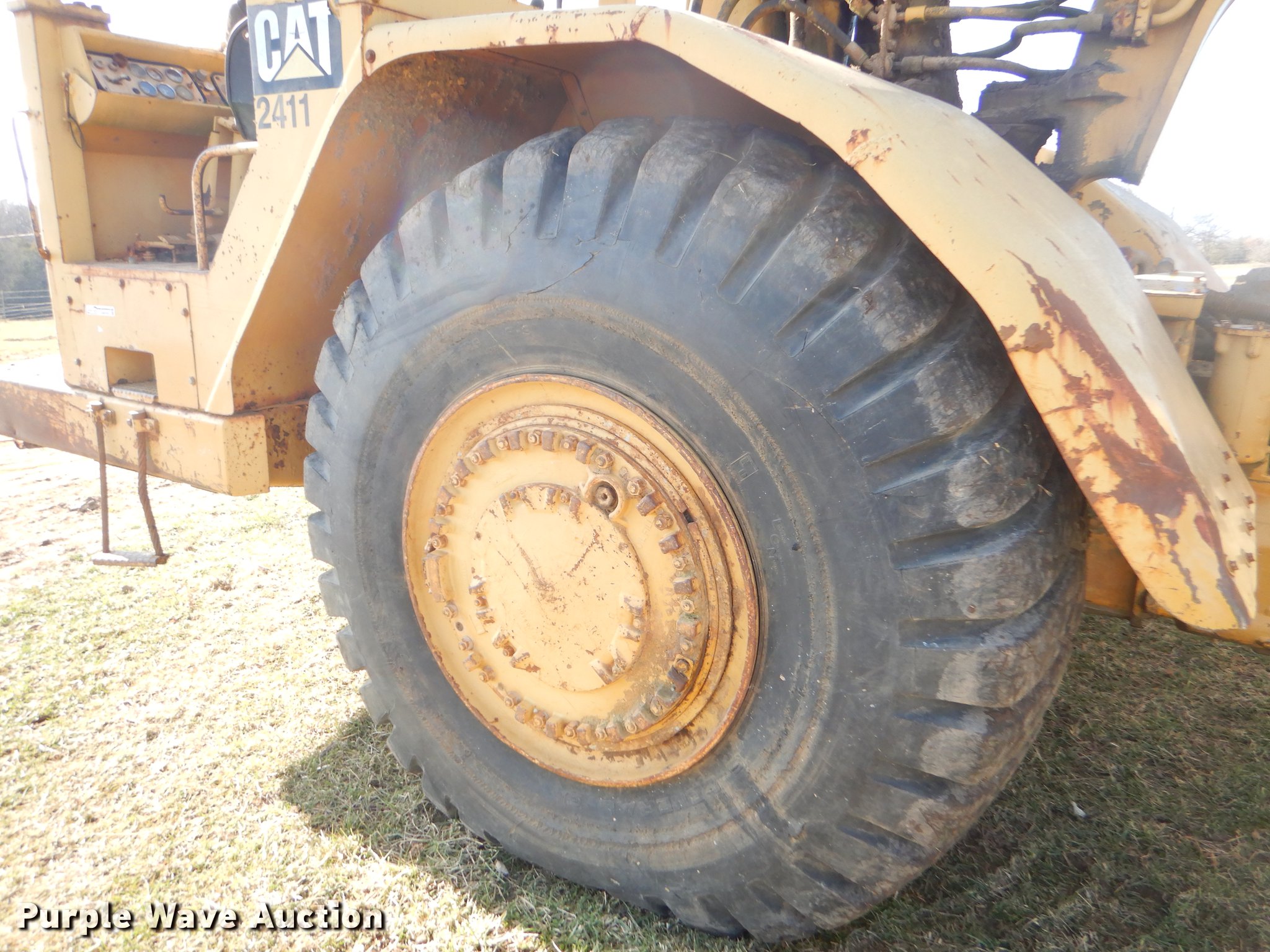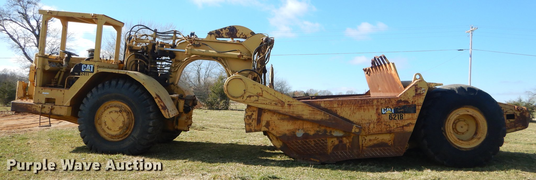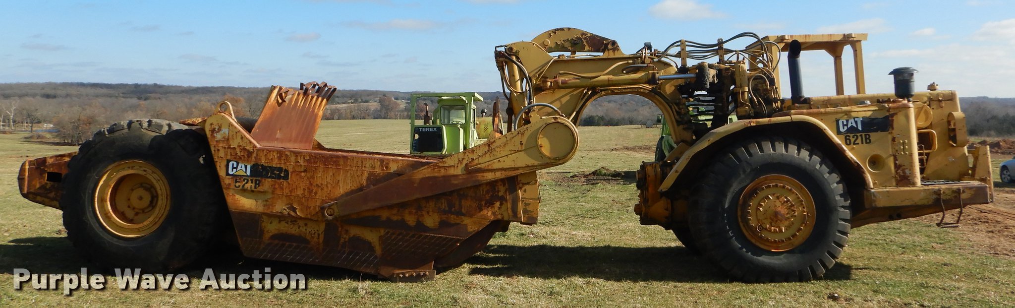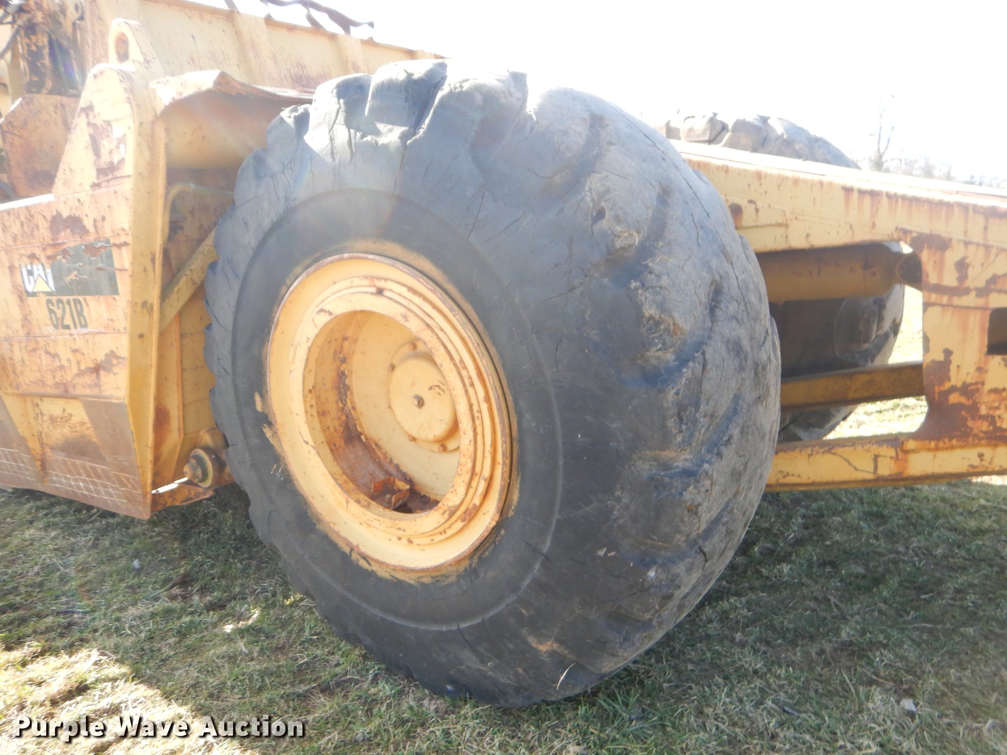 Purple Wave is selling a used Conventional Scraper in Missouri. This item is a Caterpillar 621B conventional scraper with the following: 6,570 hours on meter, Caterpillar six cylinder diesel engine, Manual transmission, 8F-1R gears, OROPS, Suspension seat, Three lever scraper controls, 19 cu.yd. bowl capacity, Reversible cutting edge, Hydraulic lift, Front and rear work lights, Rear push block, Cushion hitch, 29.5-29 tires, Lip and steering cylinders leak, Non-operational brakes, Serial 35V1041