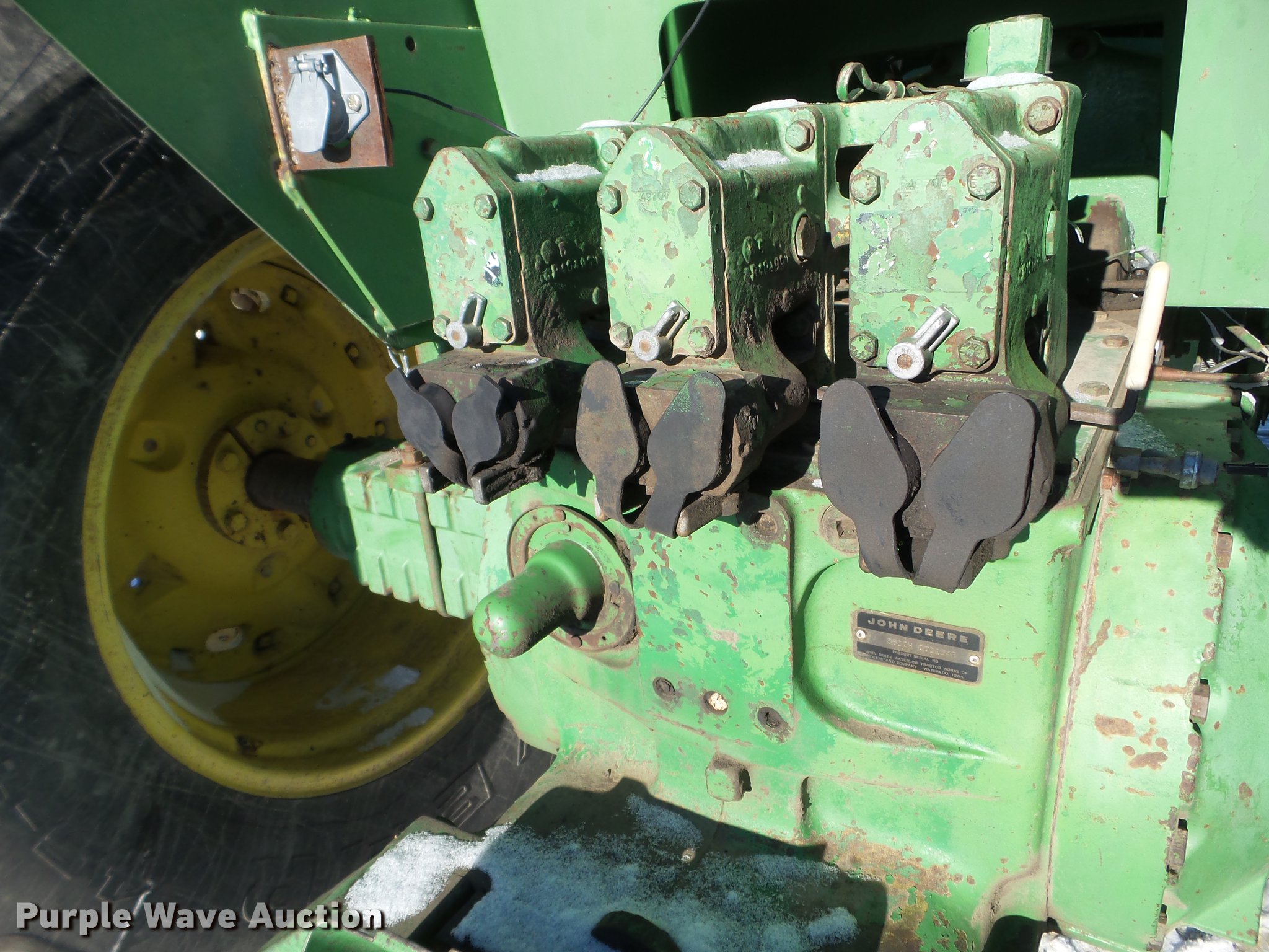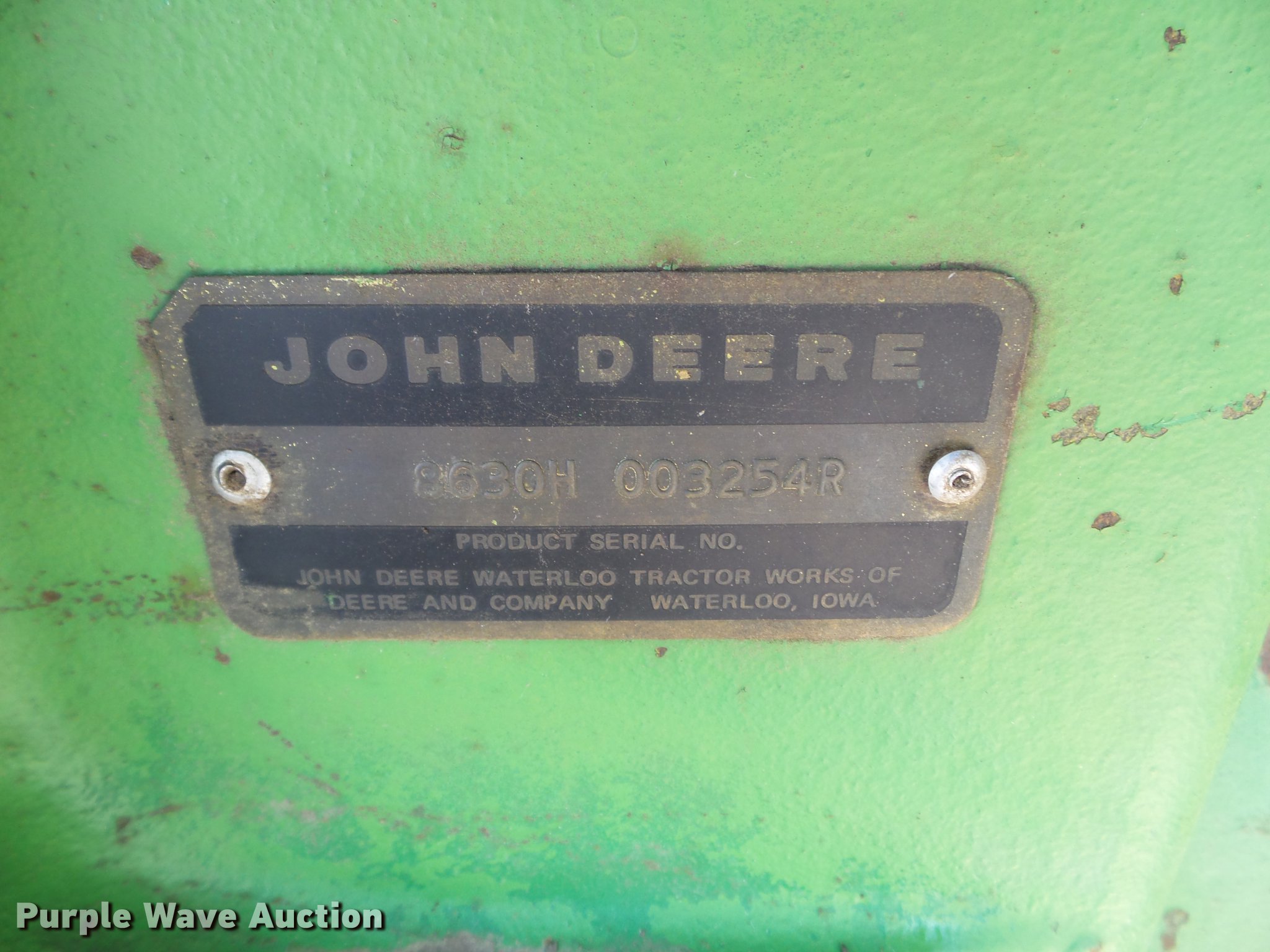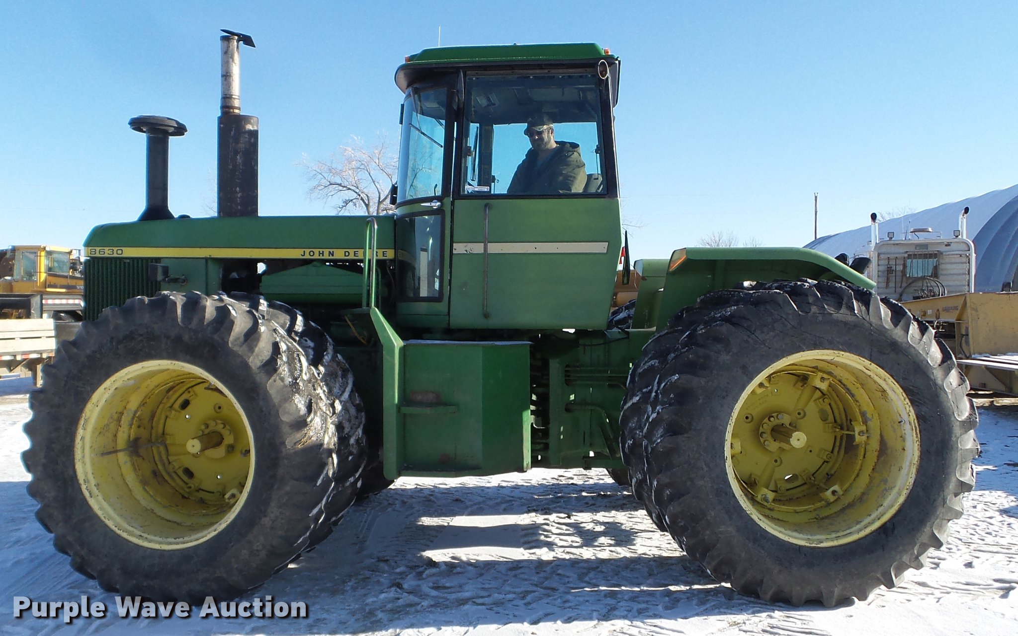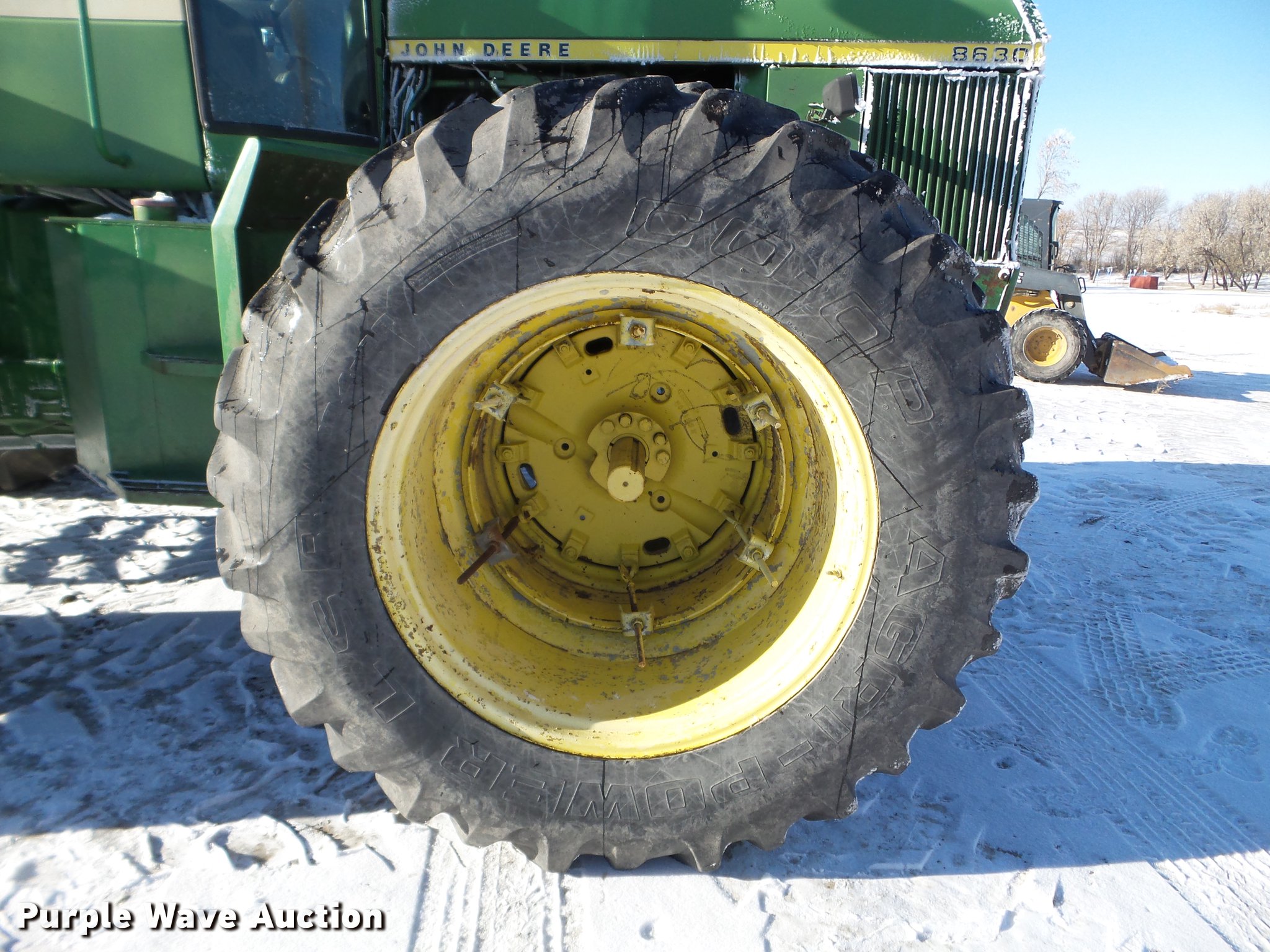Purple Wave is selling a used Articulated 4-Wheel Drive Tractor in North Dakota. This item is a 1976 John Deere 8630 4WD tractor with the following: 541 hours on meter, John Deere six cylinder turbo diesel engine, Serial SE6619A040113, Quad-Range transmission, 20F-2R gears, AC and heat, AM/FM, Tilt steering wheel, Seven pin outlet, 1000 PTO, (3) rear hydraulic remote sets, 18.4-38 dual tires, Serial 8630H003254R