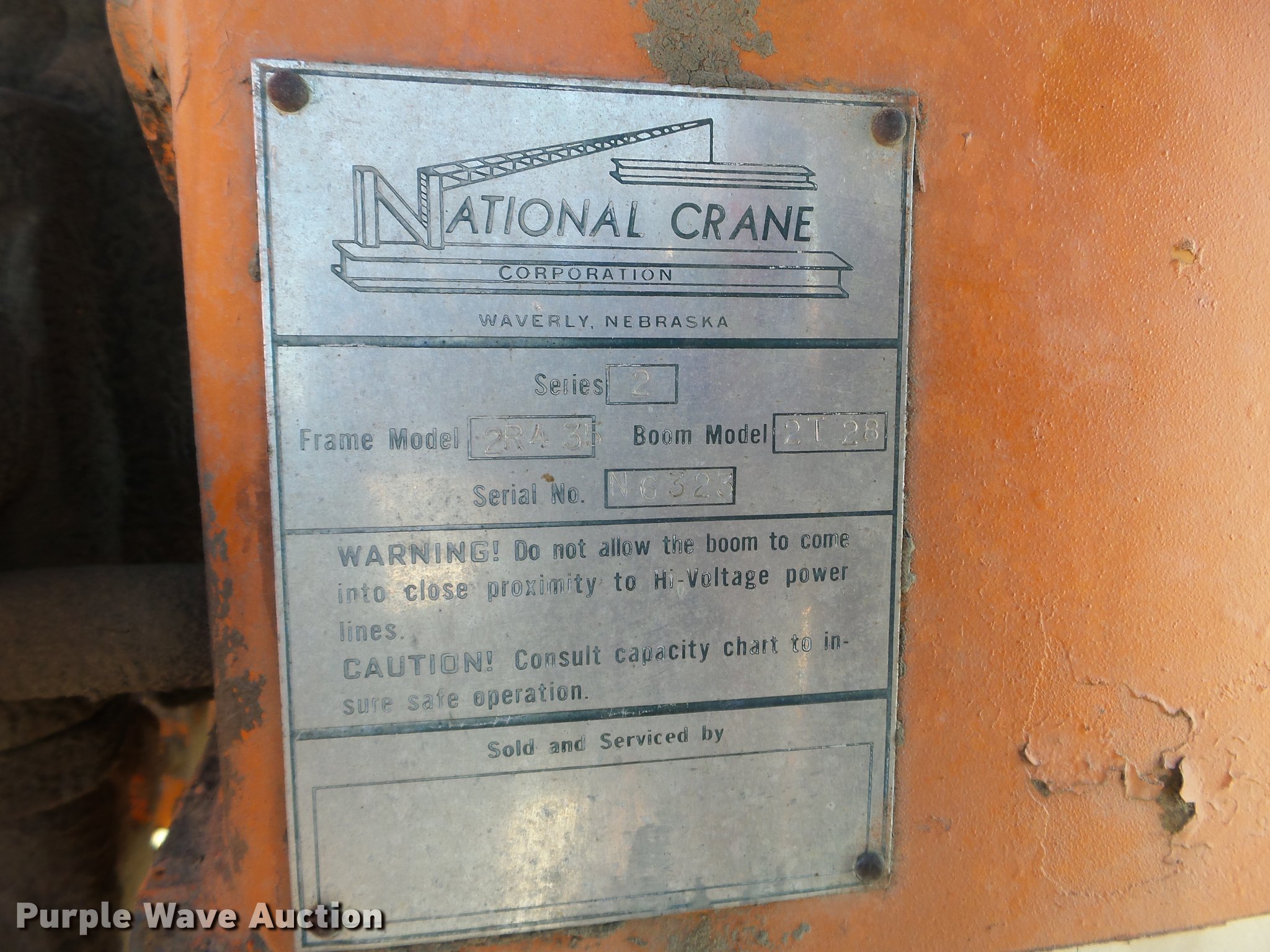 National Crane crane. Frame model 2R435, Boom model 2T28, 28'L, 95"H, Winch, Outriggers, Truck not included, Serial 6323. Mittleider Excavating and Gravel Crushing. 4170 45th Ave SE. Tappen, ND 58487