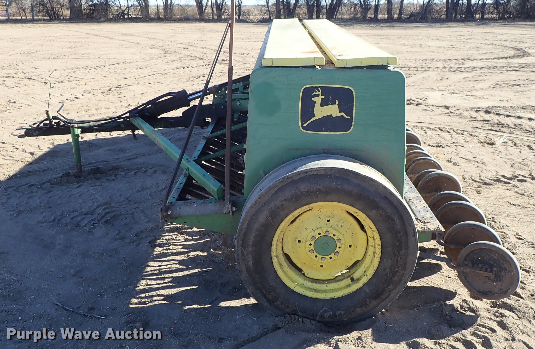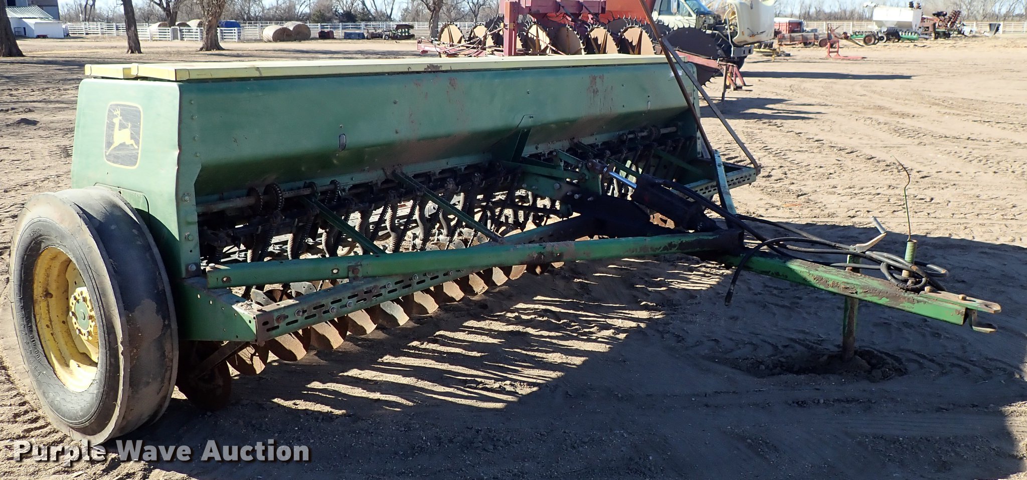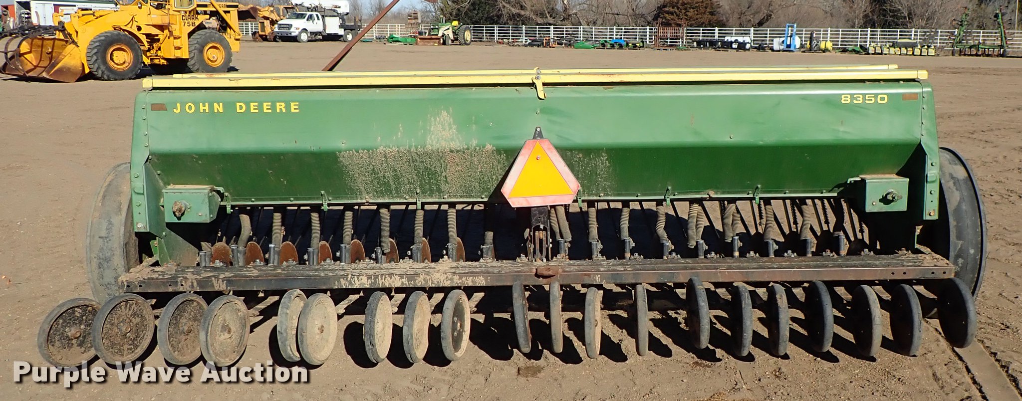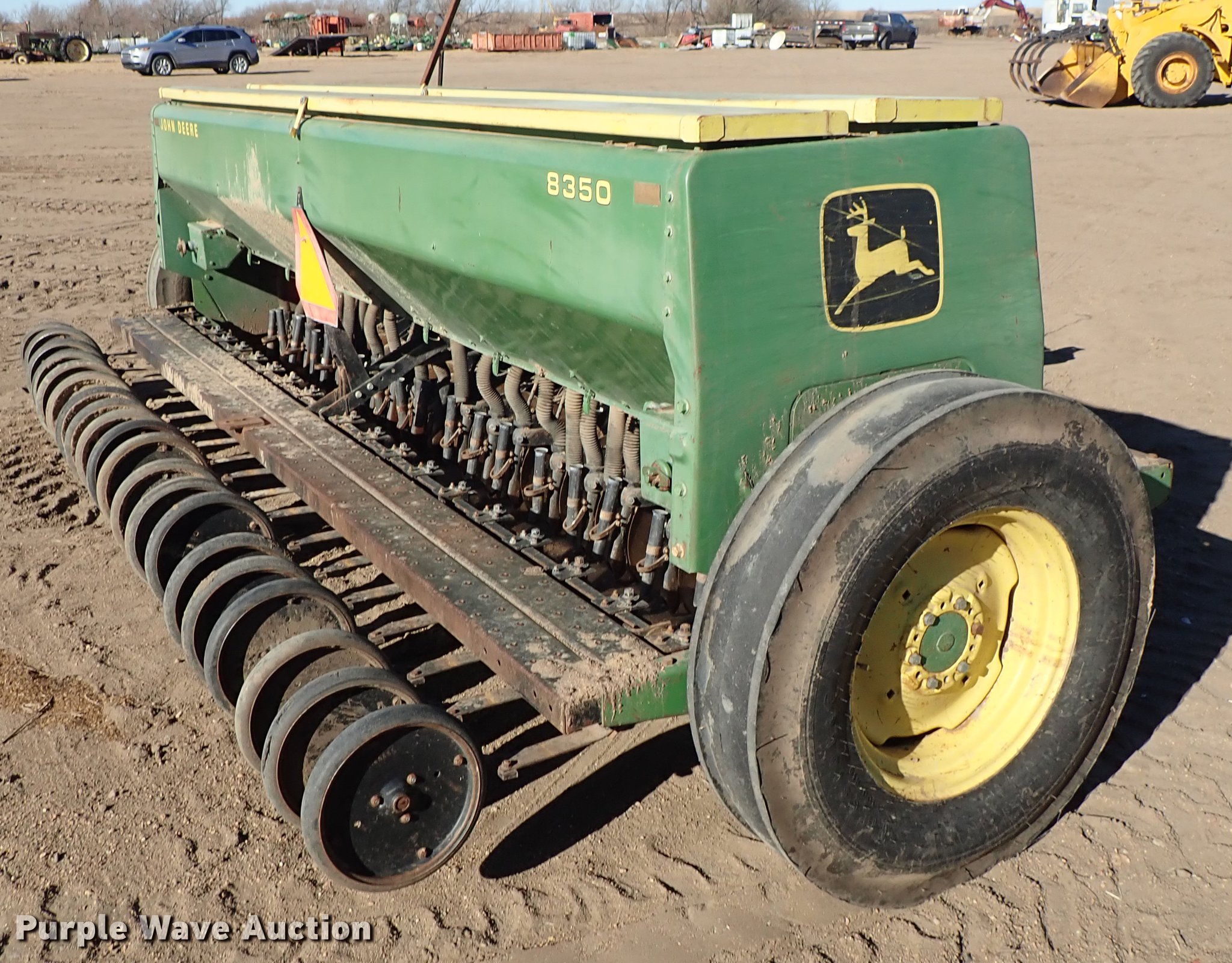 Purple Wave is selling a used Grain Drill or Seeder in Kansas. This item is a John Deere 8350 grain drill with the following: 20 row units, 8" row spacing, Marker arm, Hydraulic lift, Single disk closing system, Rubber press wheels, 7.50-20 tires