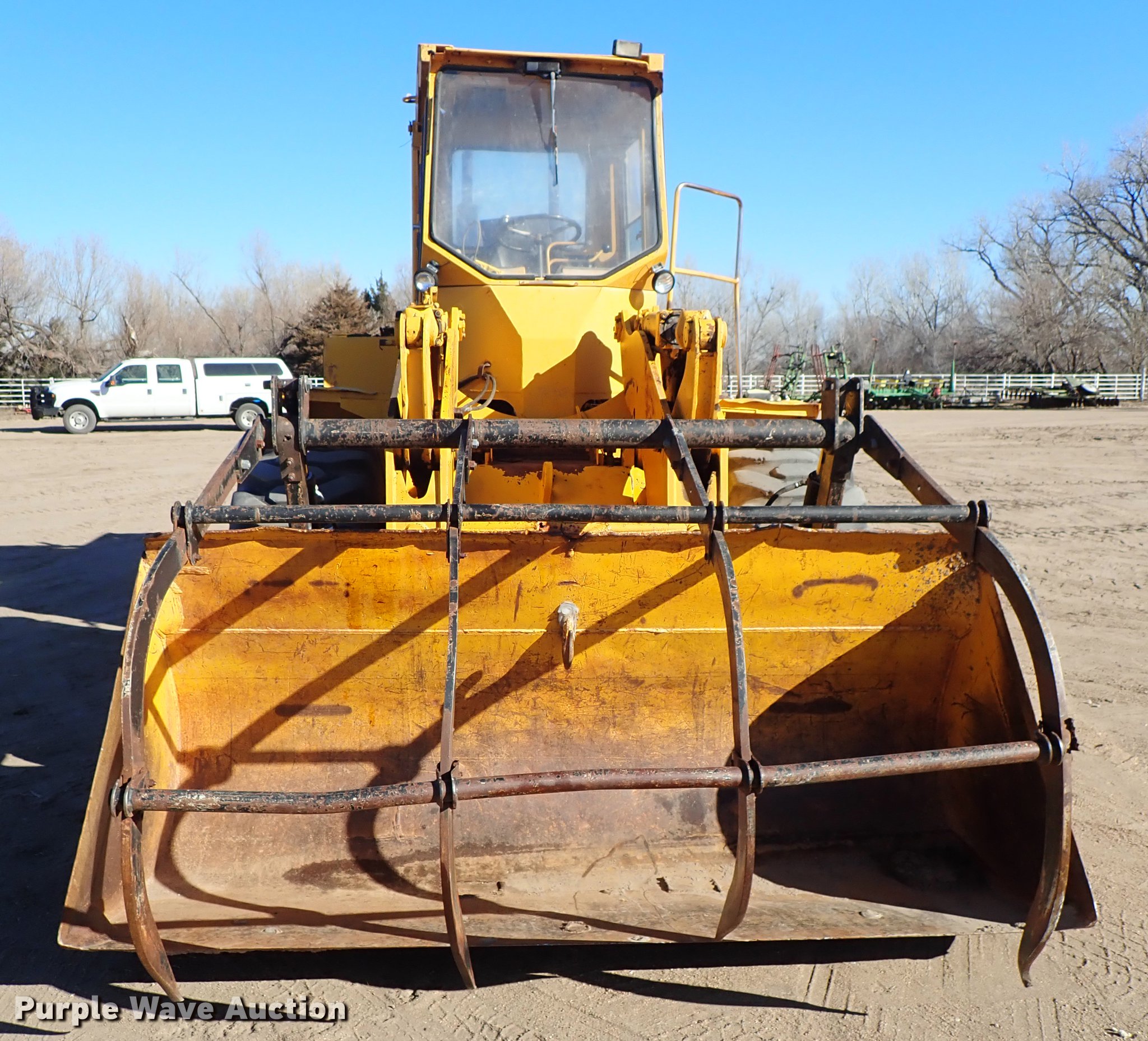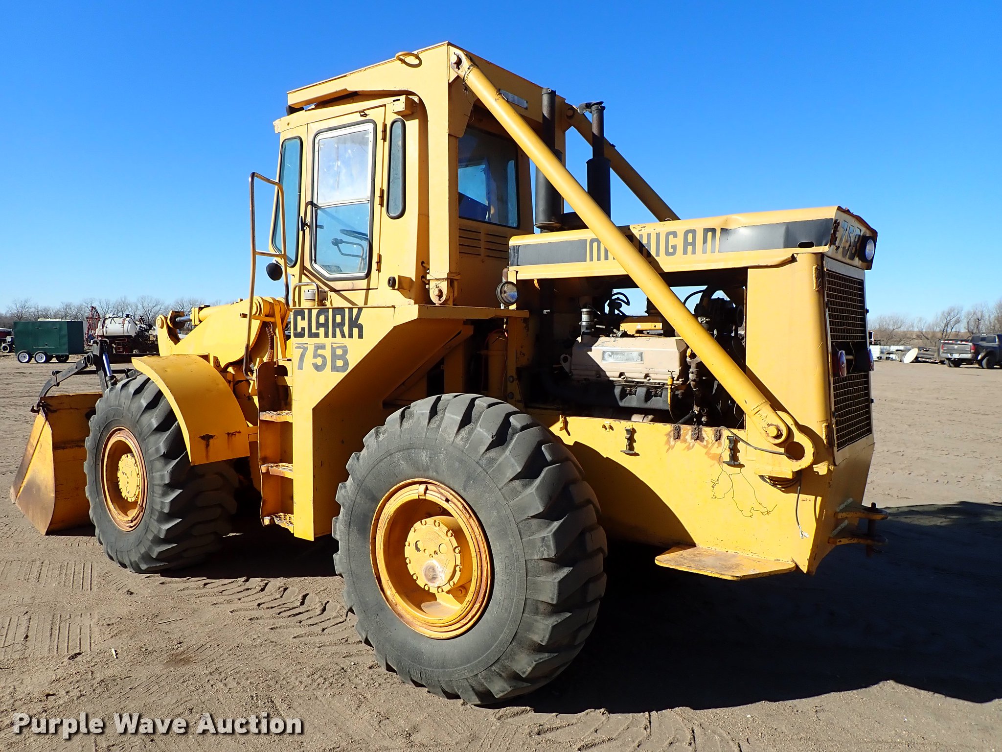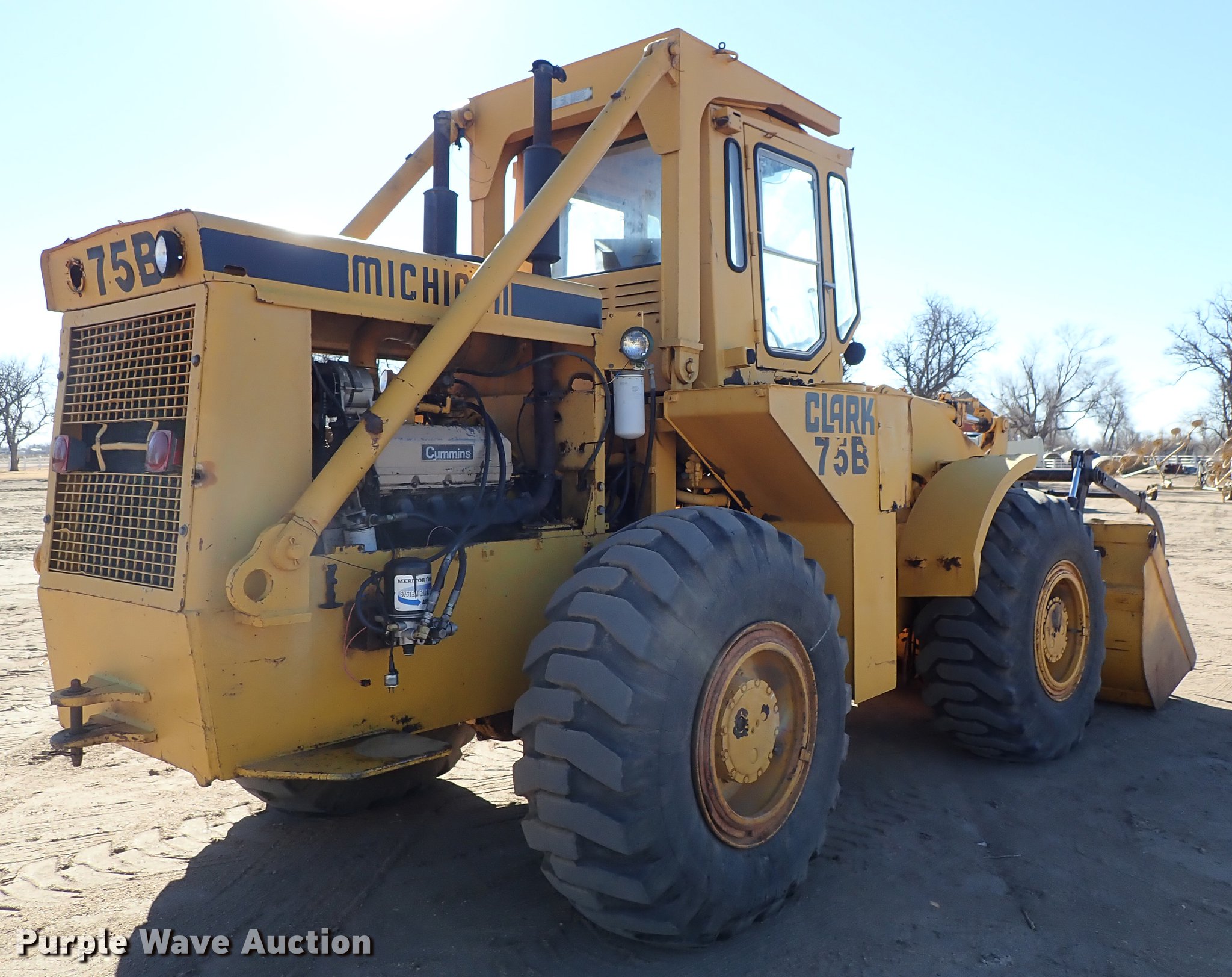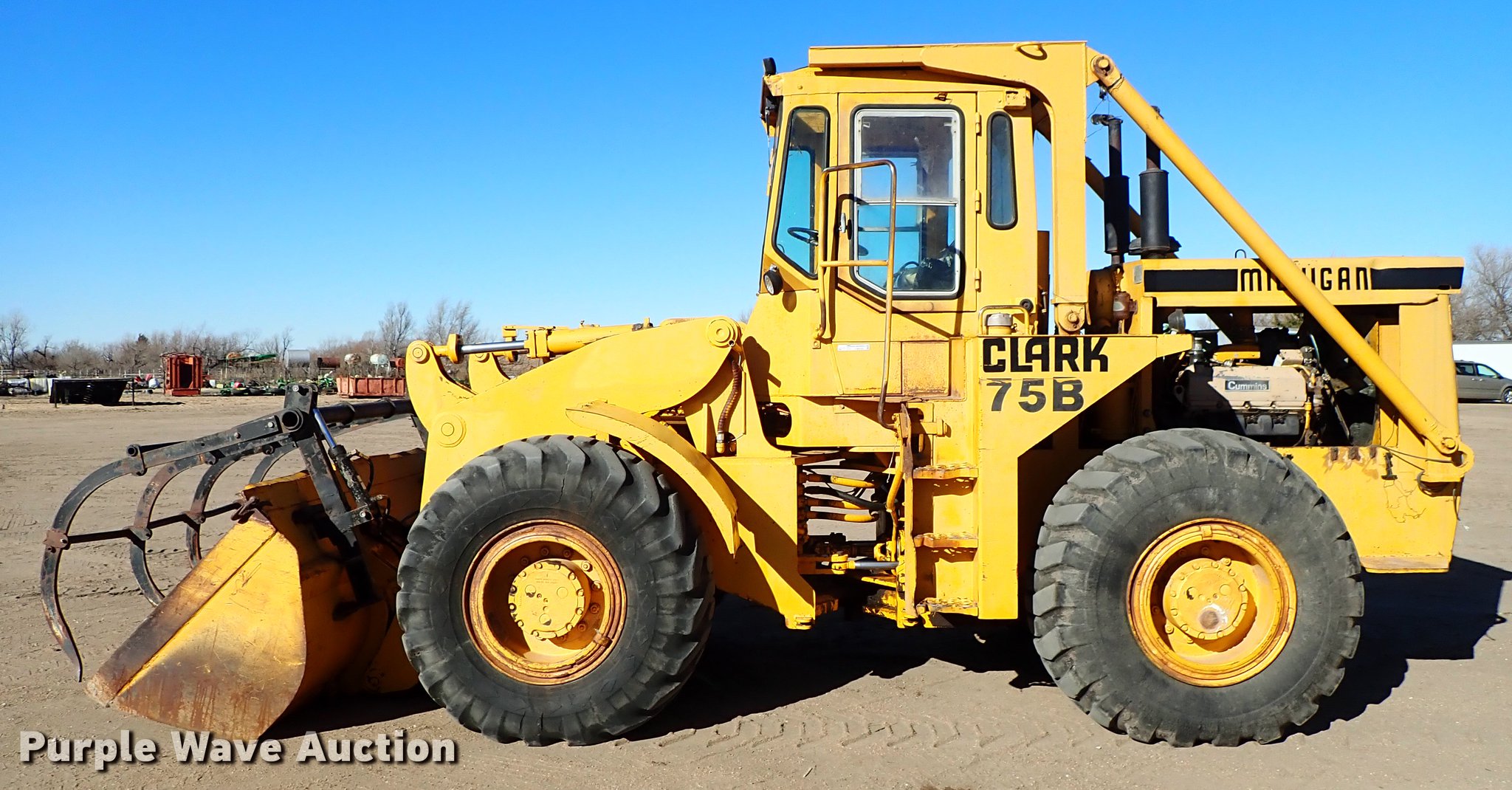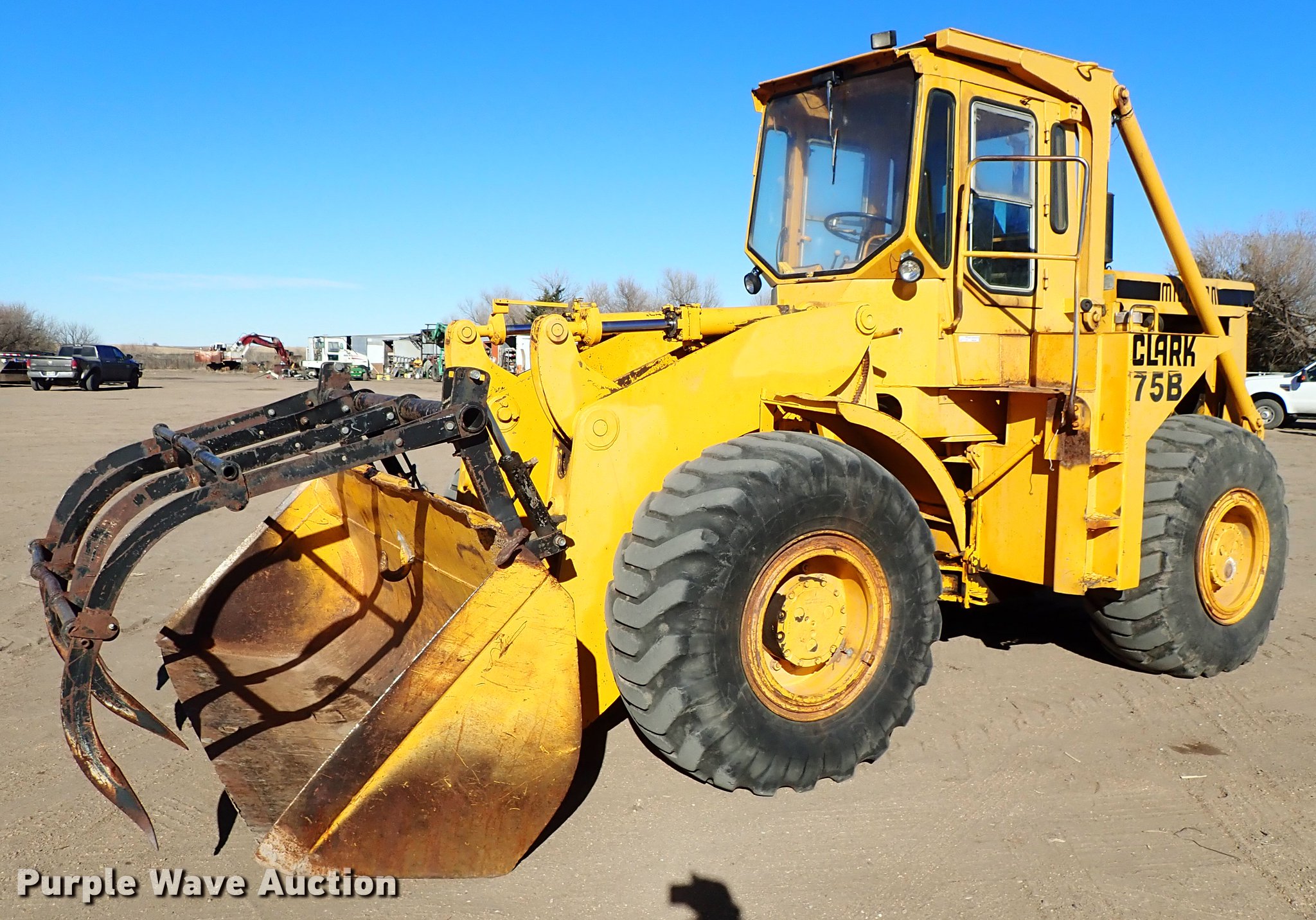 Purple Wave is selling a used Wheel Loader in Kansas. This item is a Clark 75B wheel loader with the following: Unknown hours on meter, Cummins four cylinder diesel engine, Enclosed cab, Two-lever bucket controls, Front and rear work lights, 102"W grapple bucket, 76"W grapple, 20.5-25 tires