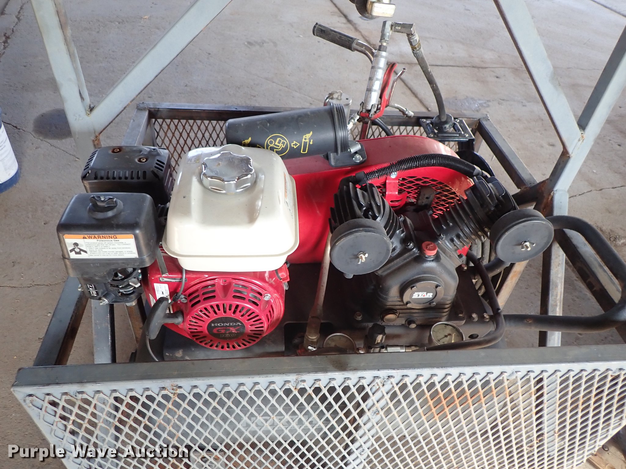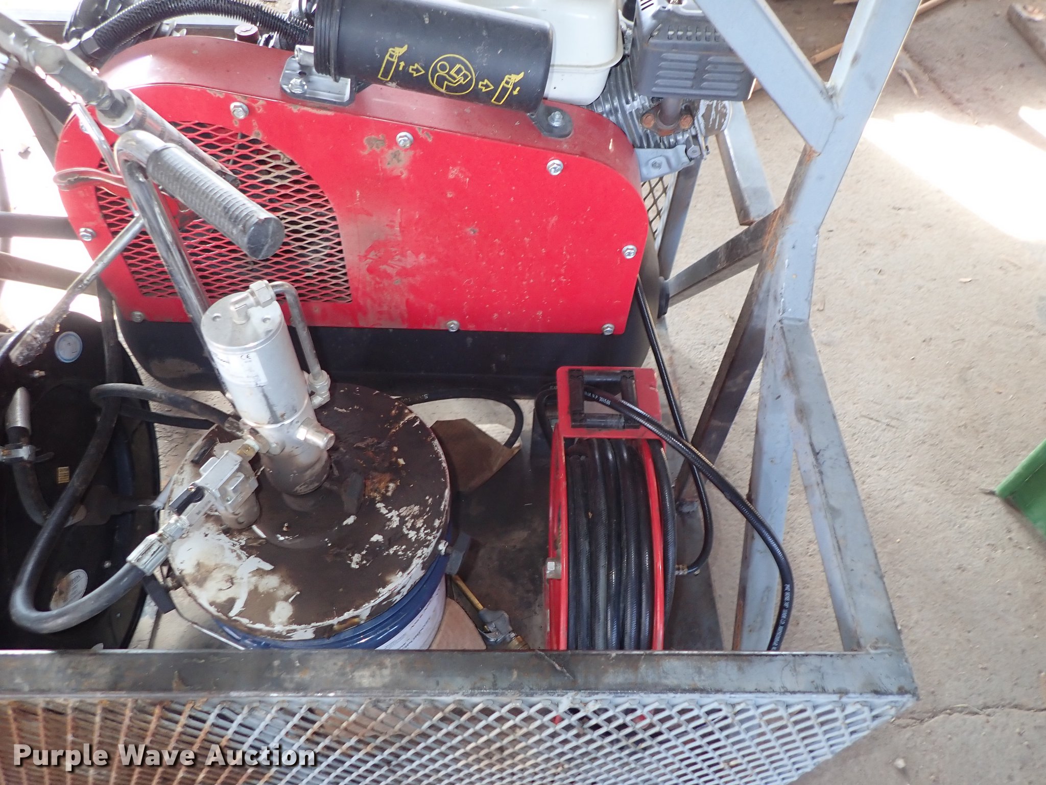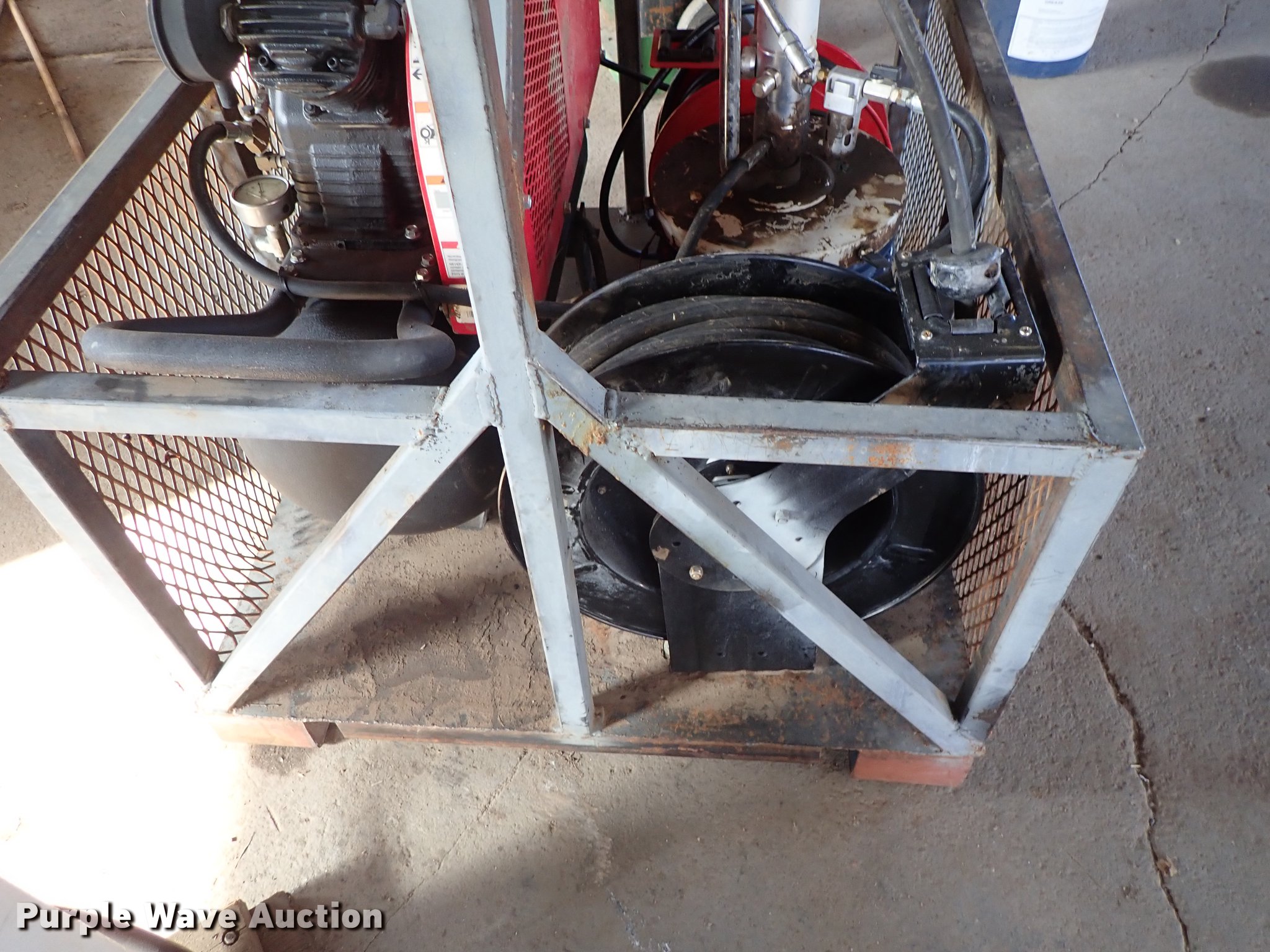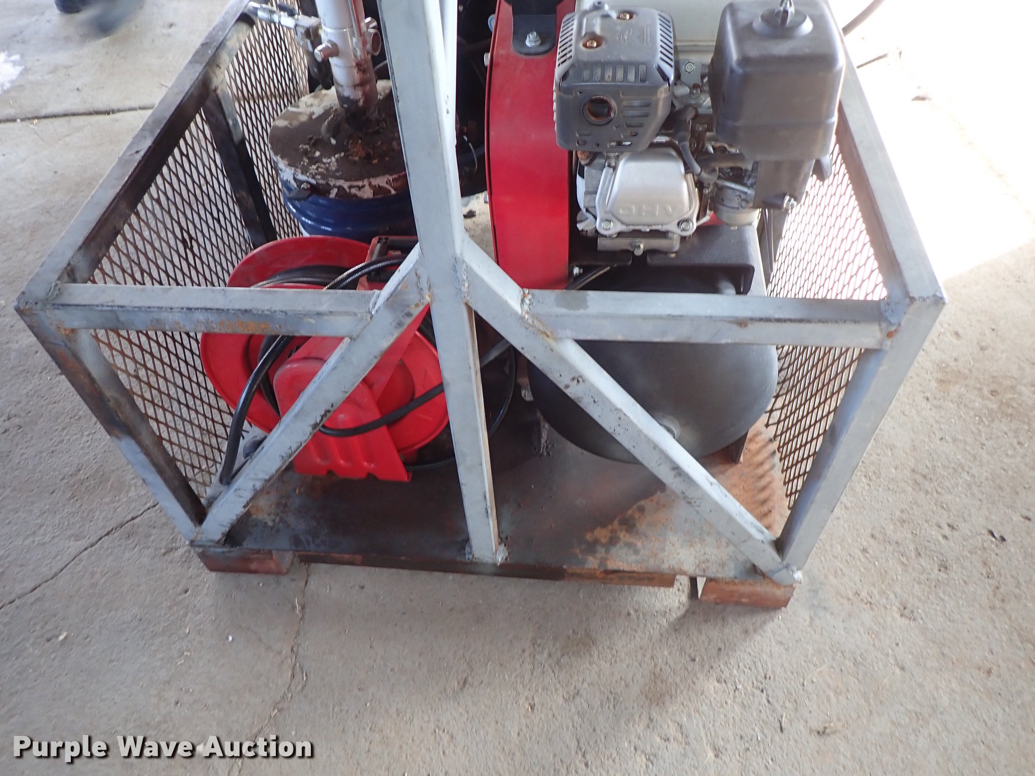 Purple Wave is selling a used Fuel and Lube in Kansas. This item is a Air and grease service unit with the following: Air compressor, Honda gas engine, Hose, Reel, Grease pump, Hose, Reel, Grease, Steel basket, 45" x 38"
