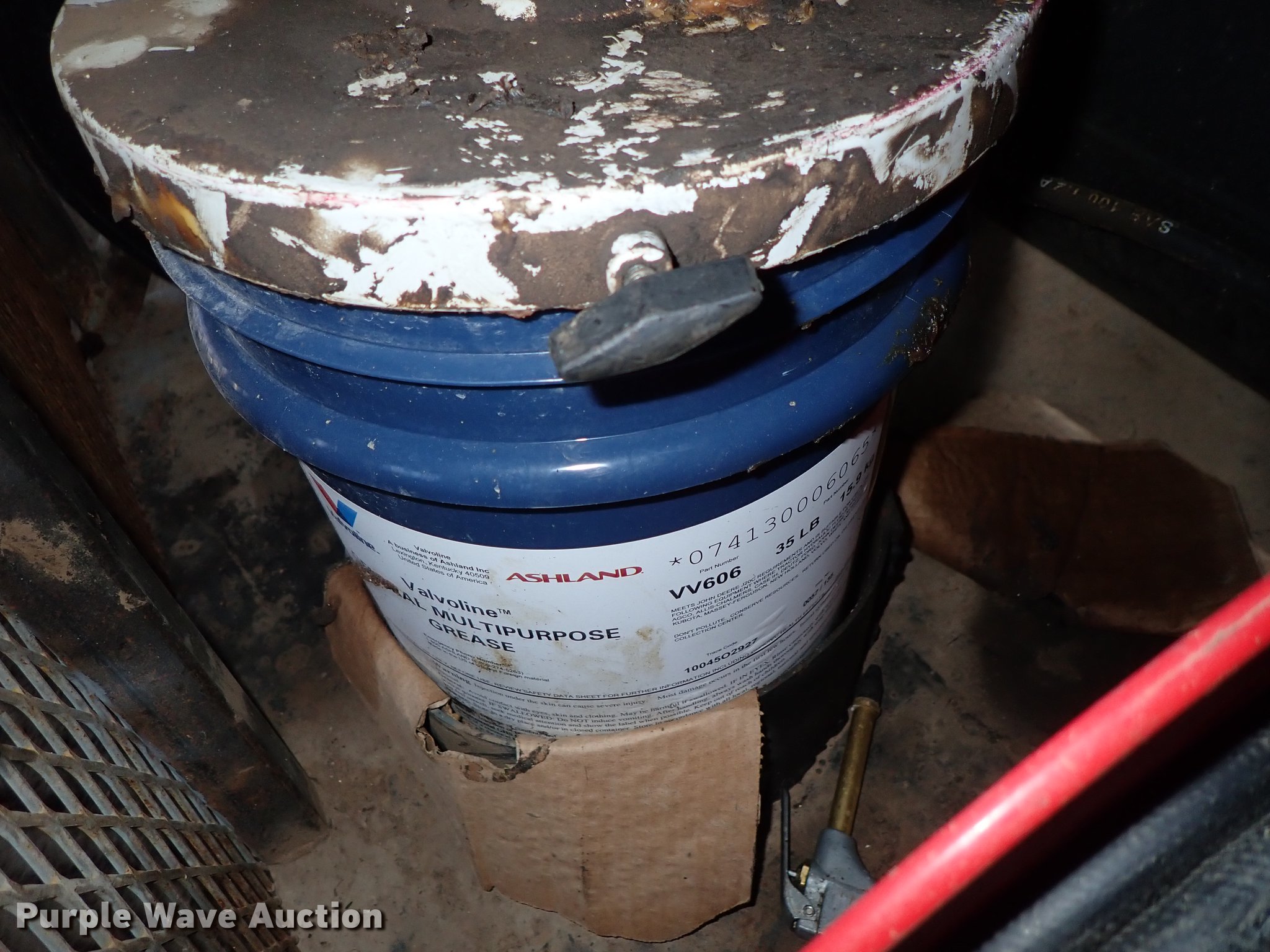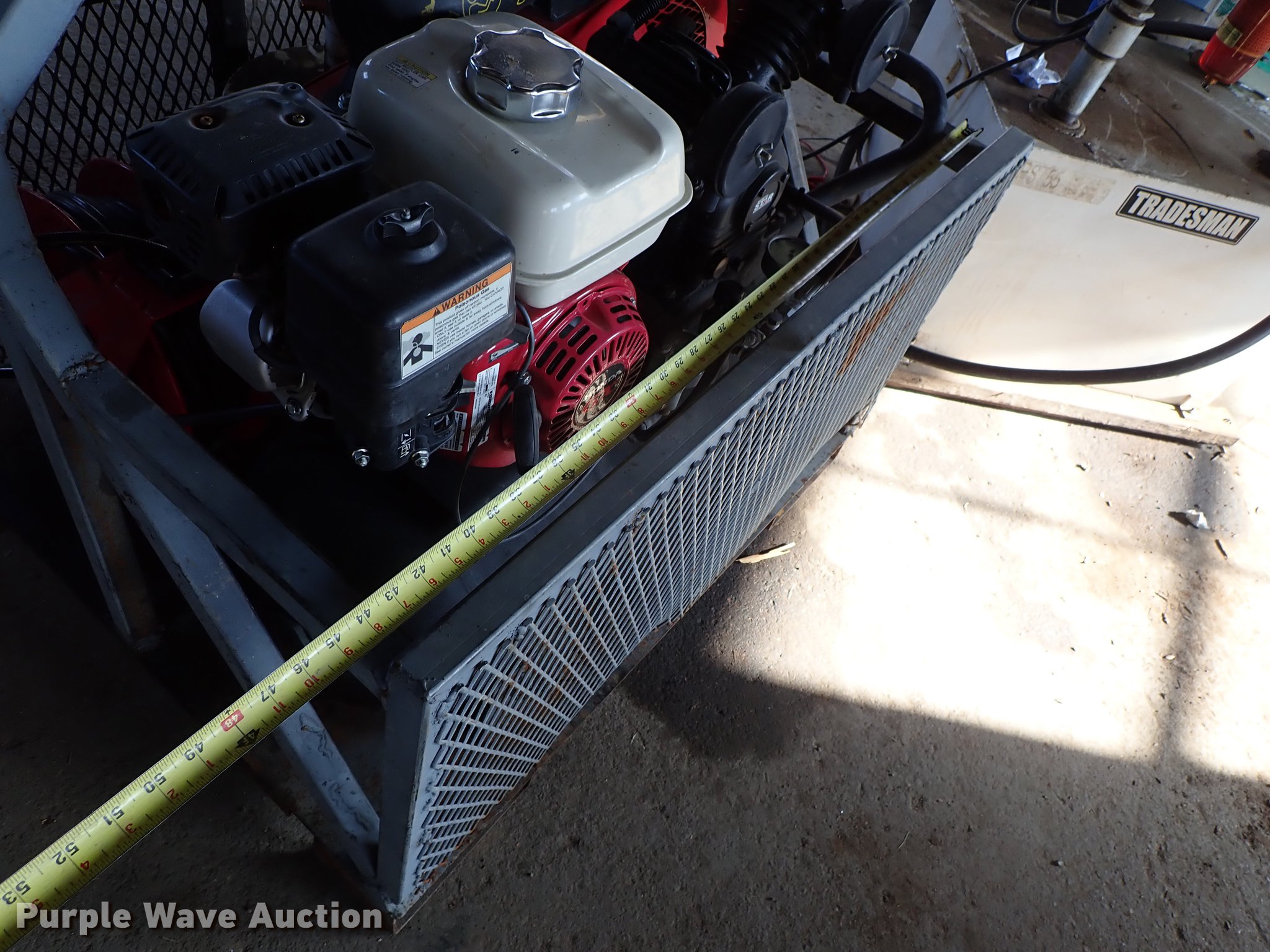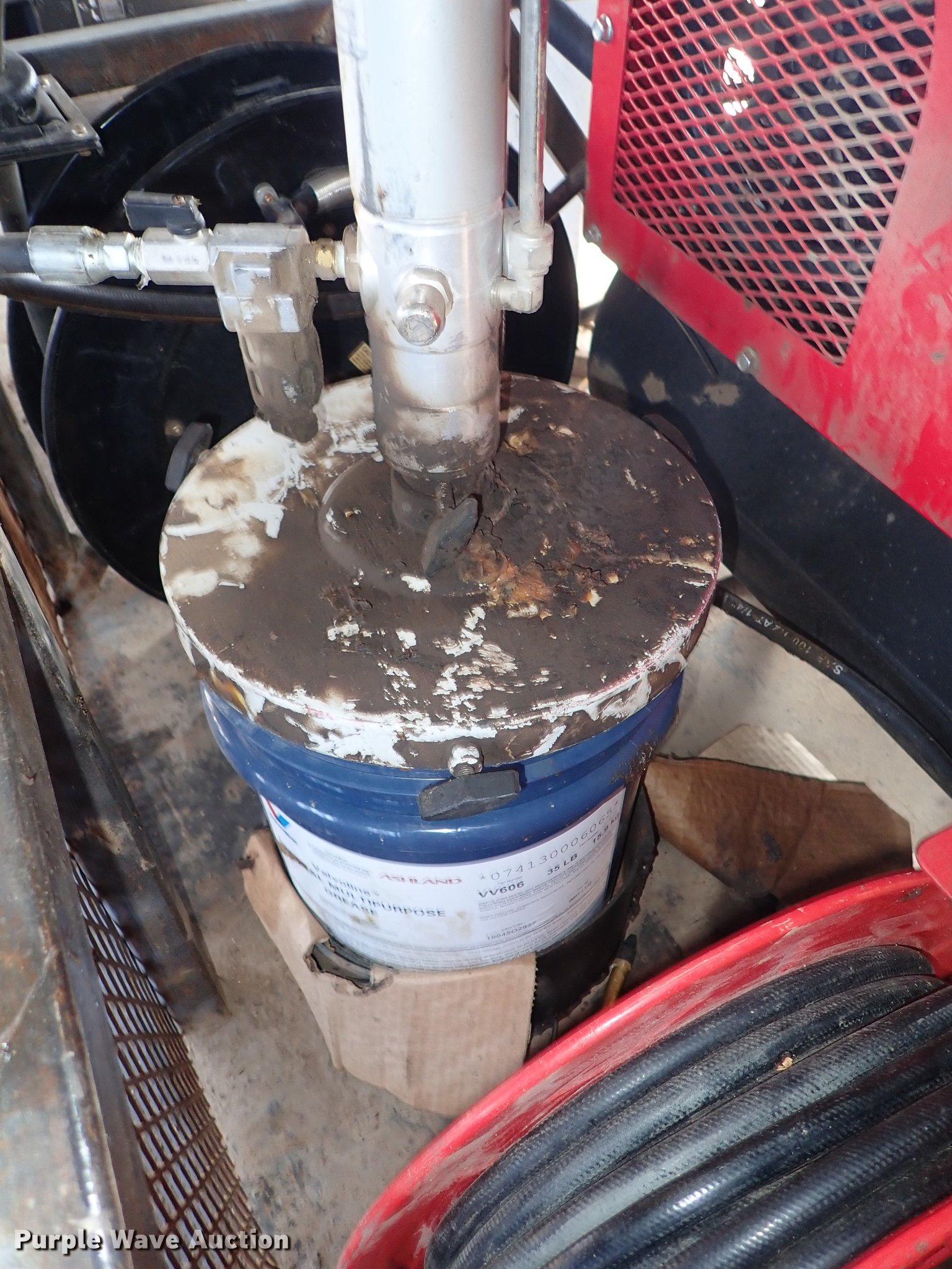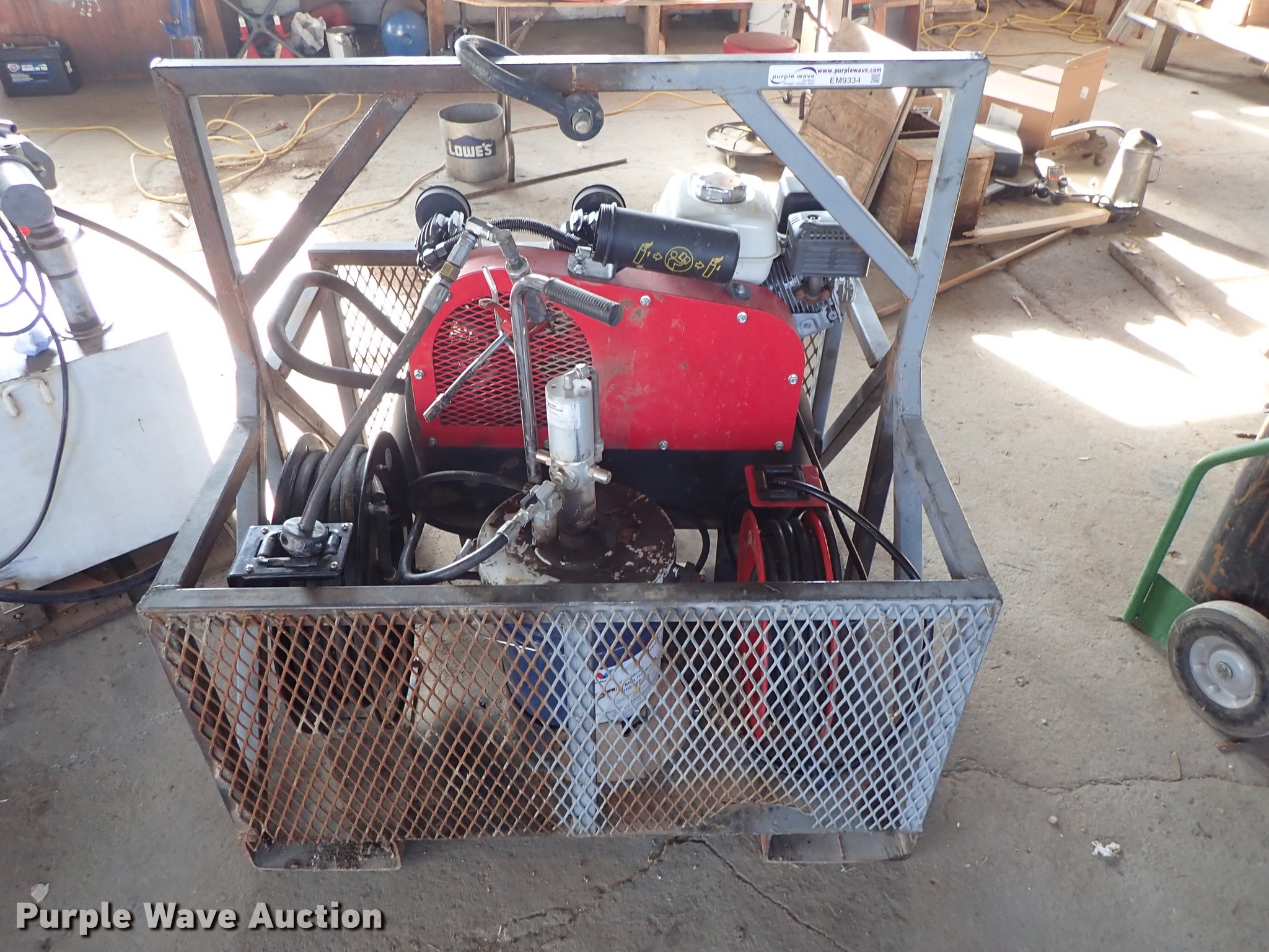 Purple Wave is selling a used Fuel and Lube in Kansas. This item is a Air and grease service unit with the following: Air compressor, Honda gas engine, Hose, Reel, Grease pump, Hose, Reel, Grease, Steel basket, 45" x 38"