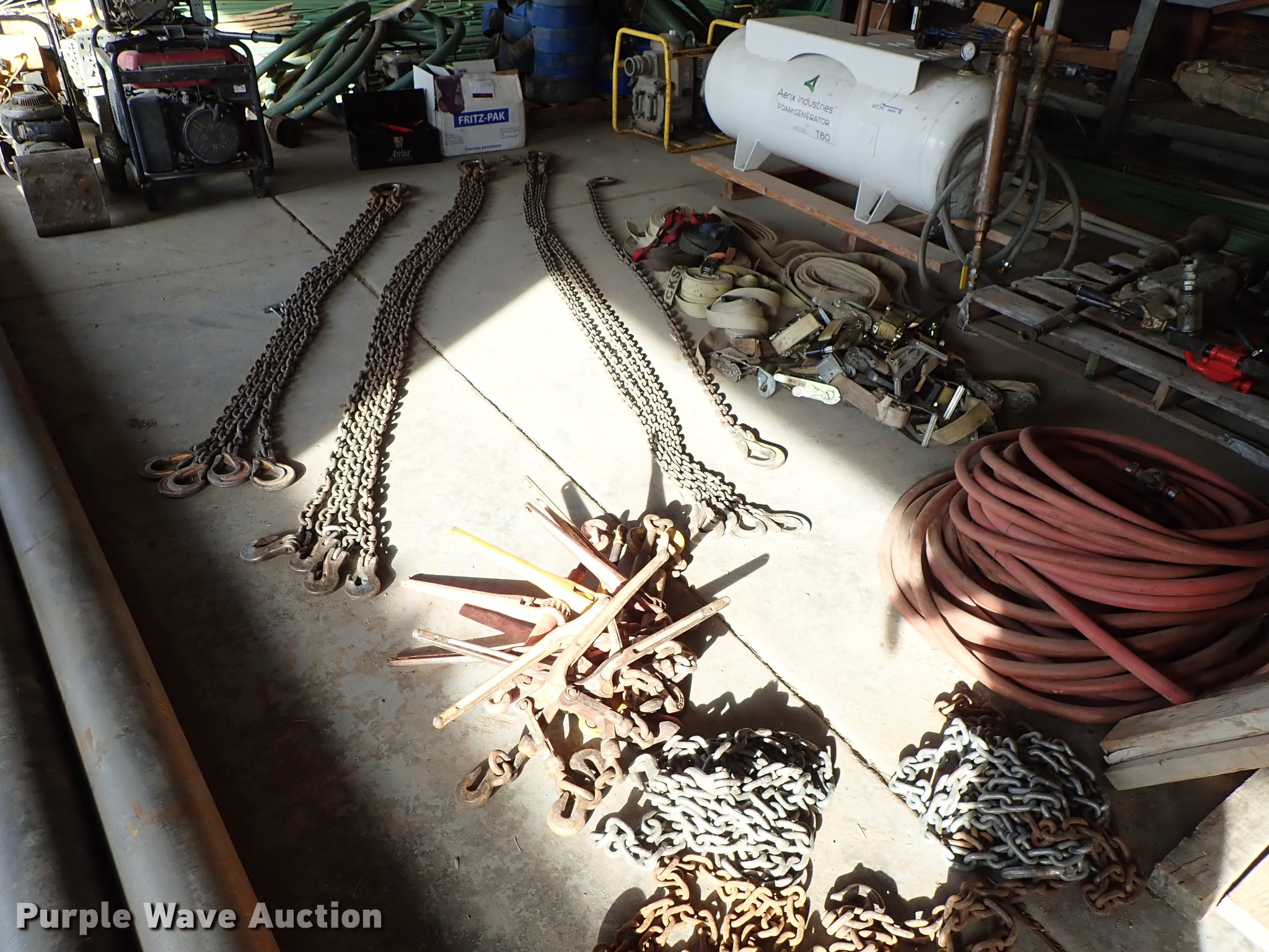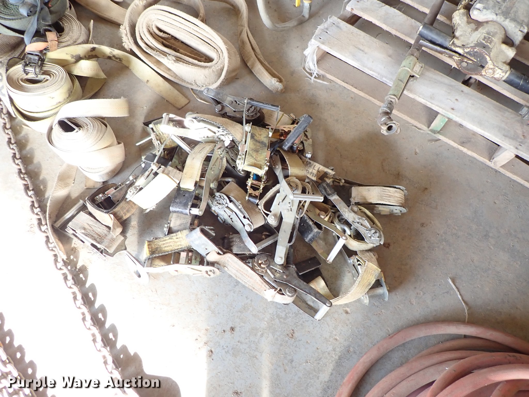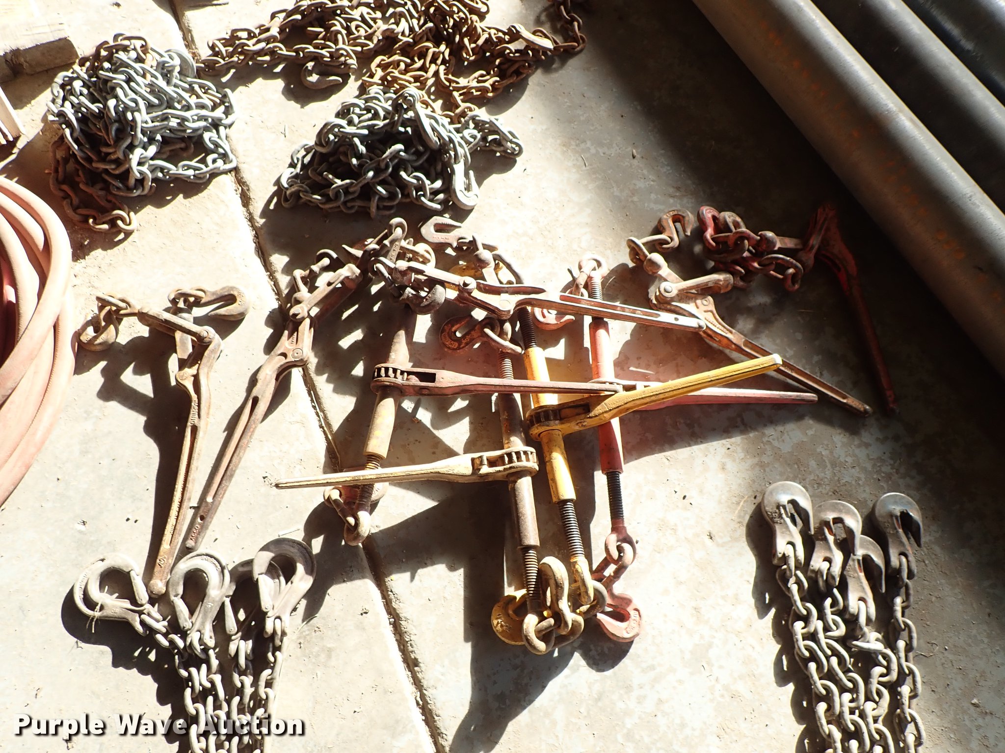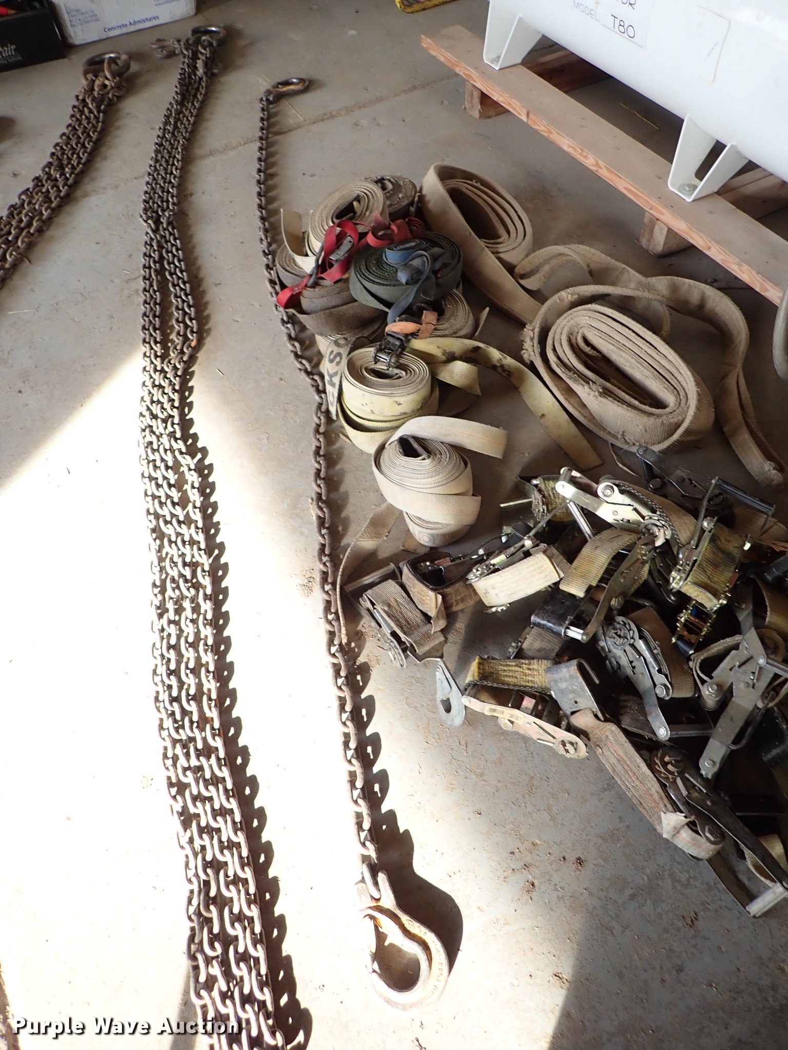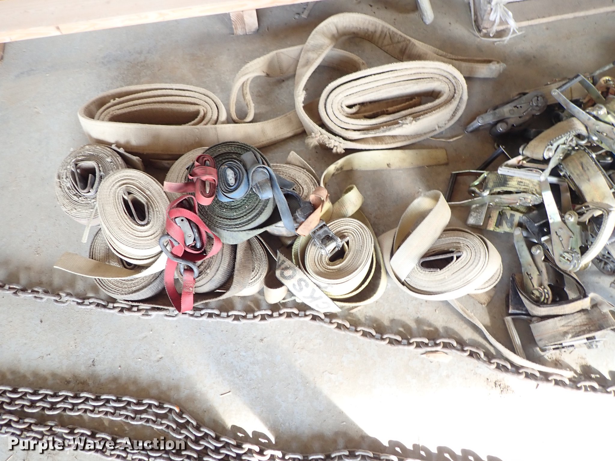 Purple Wave is selling a used Tools in Kansas. This item is a Tools with the following: (3) three-way chains, Log chain with hook, Approx. 15 ratchet straps, Chokers, (8) binders, Approx. 10 log chains, Assorted lengths