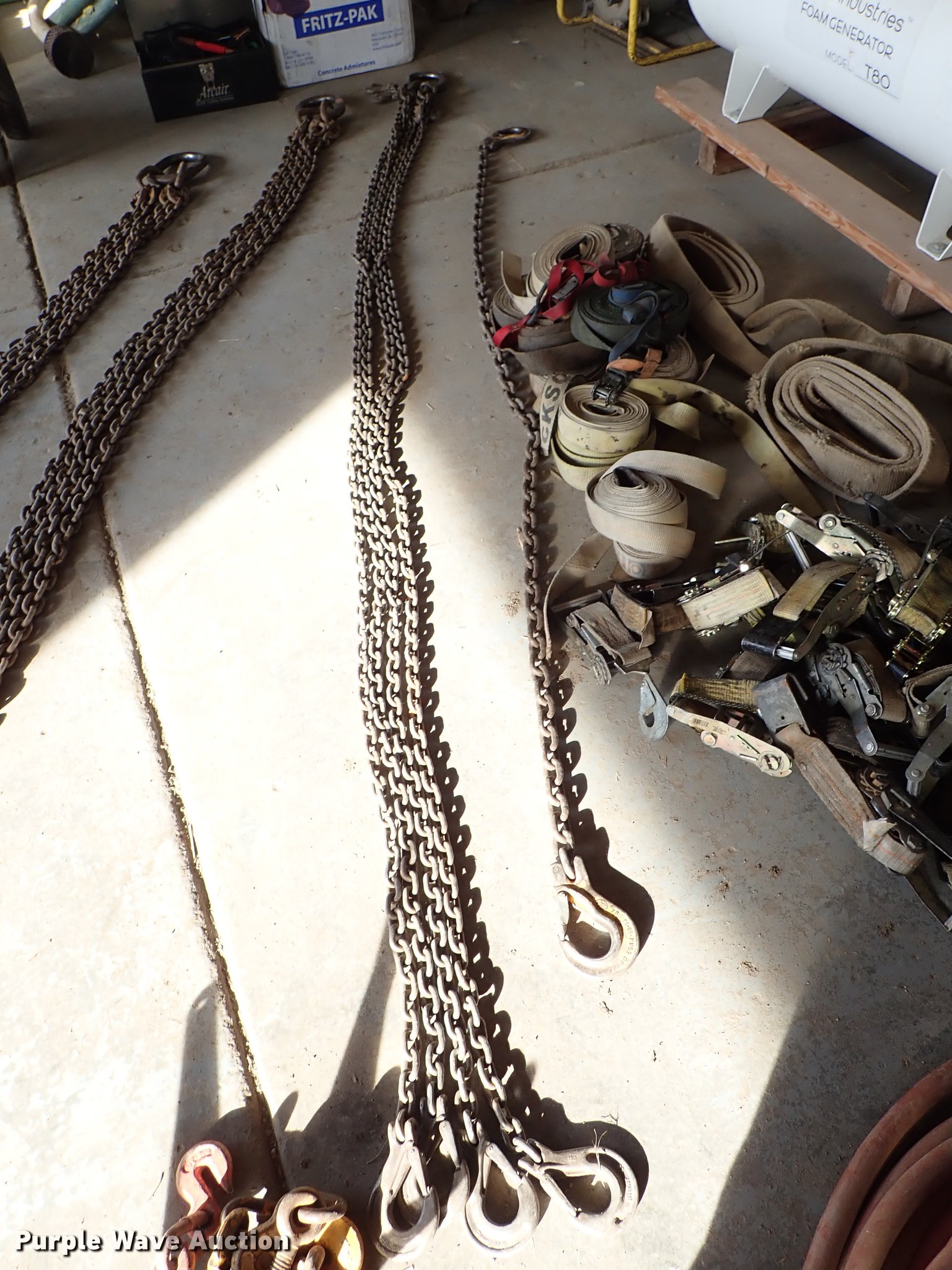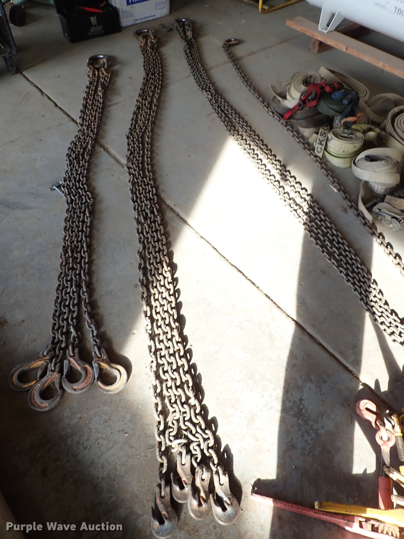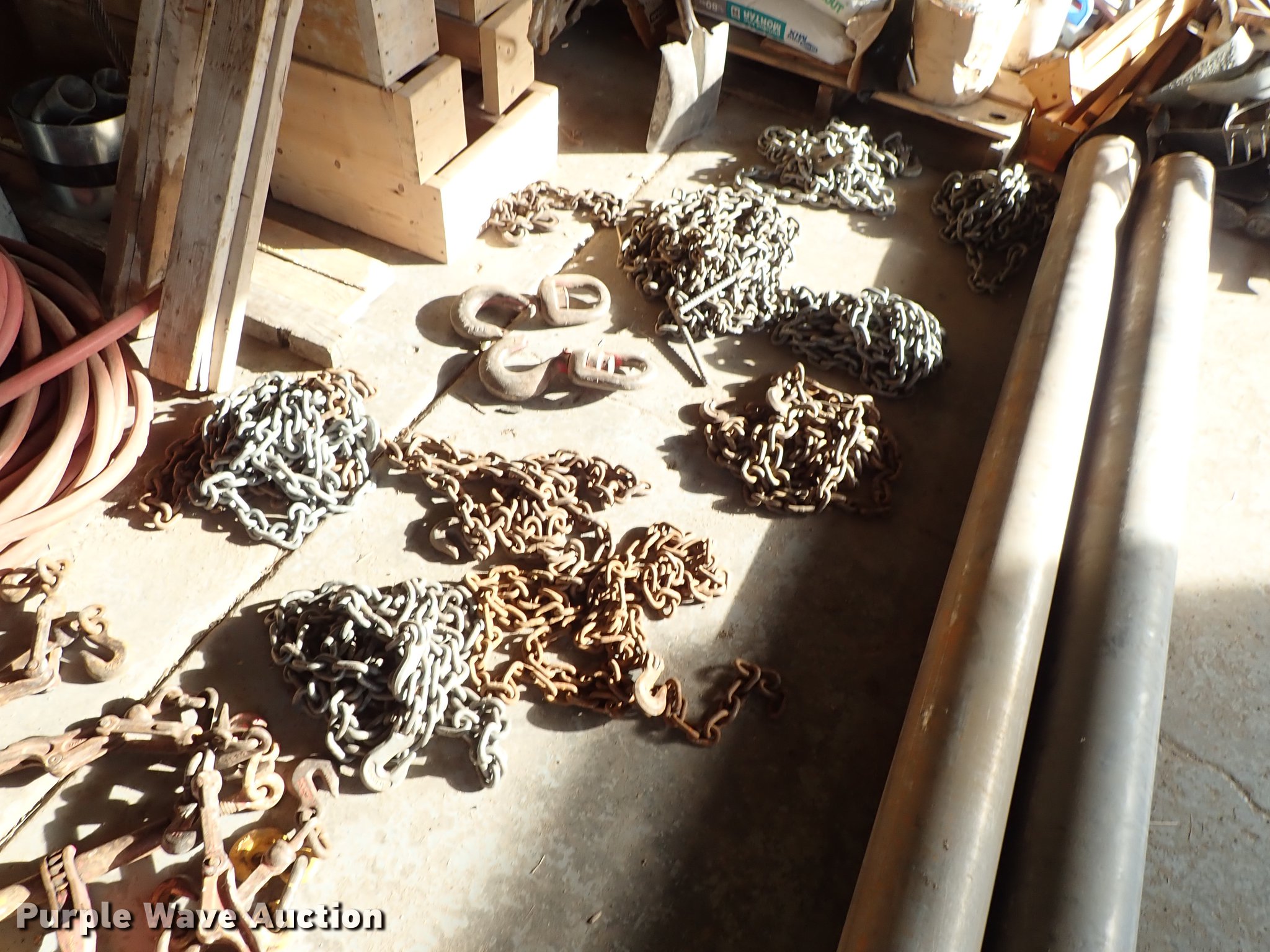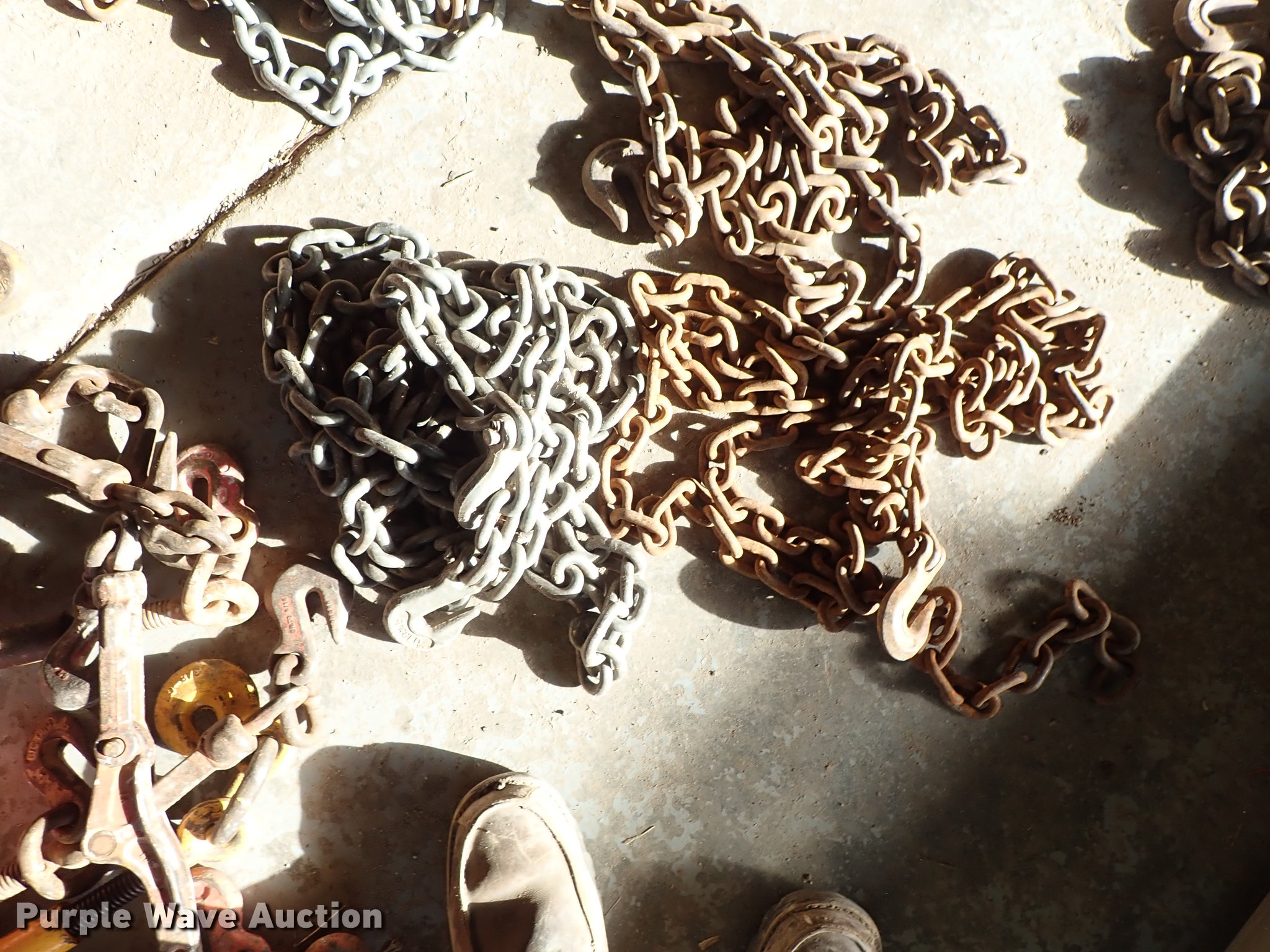 Purple Wave is selling a used Tools in Kansas. This item is a Tools with the following: (3) three-way chains, Log chain with hook, Approx. 15 ratchet straps, Chokers, (8) binders, Approx. 10 log chains, Assorted lengths