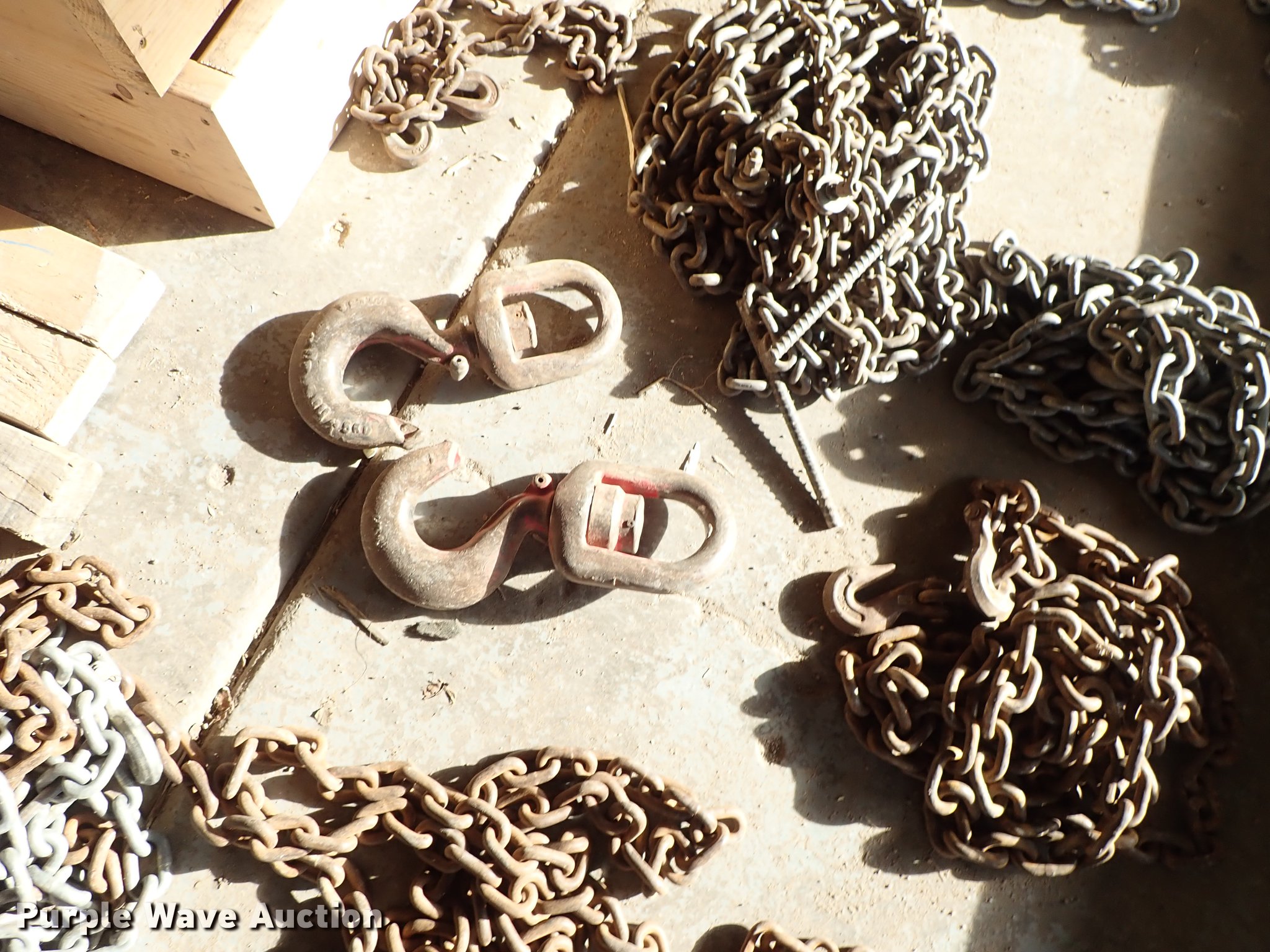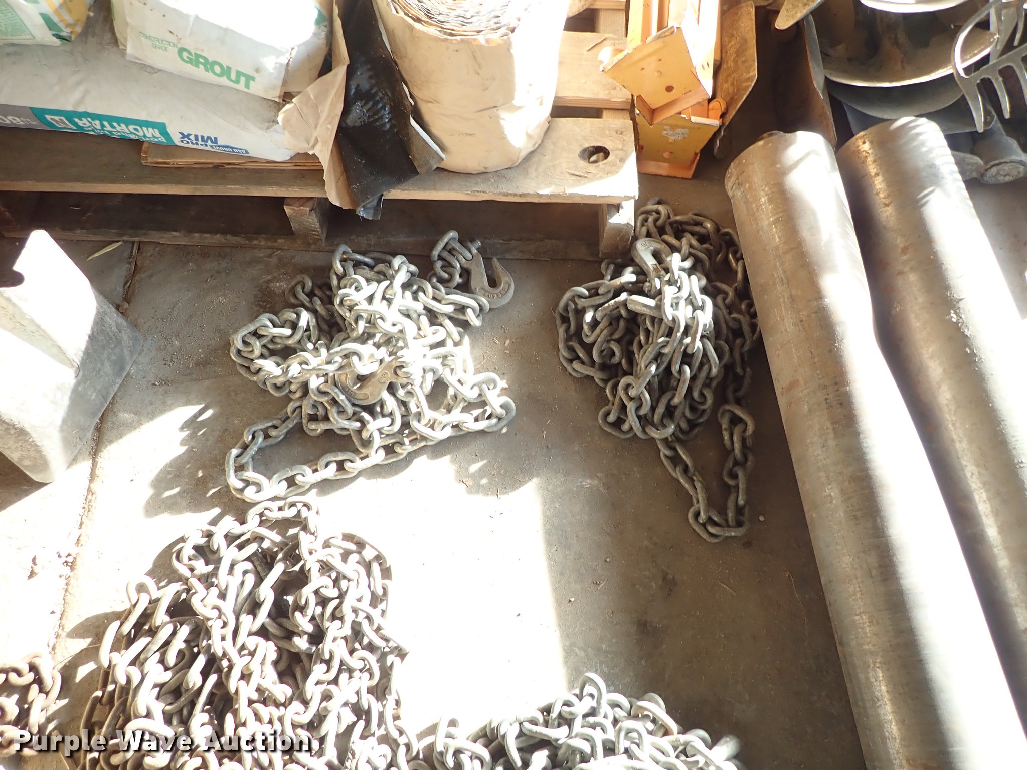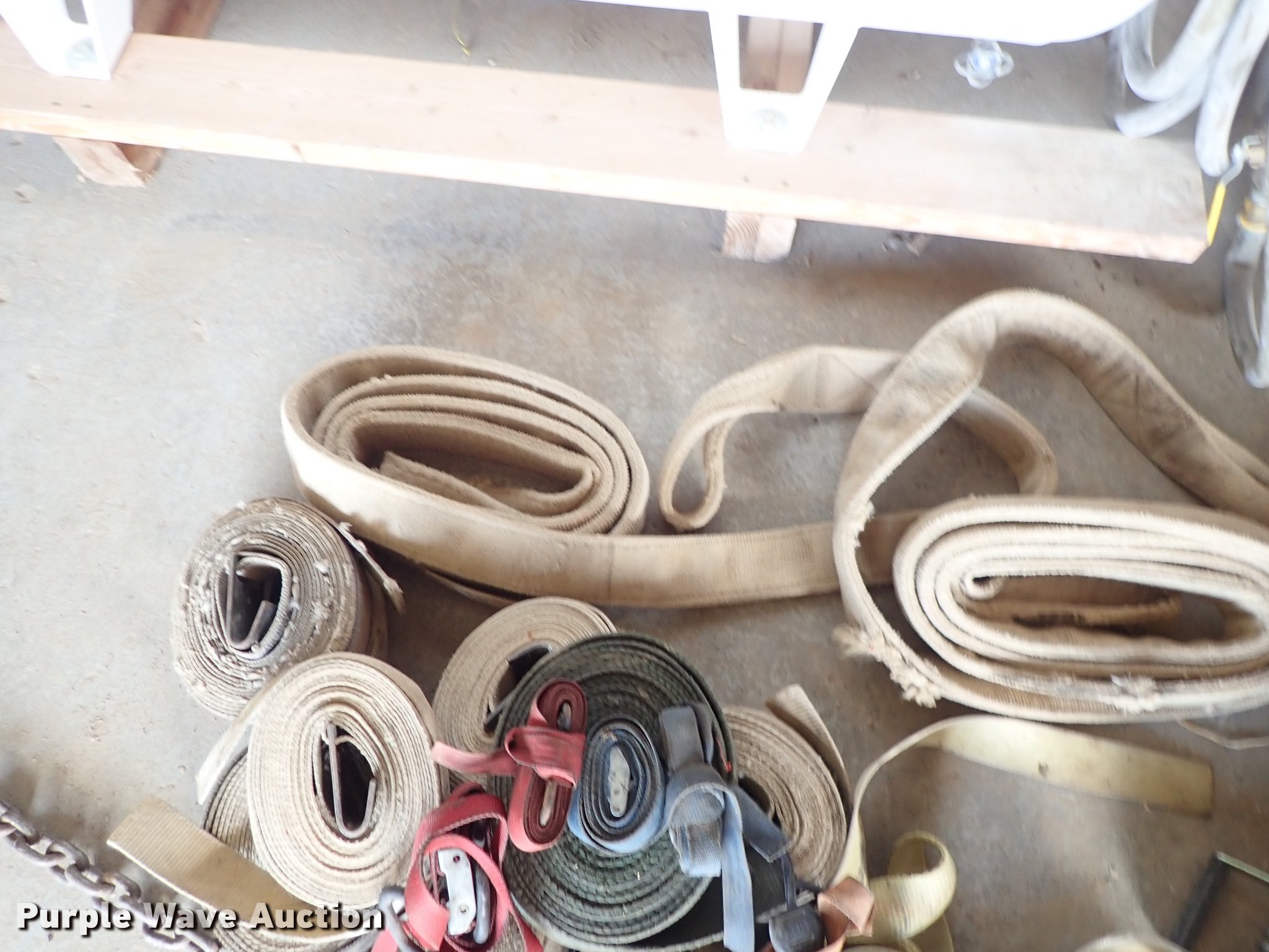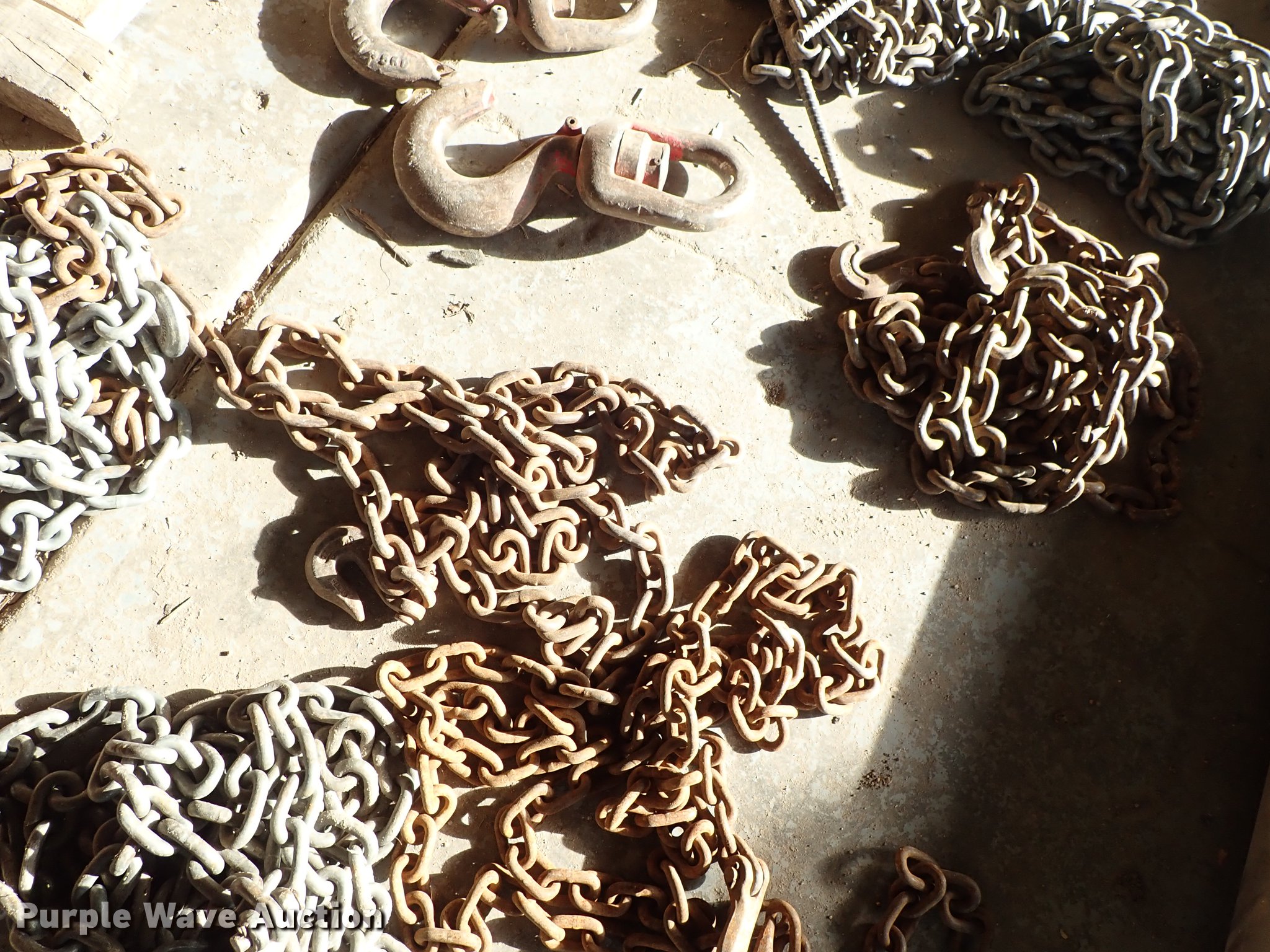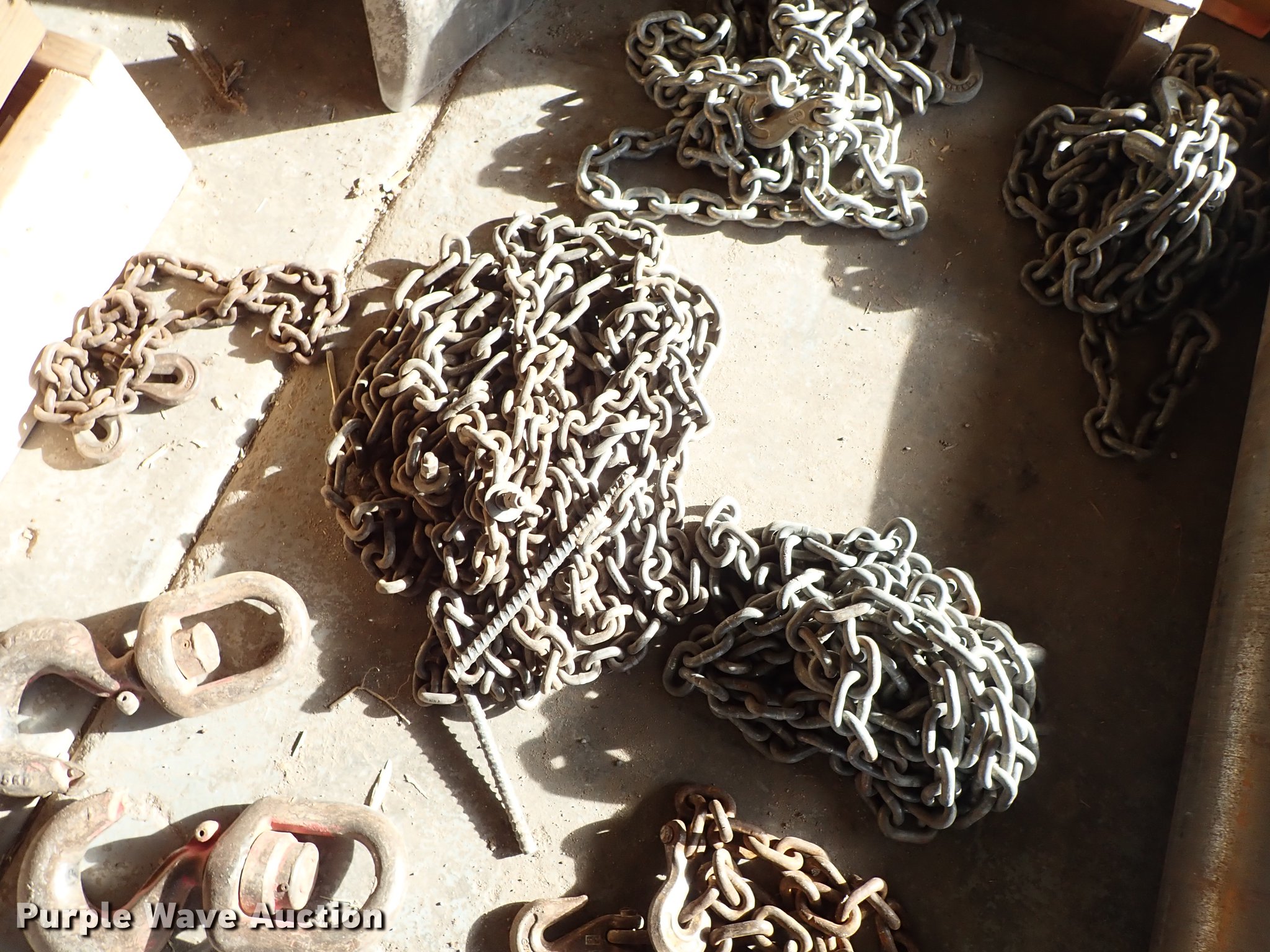 Purple Wave is selling a used Tools in Kansas. This item is a Tools with the following: (3) three-way chains, Log chain with hook, Approx. 15 ratchet straps, Chokers, (8) binders, Approx. 10 log chains, Assorted lengths