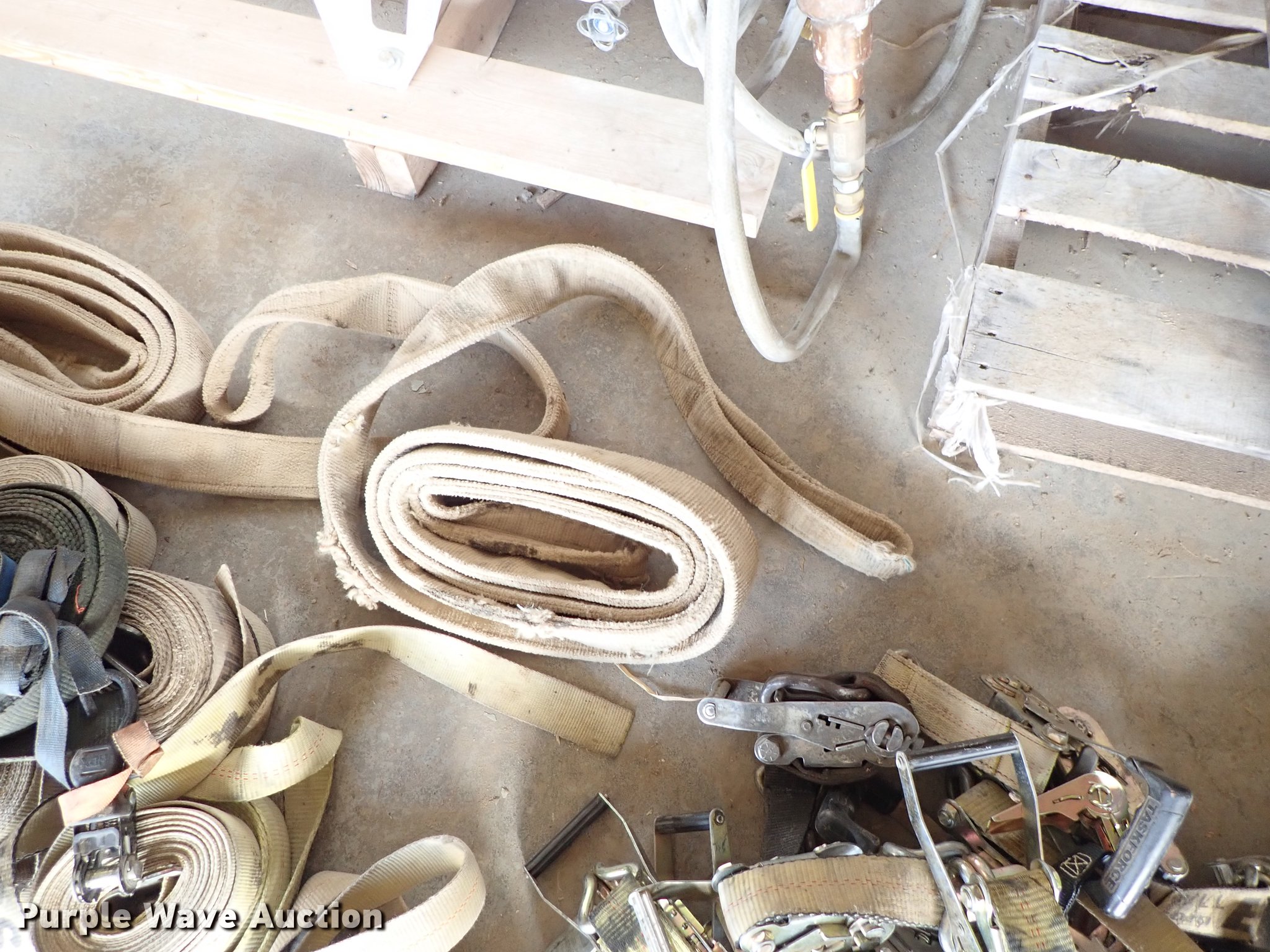 Tools. (3) three-way chains, Log chain with hook, Approx. 15 ratchet straps, Chokers, (8) binders, Approx. 10 log chains Assorted lengths. HWA Davis - Open inspection Dec. 17. 535 N Meridian Rd. Newton, KS 67114