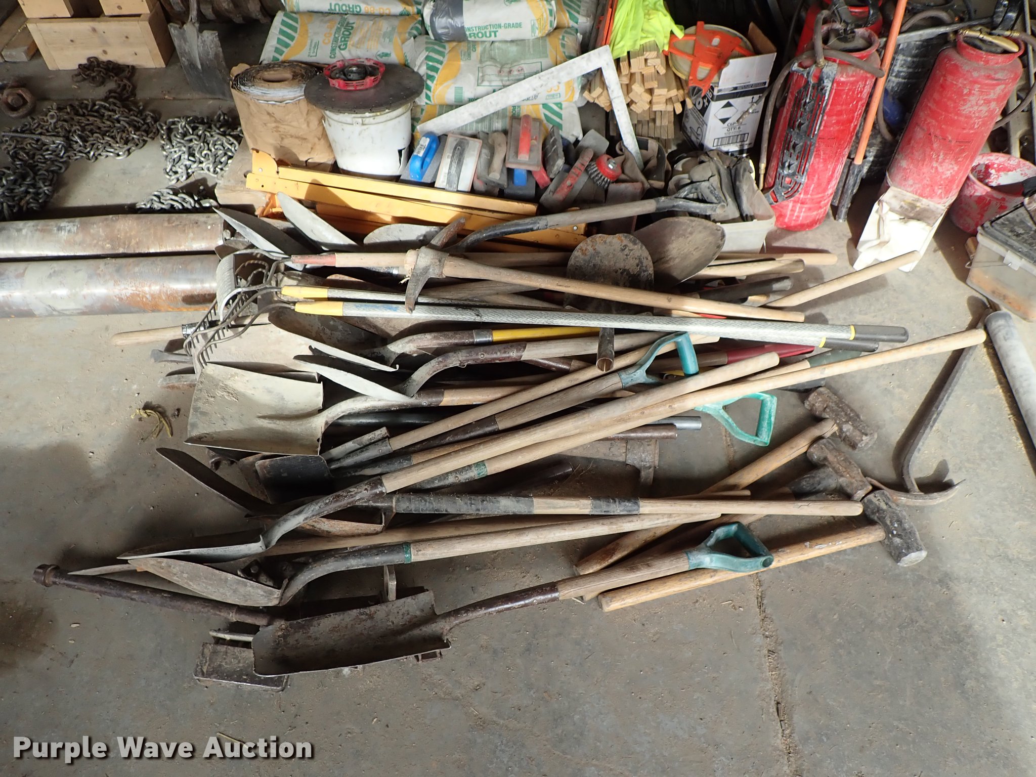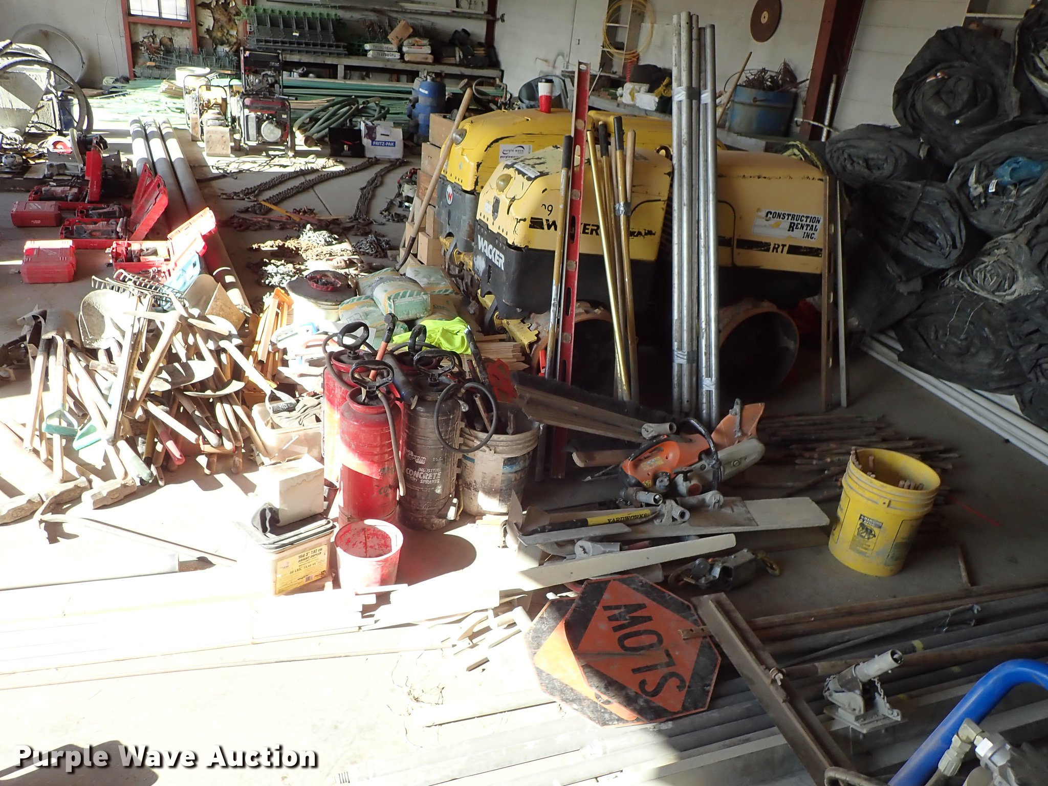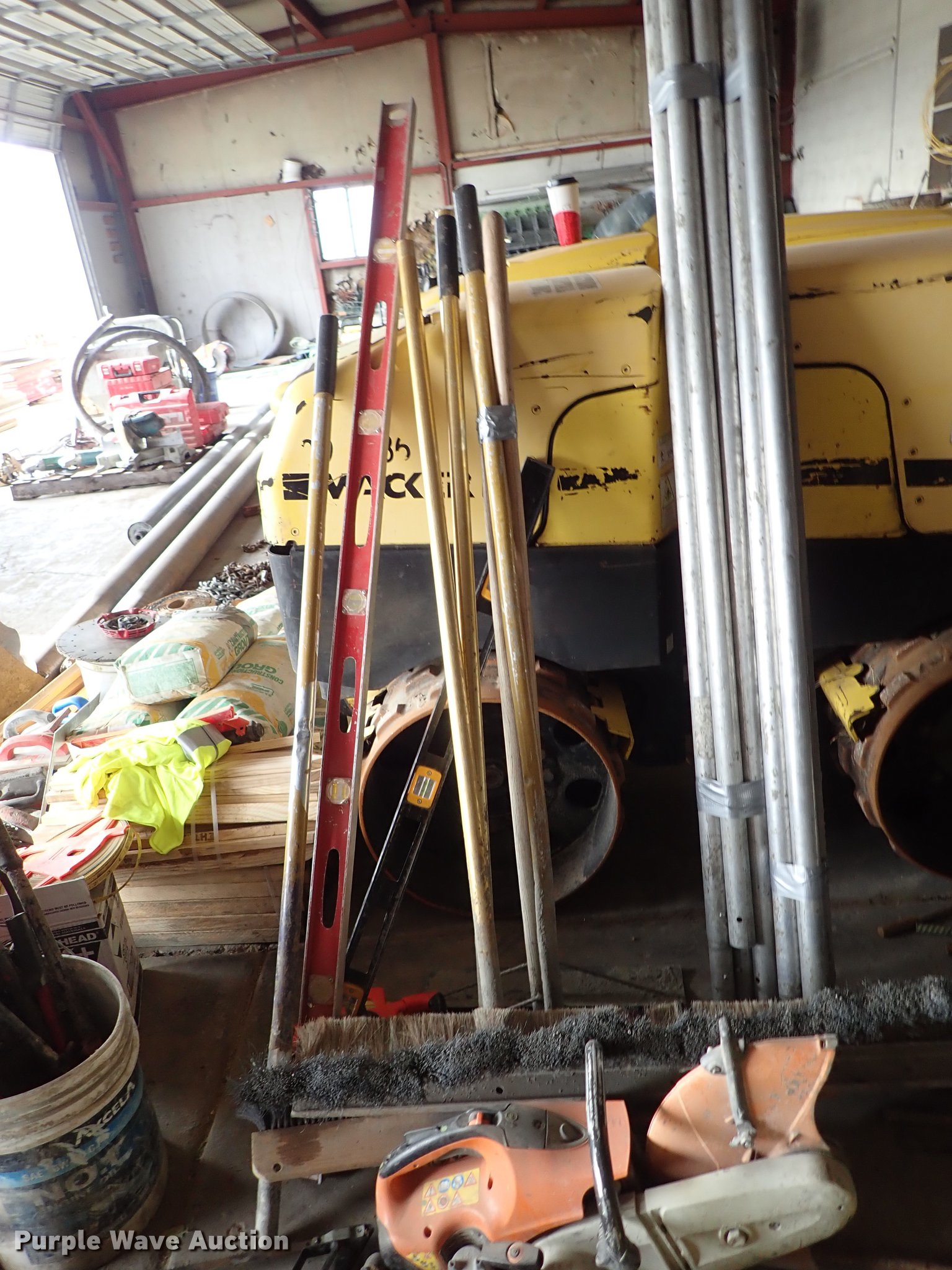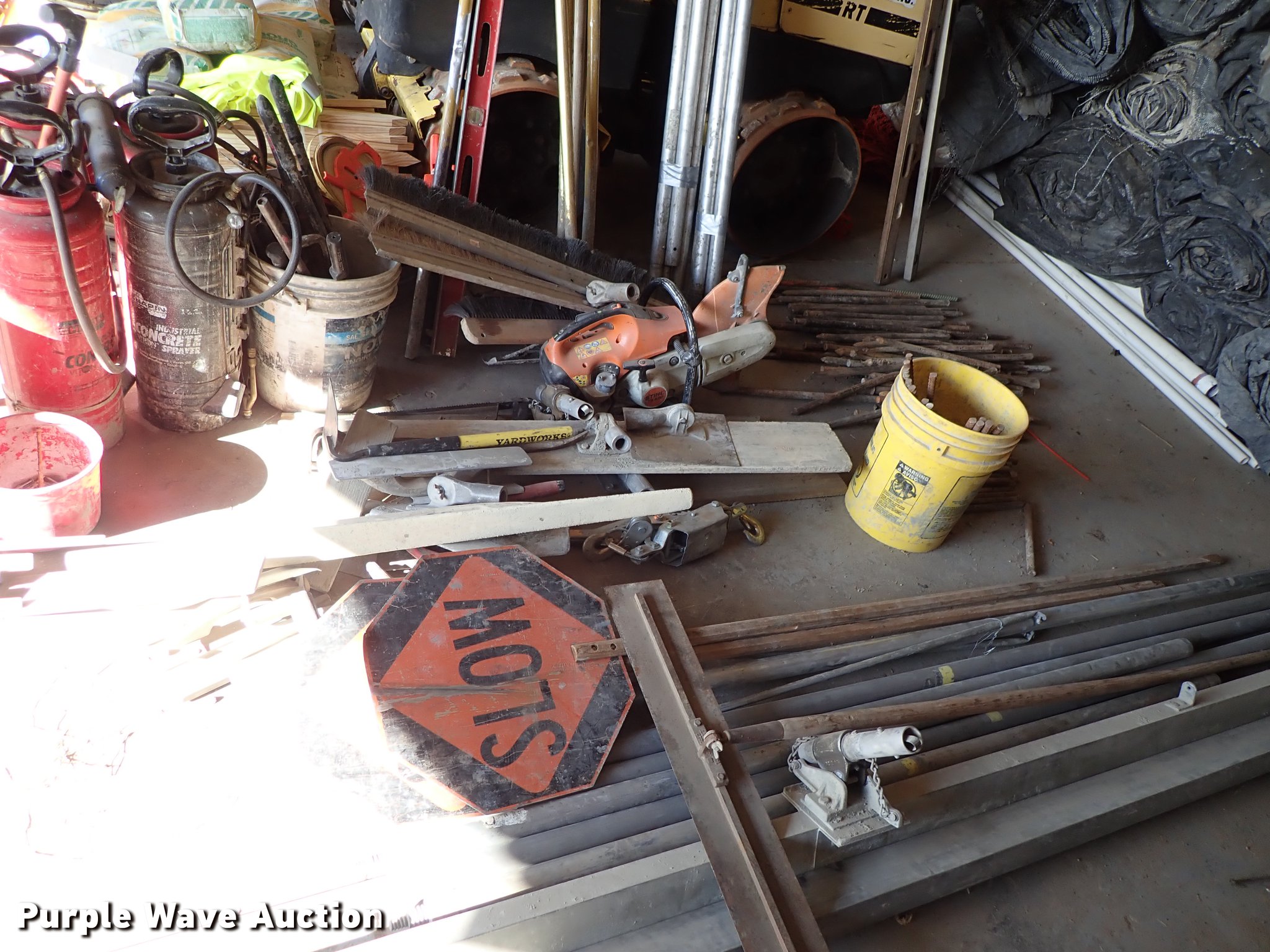 Purple Wave is selling a used Tools in Kansas. This item is a Tools with the following: Shovels, Rakes, Sledge Hammers, Concrete rub brick, Levels, Squares, Aluminum concrete finishing tools, Cut-off saw, Non-operational, Form stakes, Finishing brushes, Floats, Aluminum screeds, Sprayers, Stop sign, Slow sign, Pneumatic gun, Grease and caulking guns, String lines, Tapes, Welding masks, Surveying tripods, (4) ladders and more