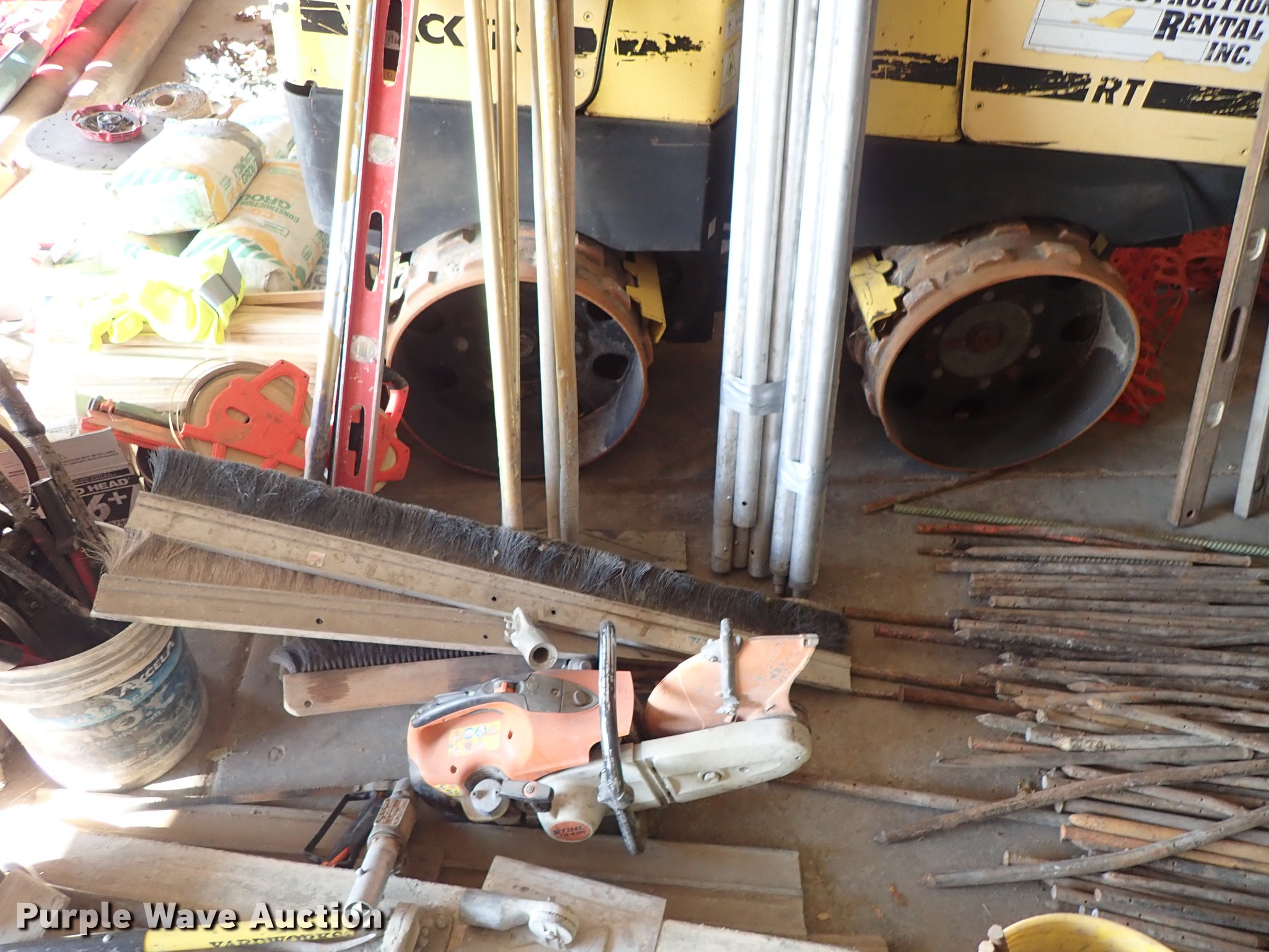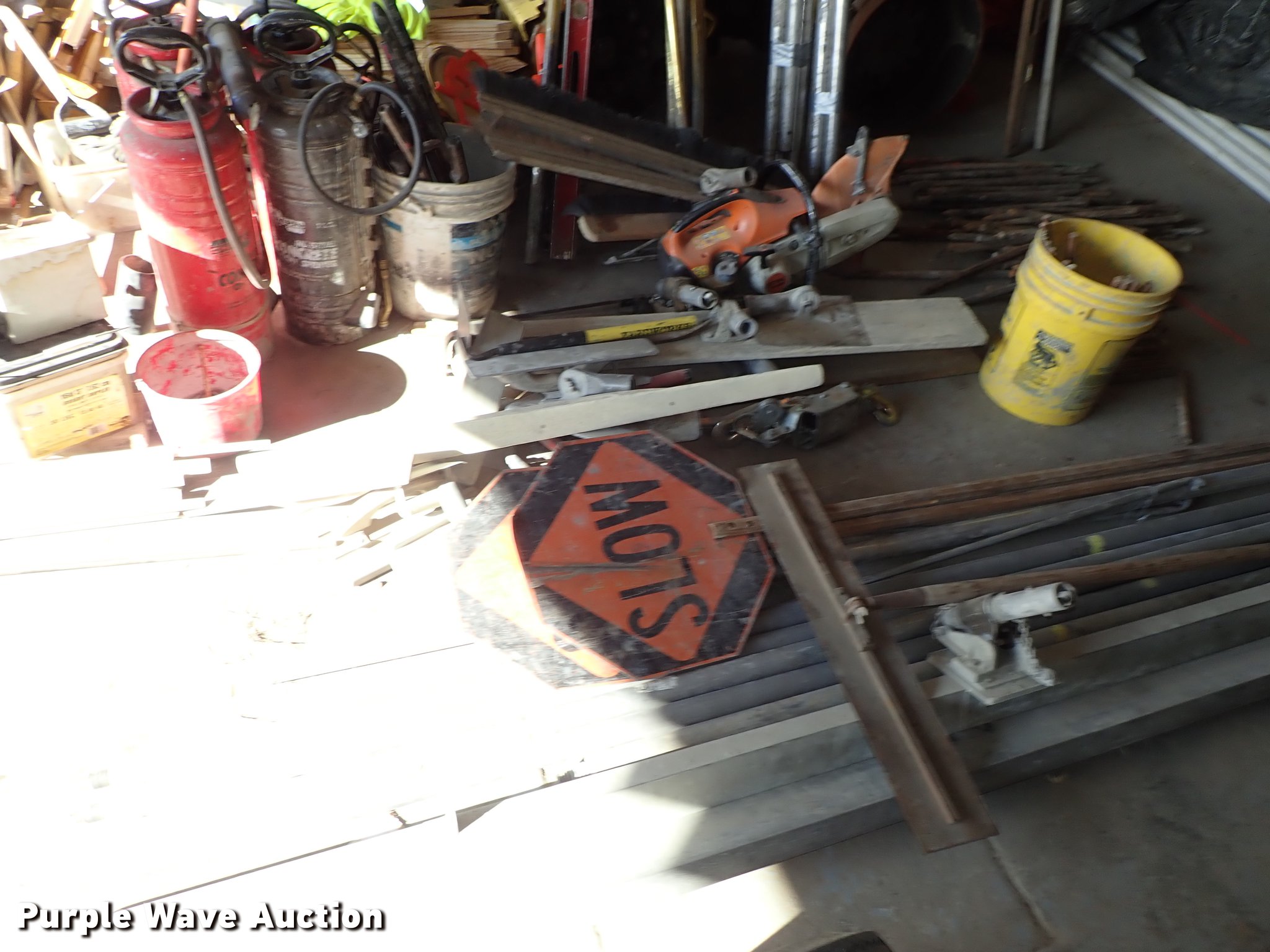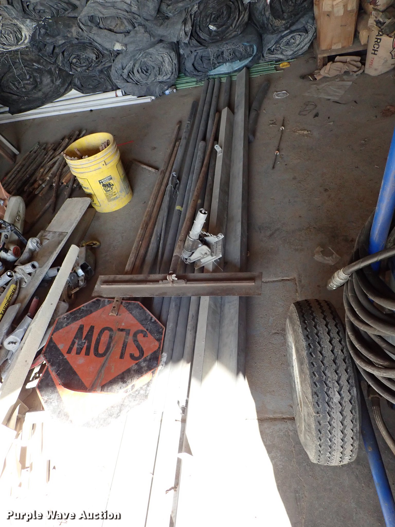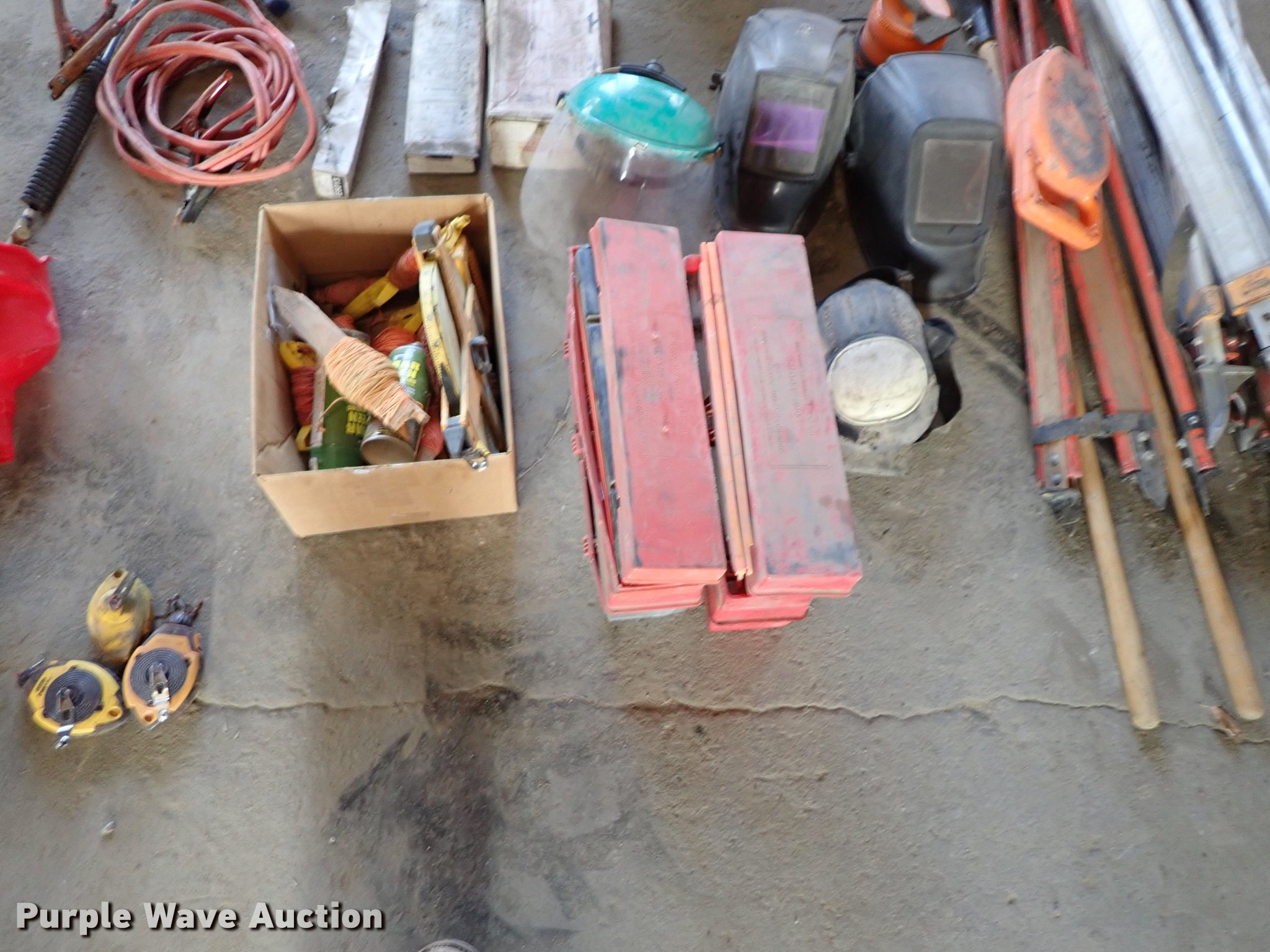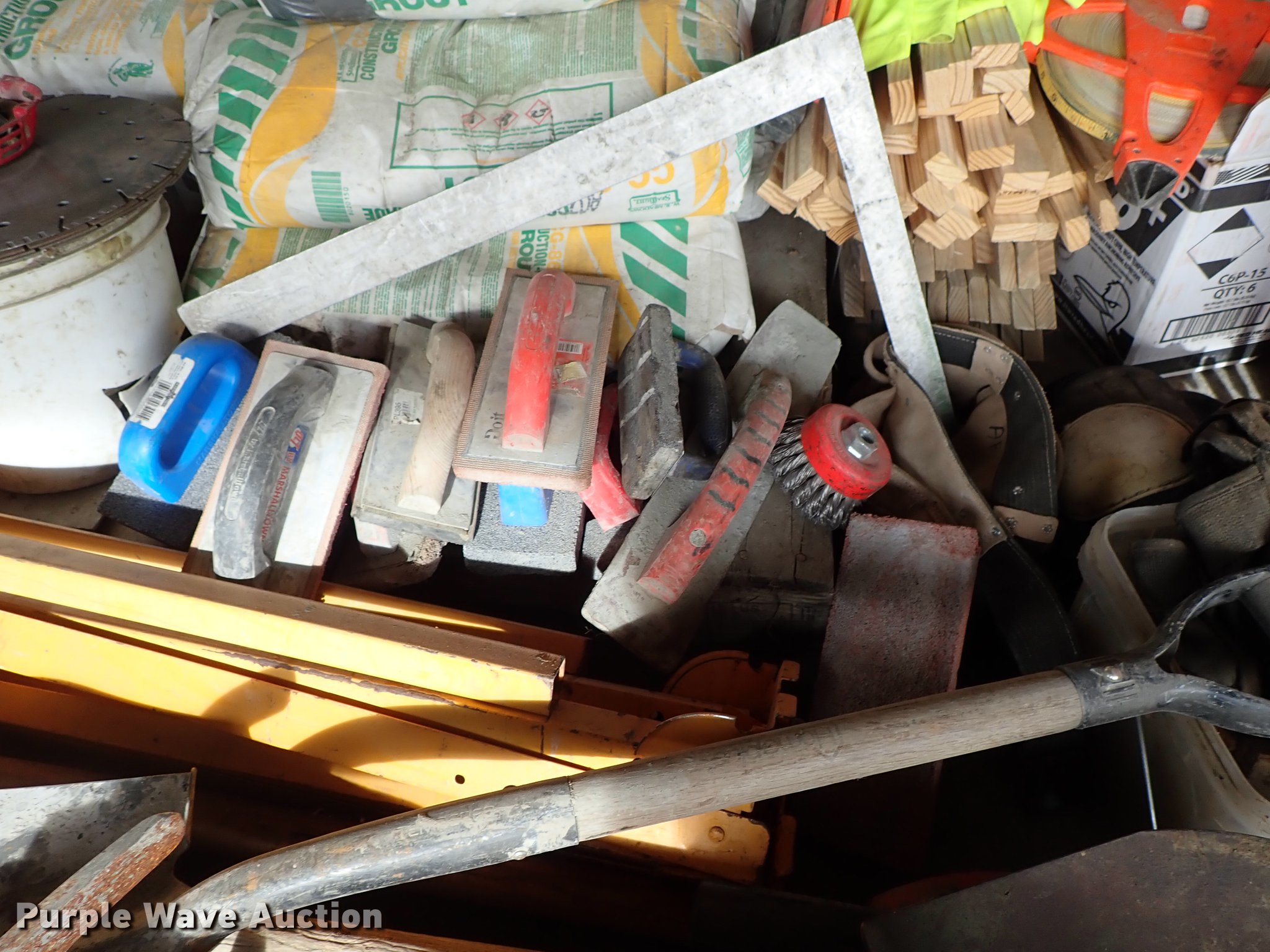 Purple Wave is selling a used Tools in Kansas. This item is a Tools with the following: Shovels, Rakes, Sledge Hammers, Concrete rub brick, Levels, Squares, Aluminum concrete finishing tools, Cut-off saw, Non-operational, Form stakes, Finishing brushes, Floats, Aluminum screeds, Sprayers, Stop sign, Slow sign, Pneumatic gun, Grease and caulking guns, String lines, Tapes, Welding masks, Surveying tripods, (4) ladders and more