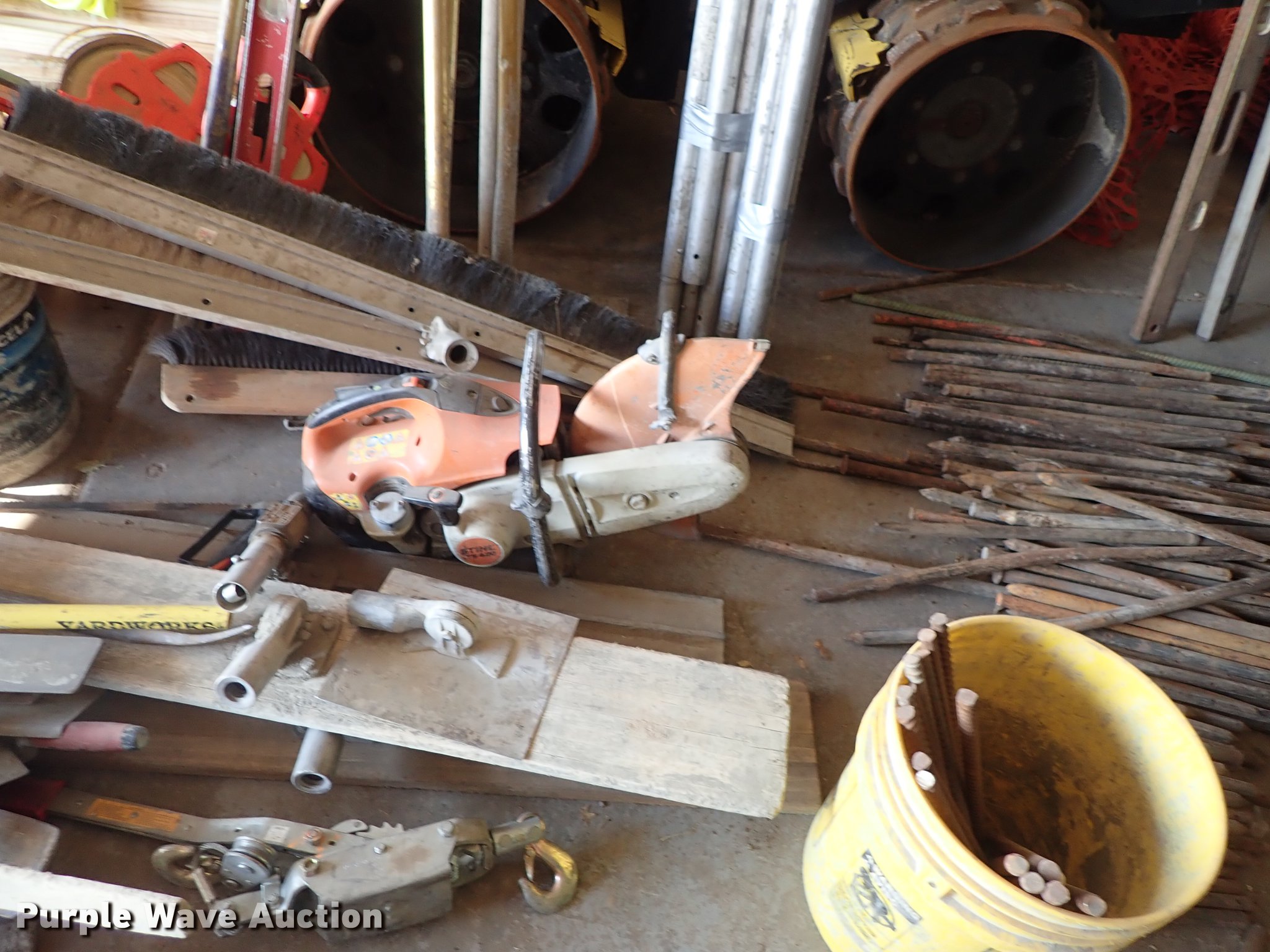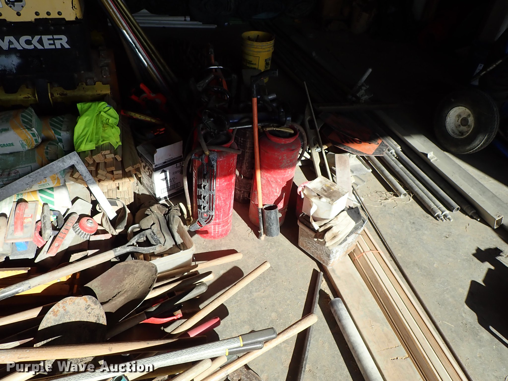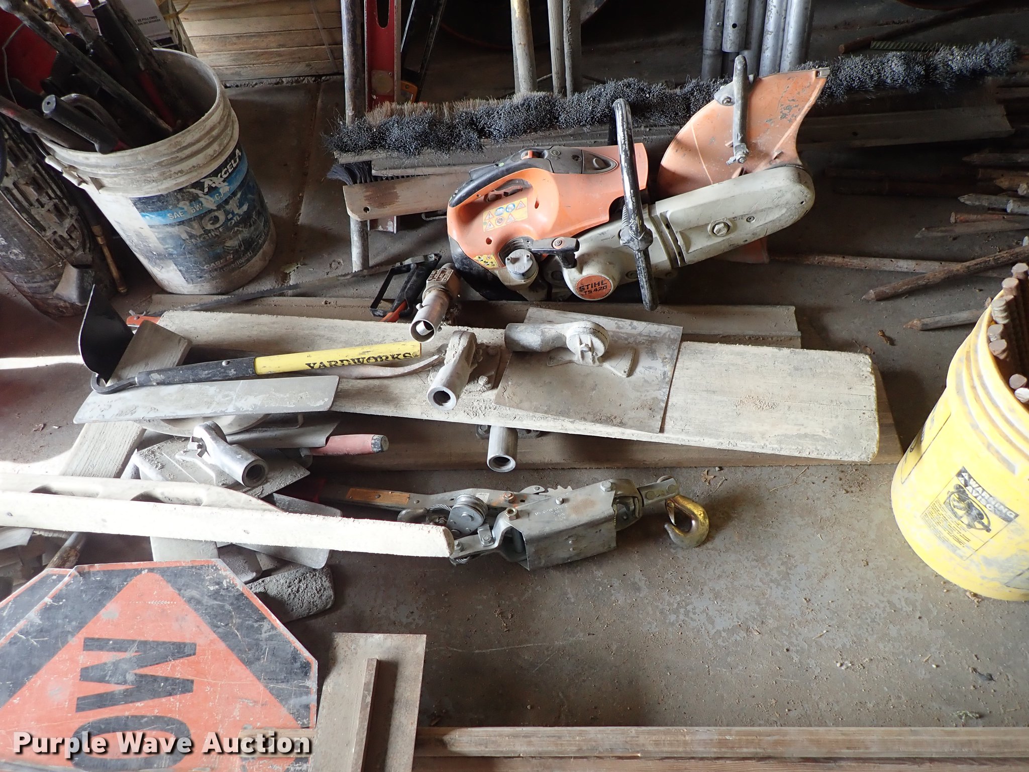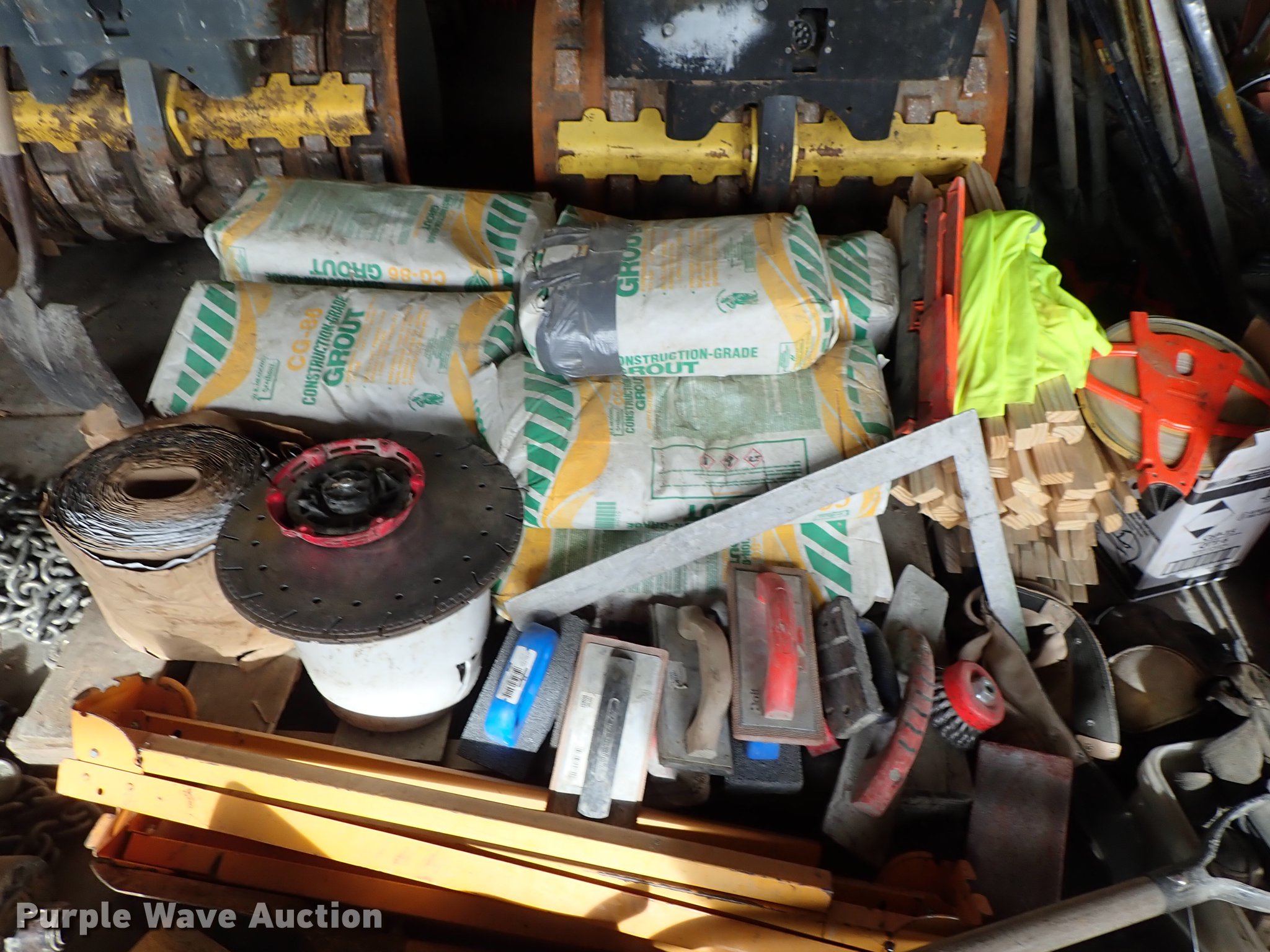 Purple Wave is selling a used Tools in Kansas. This item is a Tools with the following: Shovels, Rakes, Sledge Hammers, Concrete rub brick, Levels, Squares, Aluminum concrete finishing tools, Cut-off saw, Non-operational, Form stakes, Finishing brushes, Floats, Aluminum screeds, Sprayers, Stop sign, Slow sign, Pneumatic gun, Grease and caulking guns, String lines, Tapes, Welding masks, Surveying tripods, (4) ladders and more