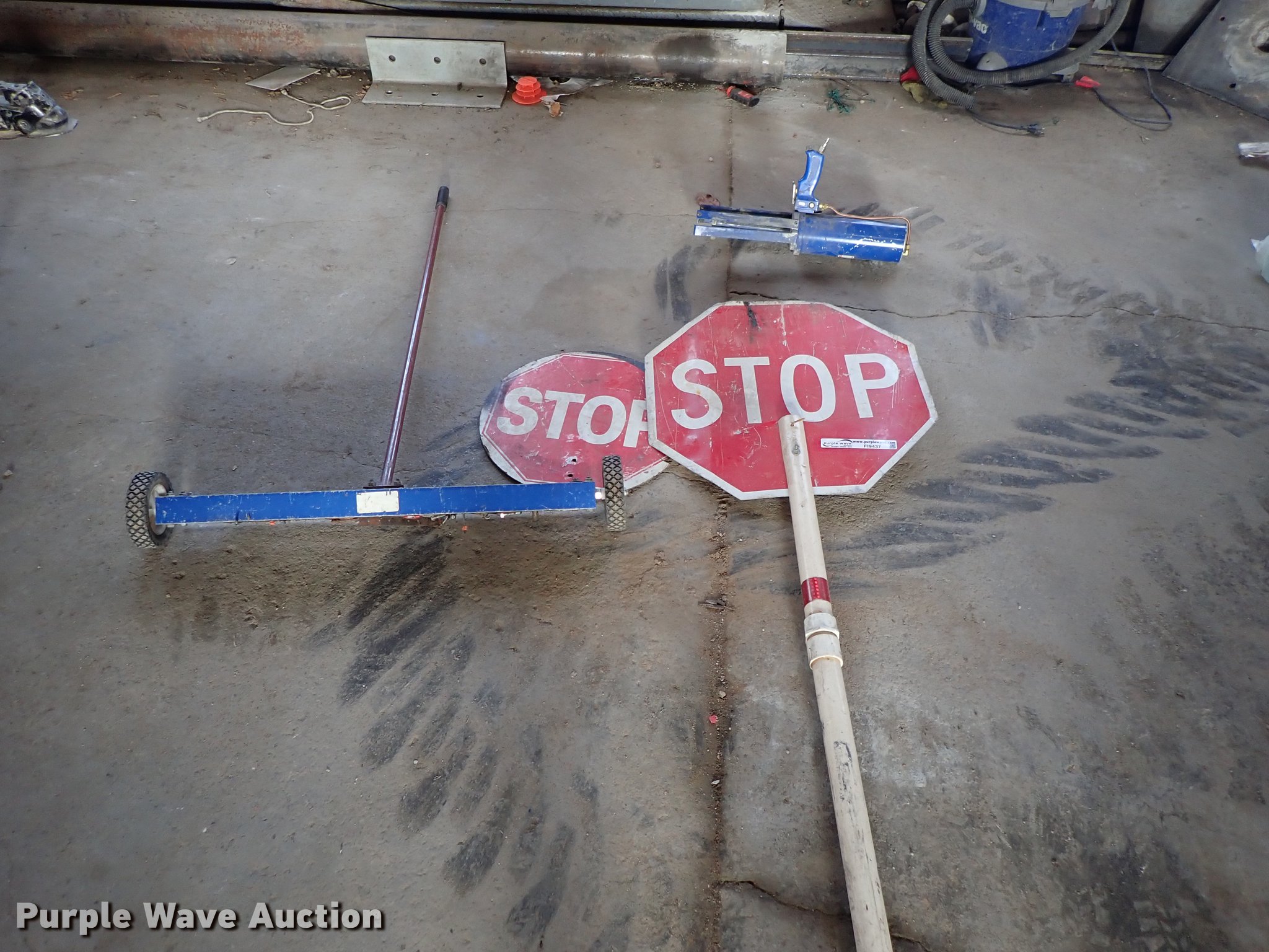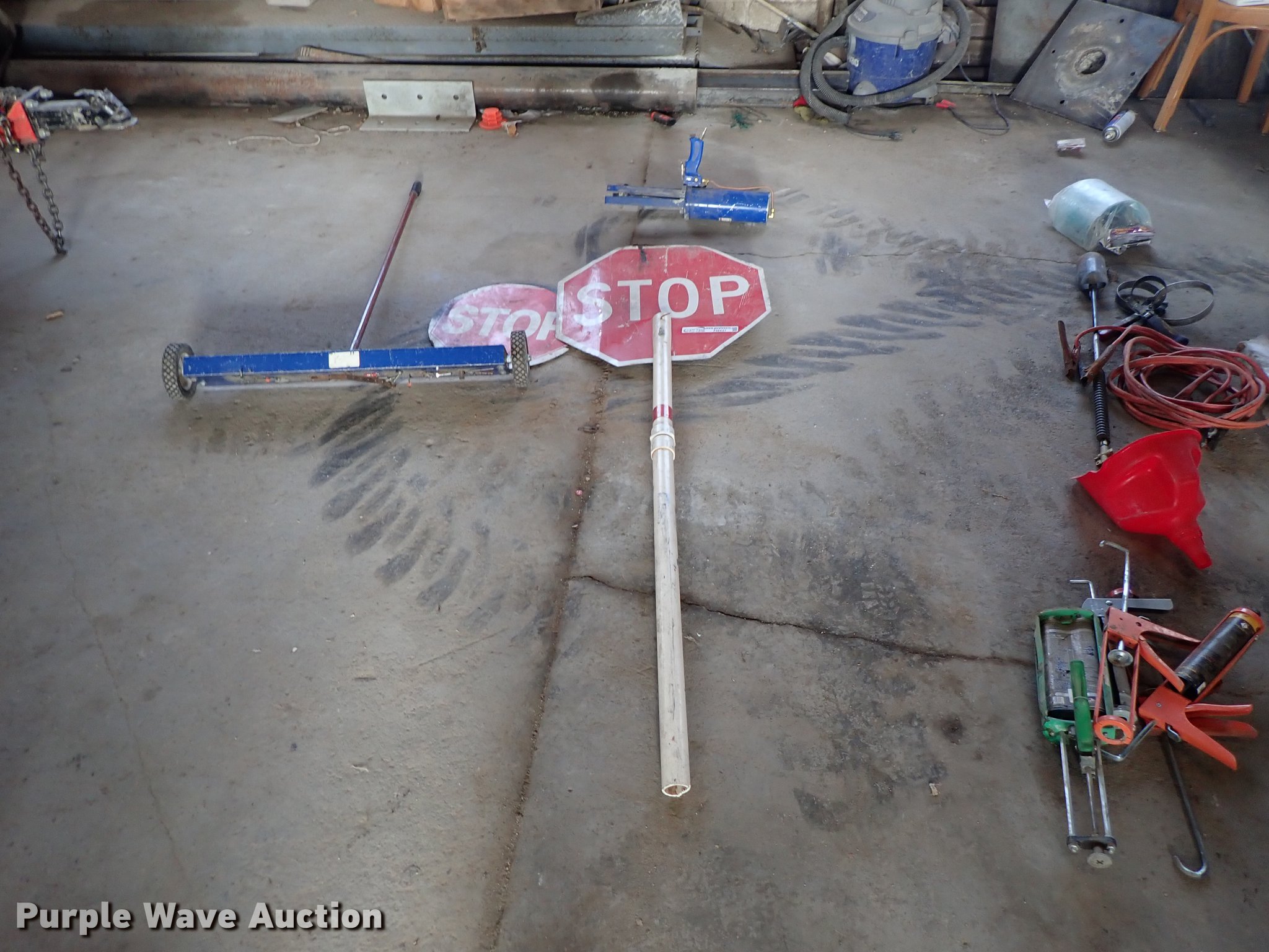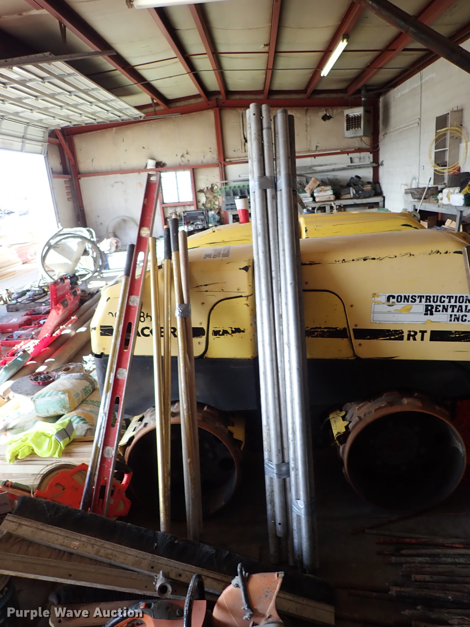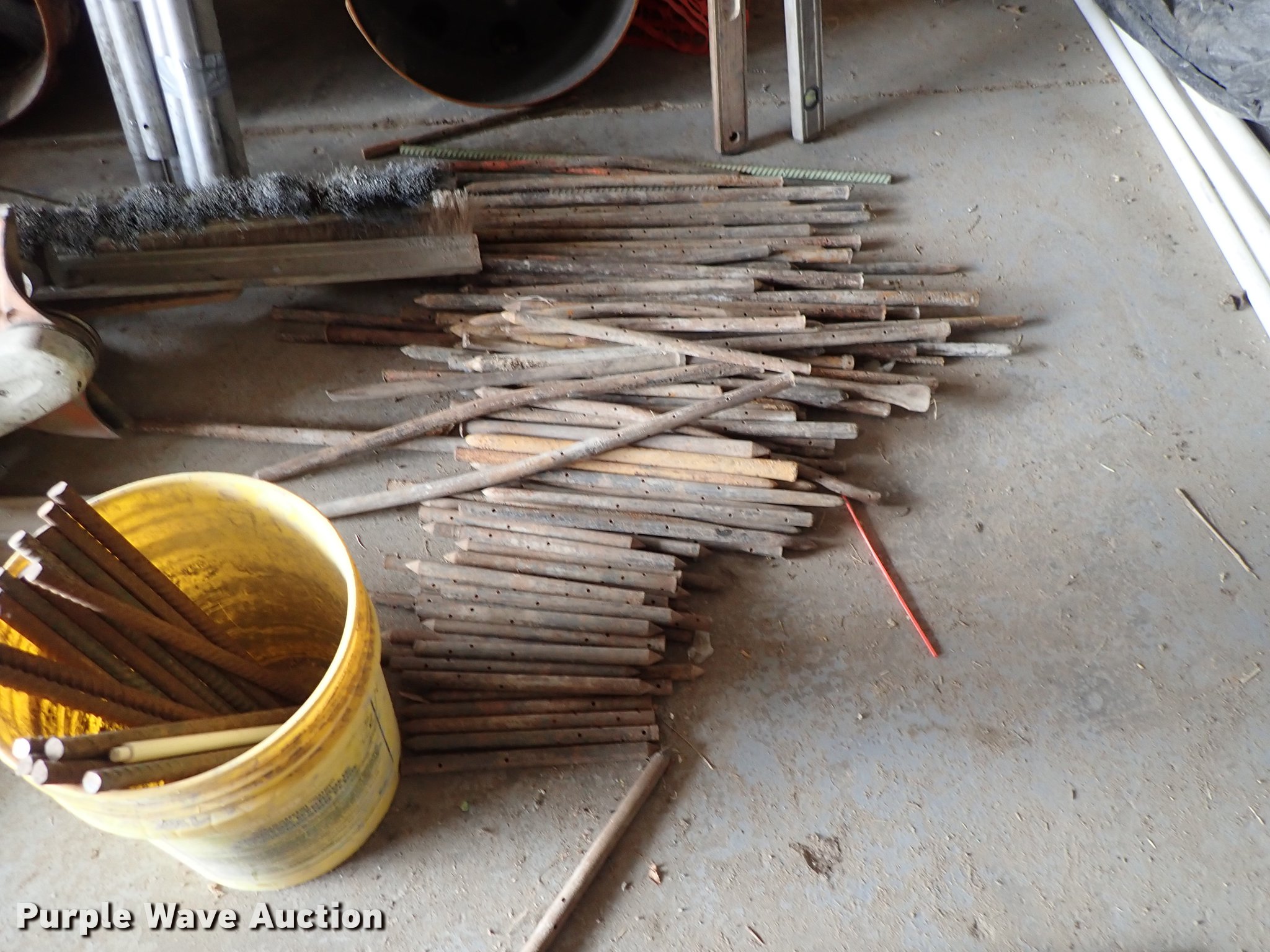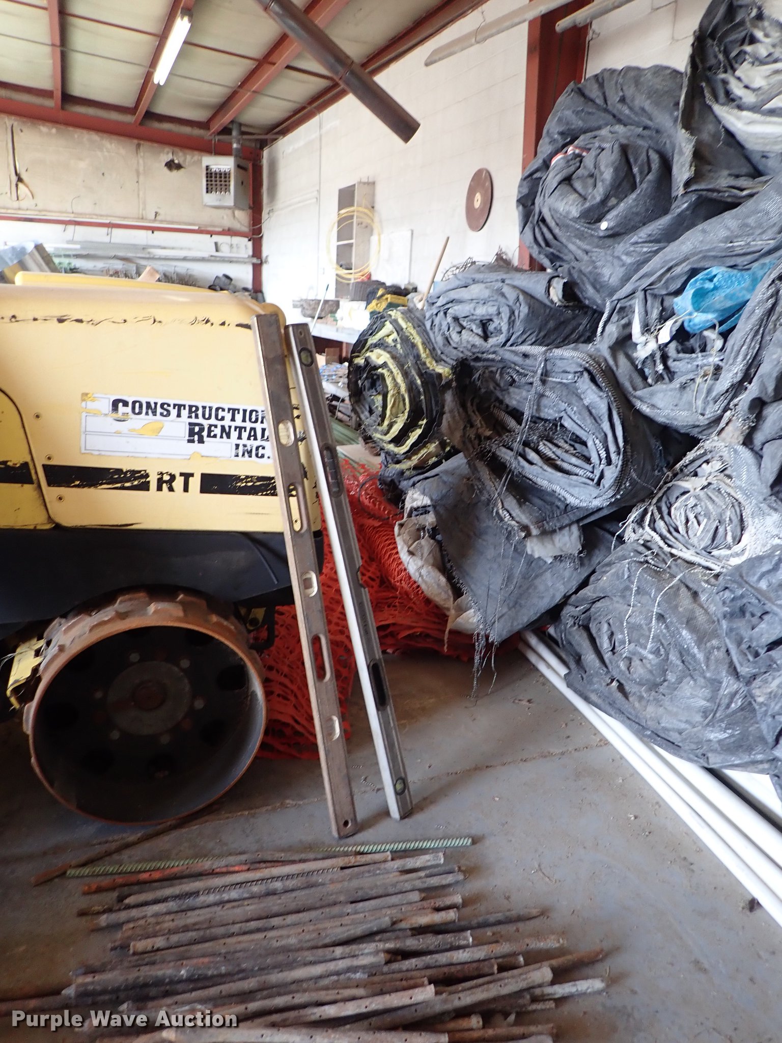Purple Wave is selling a used Tools in Kansas. This item is a Tools with the following: Shovels, Rakes, Sledge Hammers, Concrete rub brick, Levels, Squares, Aluminum concrete finishing tools, Cut-off saw, Non-operational, Form stakes, Finishing brushes, Floats, Aluminum screeds, Sprayers, Stop sign, Slow sign, Pneumatic gun, Grease and caulking guns, String lines, Tapes, Welding masks, Surveying tripods, (4) ladders and more