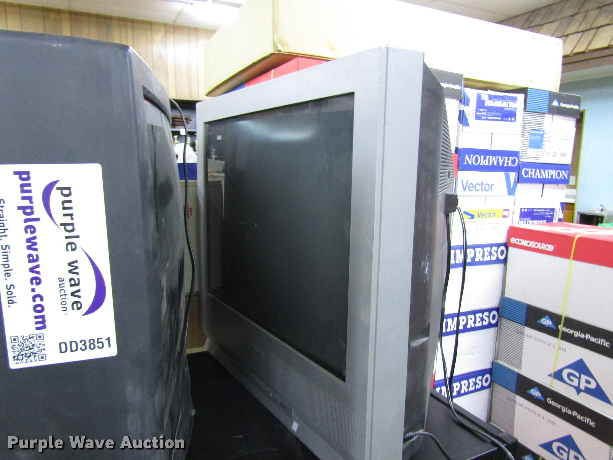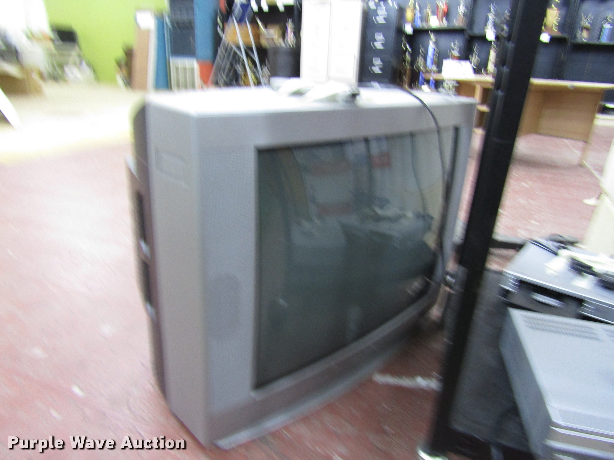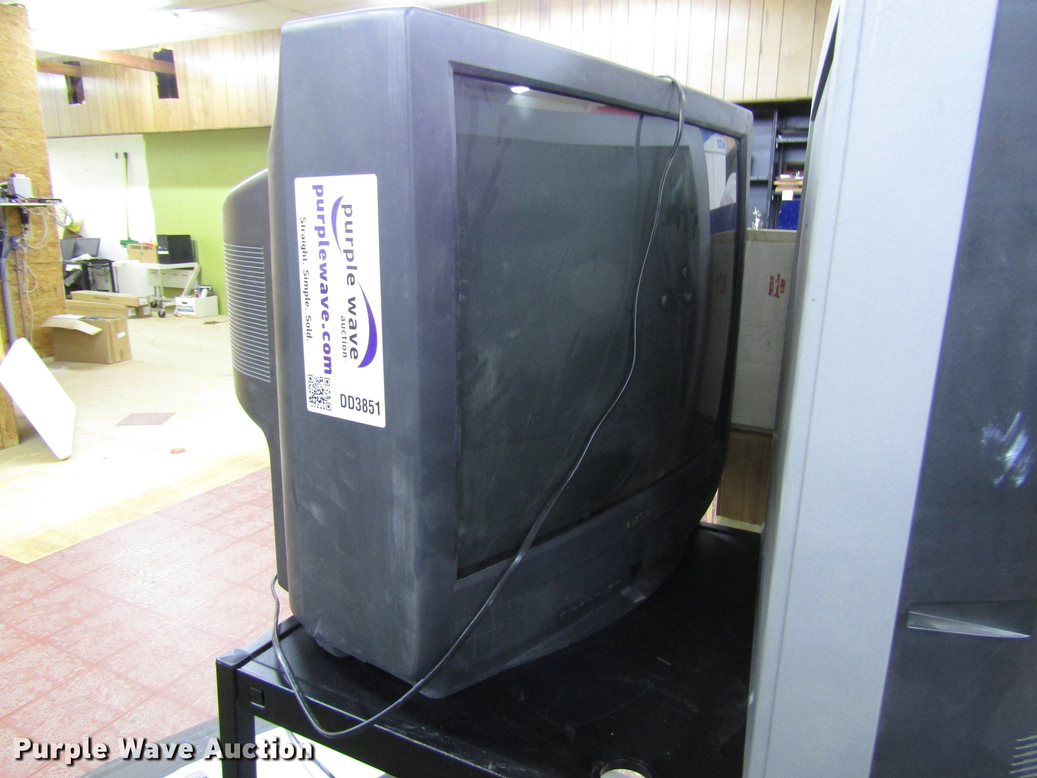 Purple Wave is selling a used Electronics in Kansas. This item is a Electronics with the following: (2) 27" televisions, Apex, Sanyo, and Duasat brands, (2) VHS/DVD players, Sony and Phillips brands, The Officiator scholar bowl buzzers, Server rack