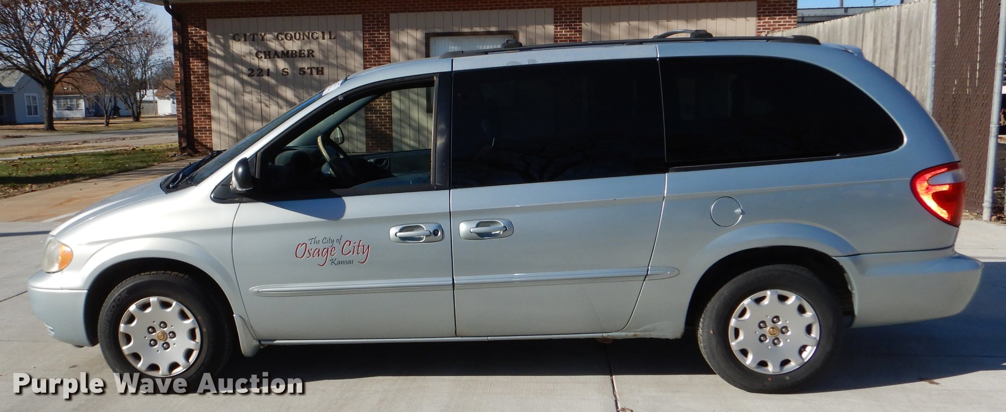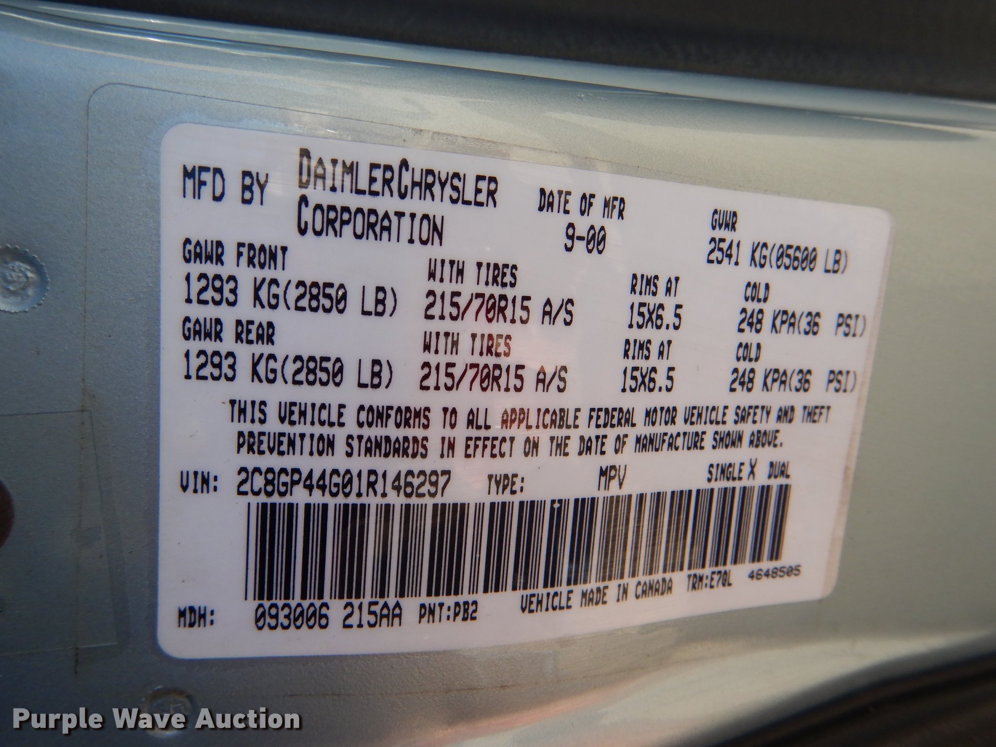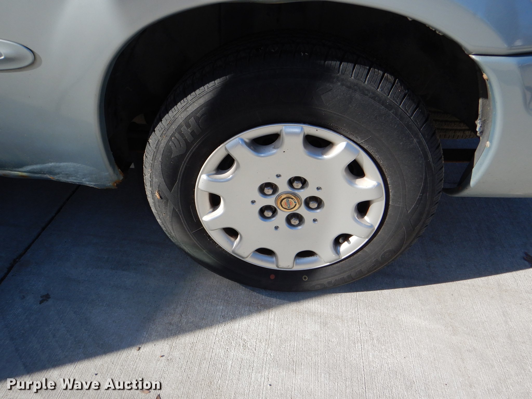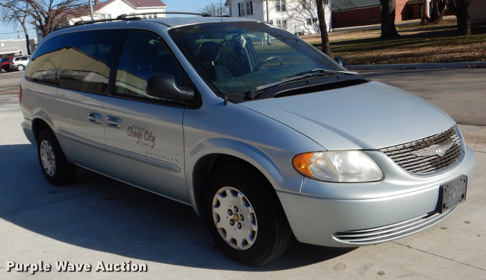 Purple Wave is selling a used Passenger Vehicle in Kansas. This item is a 2001 Chrysler Town & Country LX van with the following: 128,799 miles on odometer, 3.3L V6 OHV 12V FFV gas engine, Automatic transmission, AC and heat, Tilt, Cruise, AM/FM/CD/cassette, Power windows, locks, mirrors, and seat, Cloth interior, Hankook 215/70R15 tires, Decals will be removed prior to auction, Rear hatch latch will only open with key