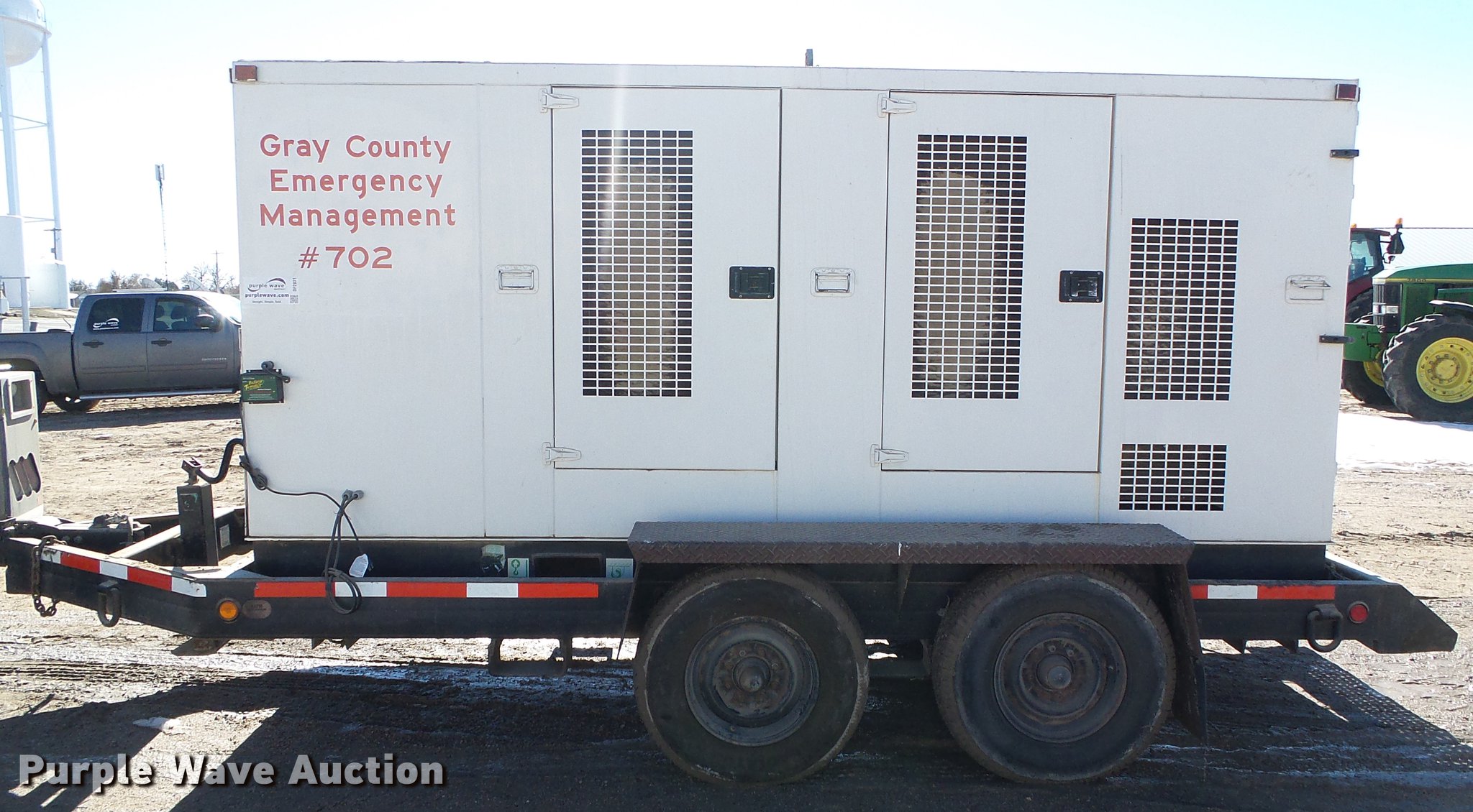 Purple Wave is selling a used Generator Set in Kansas. This item is a 1999 Caterpillar XQ225-3306 generator with the following: 7,593 hours on meter, Caterpillar 3306 10.5L L6 turbo diesel engine, Serial 8JJ00497, Magna Plus 432CSL6210-1 generator, Control panel, Electric start, 325 kVA, 260 kW, 120V single phase, 240/480V three phase, 1998 MGS Inc. trailer, 2 5/16" ball hitch, ST235/85R16 tires, Serial E36BLC29, Unit# 702
