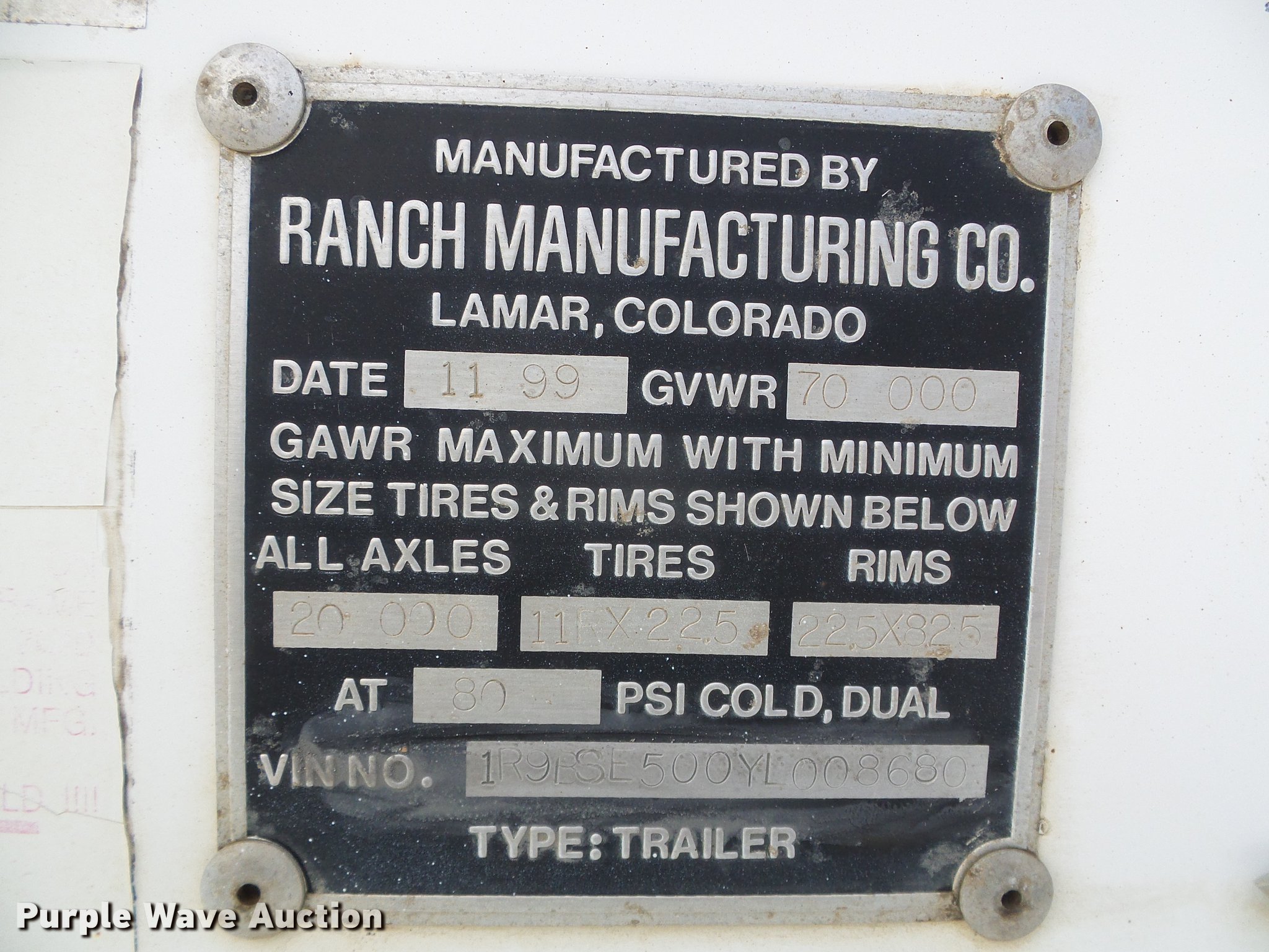 2000 Ranch bottom dump trailer. 40'L x 102"W, 8" side height, (2) compartments, Air operated clamshell gates, Trailer controls, Rear push block, Electric roll tarp, Steel construction, Fifth wheel plate, Dual leg landing gear, Spring suspesnion, Air brakes, Tandem axle, Steel wheels, 295/75R22.5 tires, GVWR 70,000 lbs. Kansas title. 1R9BSE500YL008680. Gray County. 915 N Main St. Cimarron, KS 67835
