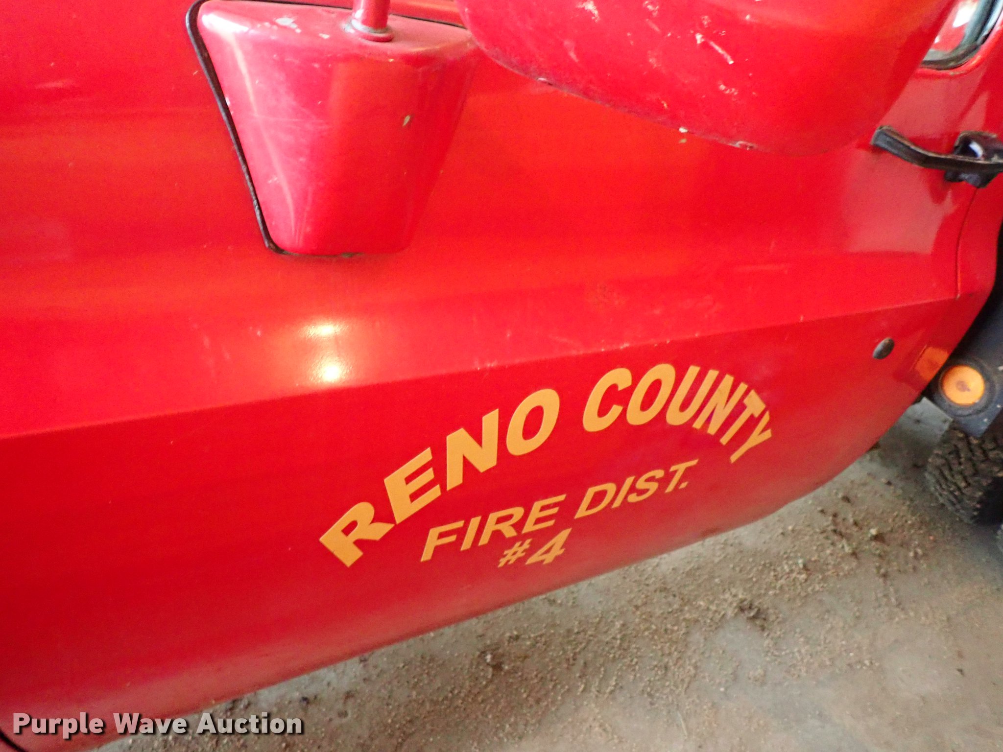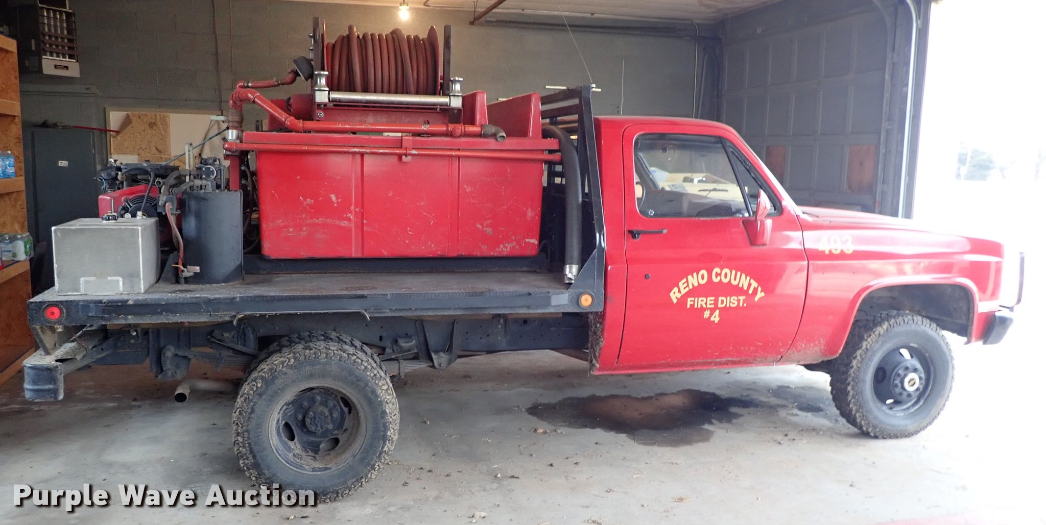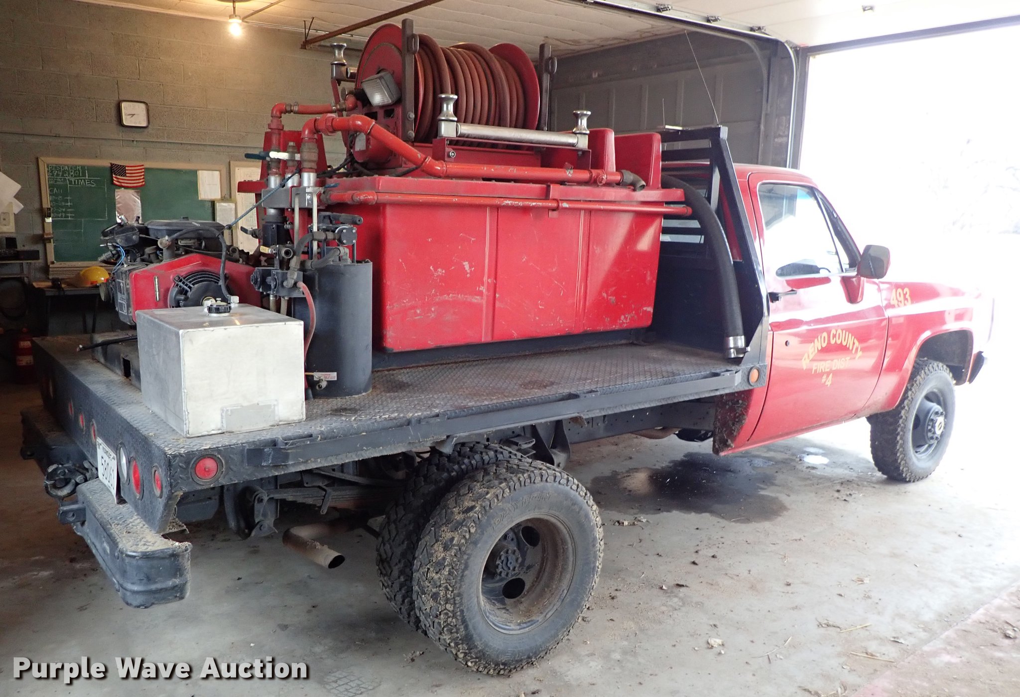 1987 Chevrolet brush fire truck. 11,174 miles on odometer, 6.2L V8 OHV diesel engine, Automatic transmission, Four wheel drive, Manual windows and locks, Vinyl interior, Front tow hooks, 102"L x 86"W flatbed, American Fire Equipment tank Waterous pump, Briggs & Stratton gas engine, Hose and reel, Foam system, Rear pintle hitch, 215/85R16 tires, Starts hard when cold. Kansas title. 1GCHD34J8HF320784. Reno County Fire District #4. Plevna, KS 67568