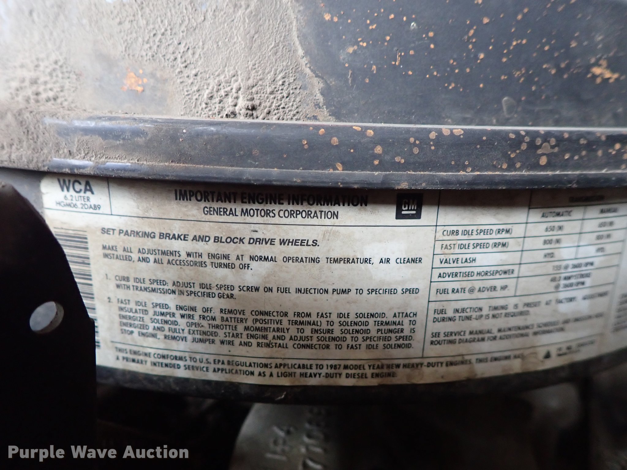 Purple Wave is selling a used Fire Truck or Emergency Vehicle in Kansas. This item is a 1987 Chevrolet brush fire truck with the following: 11,174 miles on odometer, 6.2L V8 OHV diesel engine, Automatic transmission, Four wheel drive, Manual windows and locks, Vinyl interior, Front tow hooks, 102"L x 86"W flatbed, American Fire Equipment tank, Waterous pump, Briggs & Stratton gas engine, Hose and reel, Foam system, Rear pintle hitch, 215/85R16 tires, Starts hard when cold
